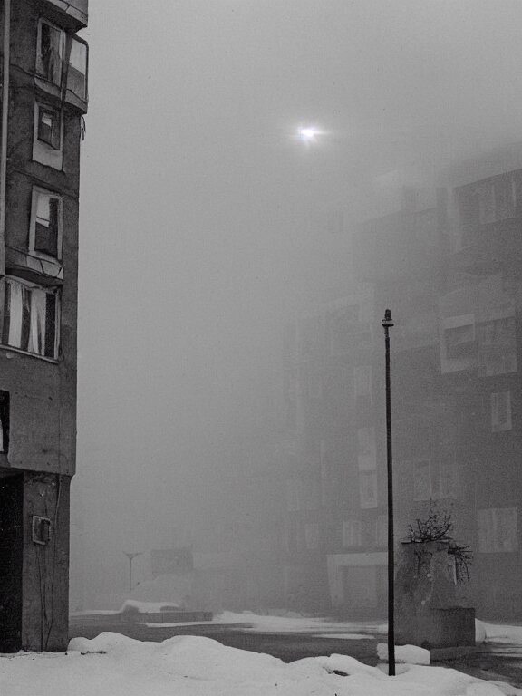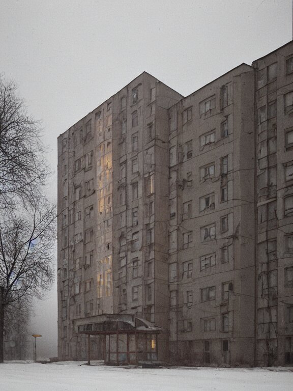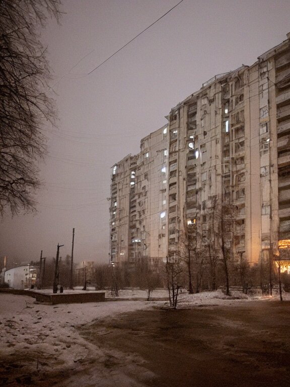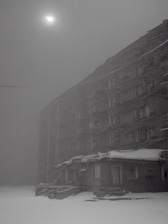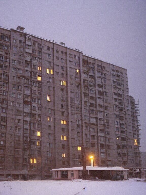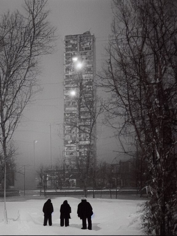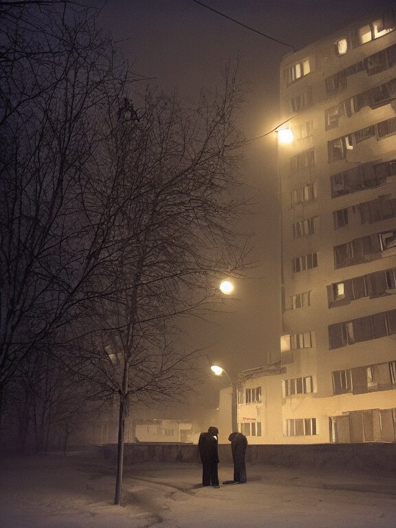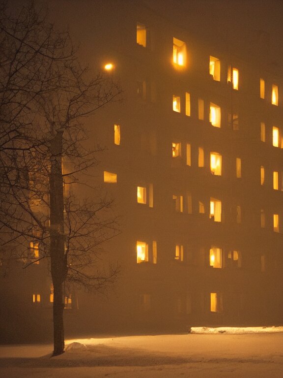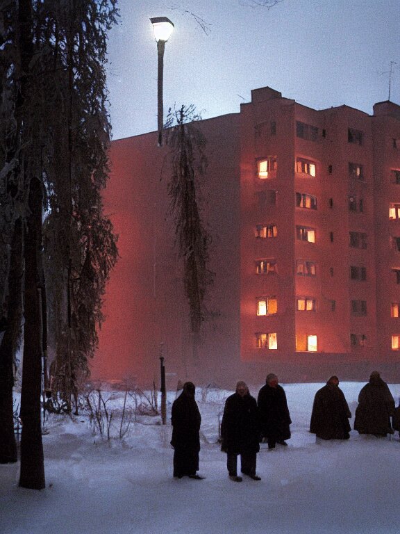 Film still of low soviet residential building in russian suburbs, lights are on in the windows, deep night, post - soviet courtyard, cozy atmosphere, winter, heavy snowб light fog, street lamps with orange light, several birches nearby, several elderly people stand at the entrance to the building