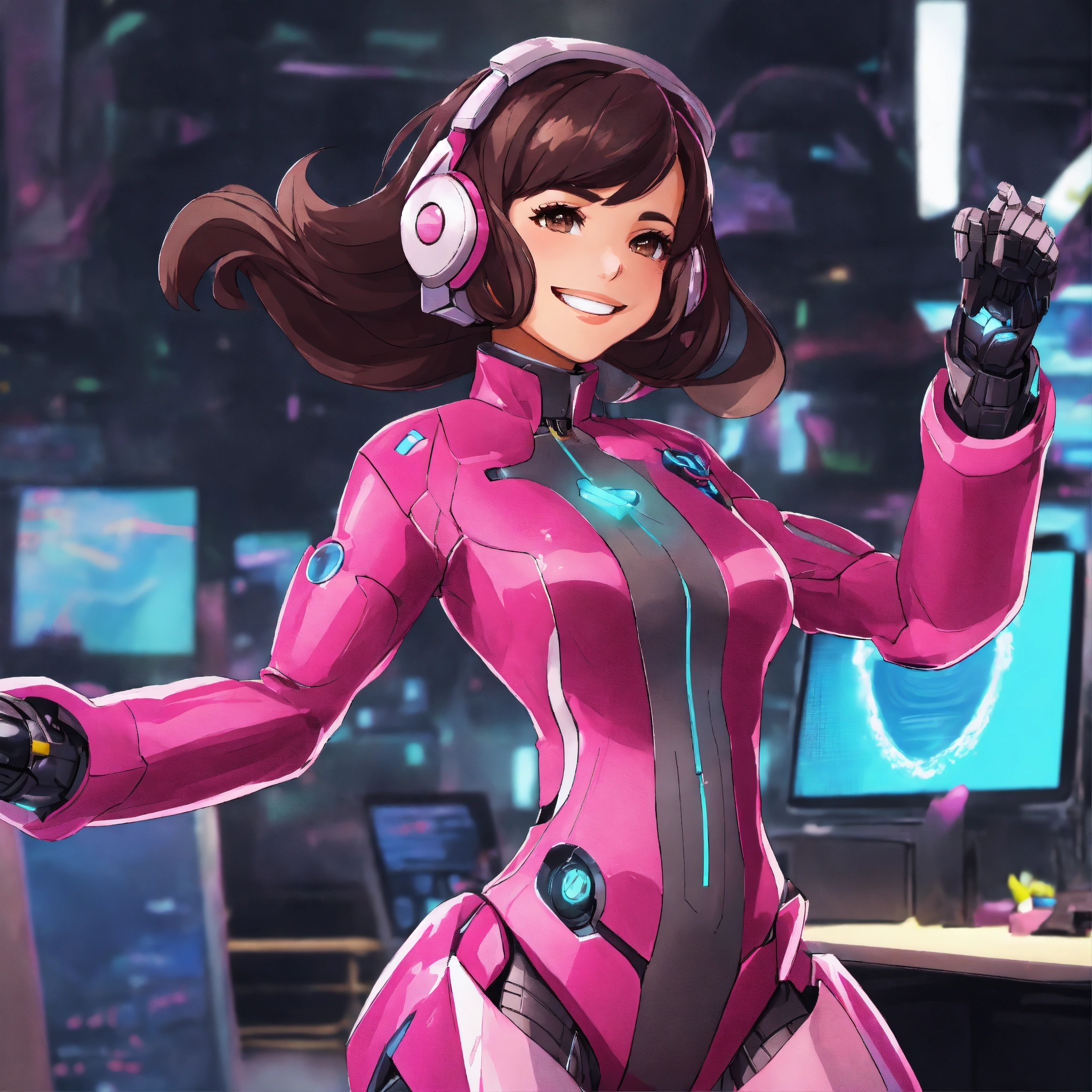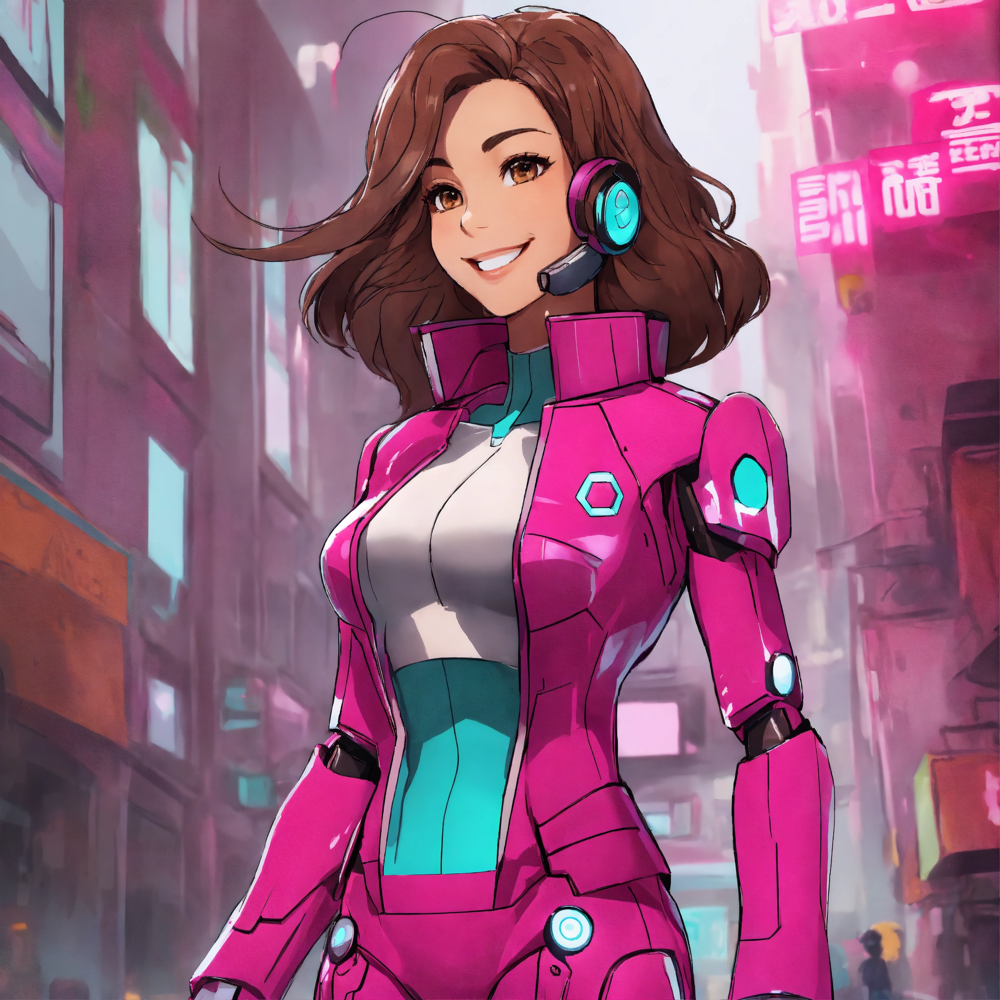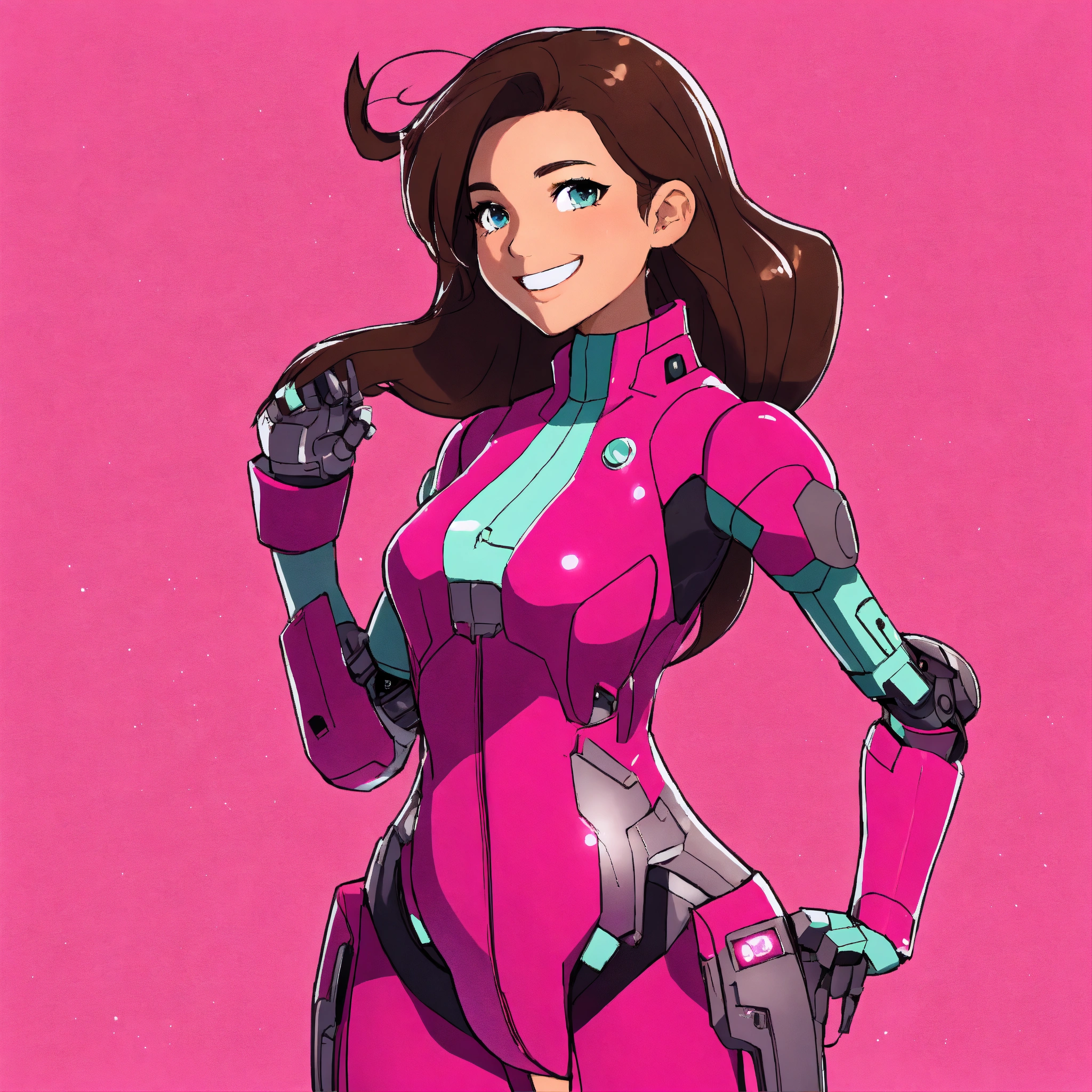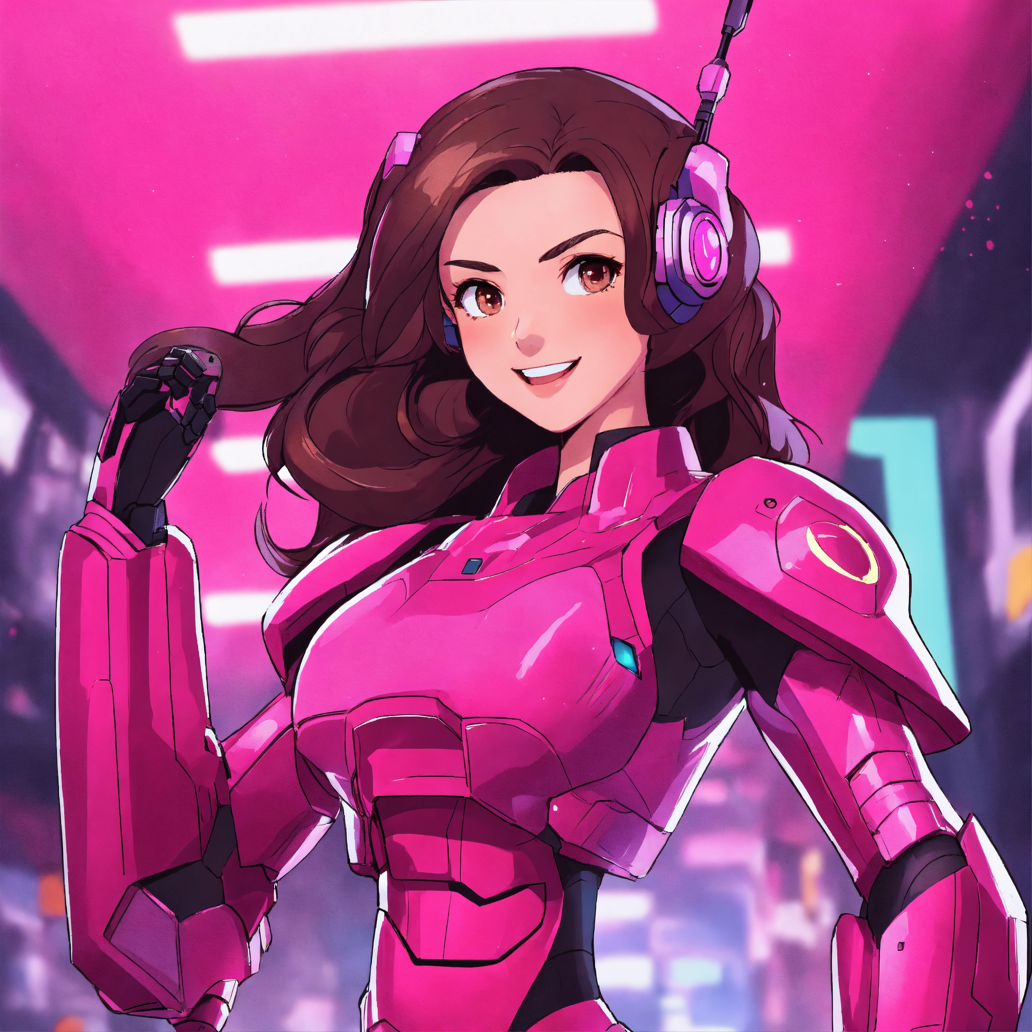 Generates a robot girl with dark brown hair, very smiling, with a very digital fuchsia-colored suit, a cartoon version that is waving