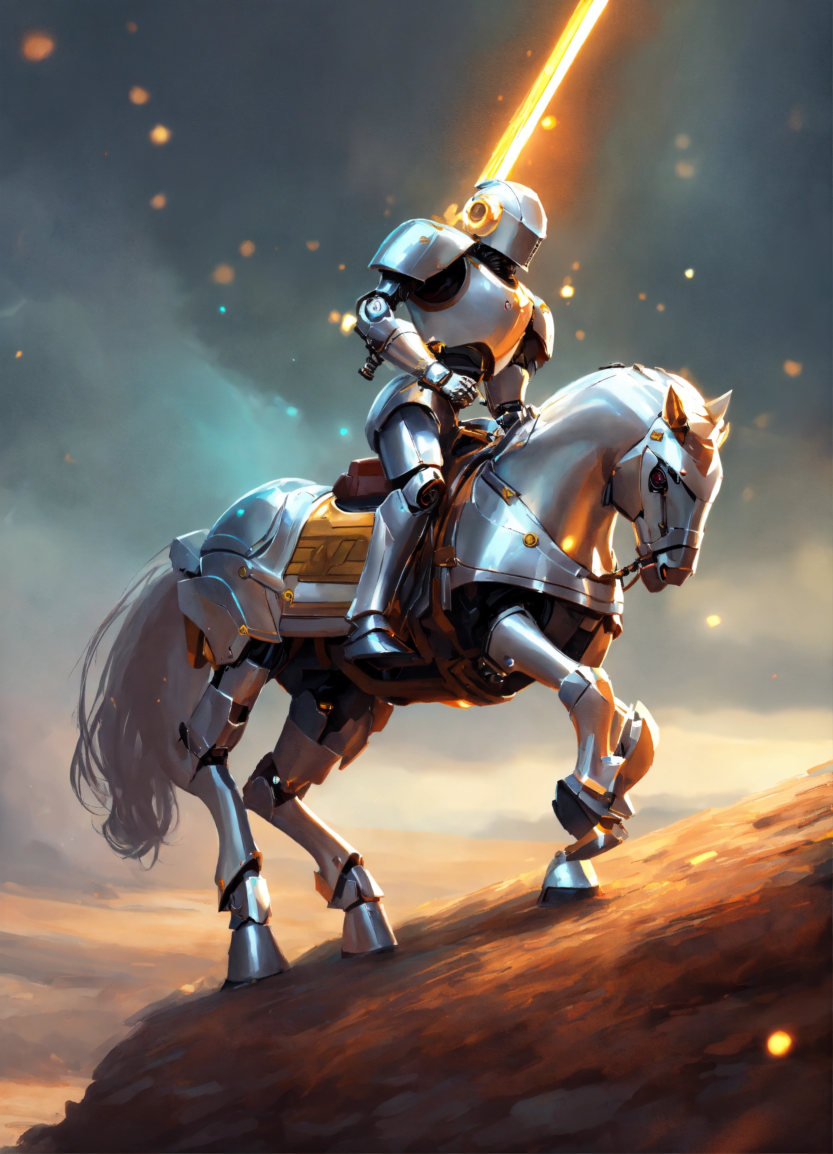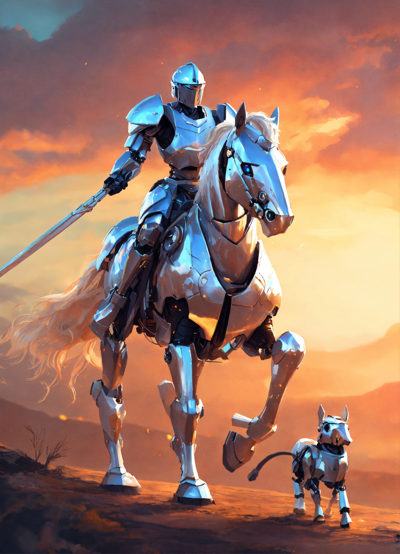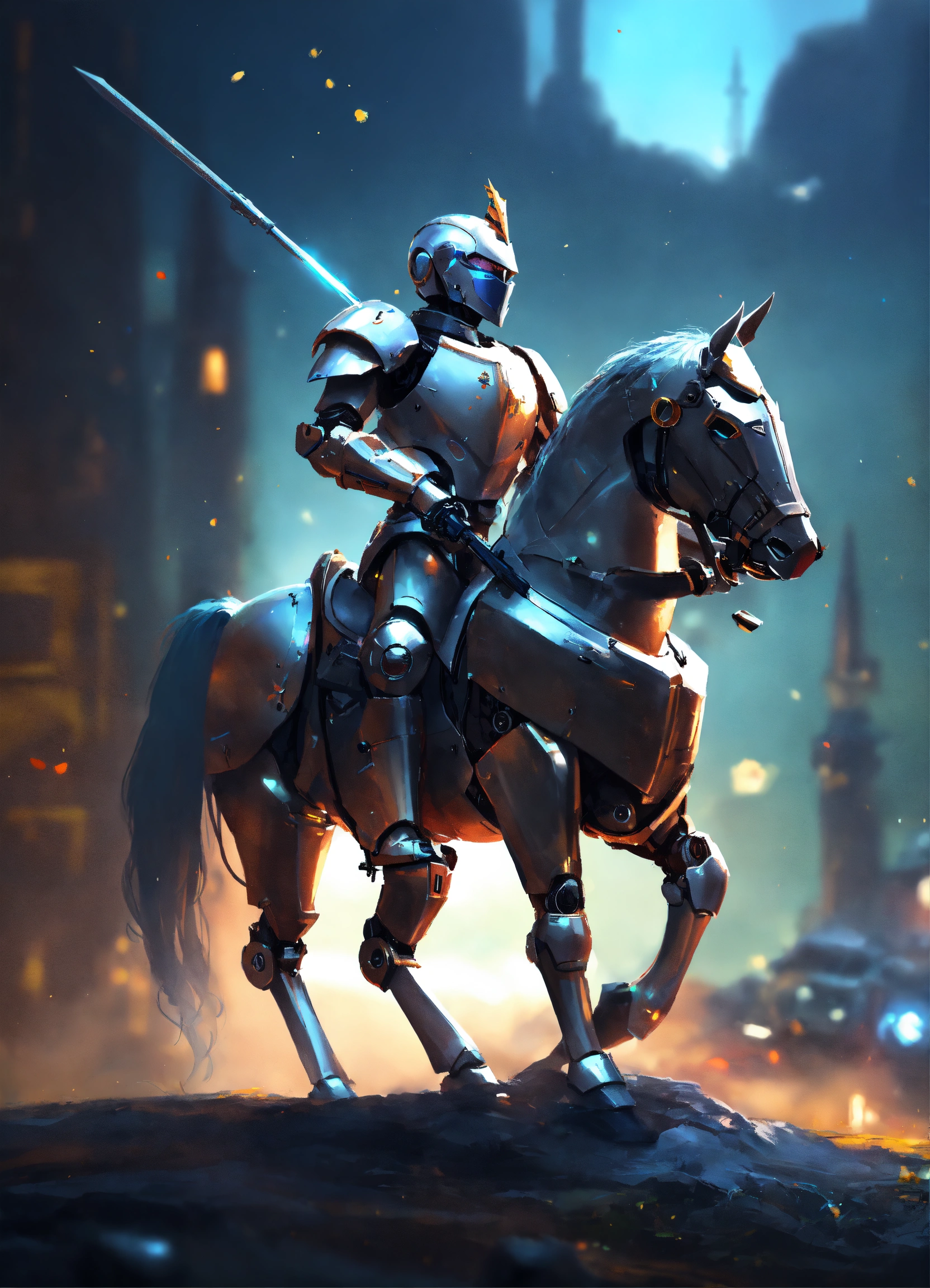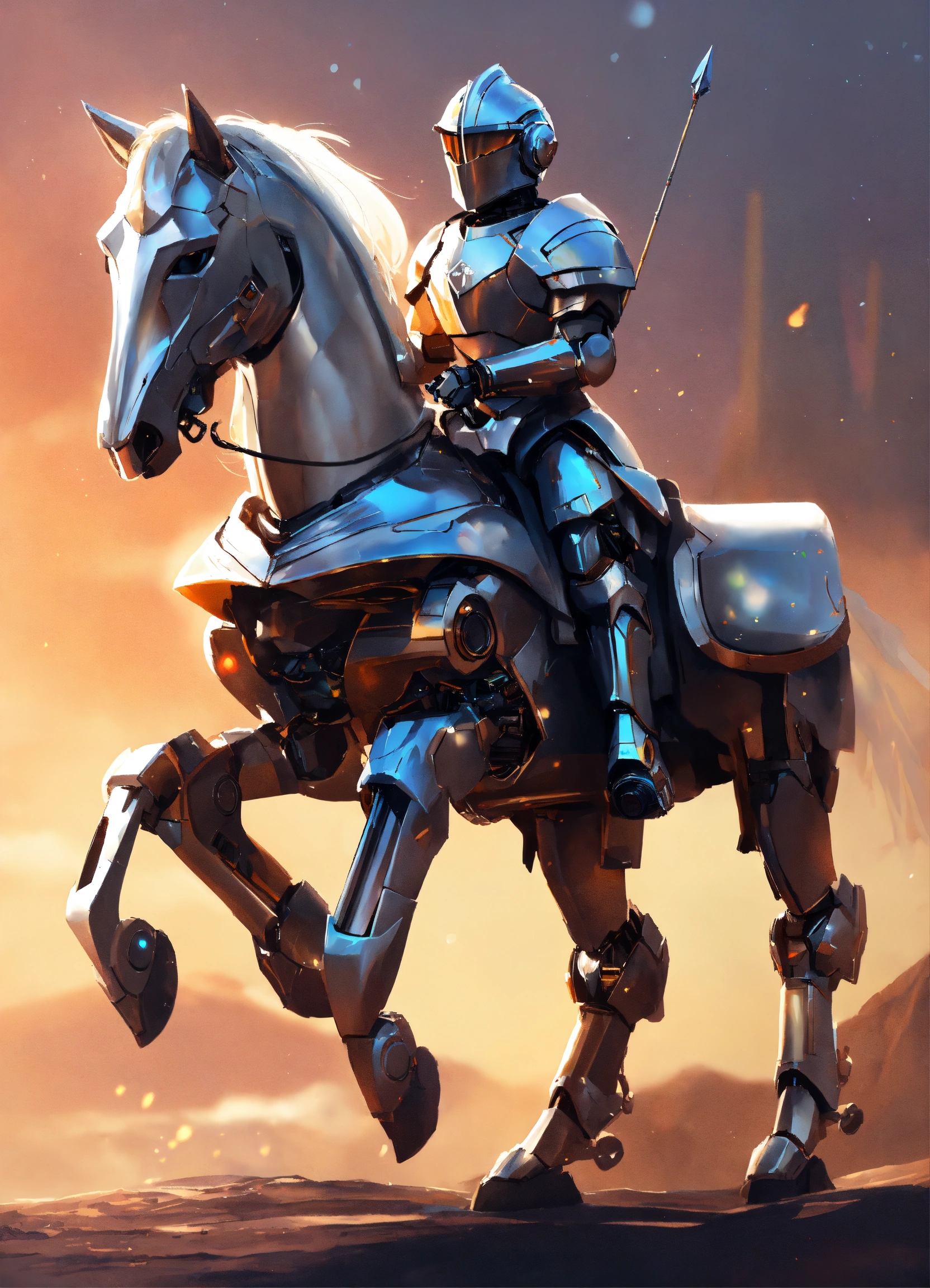 Digital painting of a tiny robotic knight holding a lance riding a shiny silver robot horse, 8k, trending on artstation