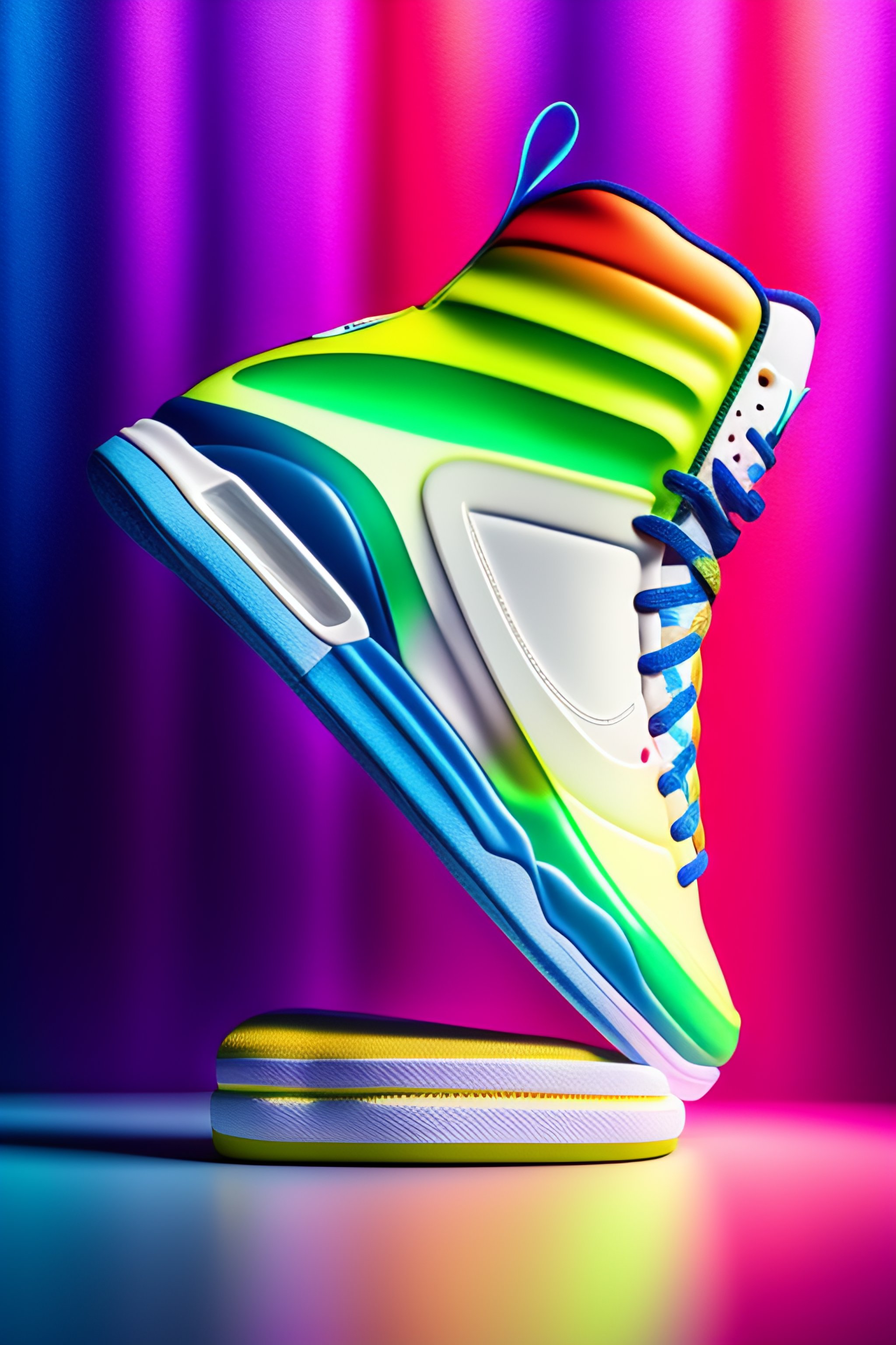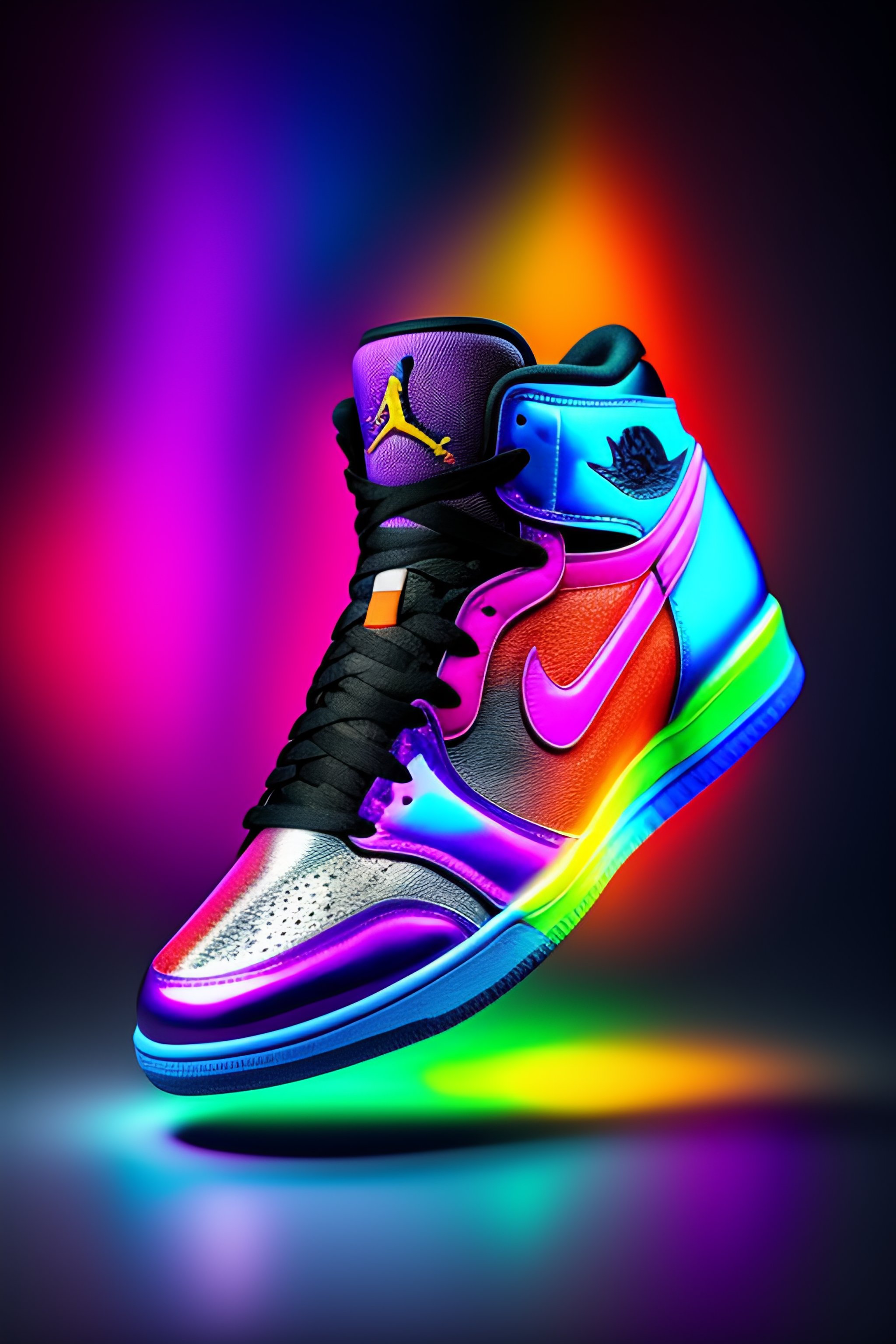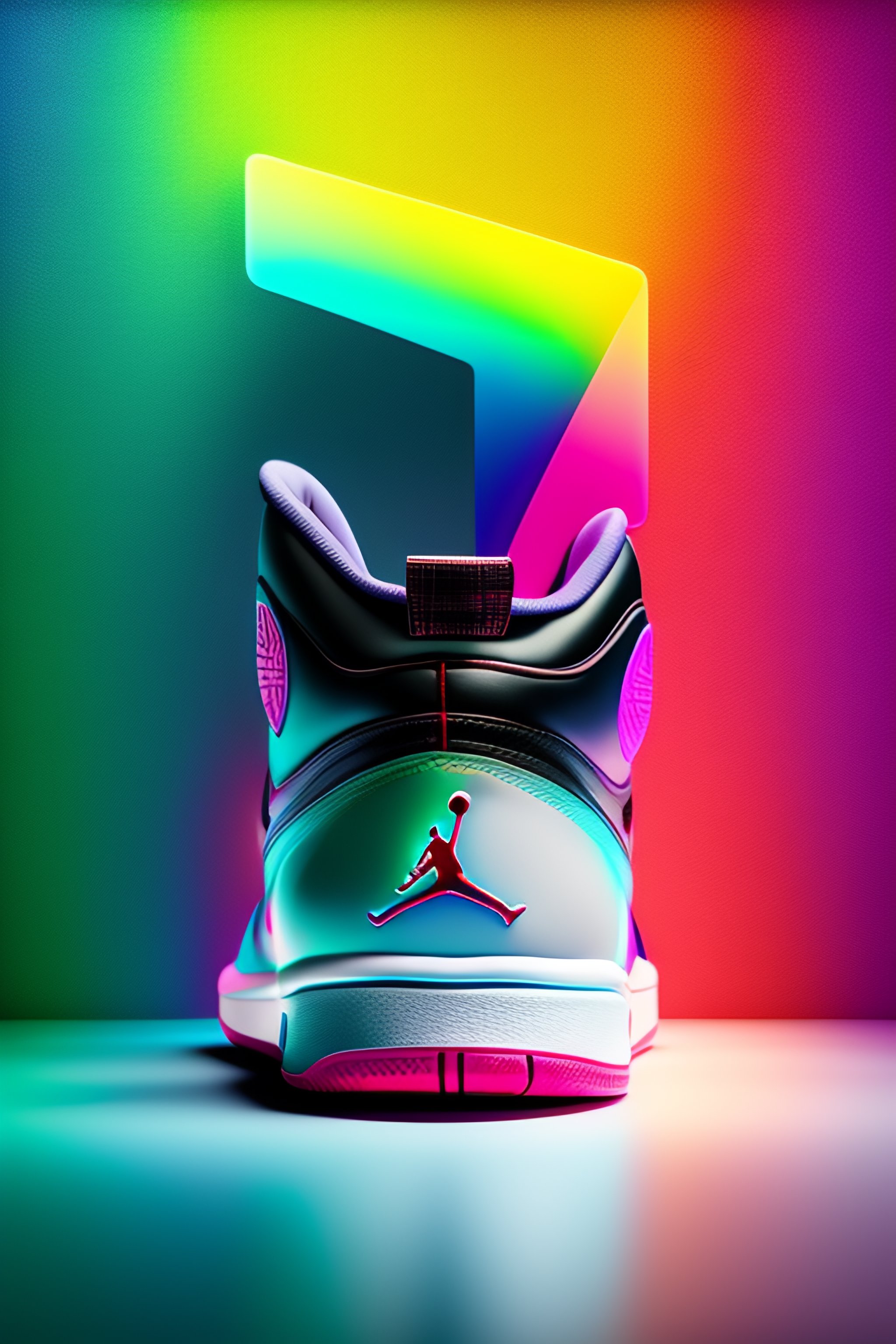 Hyperrealistic and heavy detailed product photo air jordan shoe with rainbow color, in front of white back drop, whole shoe is in picture, leica sl 2 5 0 mm, vivid color, high quality, high textured, real life