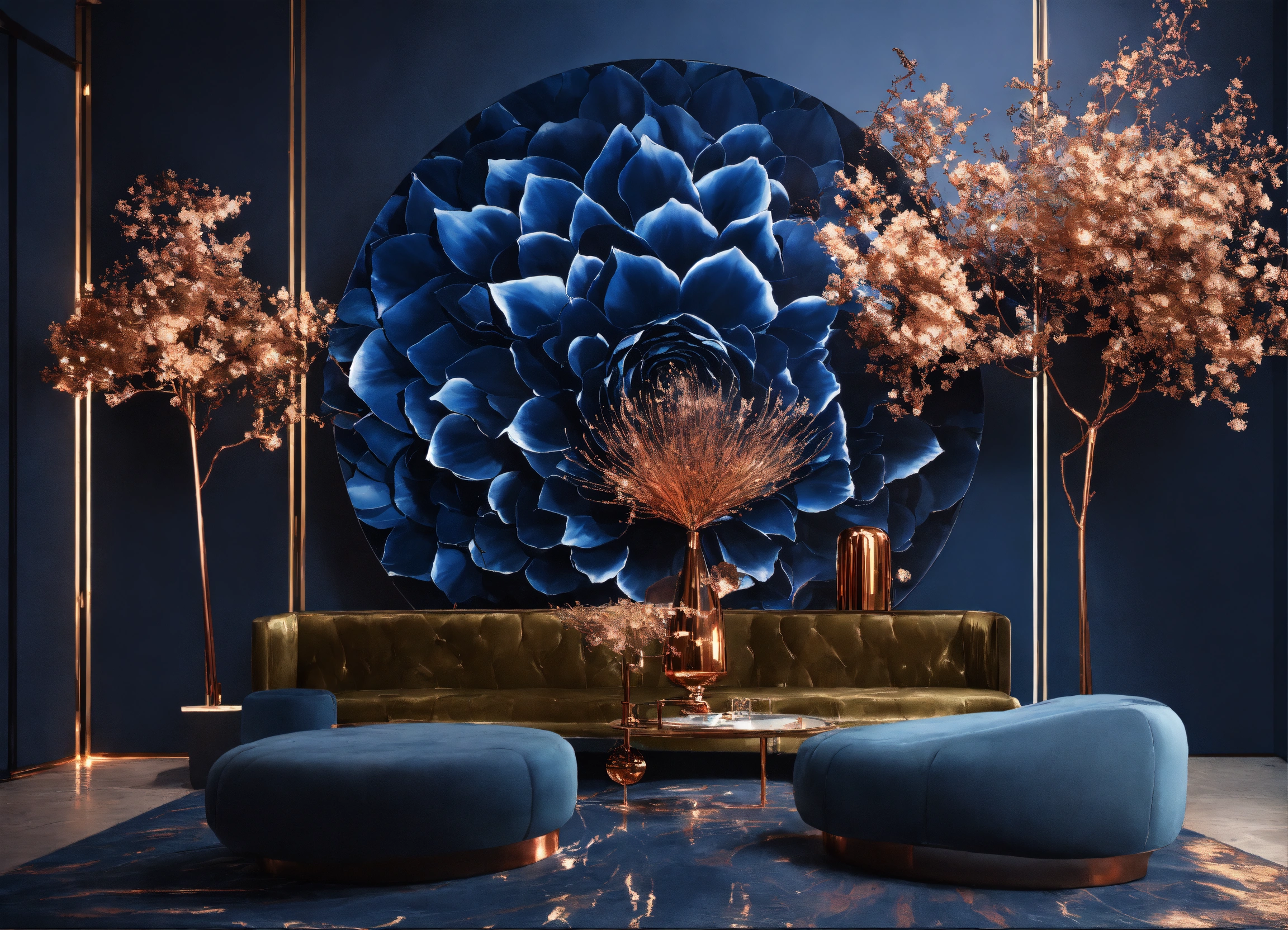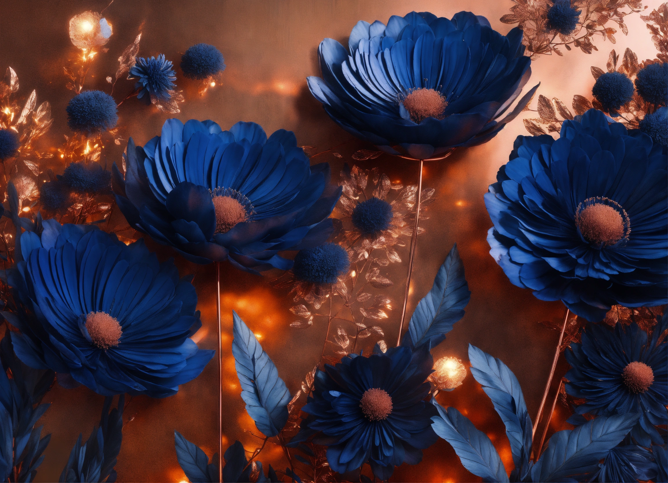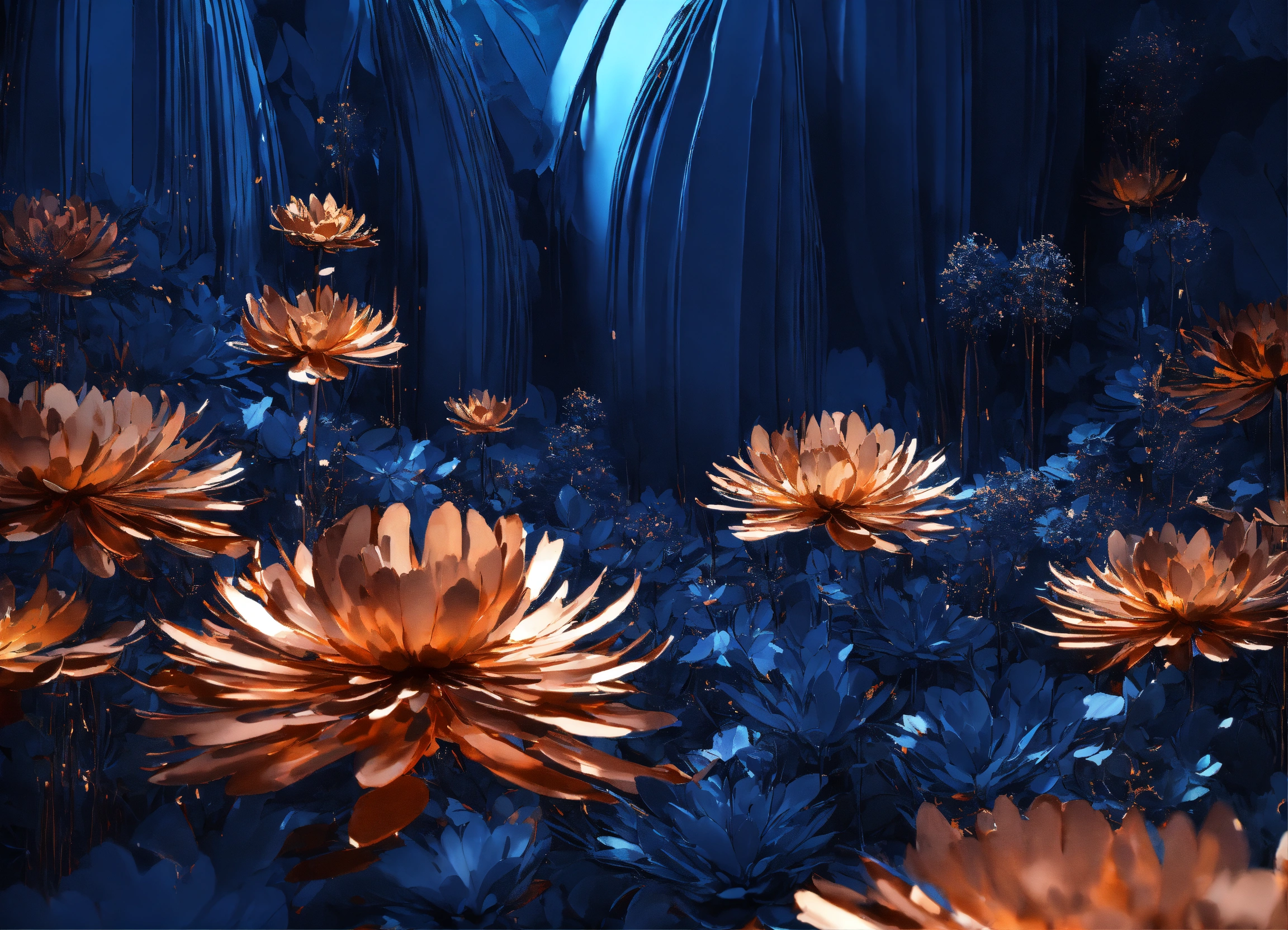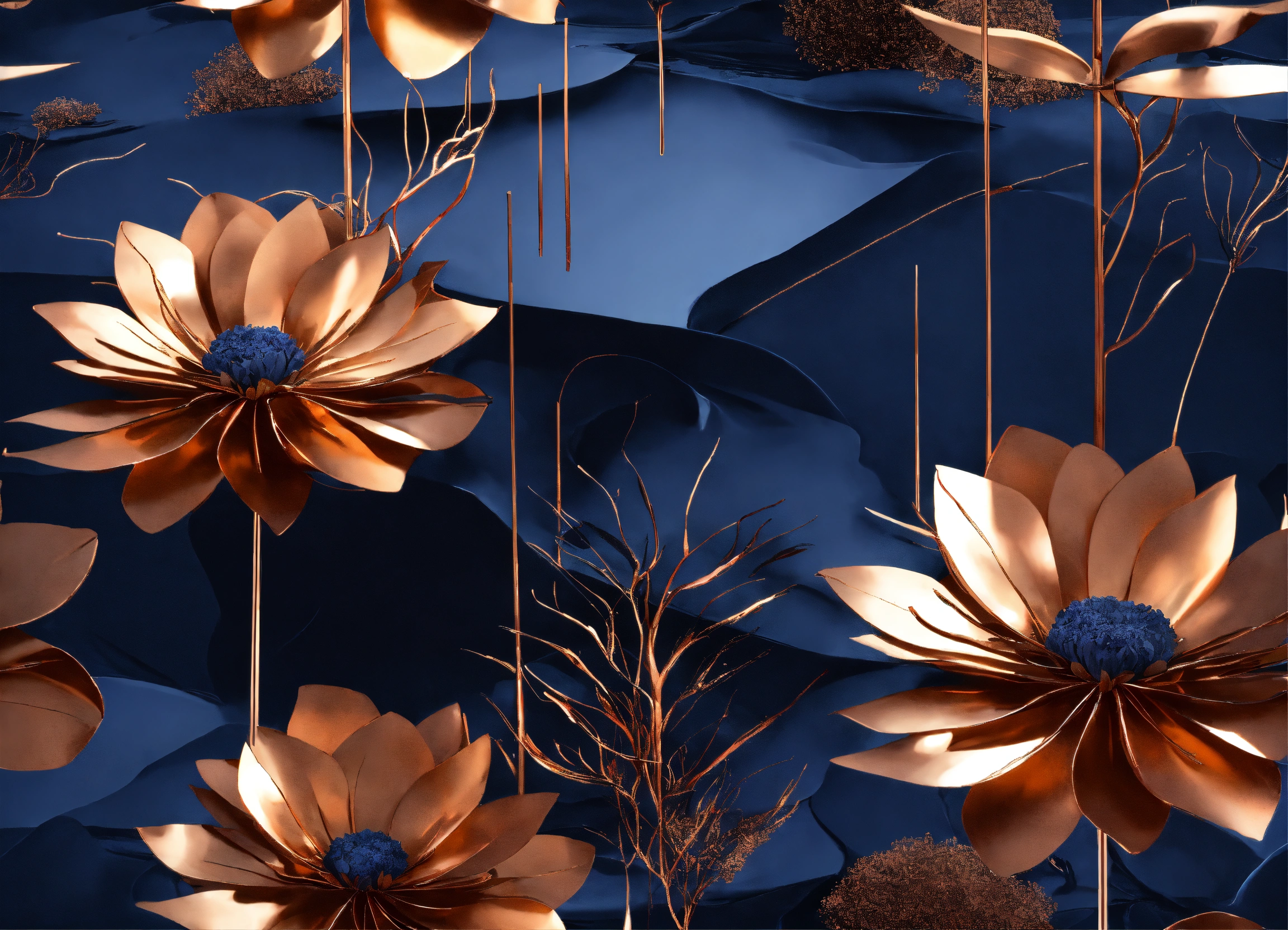 Luxury fusion of dark blue botanical theme, modernist abstract landscapes experimental art, add sparking copper, add giant flowers, high definition image, 8k