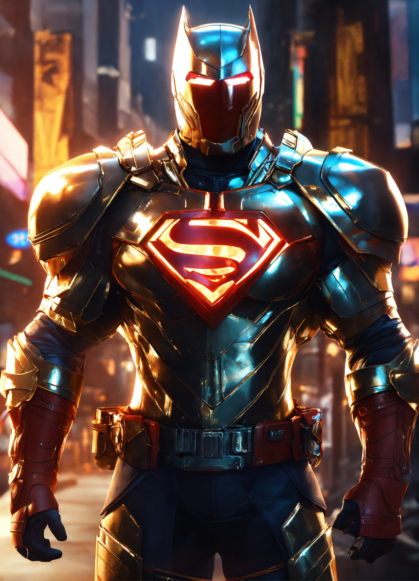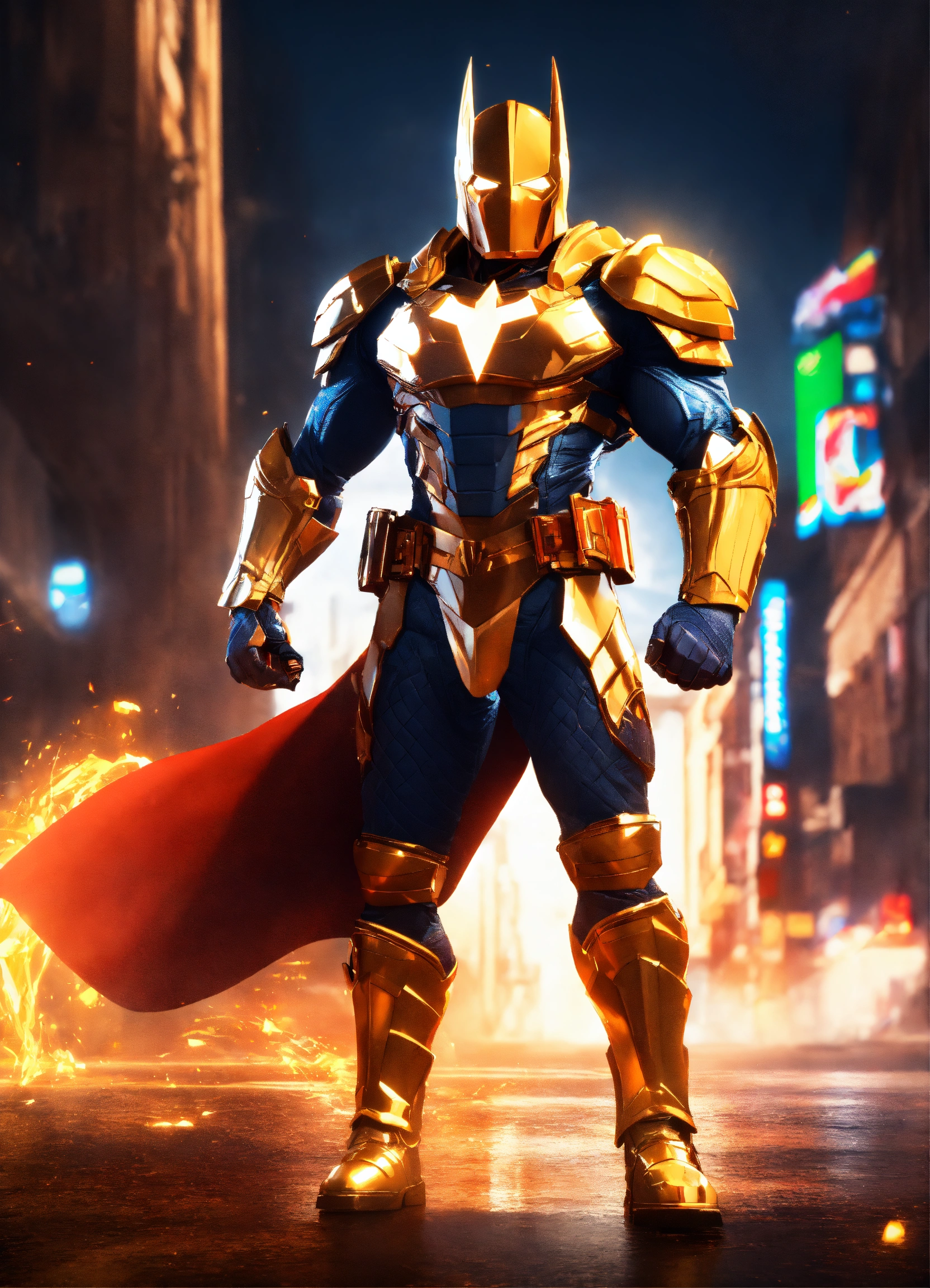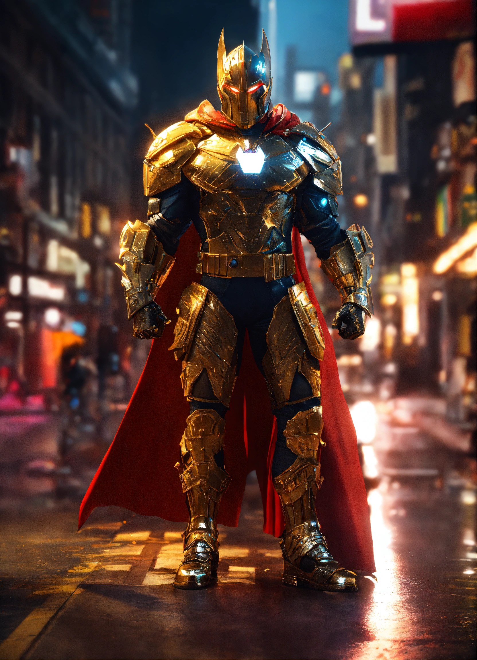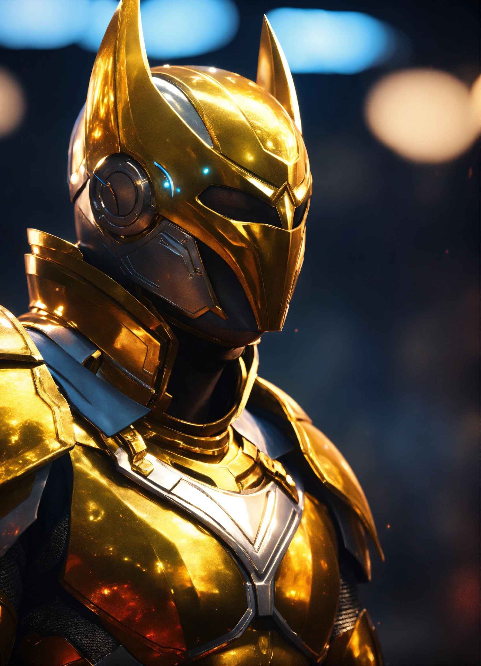 Create a superhero who got his powers from music, cinematic lighting, art station, 3d, unreal engine, alot of shiny armor, doggin bullets
