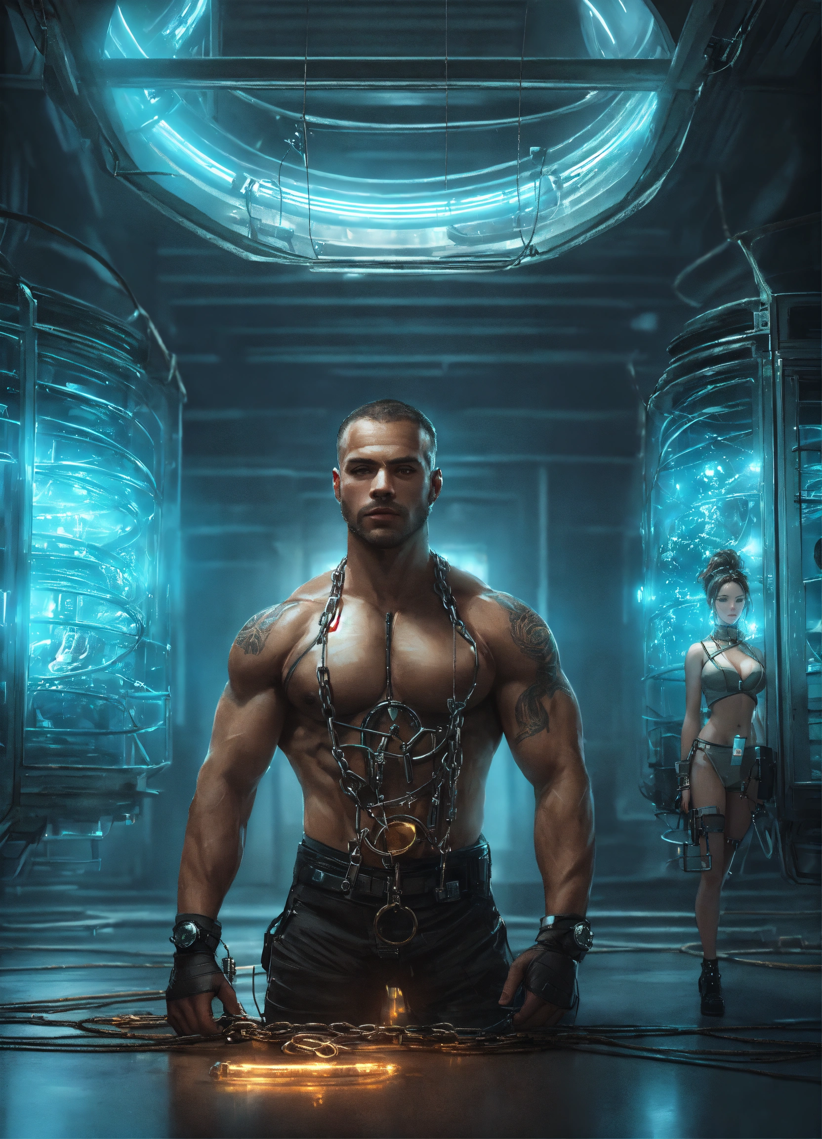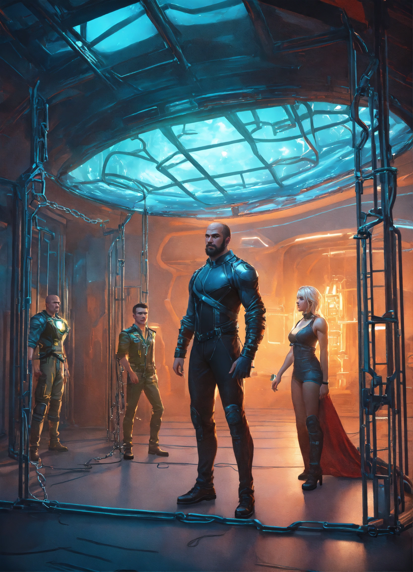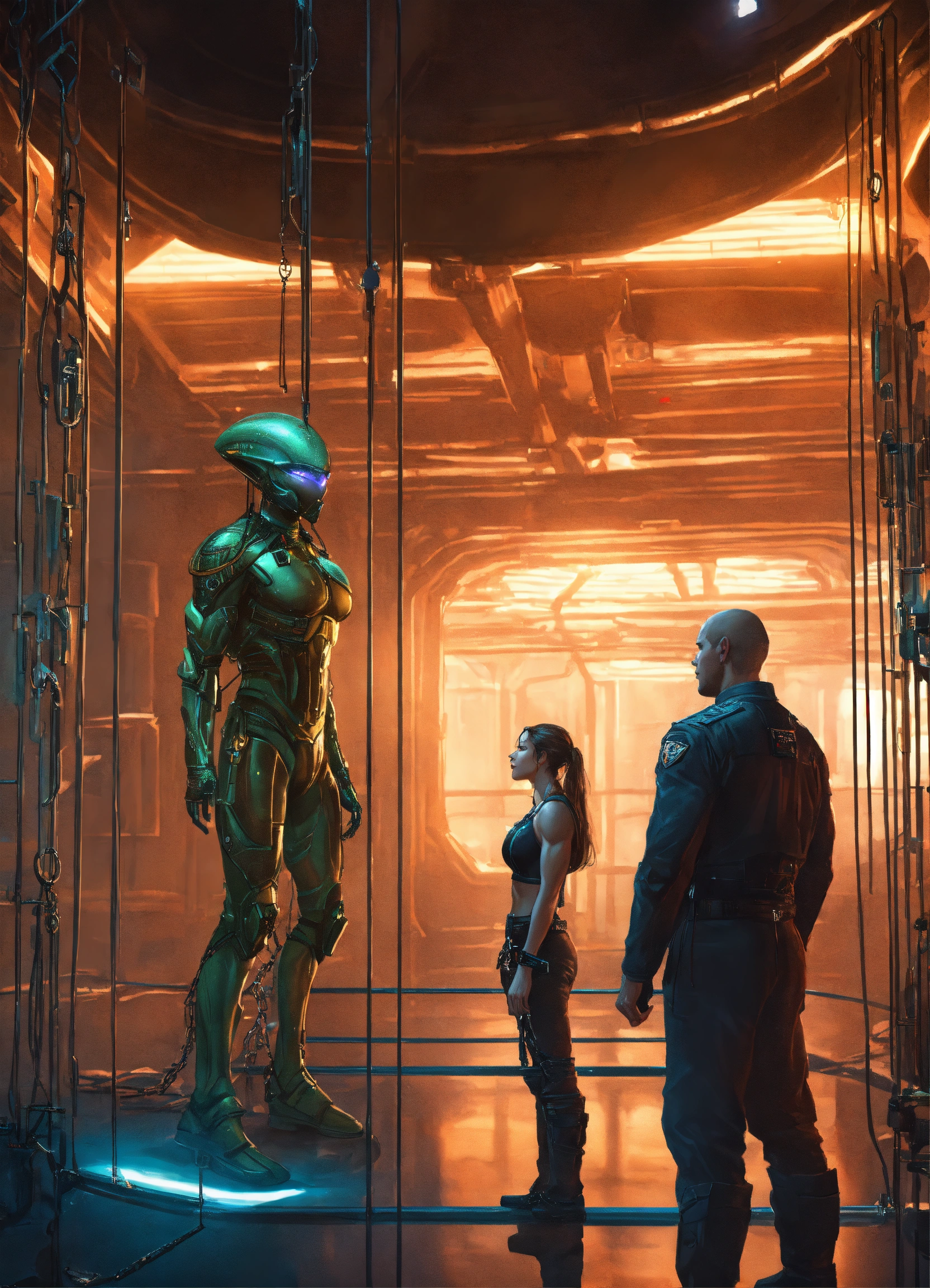 Human male and female captives chained inside a futuristic alien prison with glass cells and a seven foot muscular strong male alien prison warden watching, fantasy, high detail, realistic photo, high detail, digital painting, cinematic, stunning, hyper-realistic, sharp focus, high resolution 8k, insanely detailed