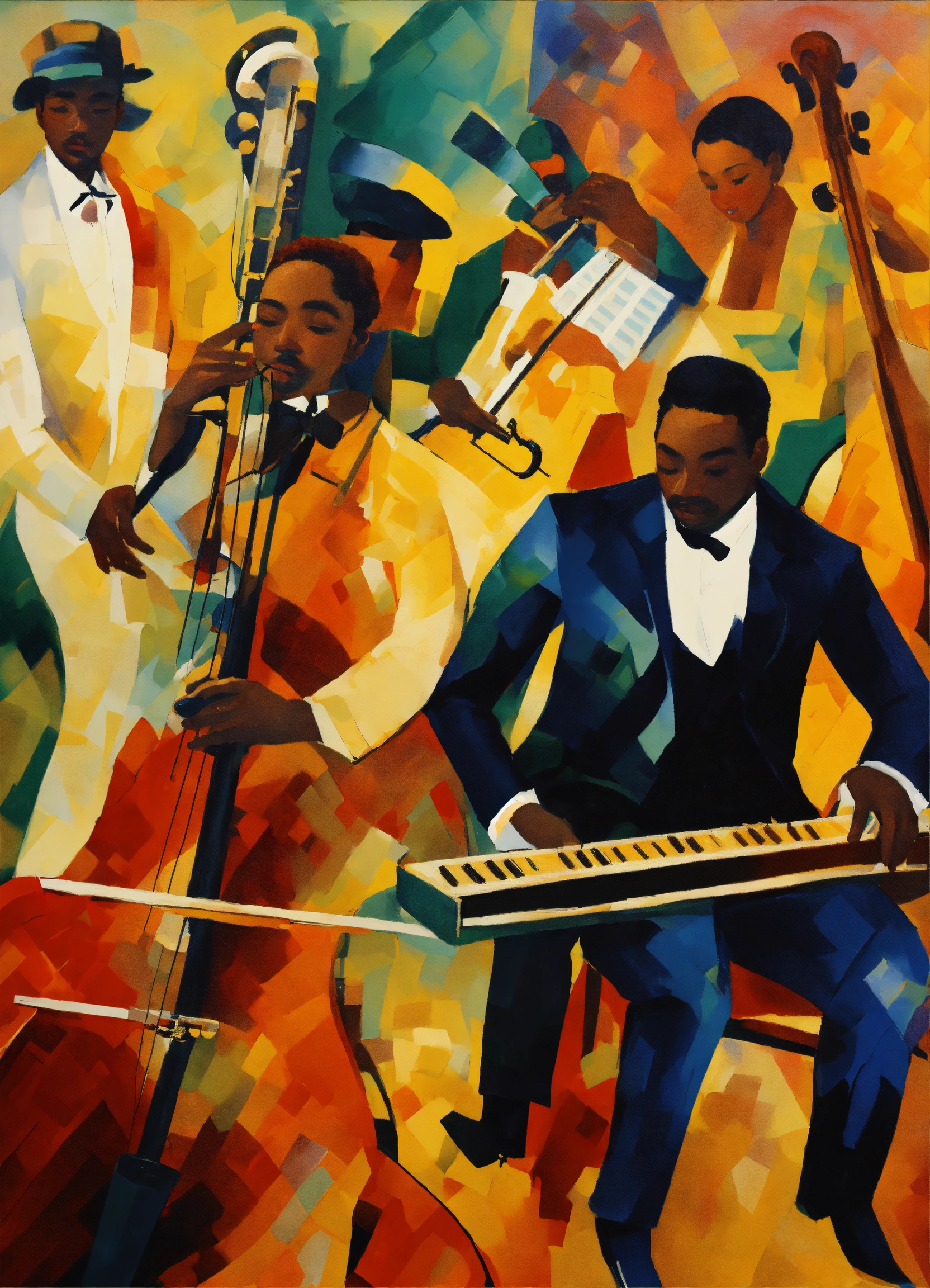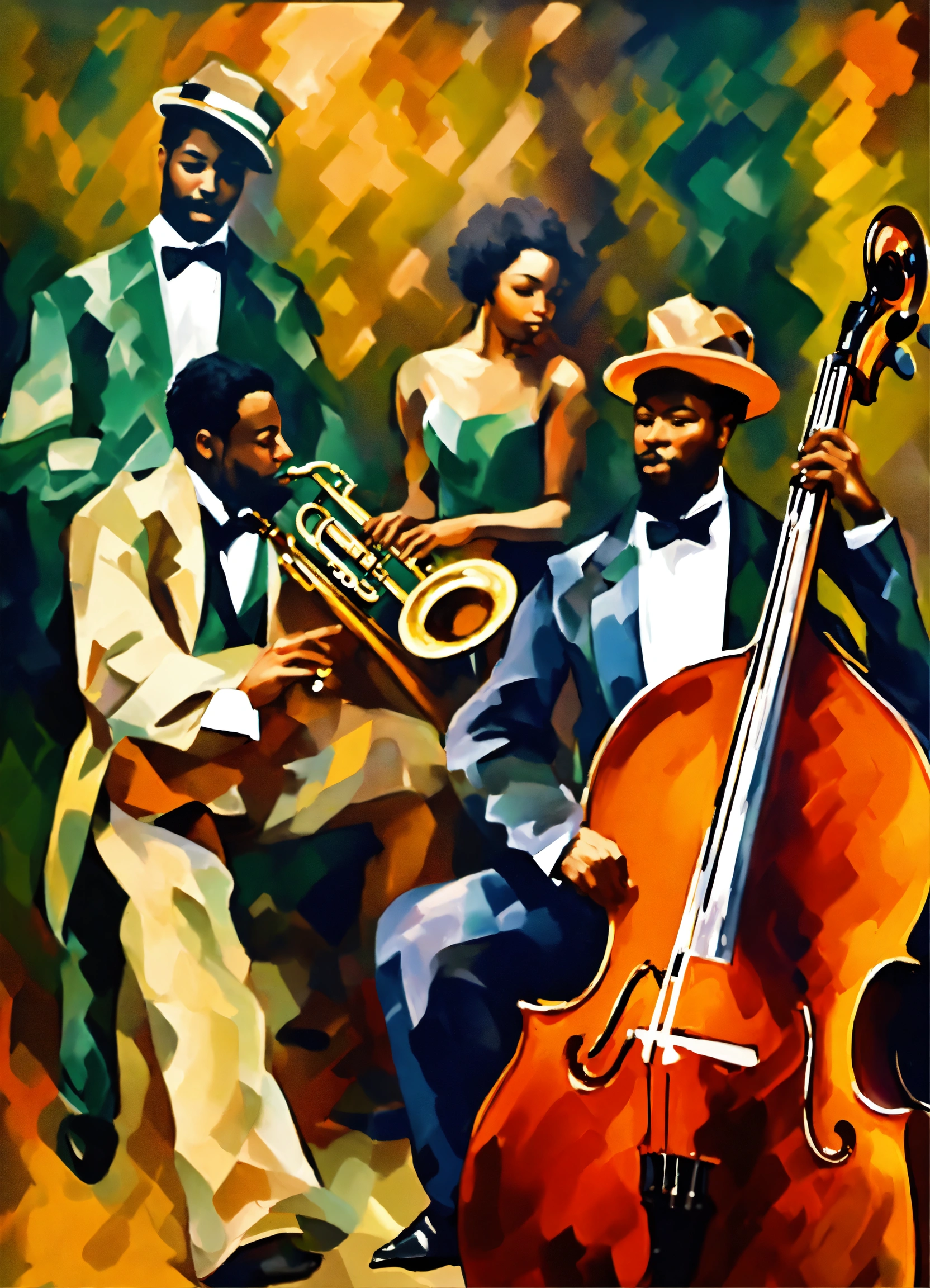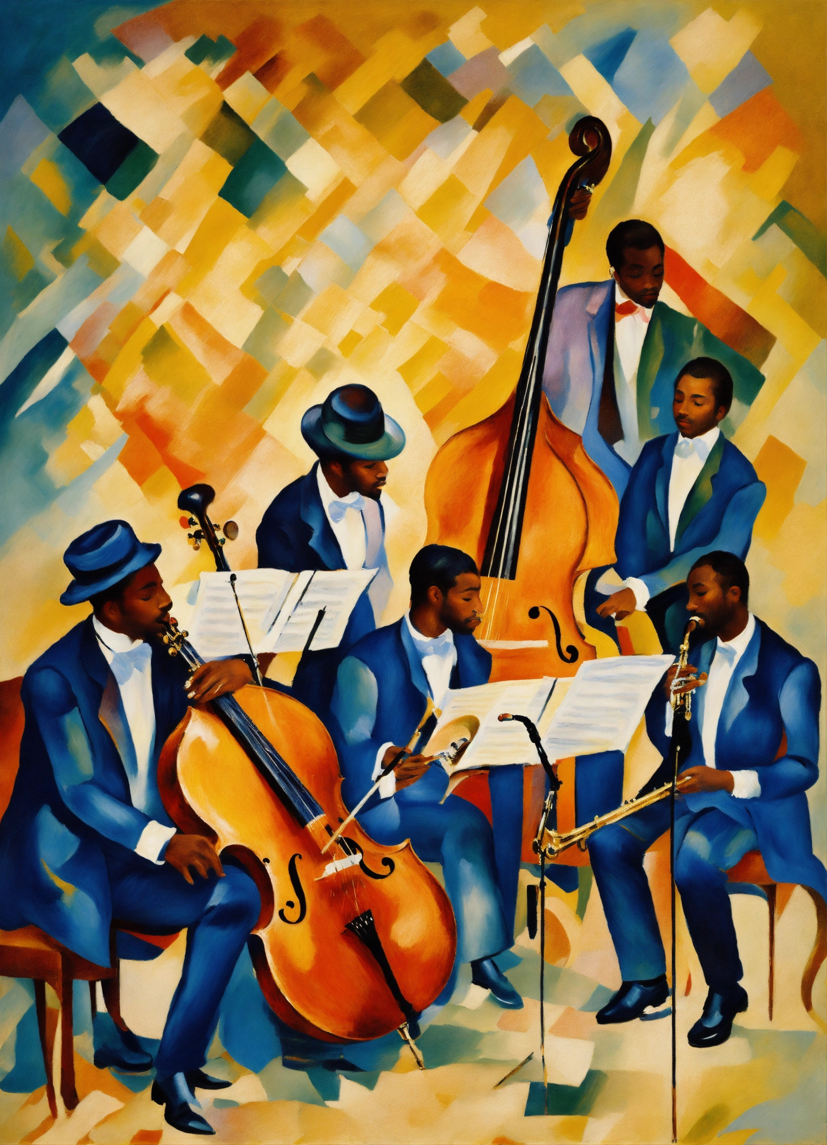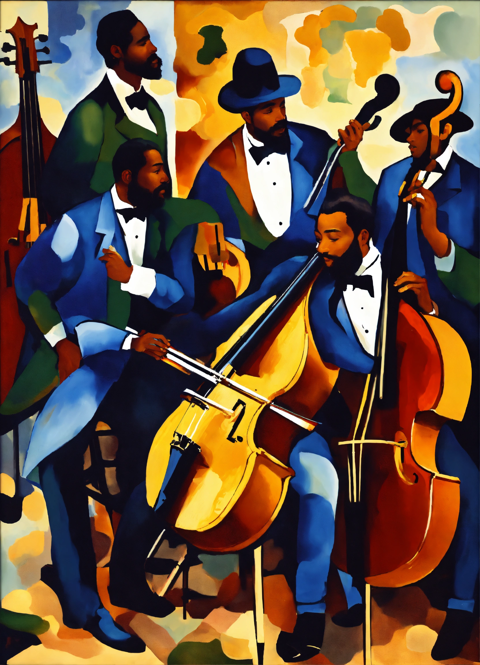 Four black musicians playing jazz with piano, sax, and contrabass art in the abstract style of renoir.