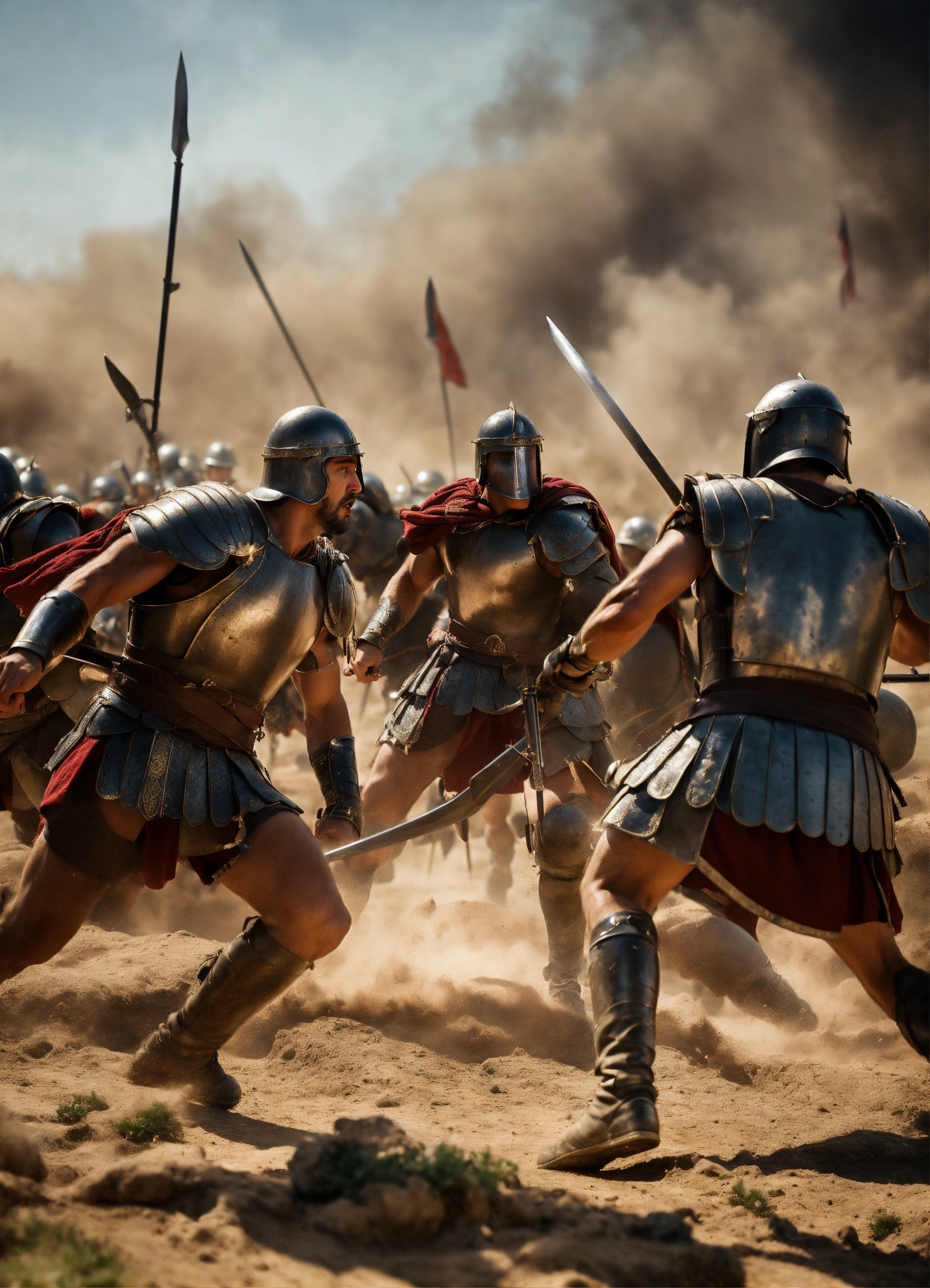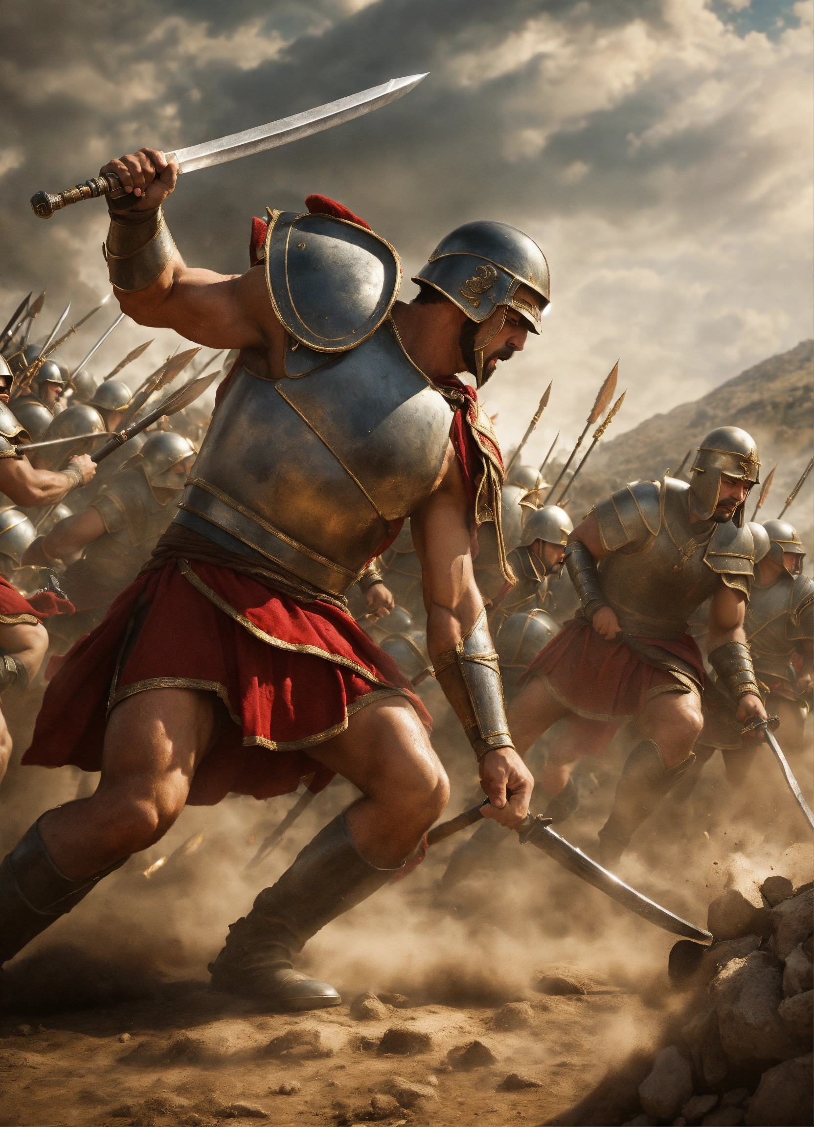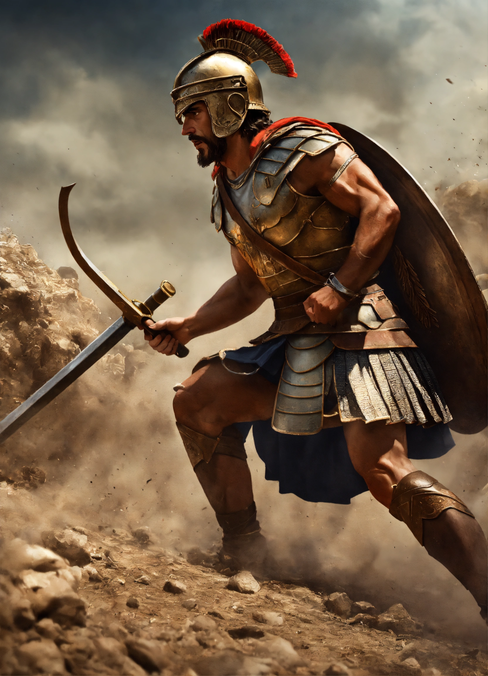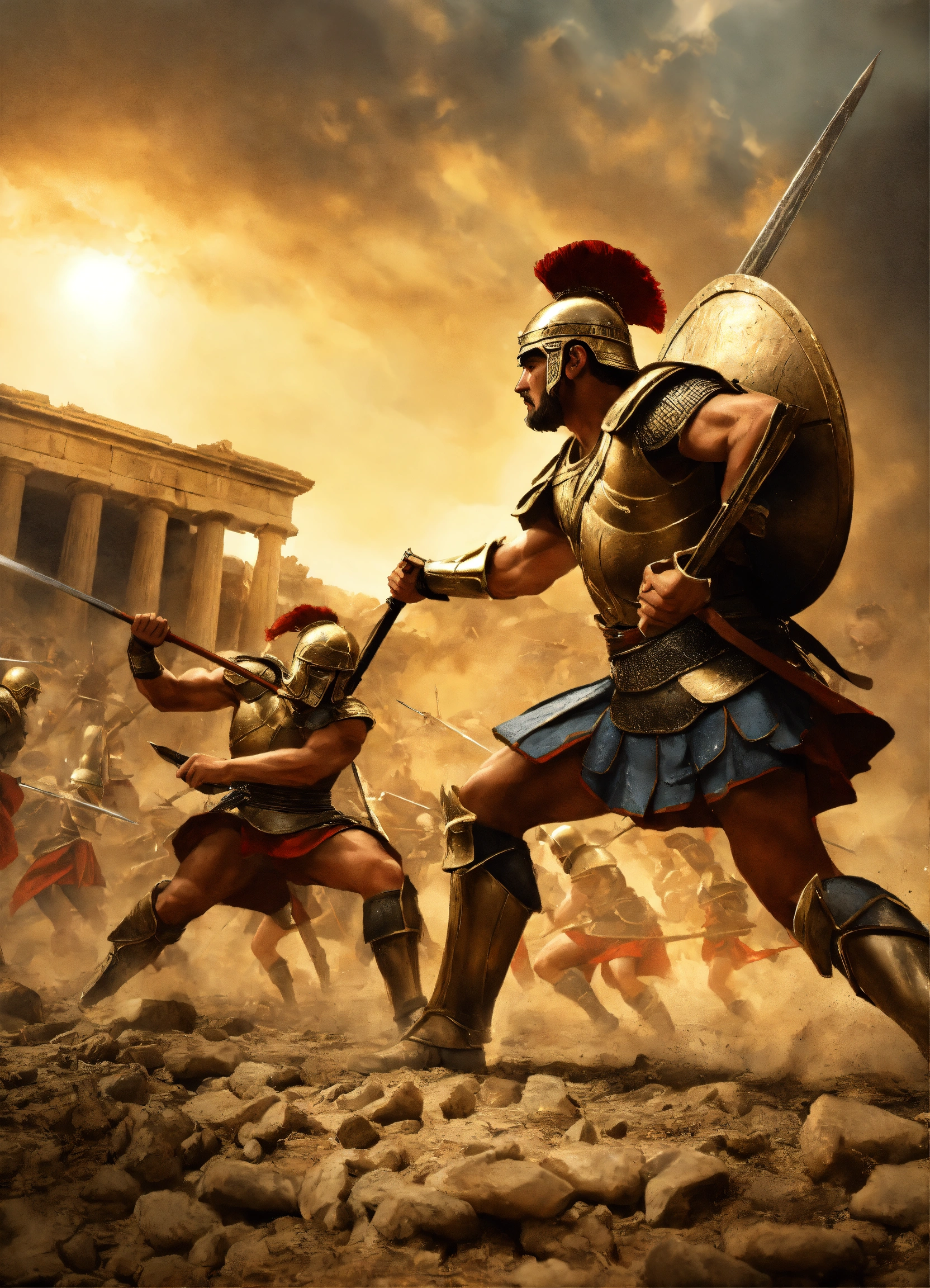 Aquiles, héctor, earth trembling under their might, ancient greece, center of the battlefield, intense focus as they engage in combat, ground cracking beneath them, low angle shot, hyper-realistic, photo realism, cinematography