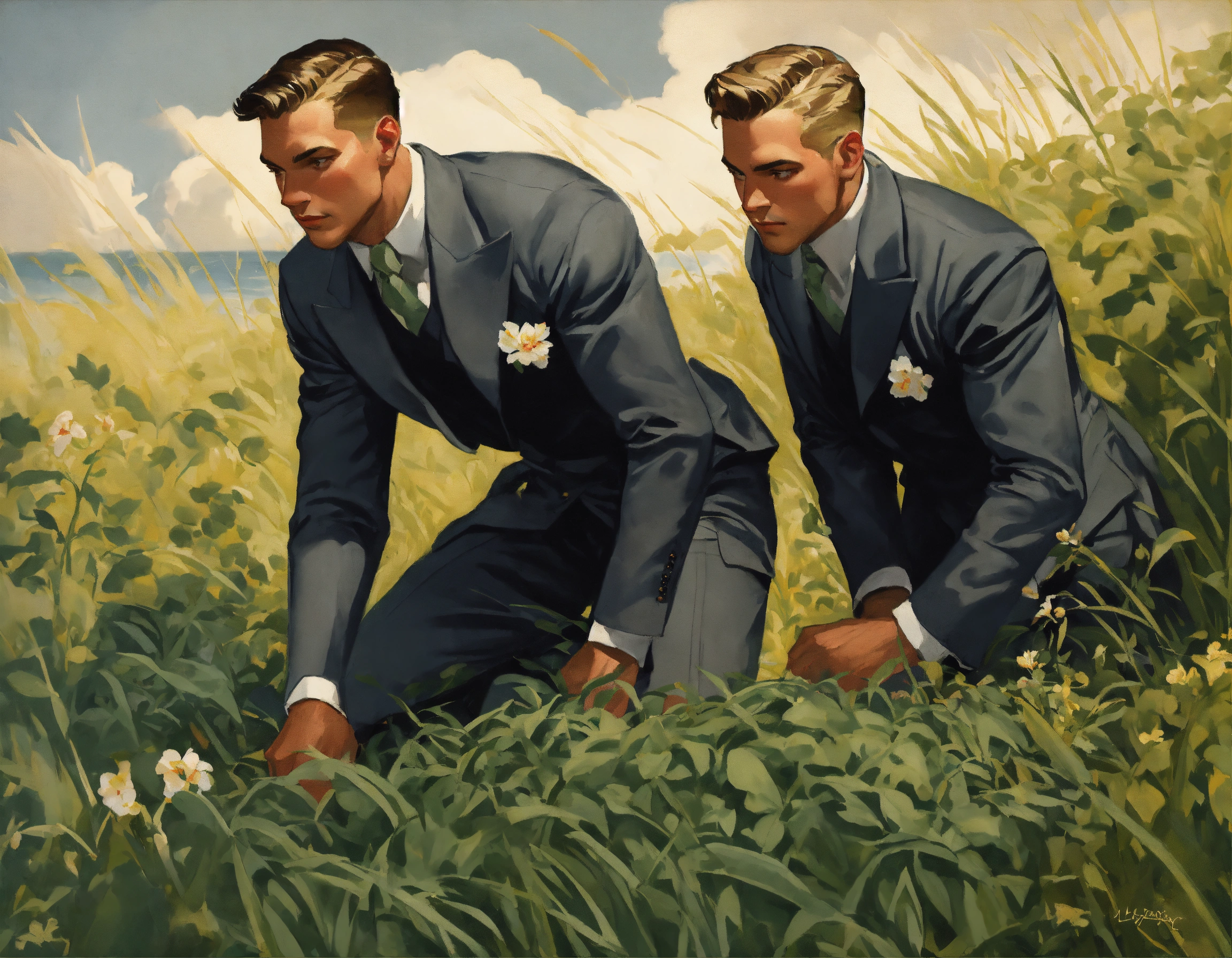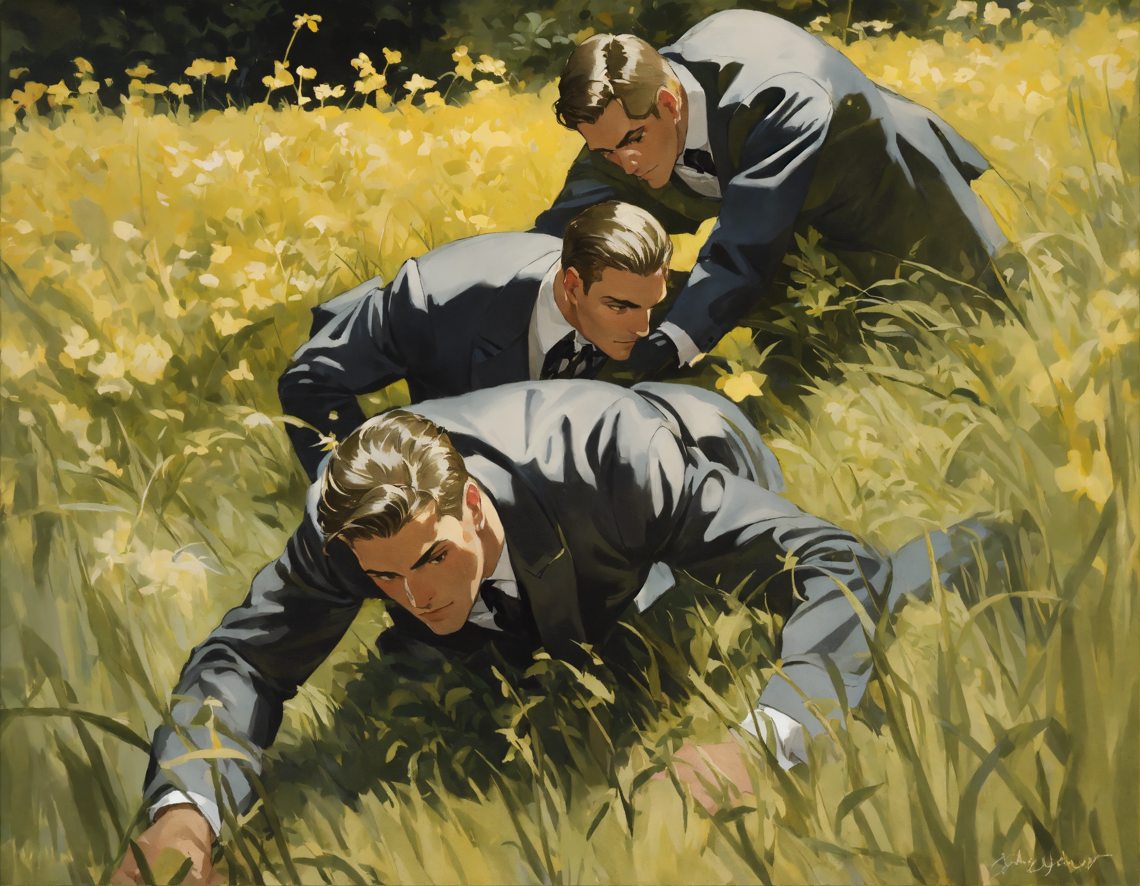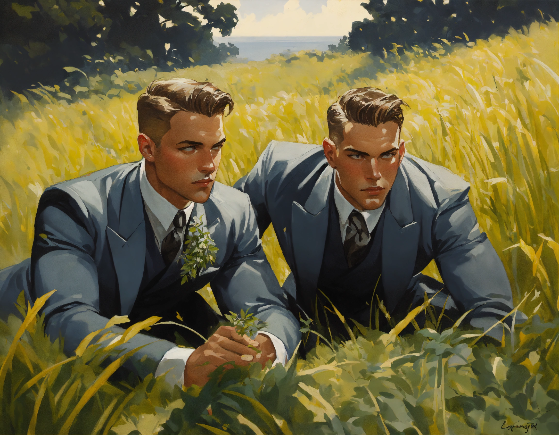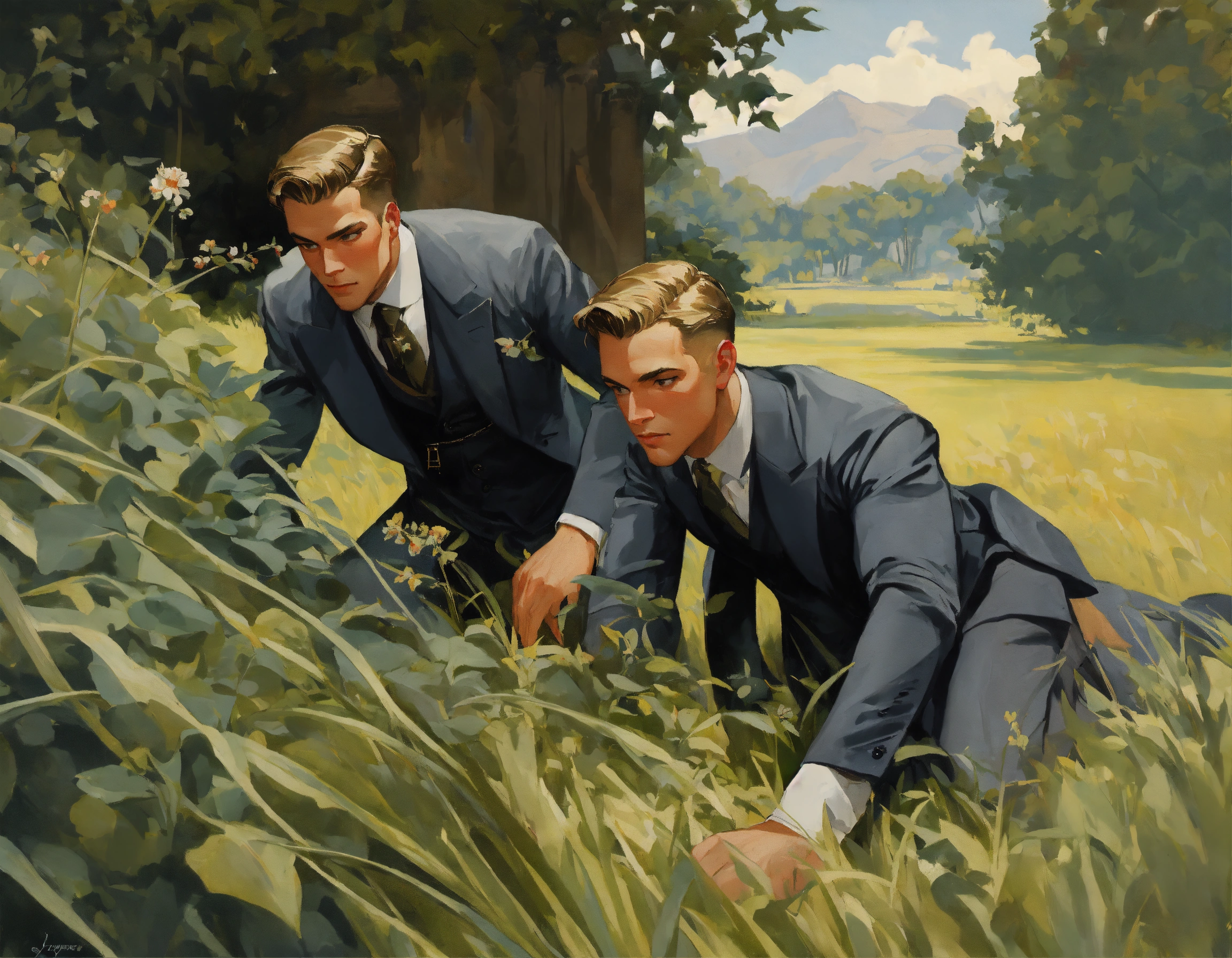 Two muscled male spies, dark grey vested suit, crawling in the grass, spying through the herbs, leyendecker style