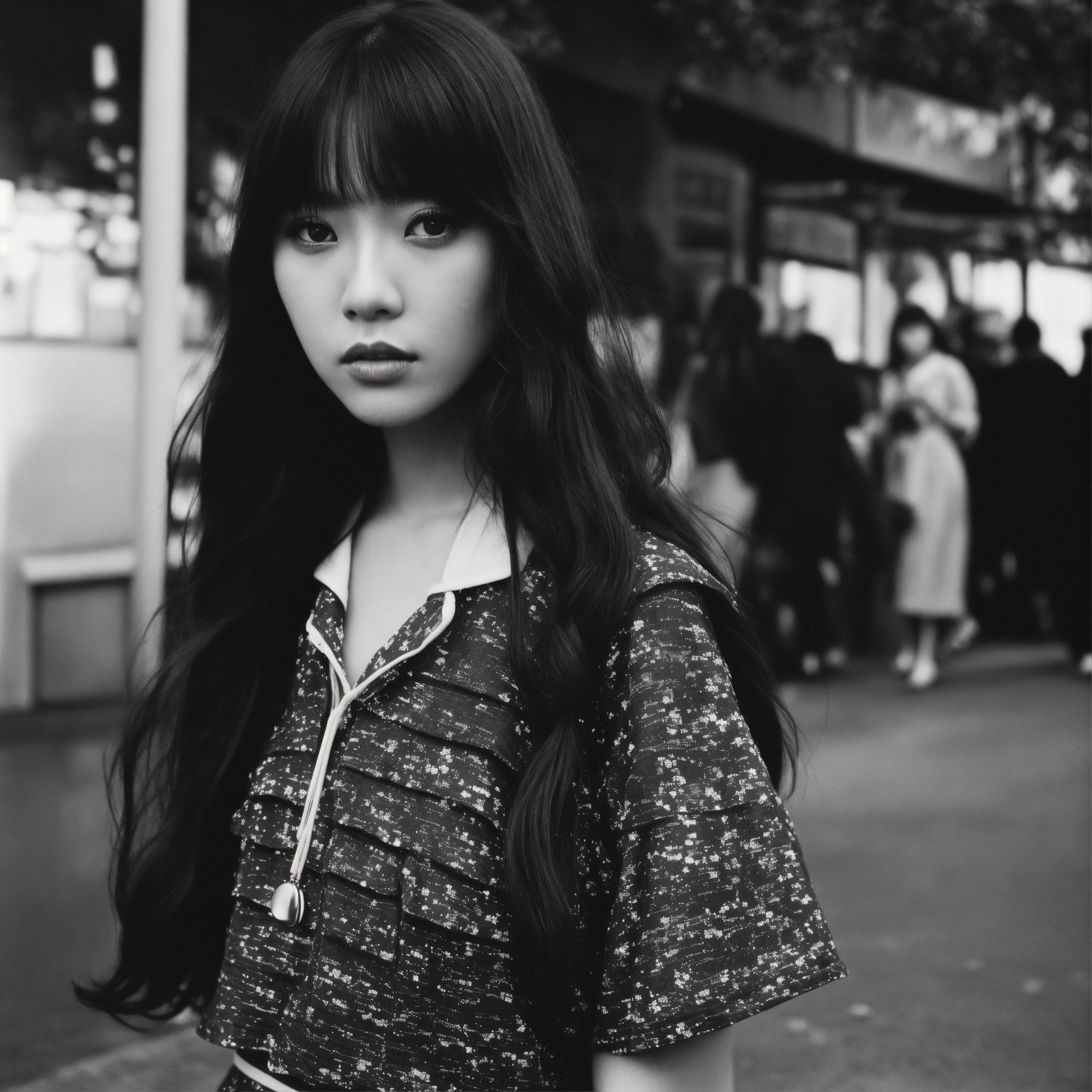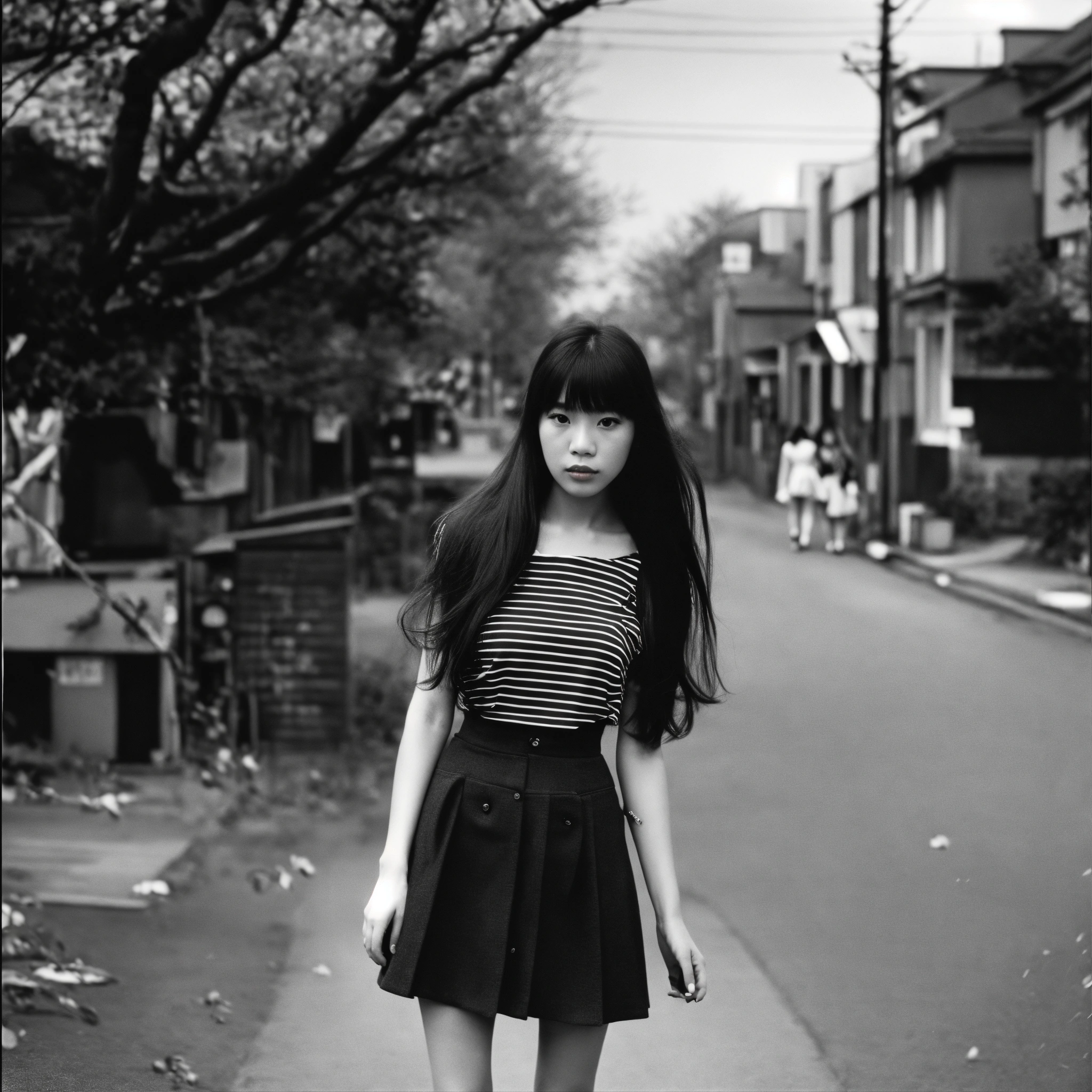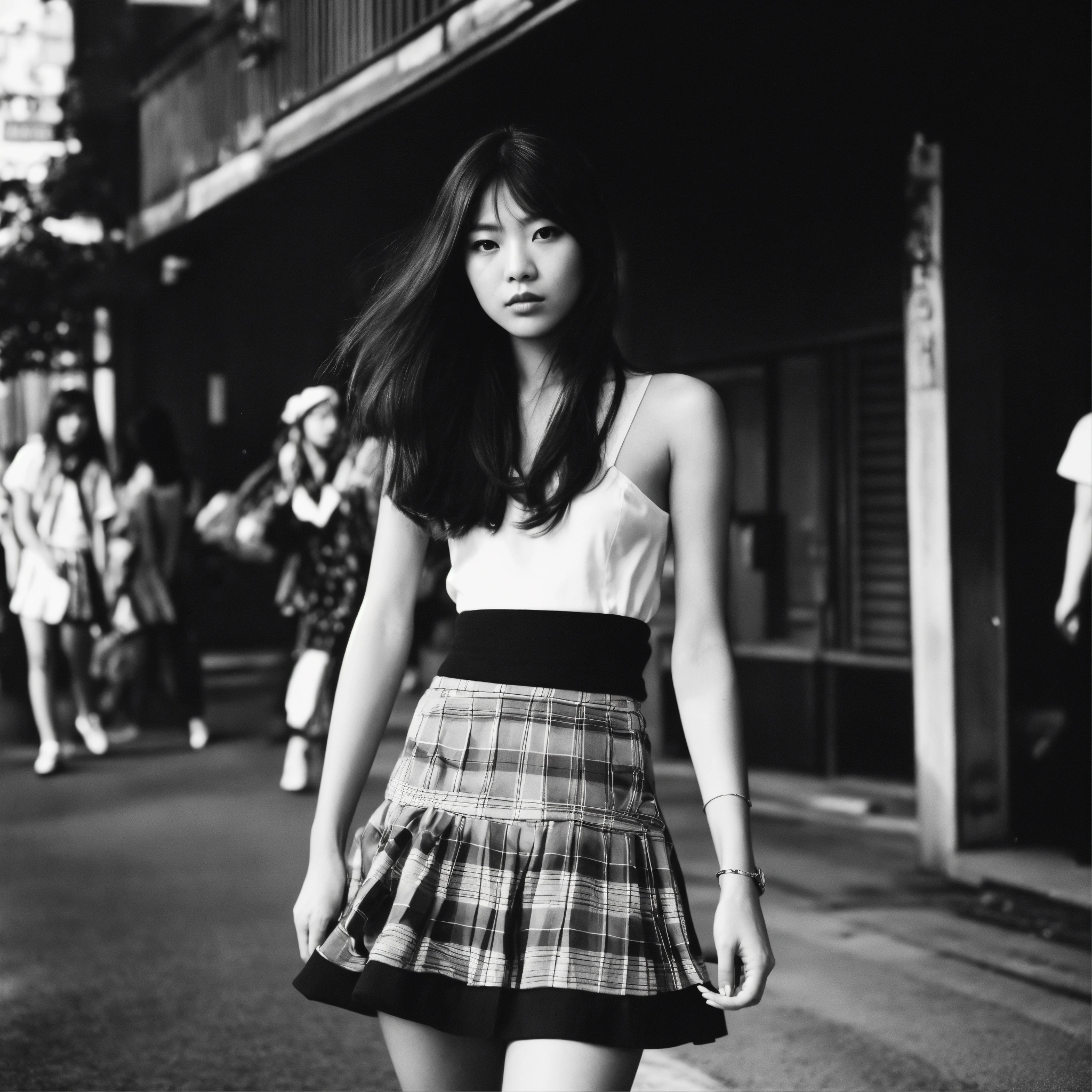 Extremely detailed photographic image, grained image, beautifully composed, monochrome image, 00's fashionable image, fashionable magazine photography, leica summicron 35mm f2.0, kodak 400tx, fashion photography, fashionable model, two beautiful japanese idol high school girls wearing a mini skirt, with long hair blowing in the wind, both staring into the camera, with no intimacy, a objective close-up portrait like diane arbus