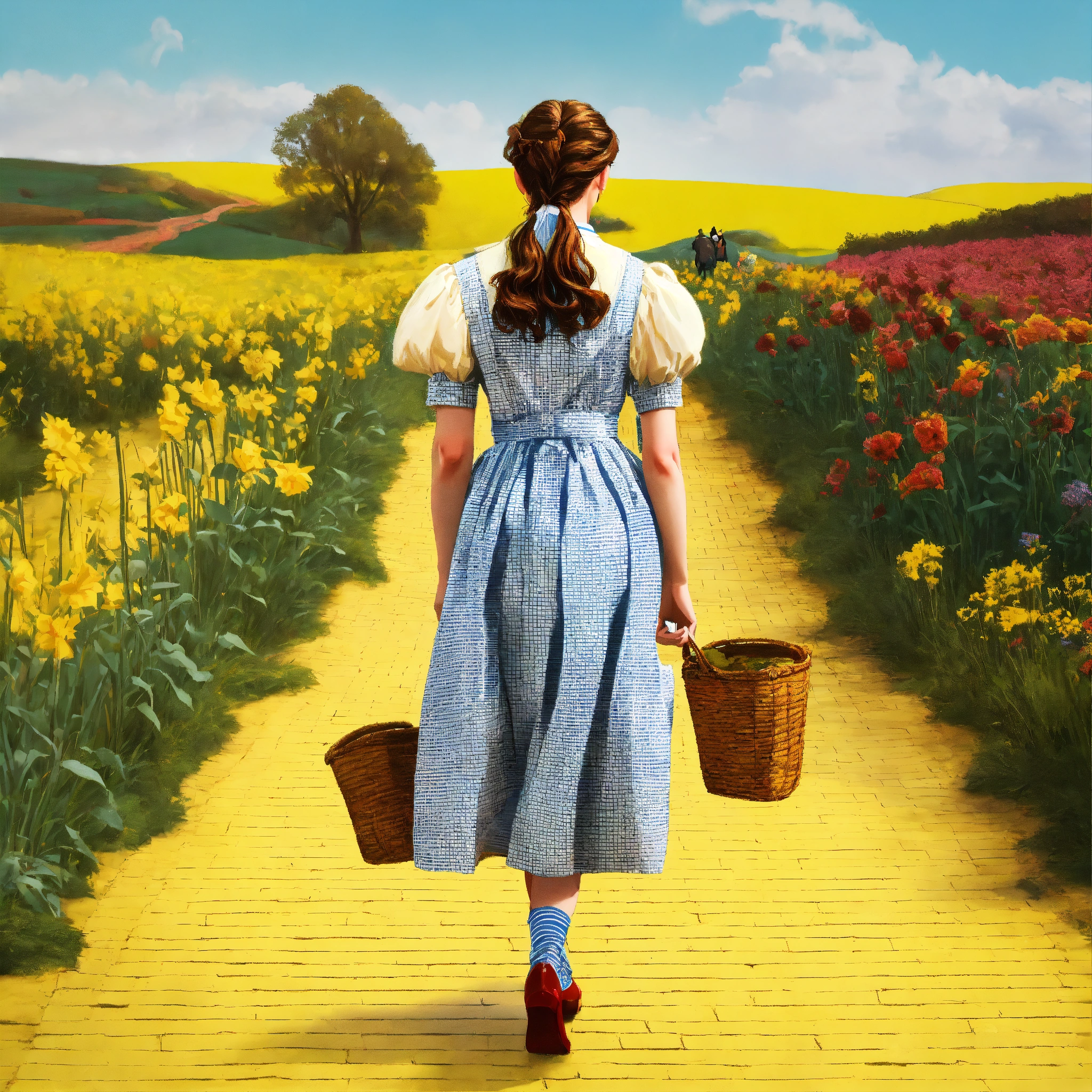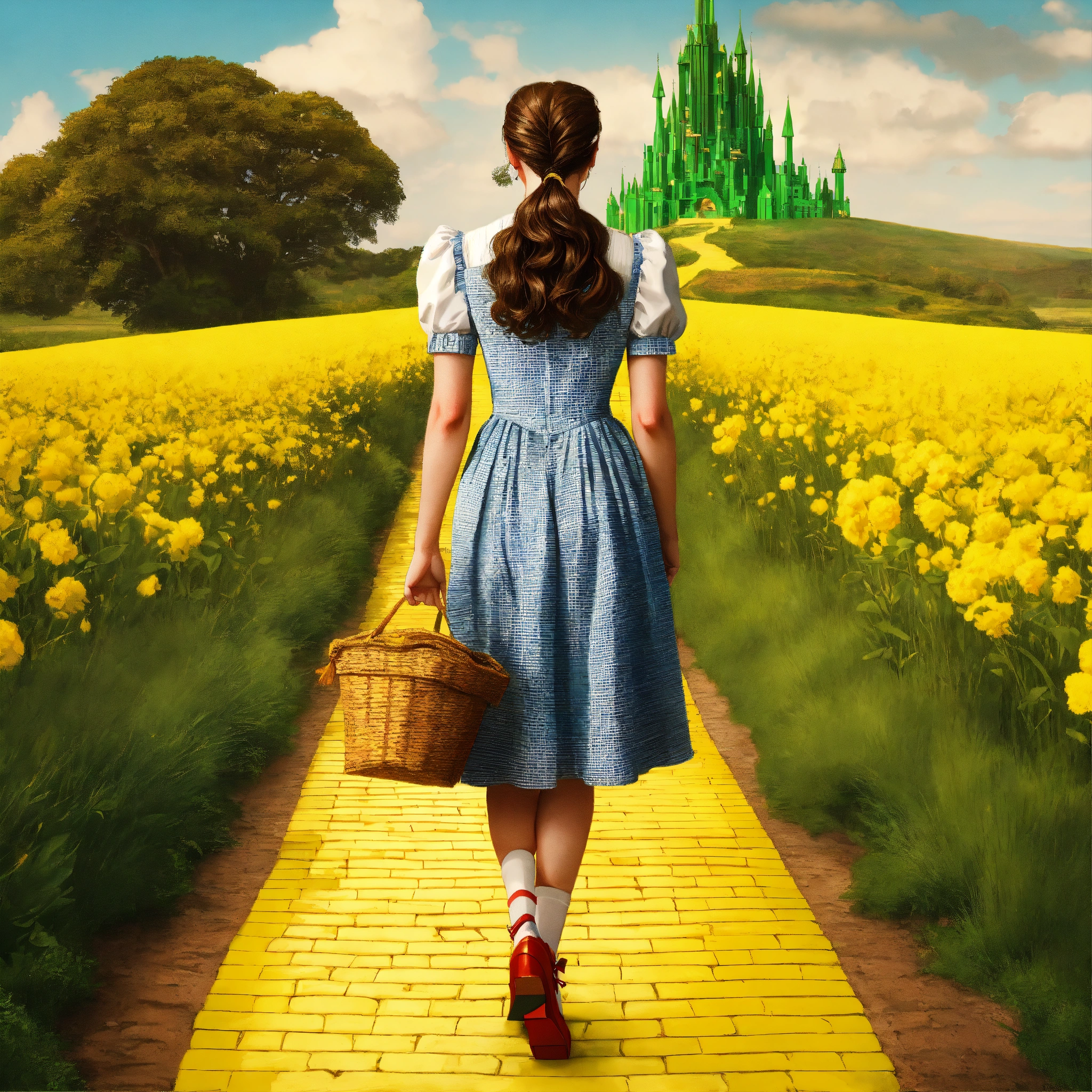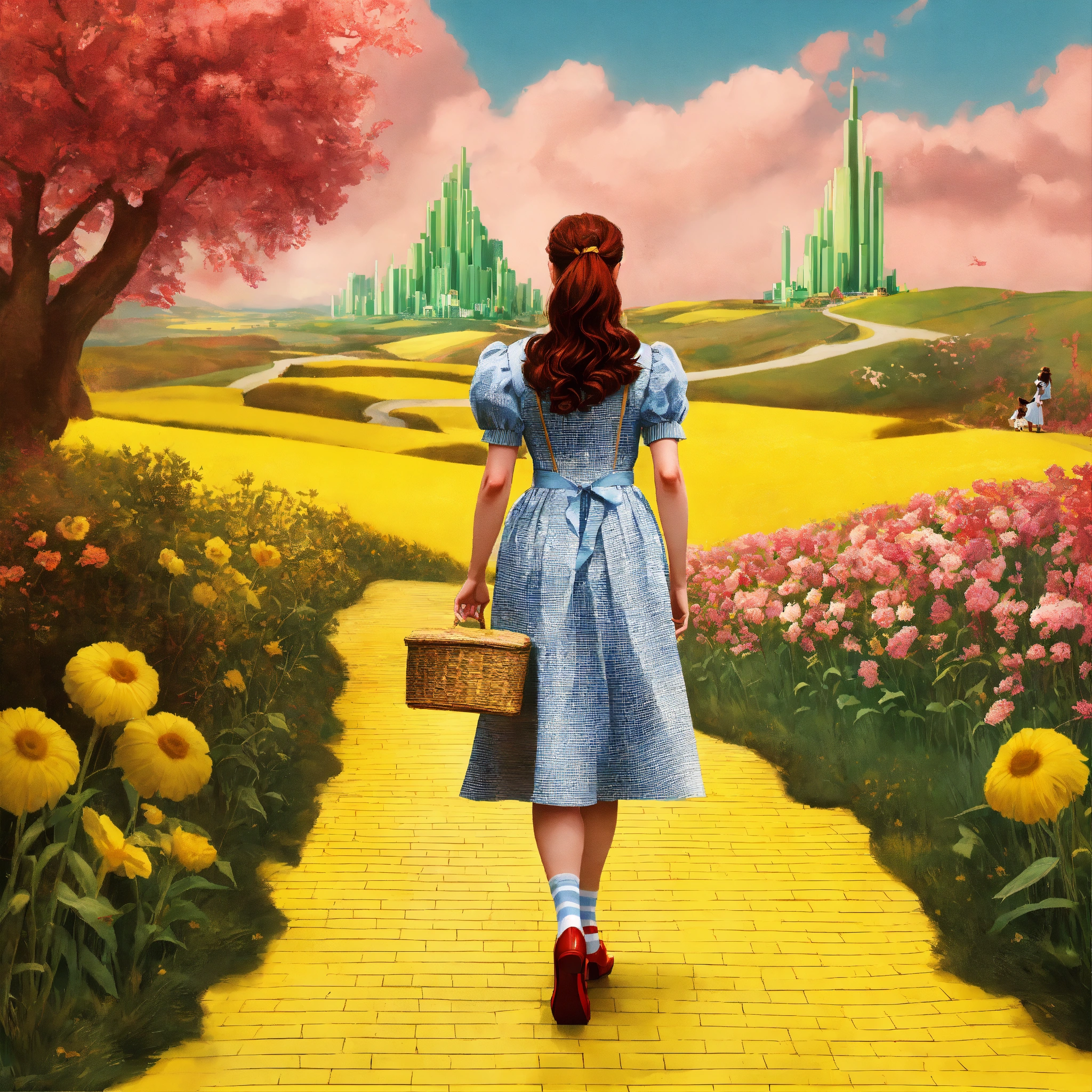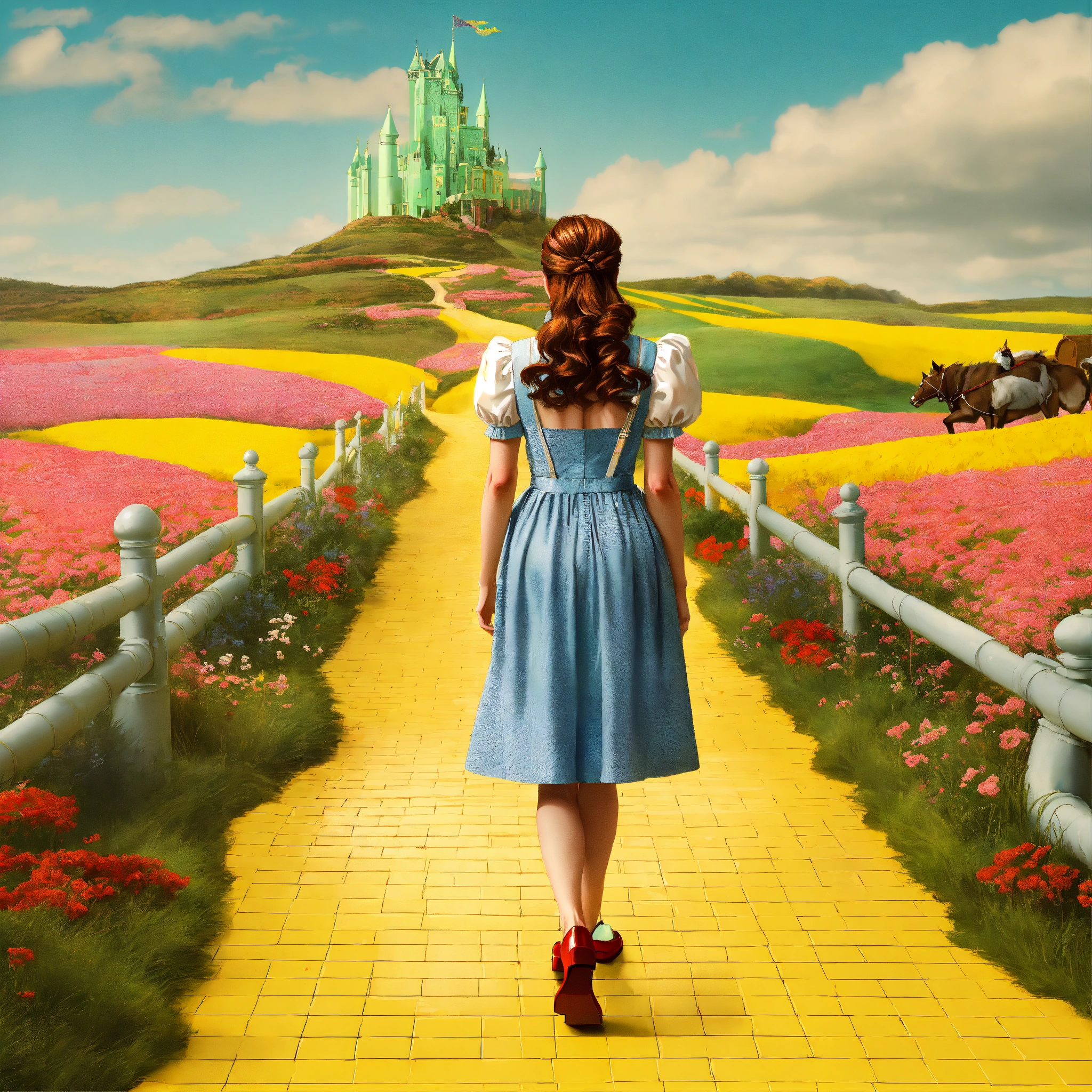 A realistic photograph of dorothy in the wizard of oz walking away down the yellow brick road, wes anderson colour palette