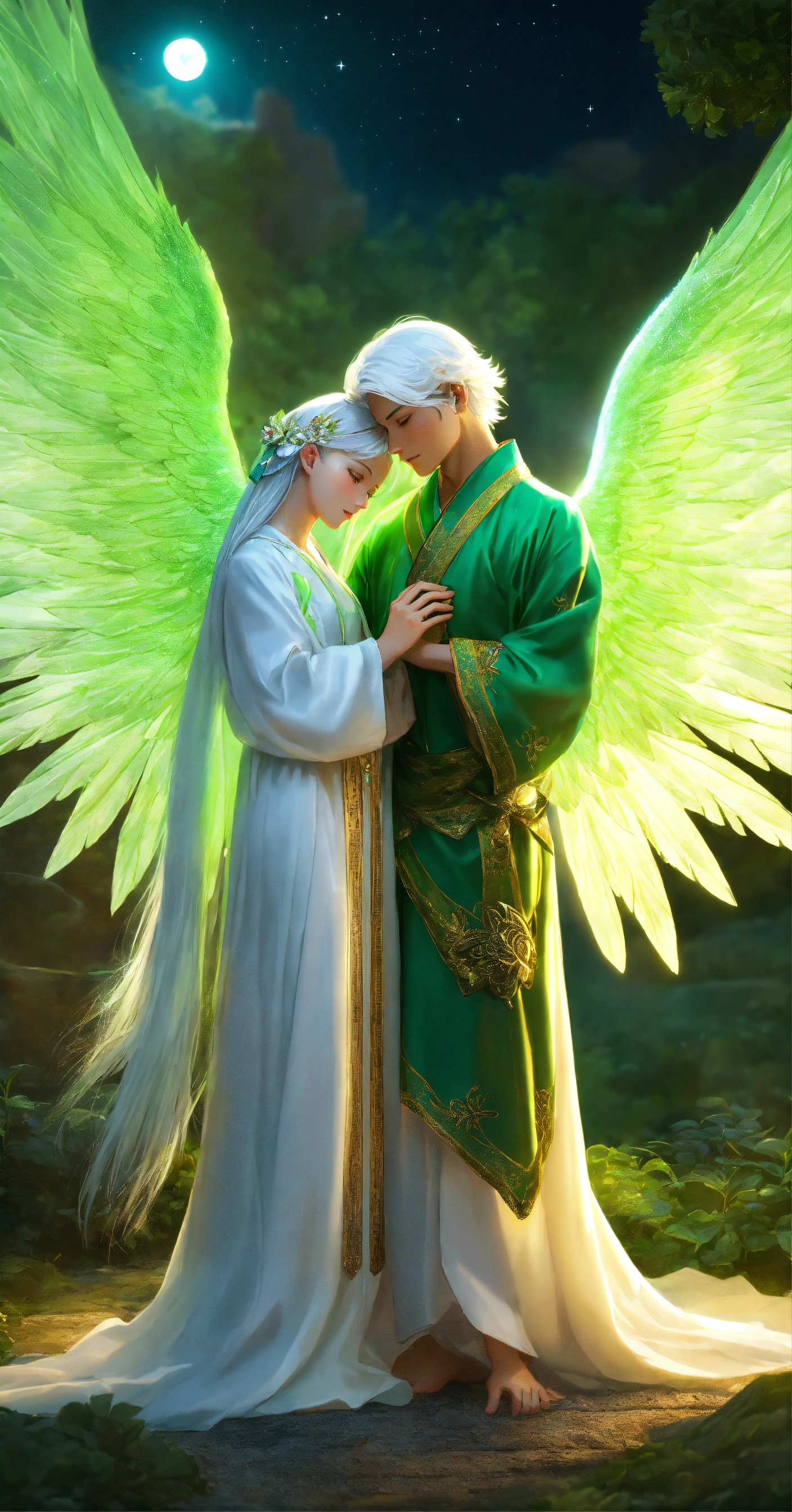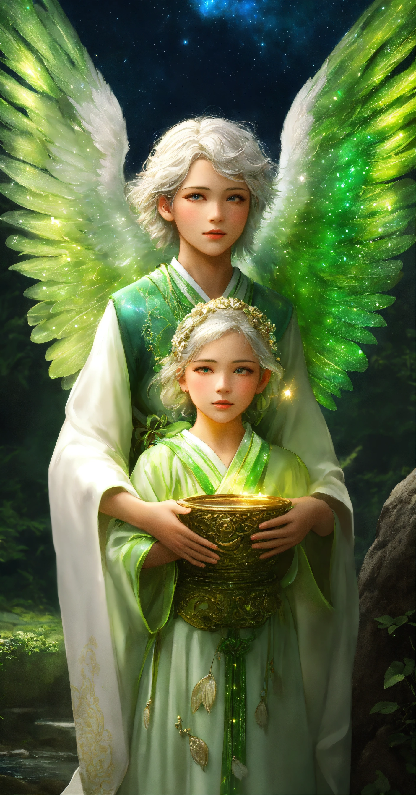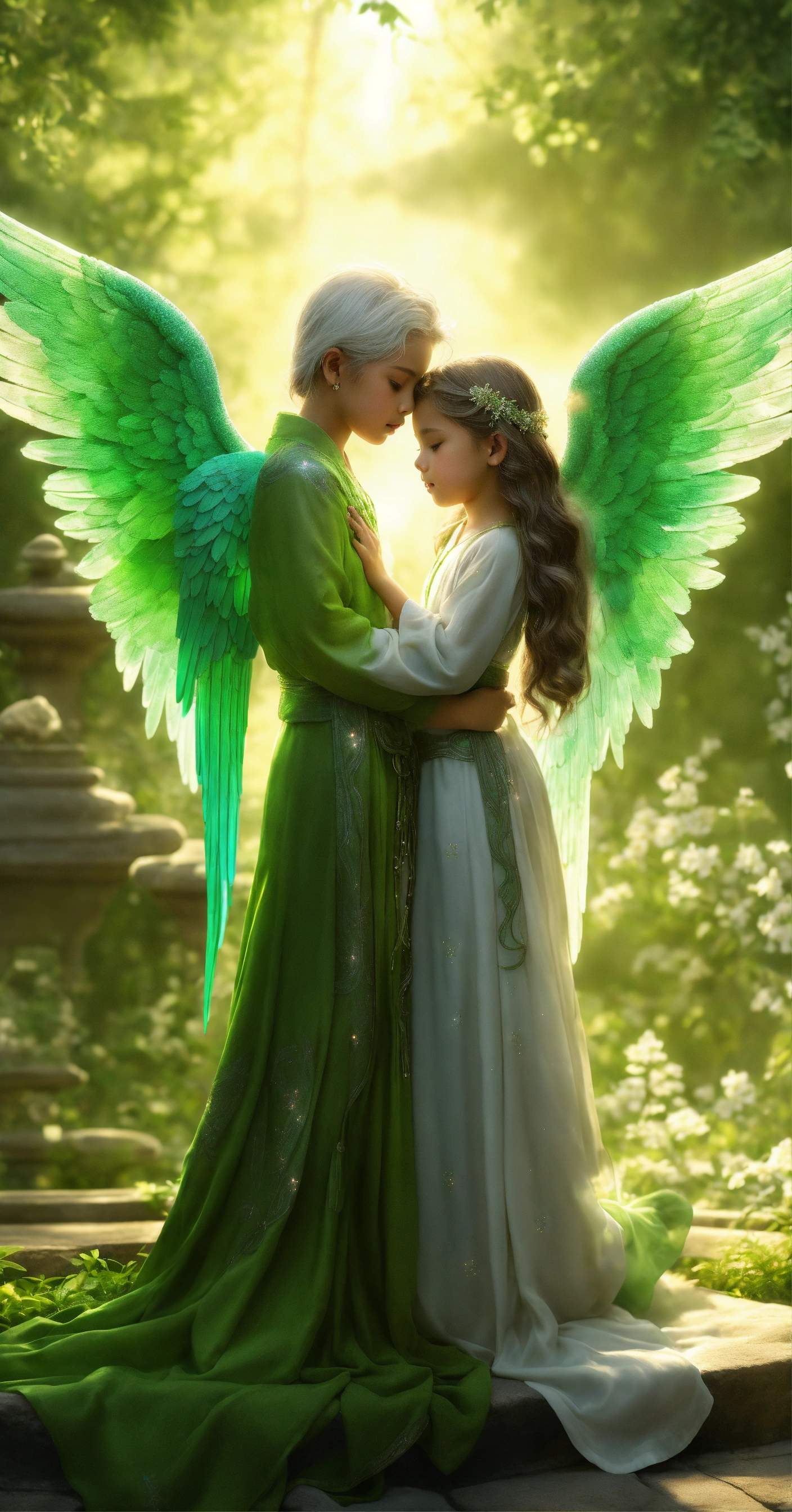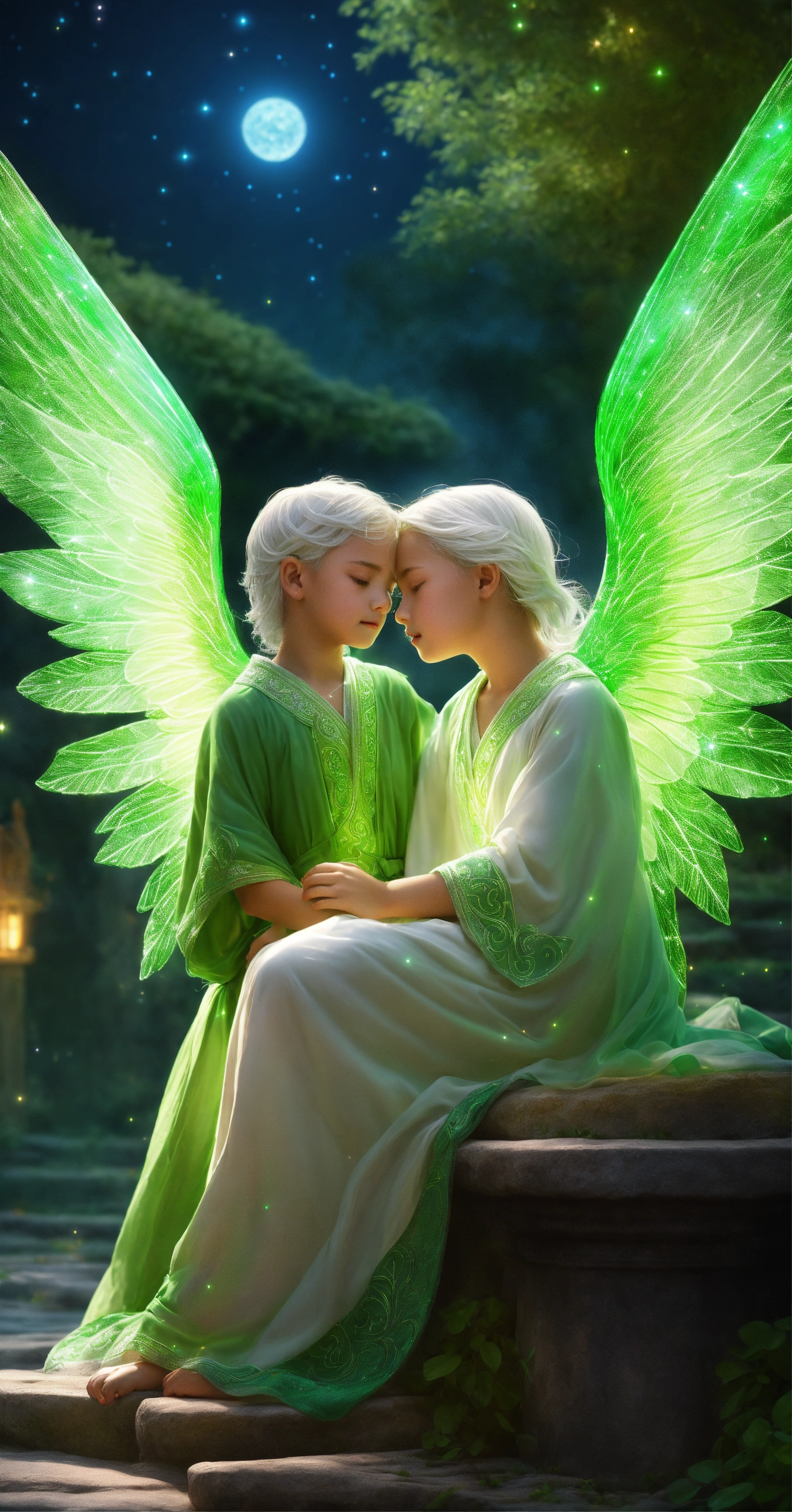 2 guardian angels, one is a boy and the other angel is a 7-year-old girl with detailed and luminous green angel wings. 1 30-year-old male angel hugging a 7-year-old girl angel. the two male and female angels have large, uniform luminous green wings. their faces beautiful and detailed. very clear eyes that open with a deep and penetrating look. detailed and defined white hair. white tunic-type dresses with many green details with luminous sparkles. they are in a beautiful, detailed zen garden with a night sky. hyper-detailed, hyper-realistic illustration. realism. masterpiece. digital art, hd, high quality. high definition, high definition. 8k.