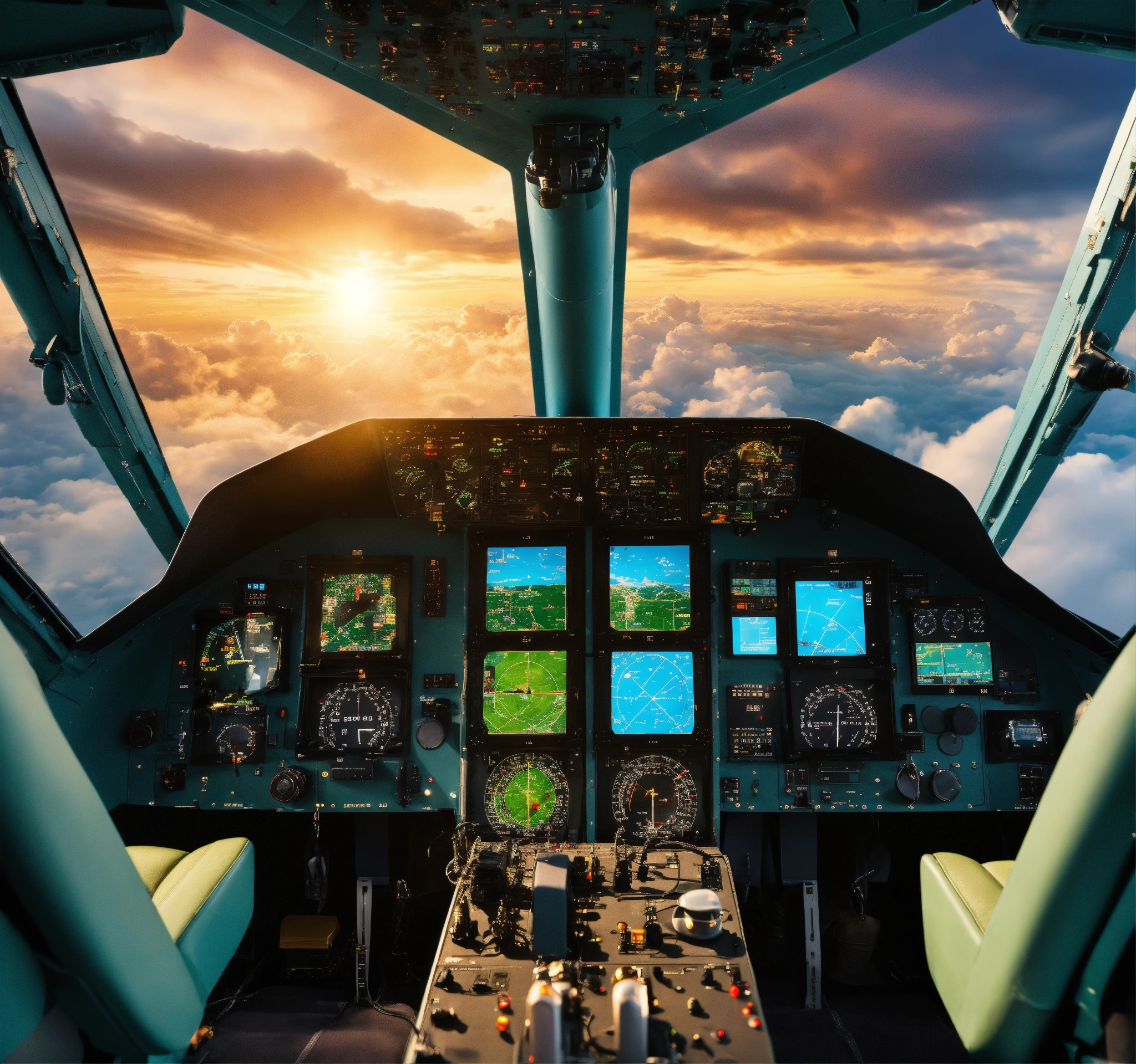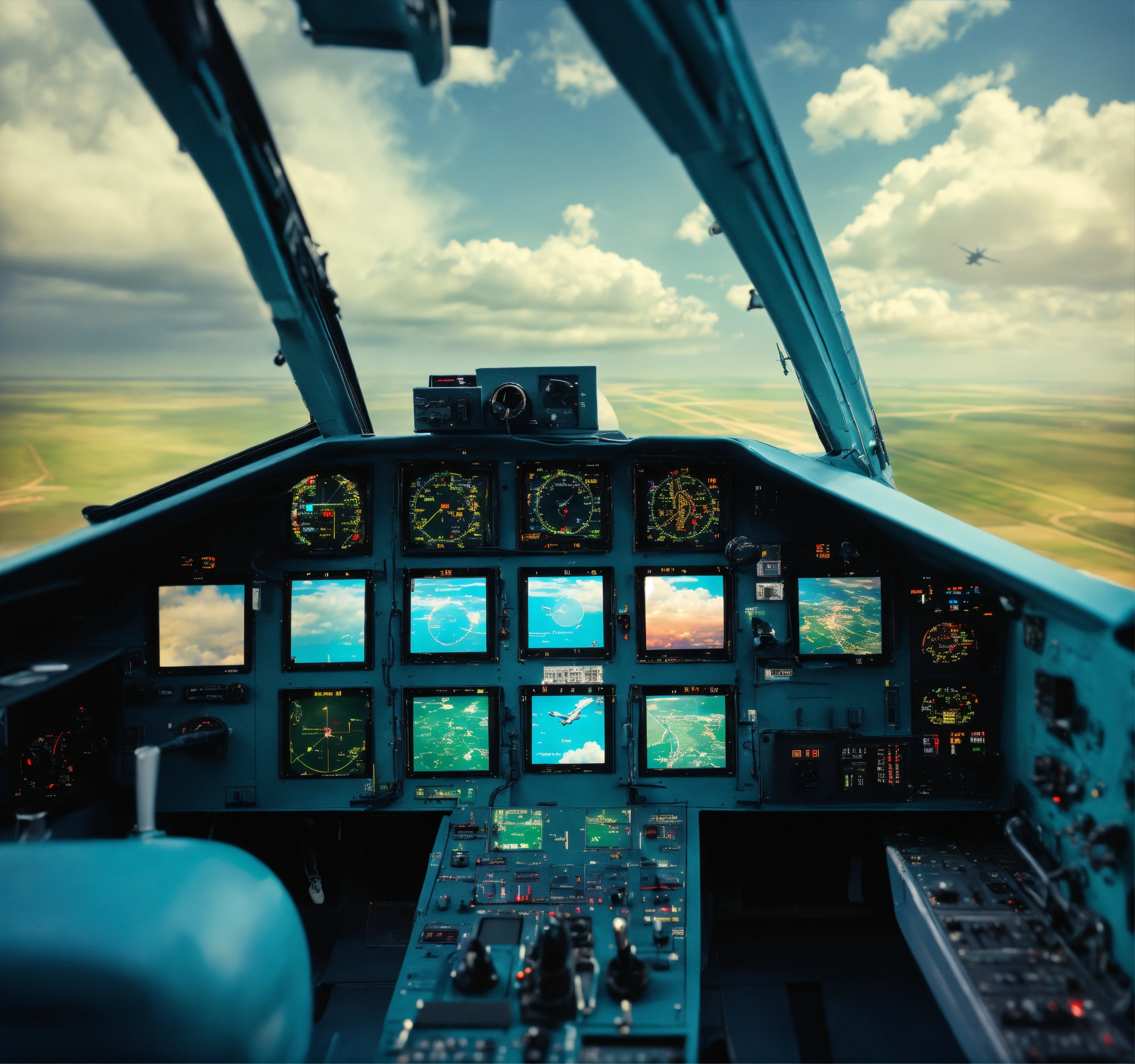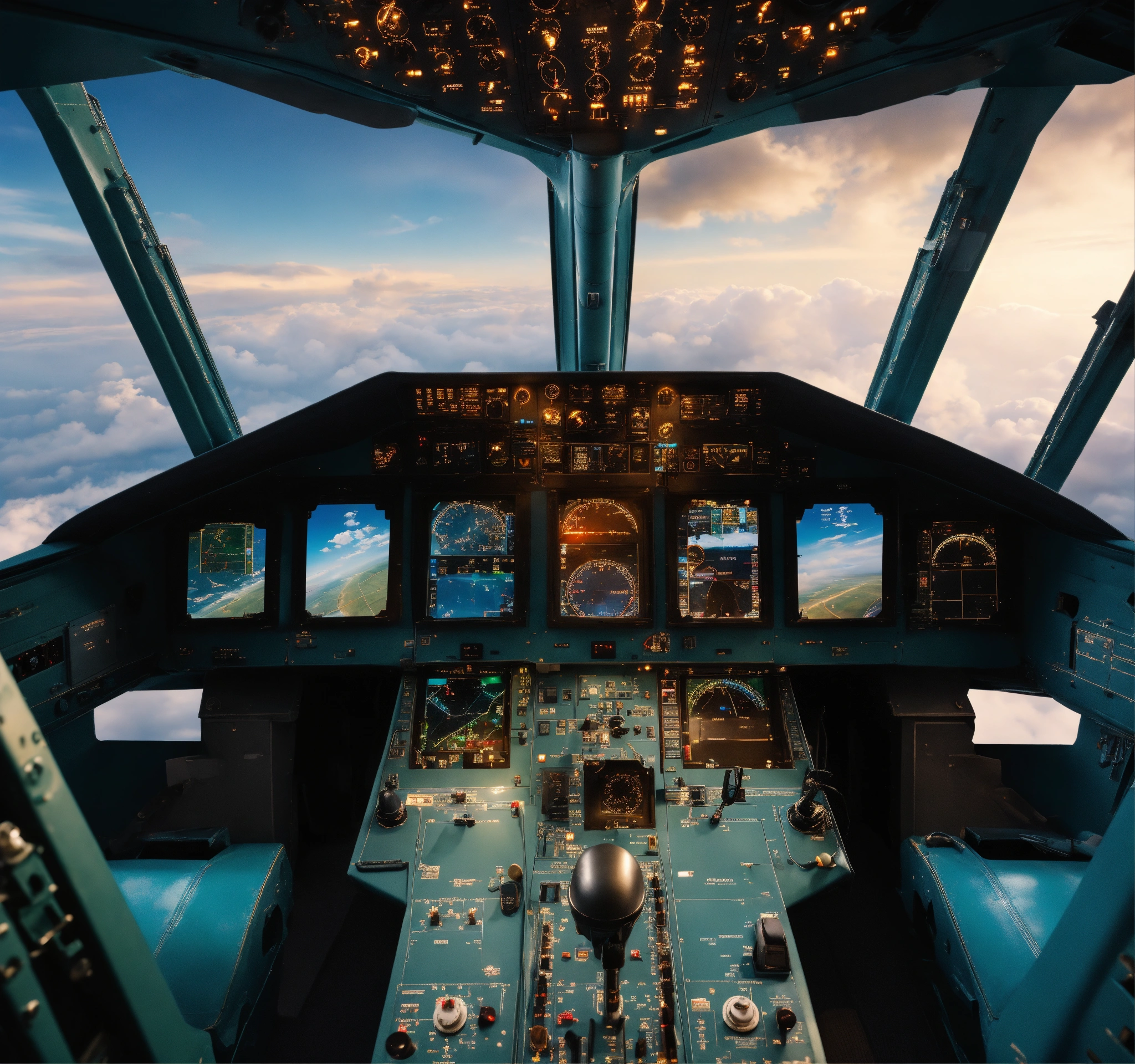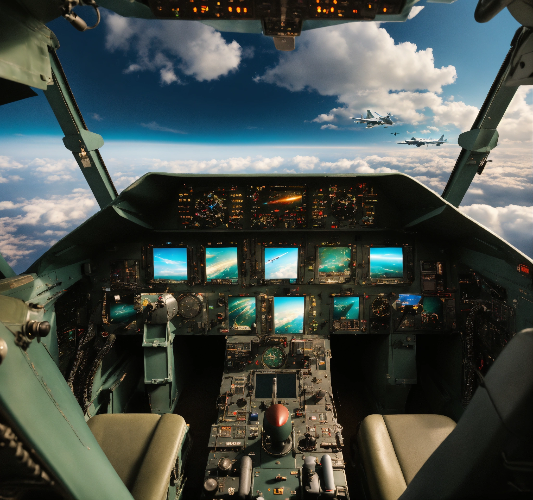 Control panel of the su-34 aircraft, space and sky are flying around the aircraft, clouds, photorealistic image