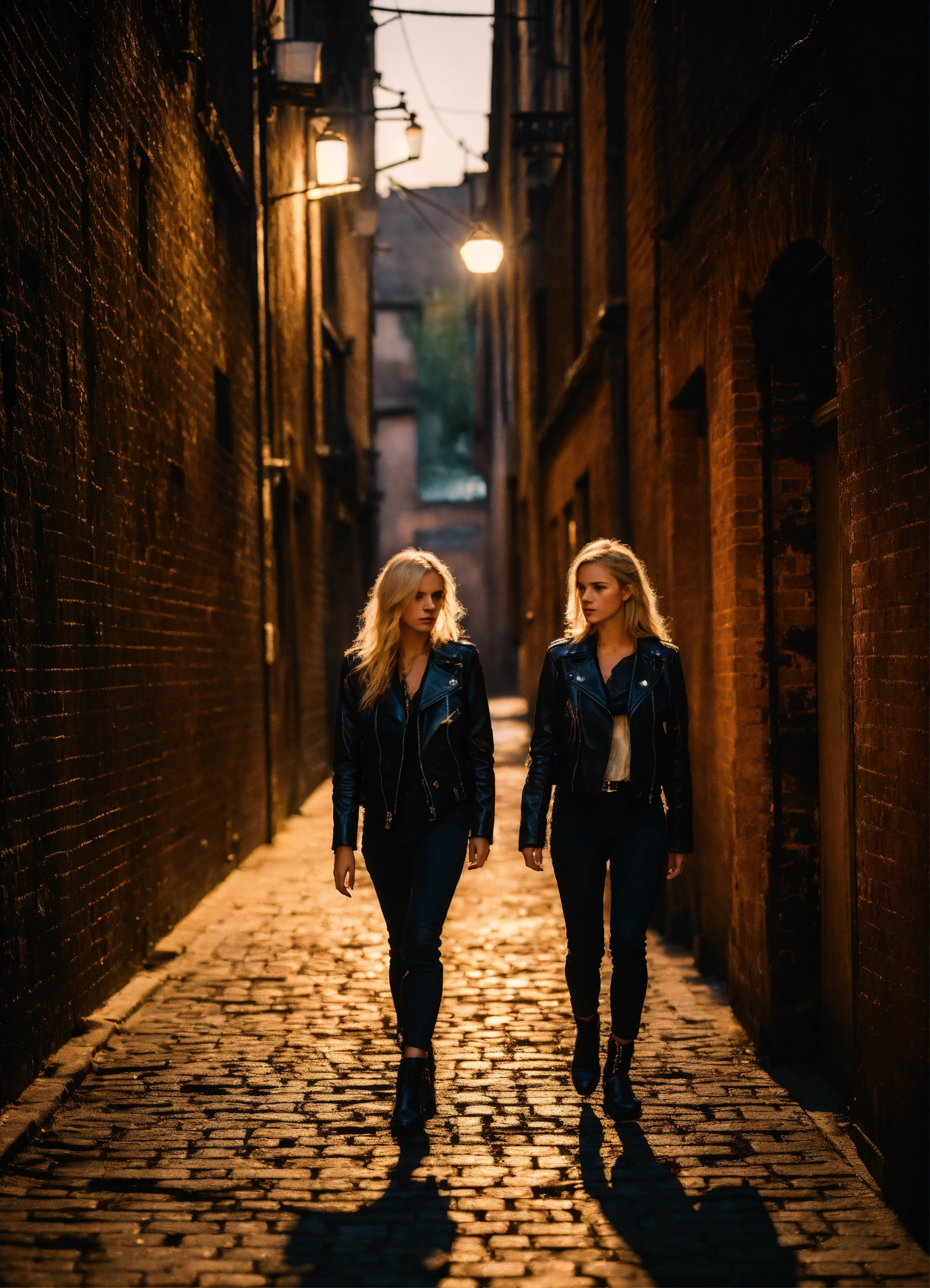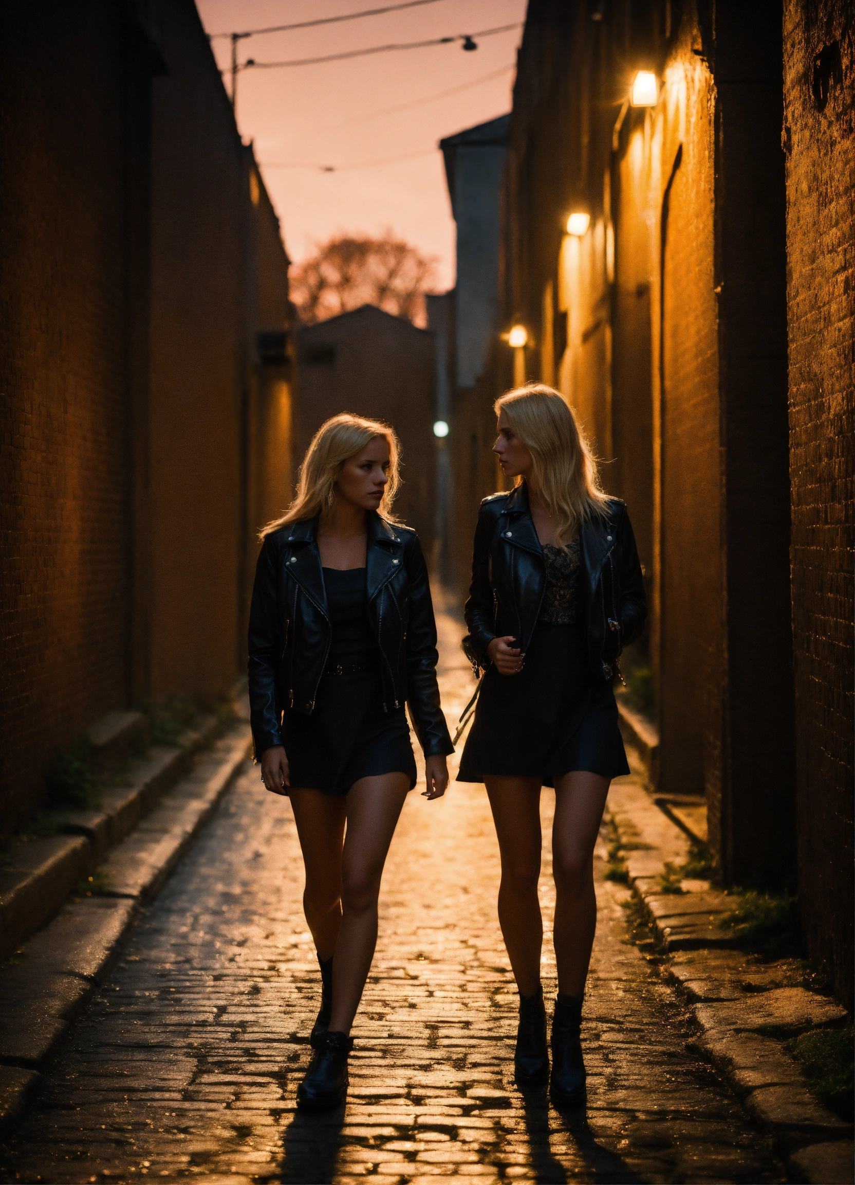 Two blond young women, wearing a black leather jacket and summerdress, walking in a dark alley, beautiful, moody lighting, best quality, full body portrait, real picture, intricate details, depth of field, fujifilm xt3, outdoors, beautiful lighting, raw photo, 8k uhd, film grain, dark hues, moody