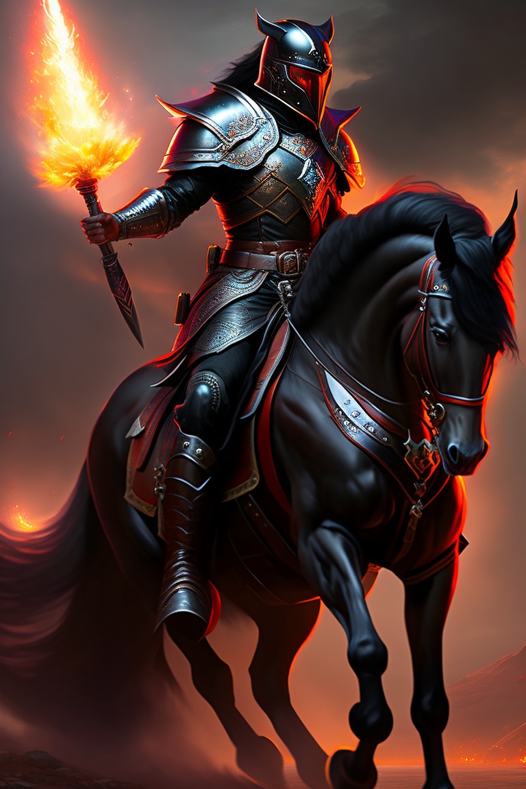 A dark paladin riding a black horse. wering a black