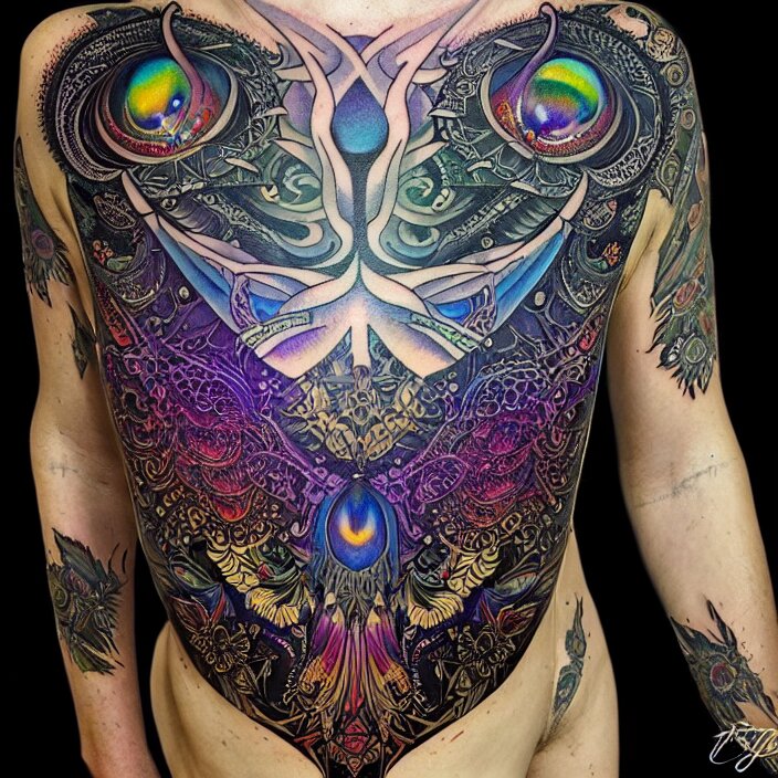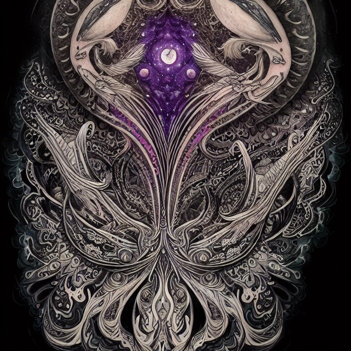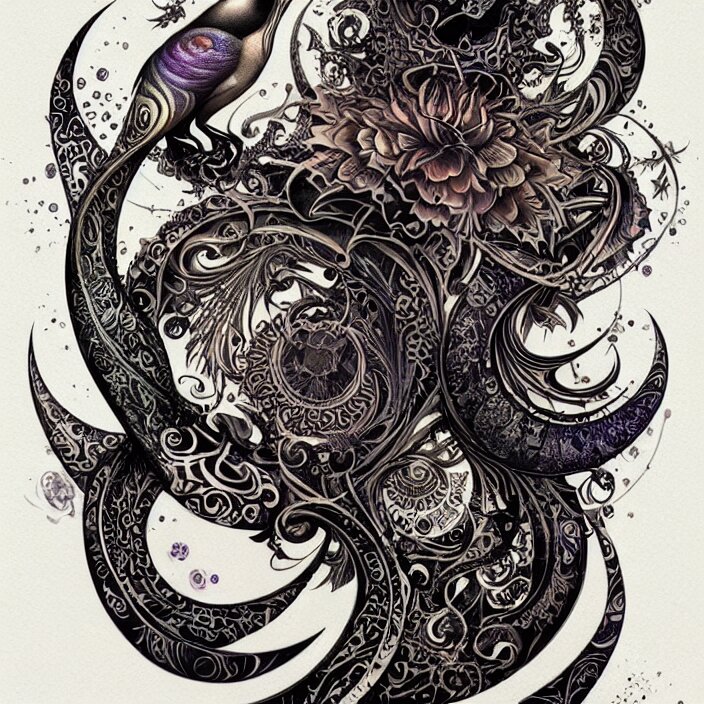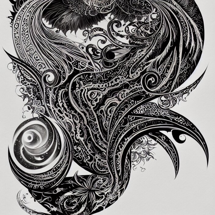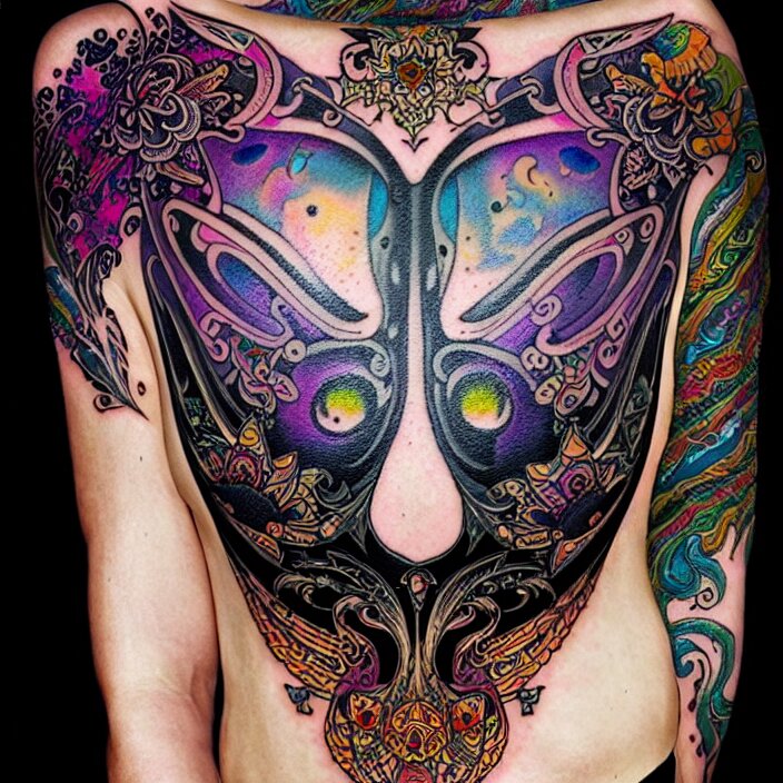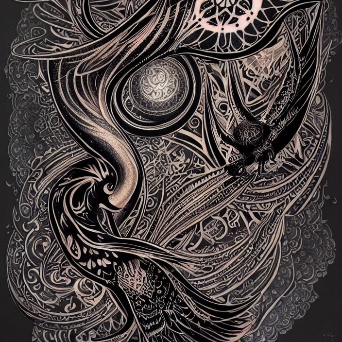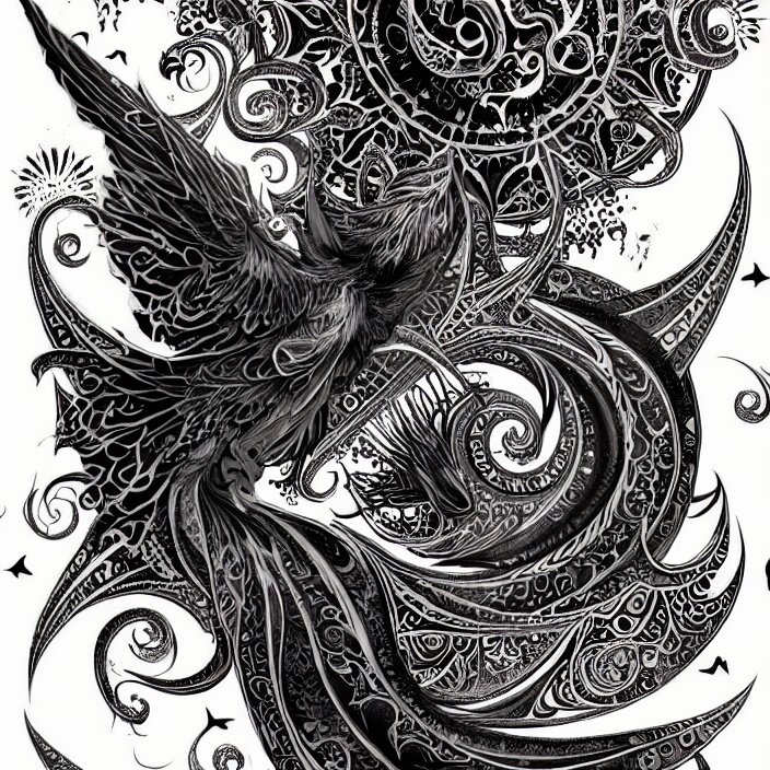 Extremely psychedelic tattoo design made of cressent moon and black bird, lsd tattoo design, diffuse lighting, fantasy, intricate, elegant, highly detailed, lifelike, photorealistic, digital painting, artstation, illustration, concept art, smooth, sharp focus, art by john collier and albert aublet and krenz cushart and artem demura and alphonse mucha