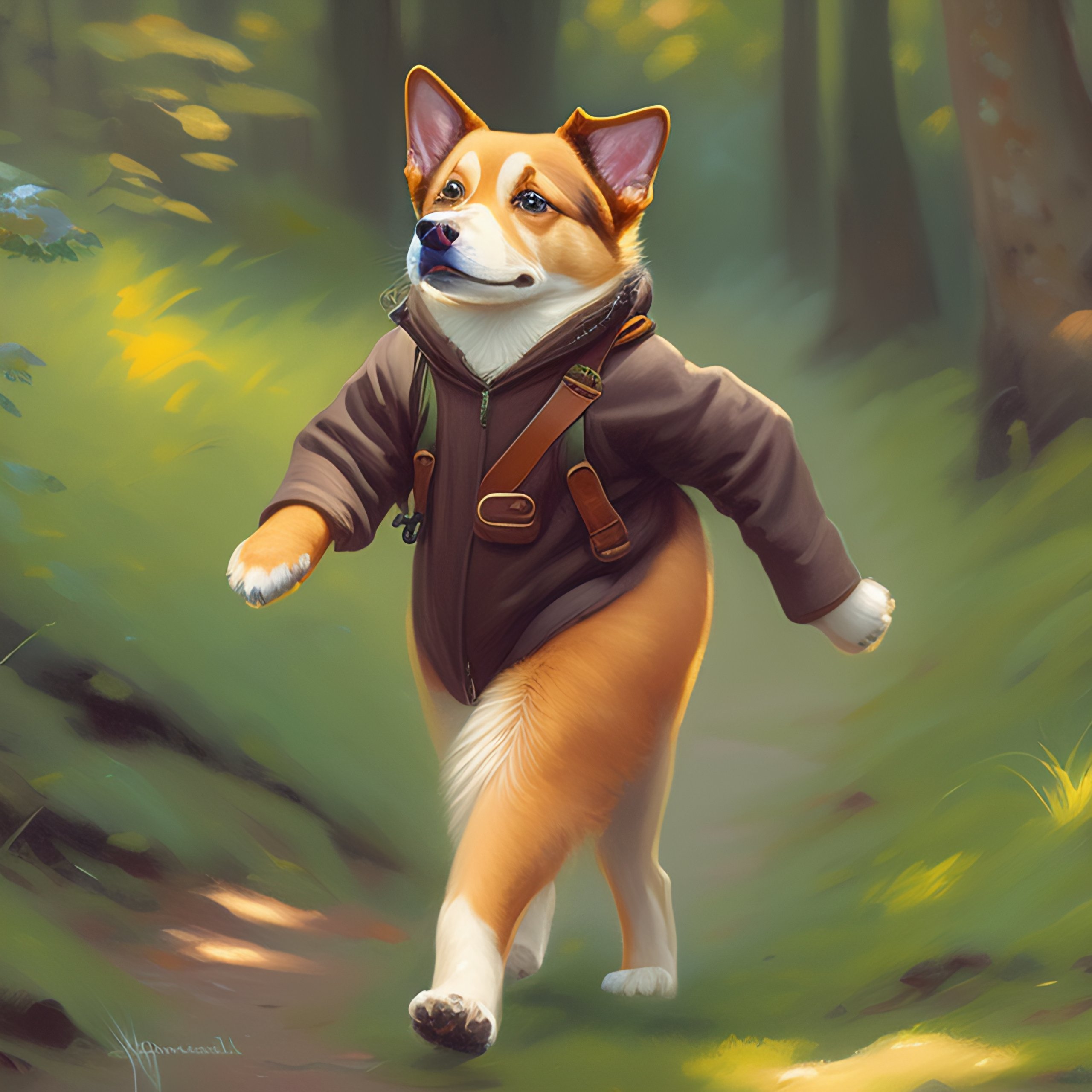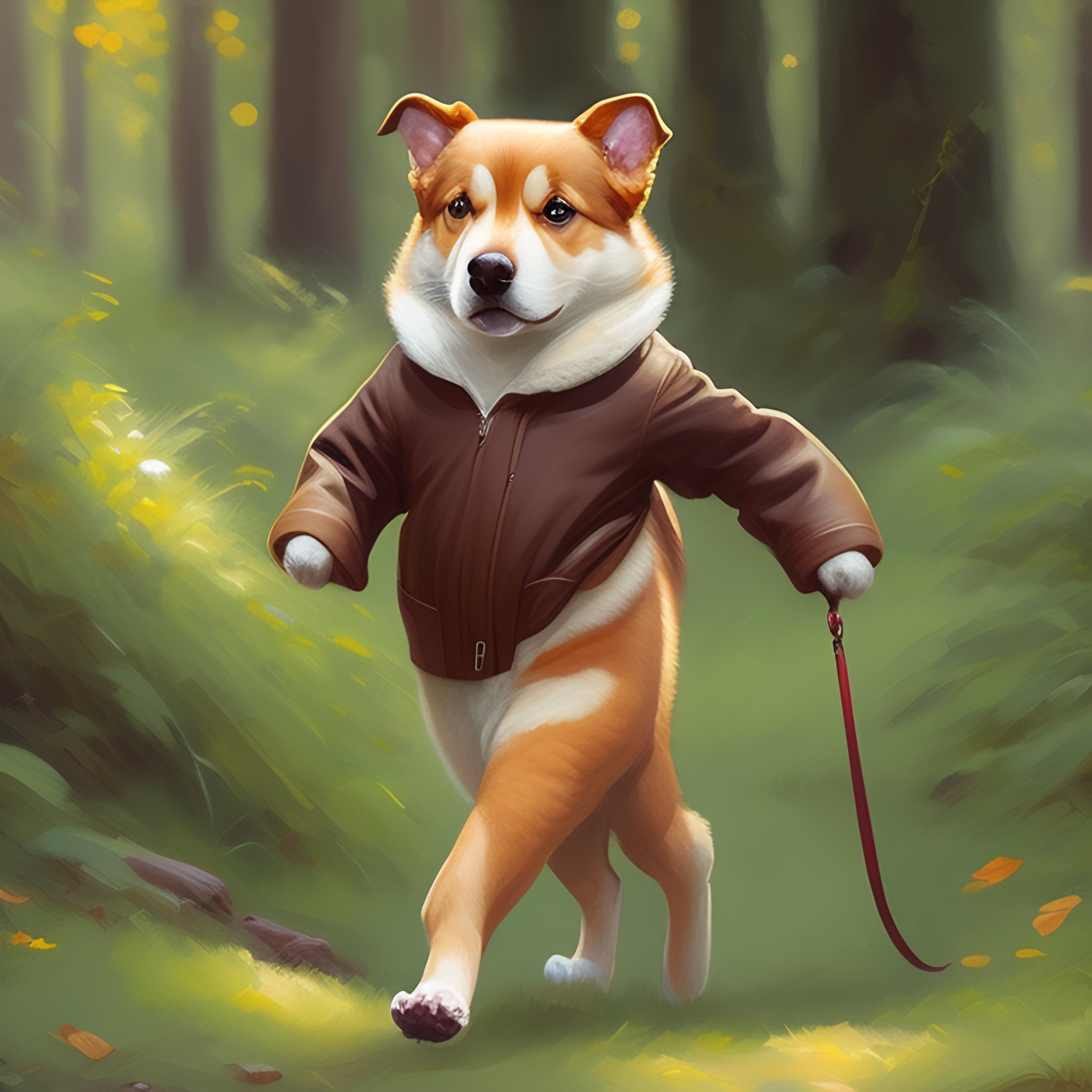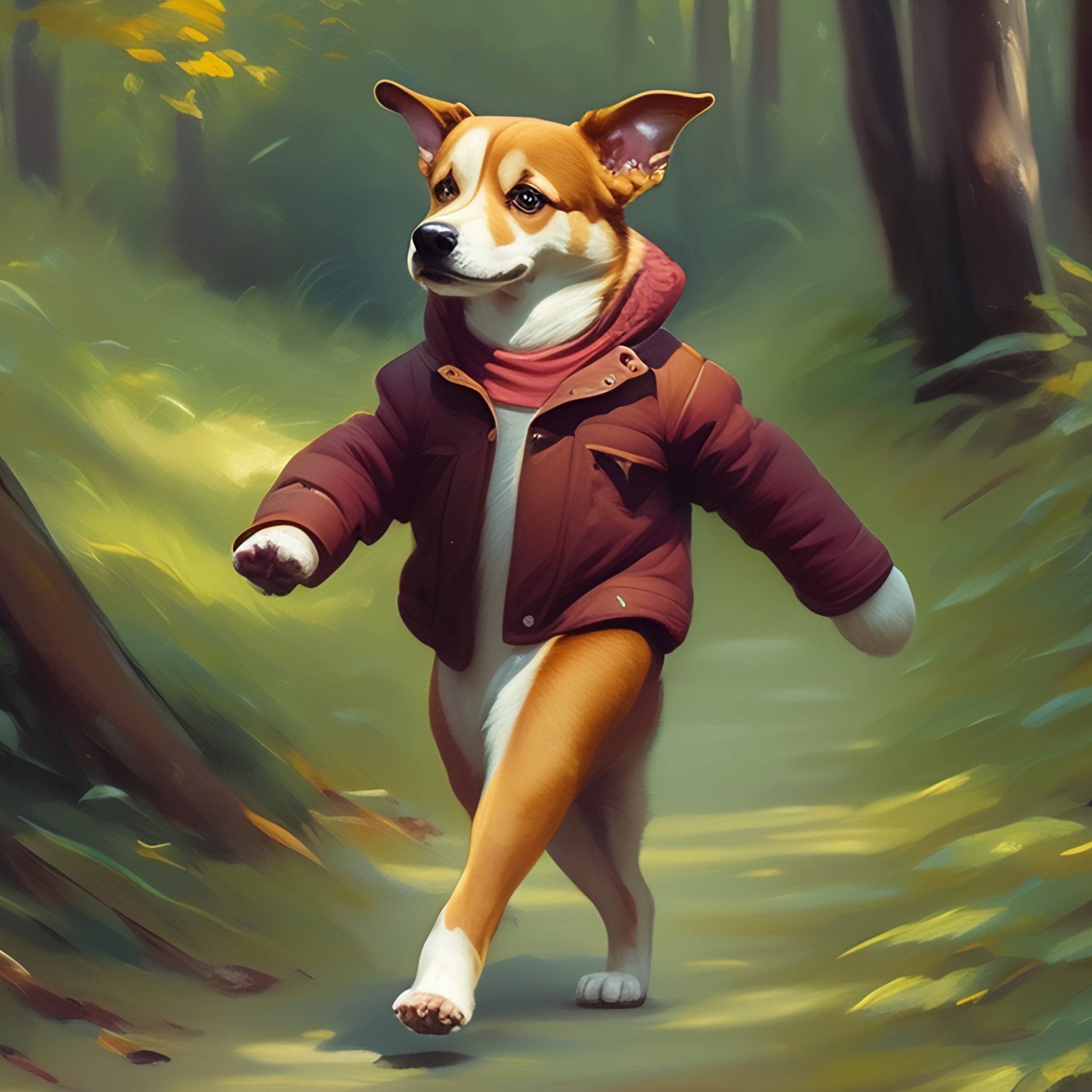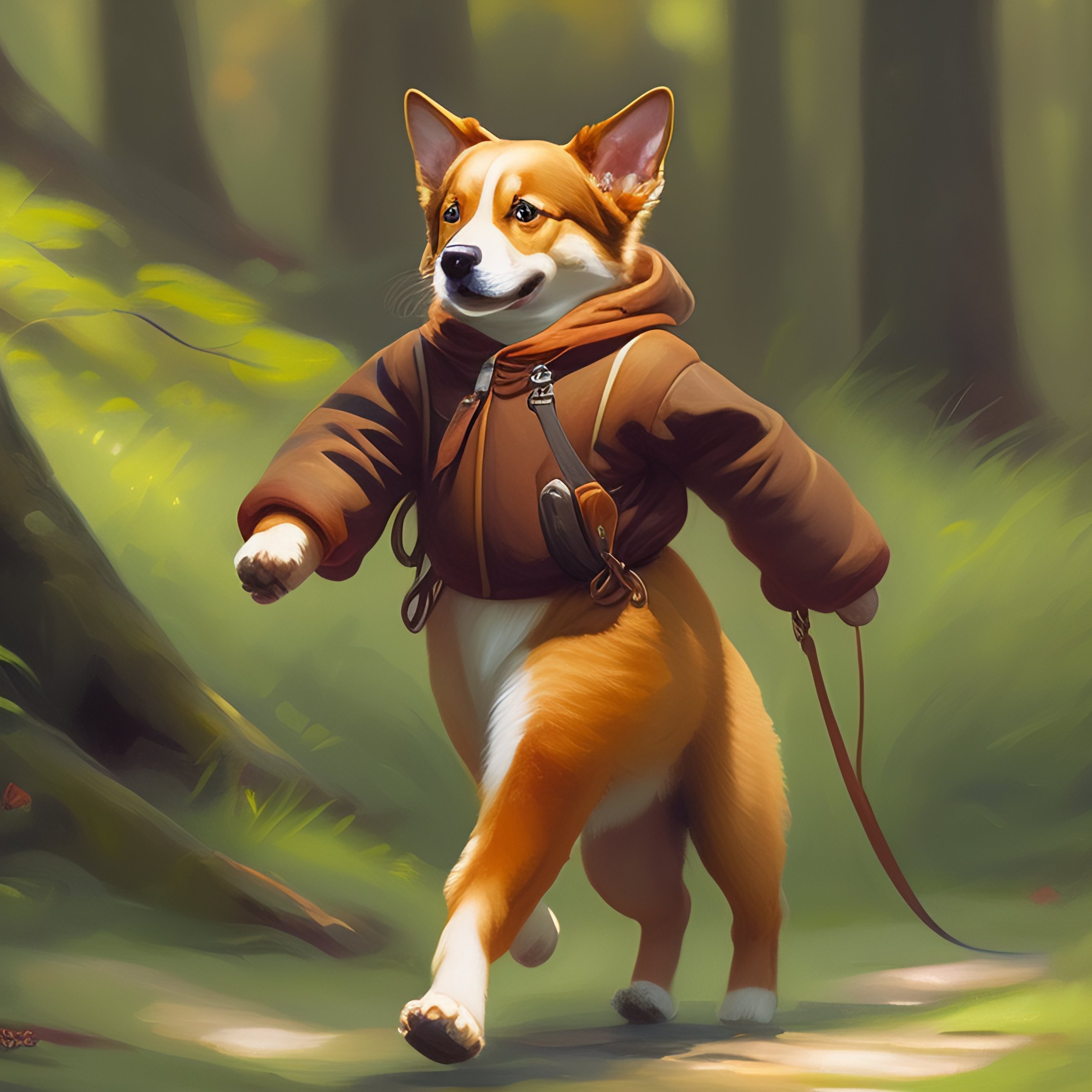 Anthro digitigrade natural - colored cartoon dog, walking upright in a forest, greg rutkowski, gregory manchess