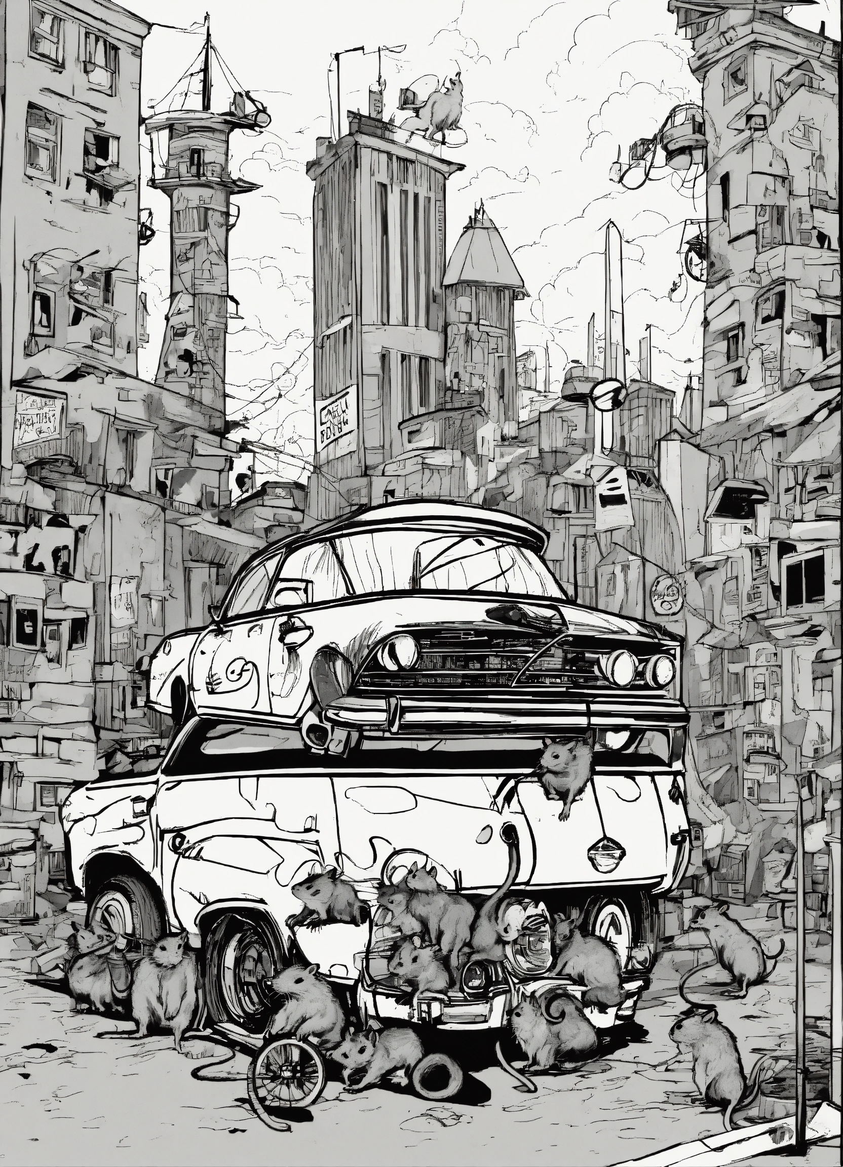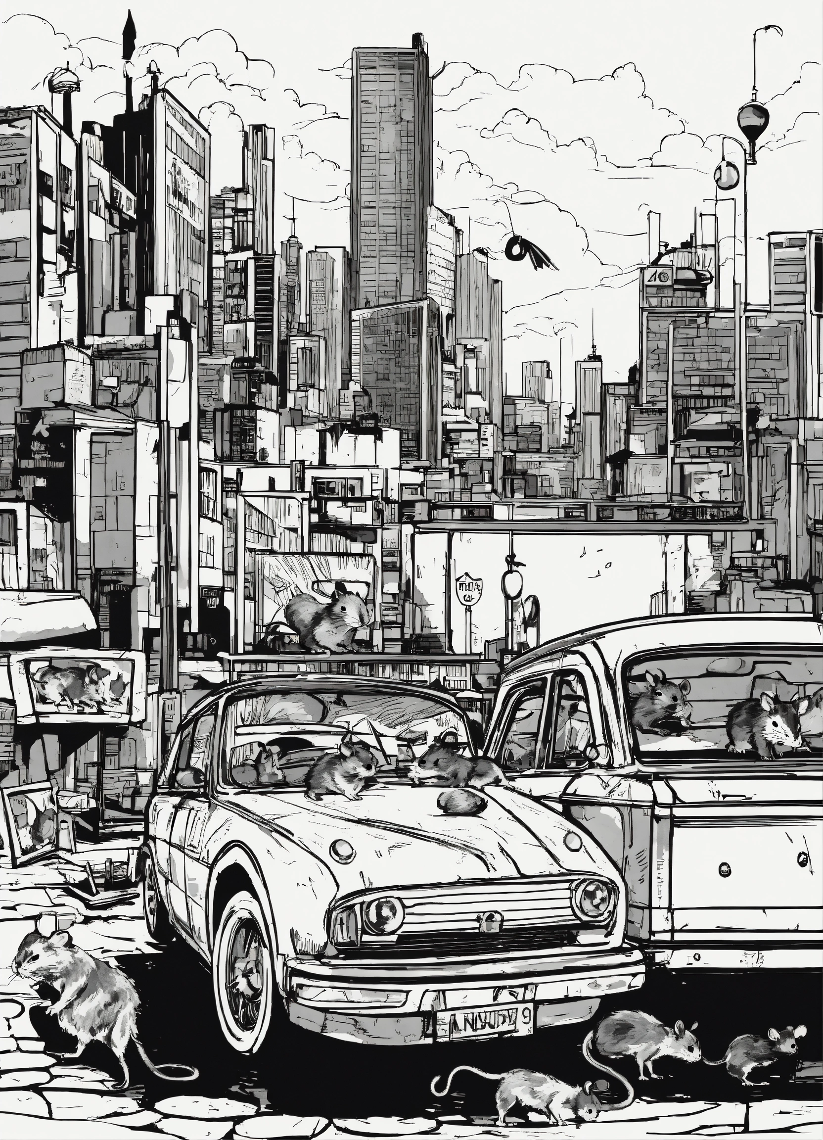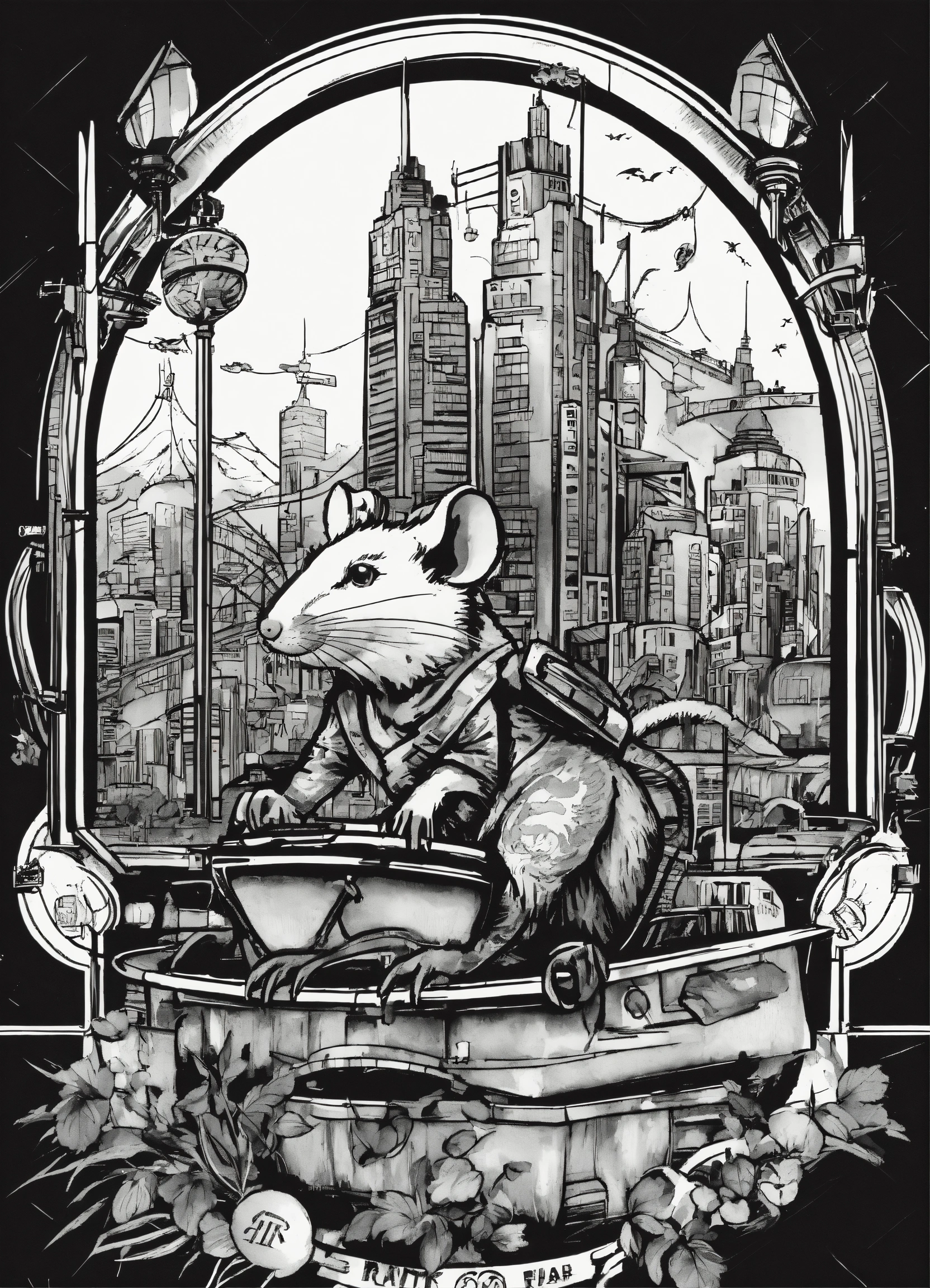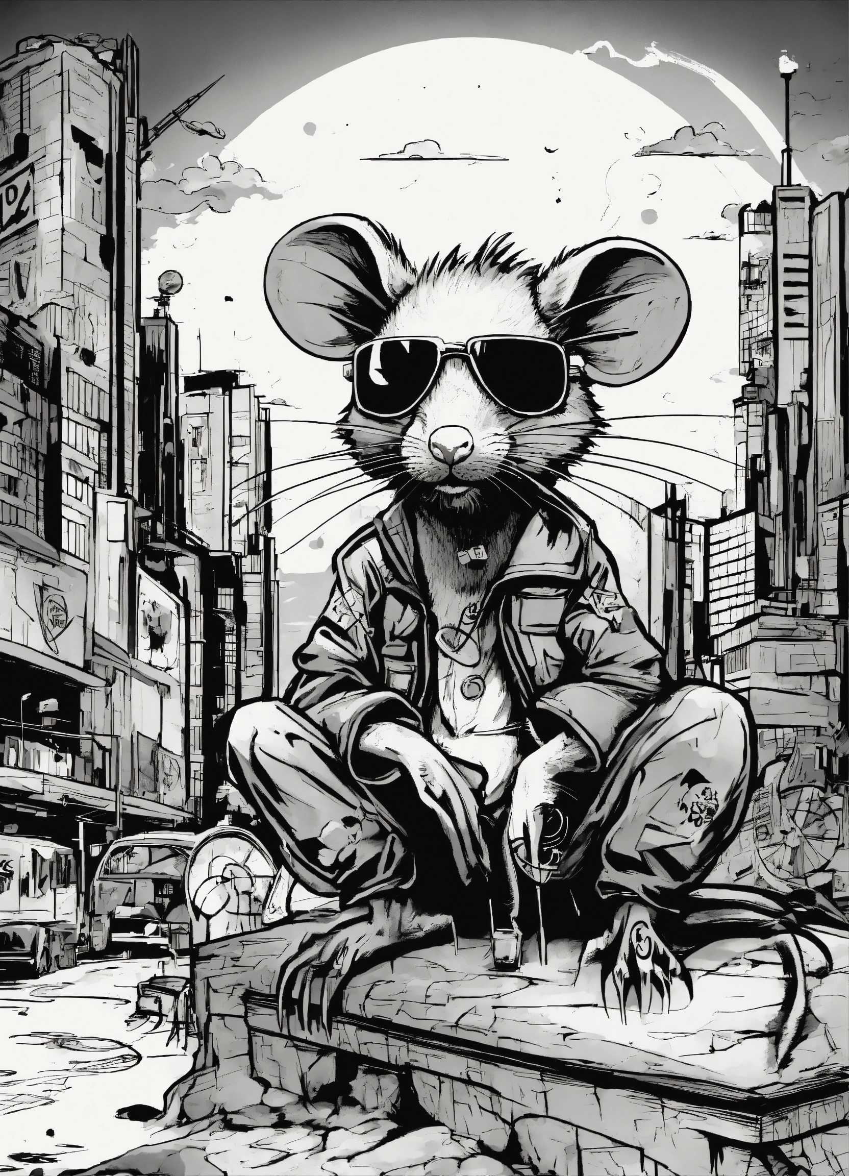 Rat punk city, black and white, white background, no background, ink fine line art stylized, vector, design for tattoo, ignorant style