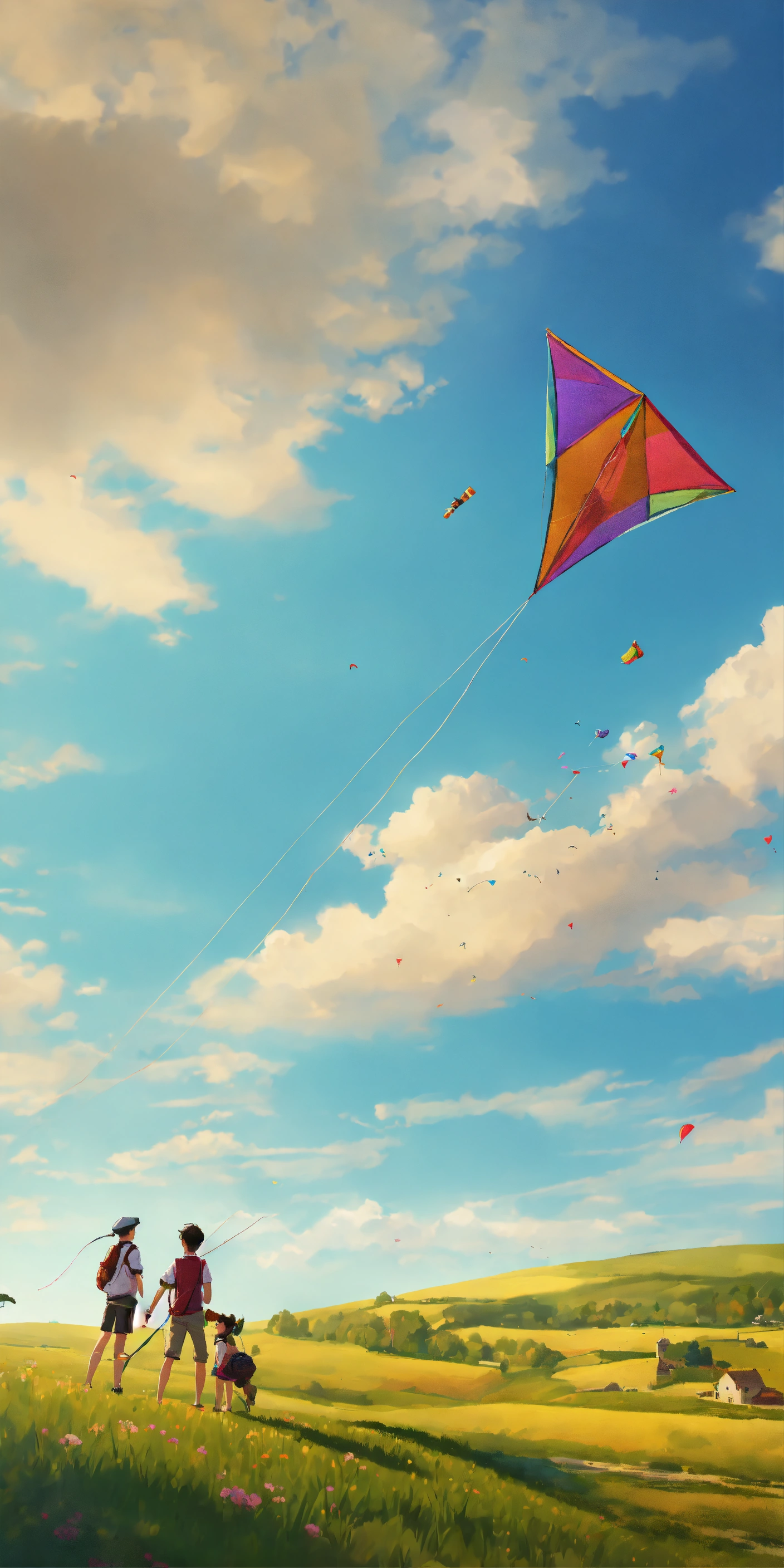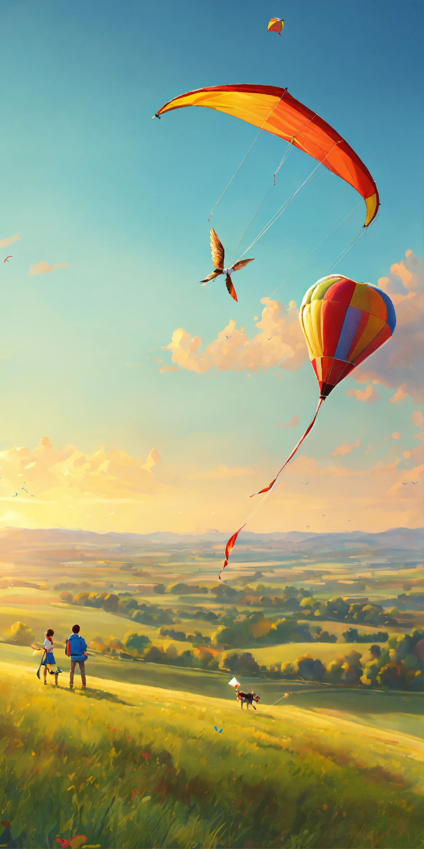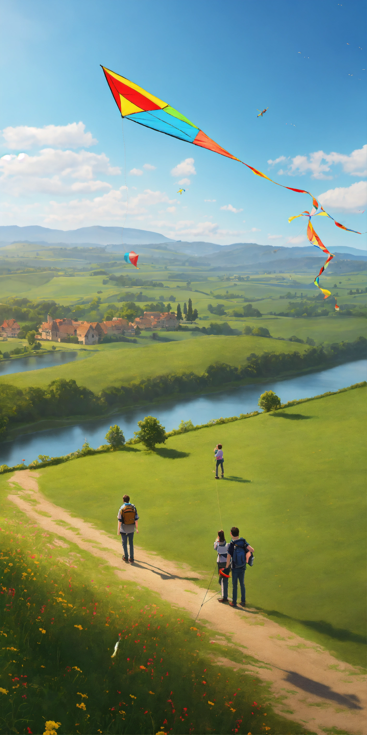 Somebody flying a kite under the clear blue sky, accompanied by their friend. a vast countryside landscape, sharp and lifelike imagery, in 4k quality