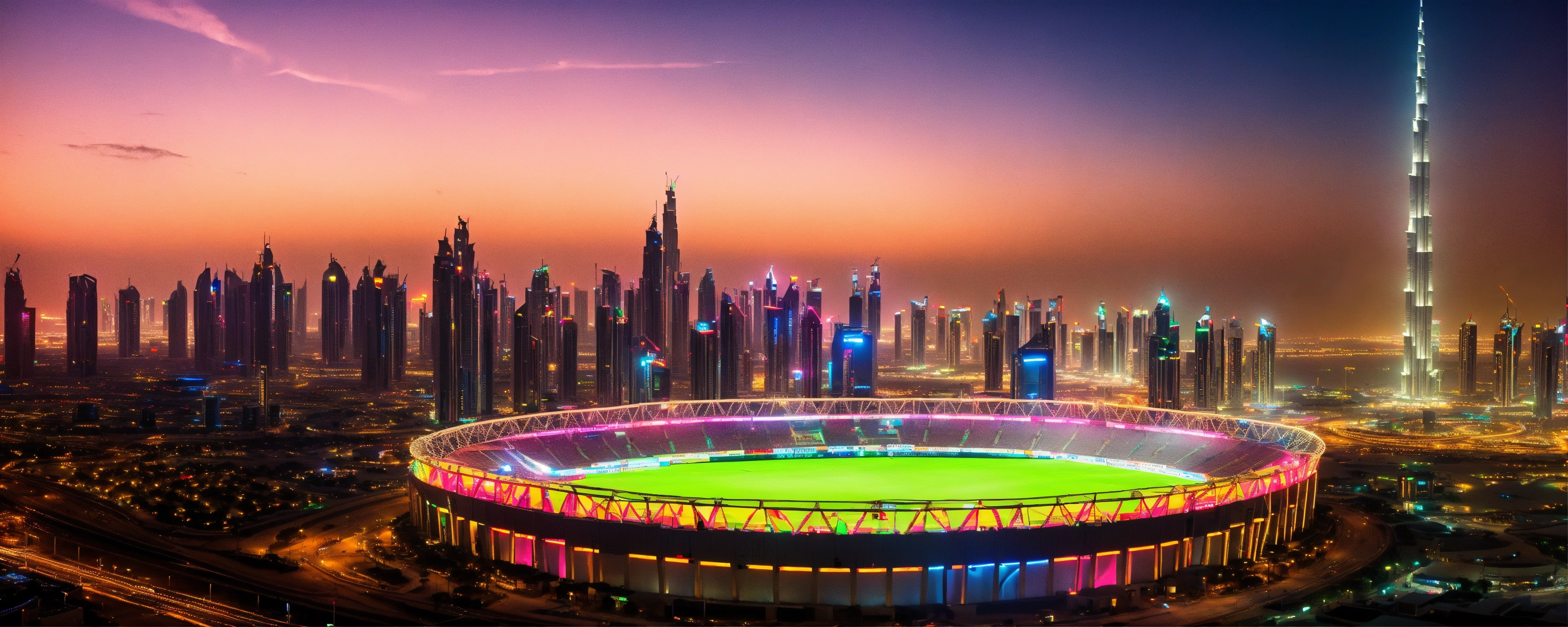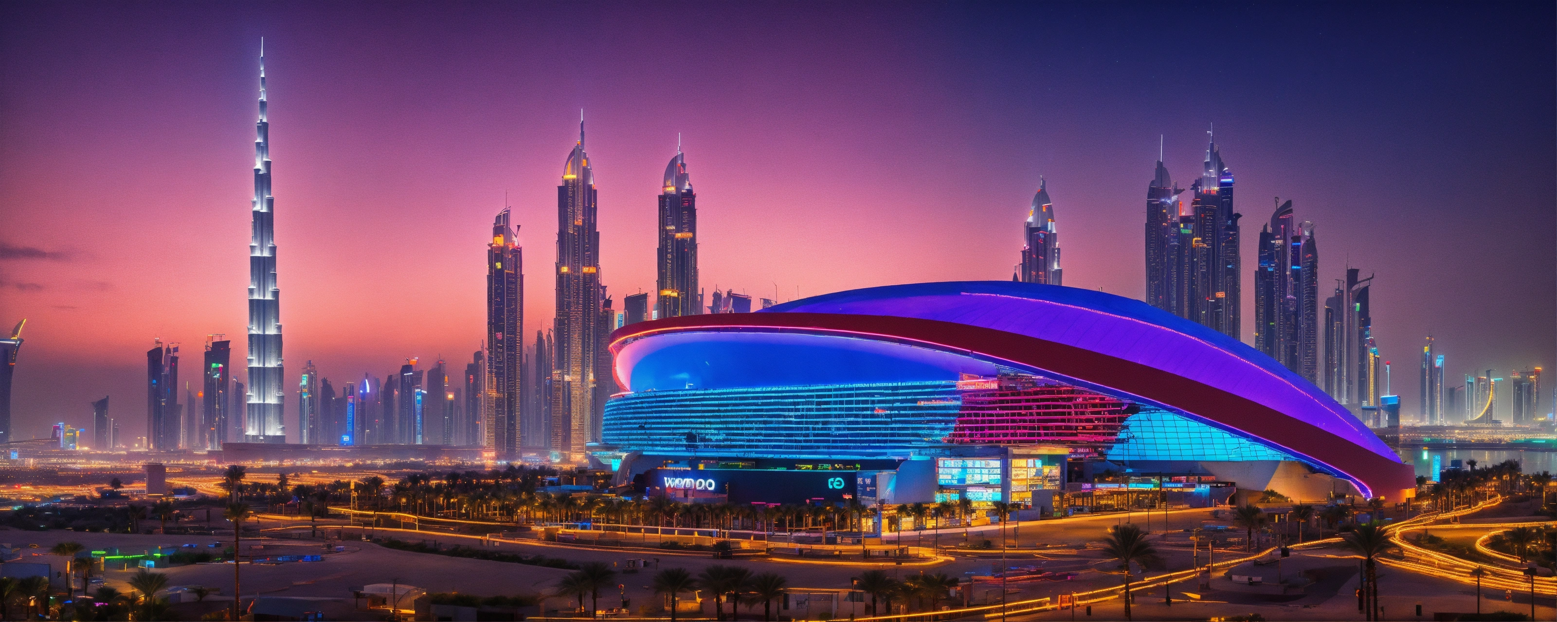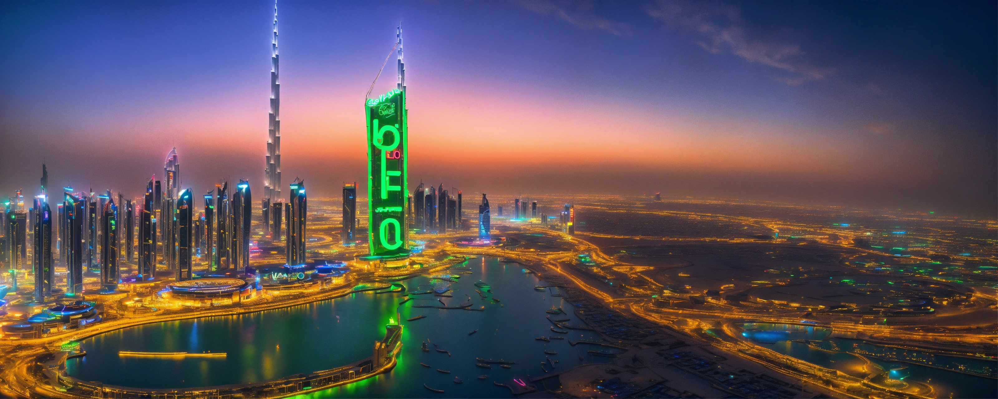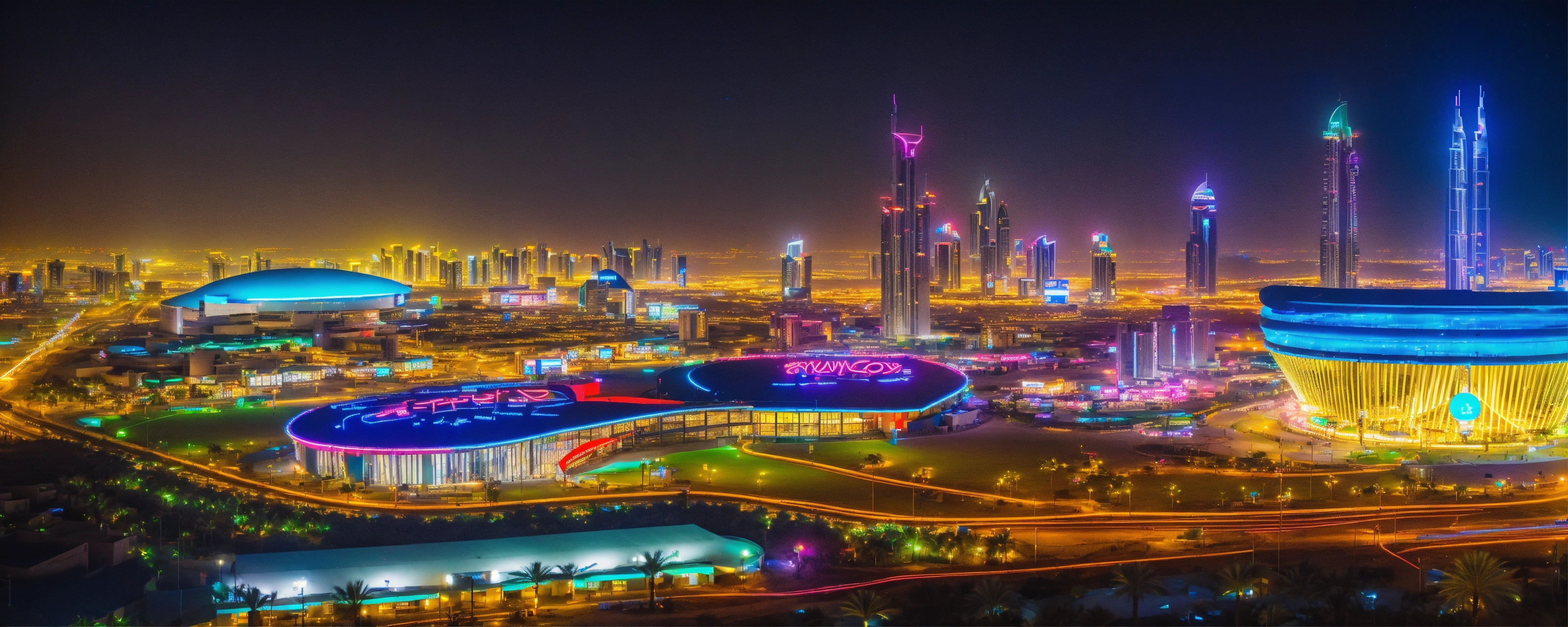 Stadium name wofo neon lights dubai city view big sign with neon lights just english wofo write 4k 8k do not let the lights