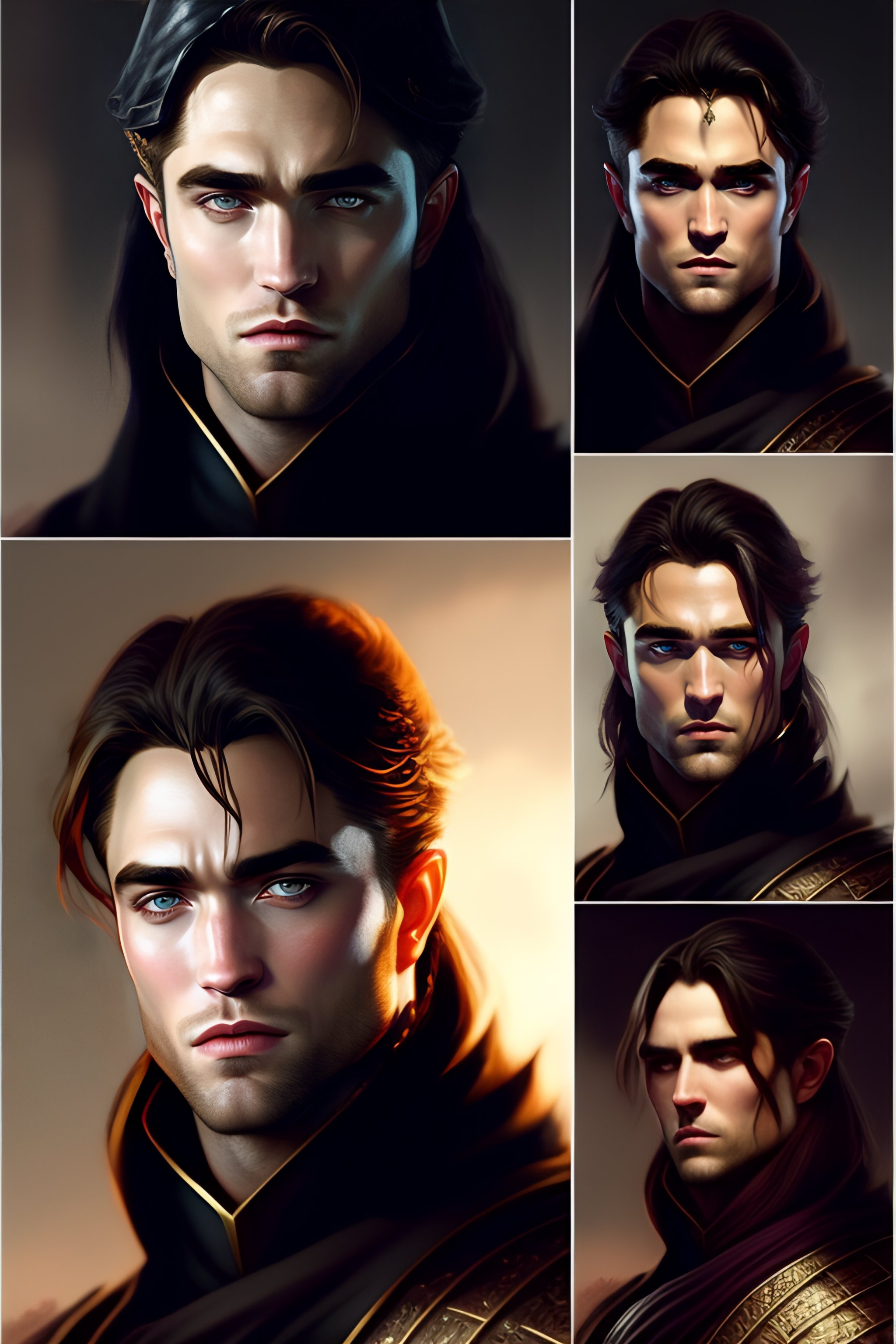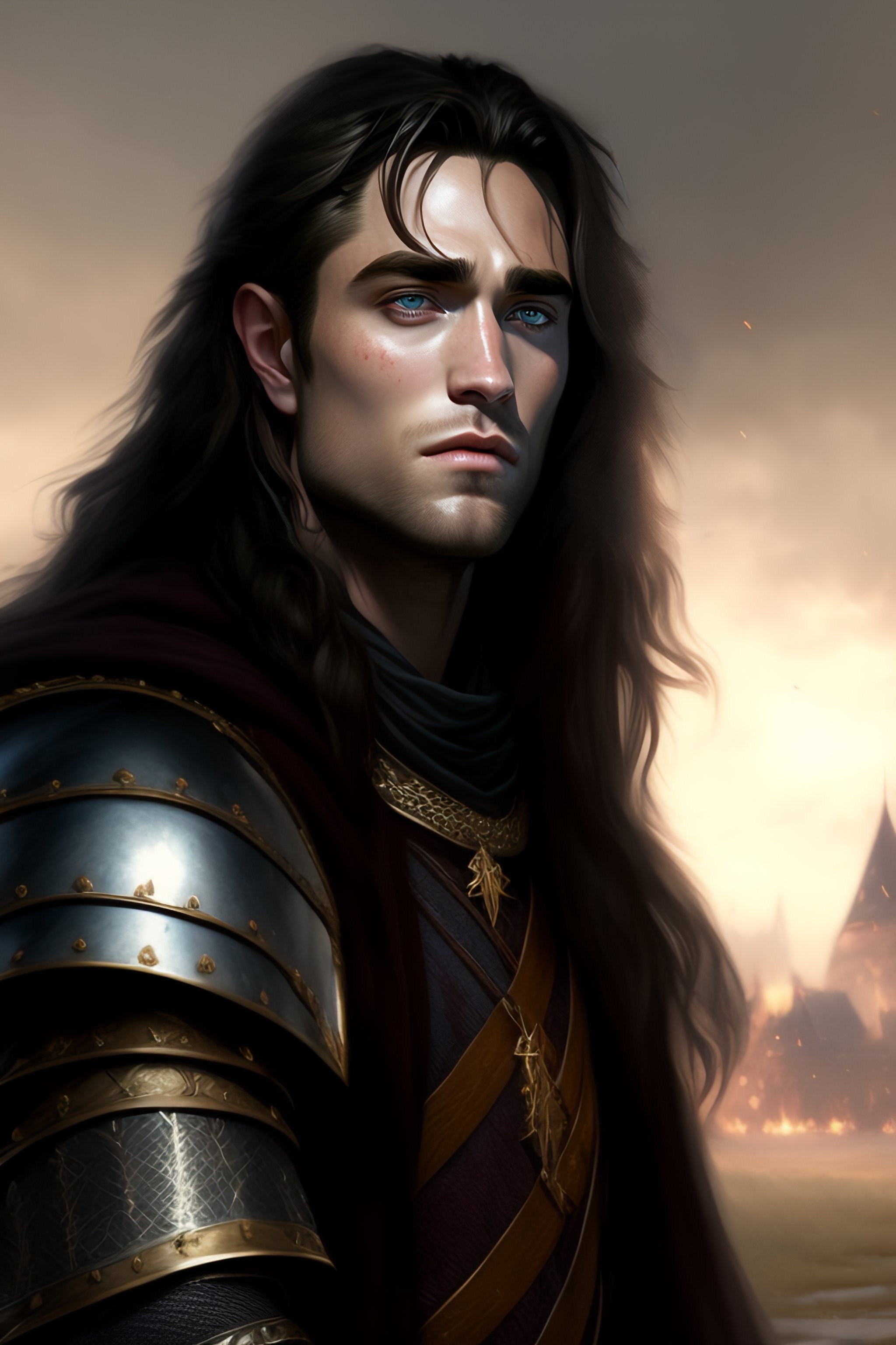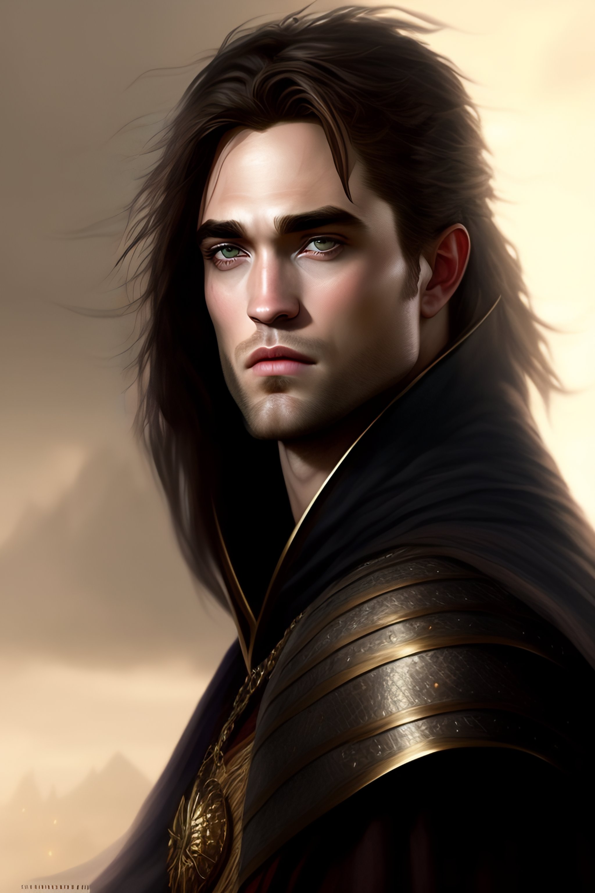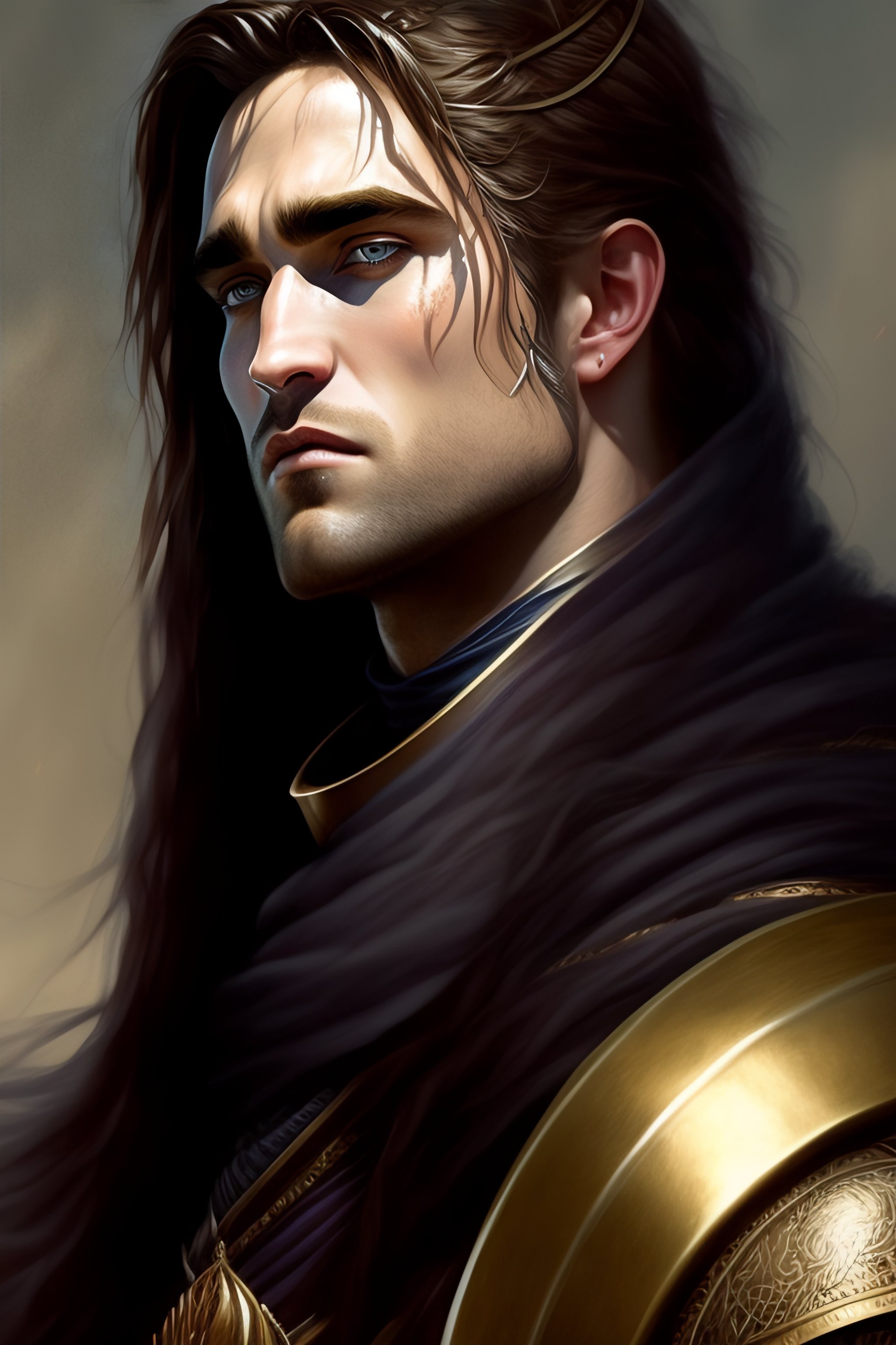 Robert pattinson in medieval style! angry, pretty face! with black sward! armor, magic background, length hair, concept art, art by greg rutkowski and artgerm, highly detailed