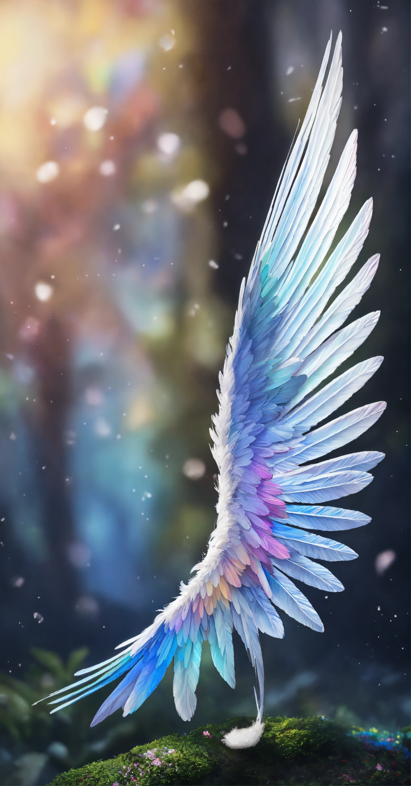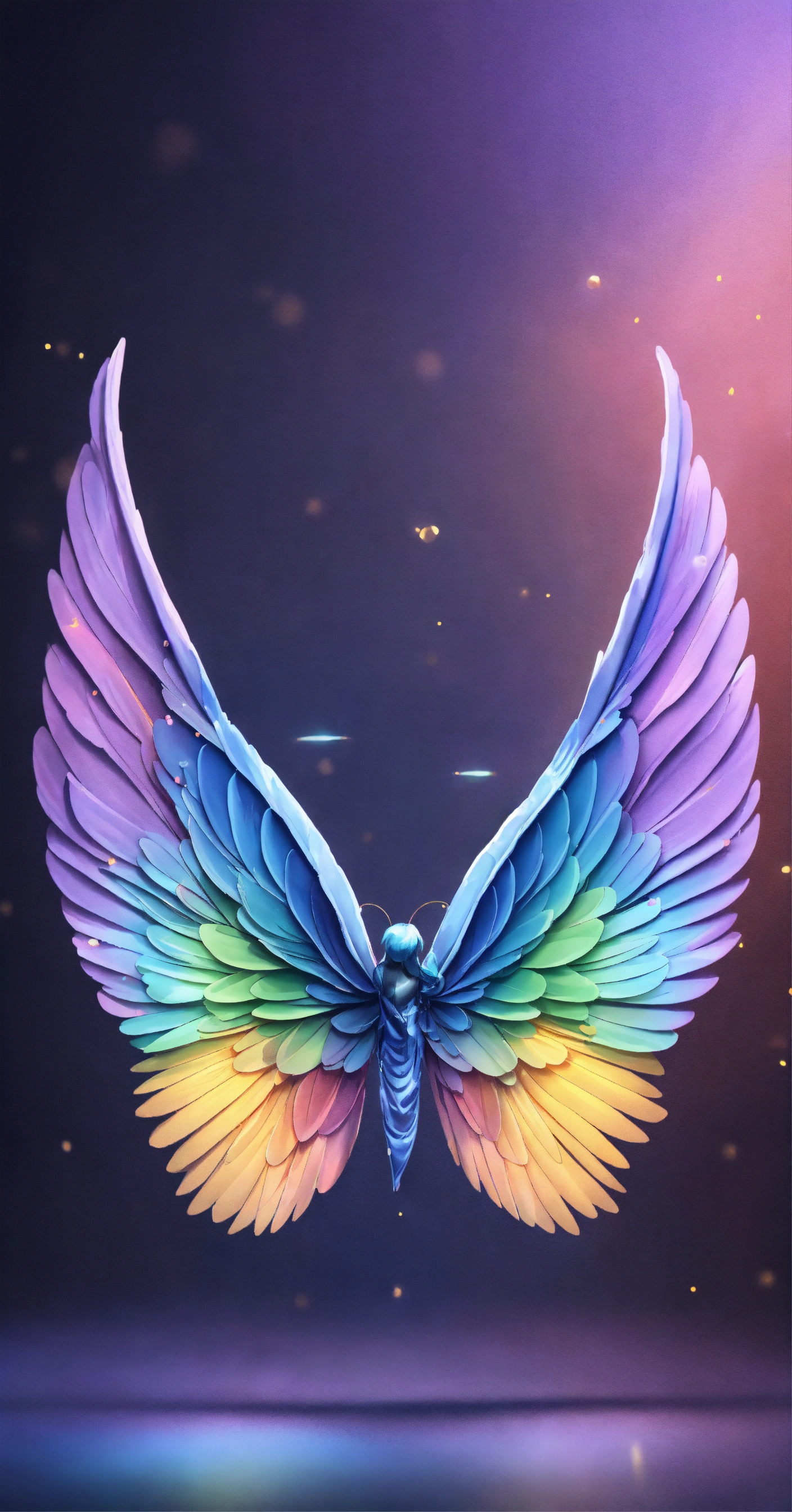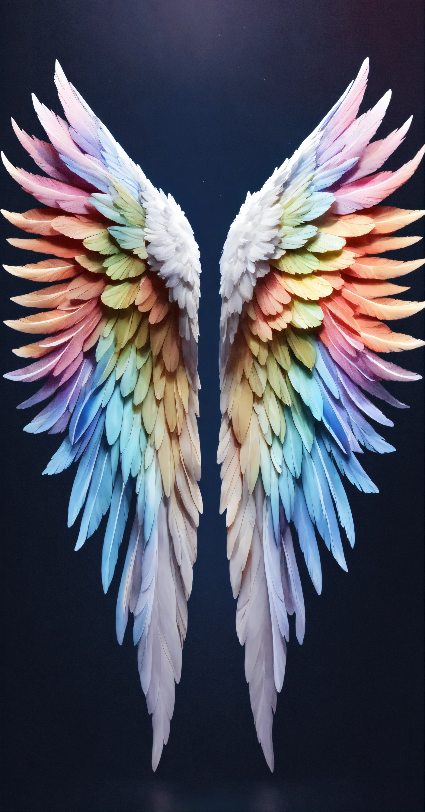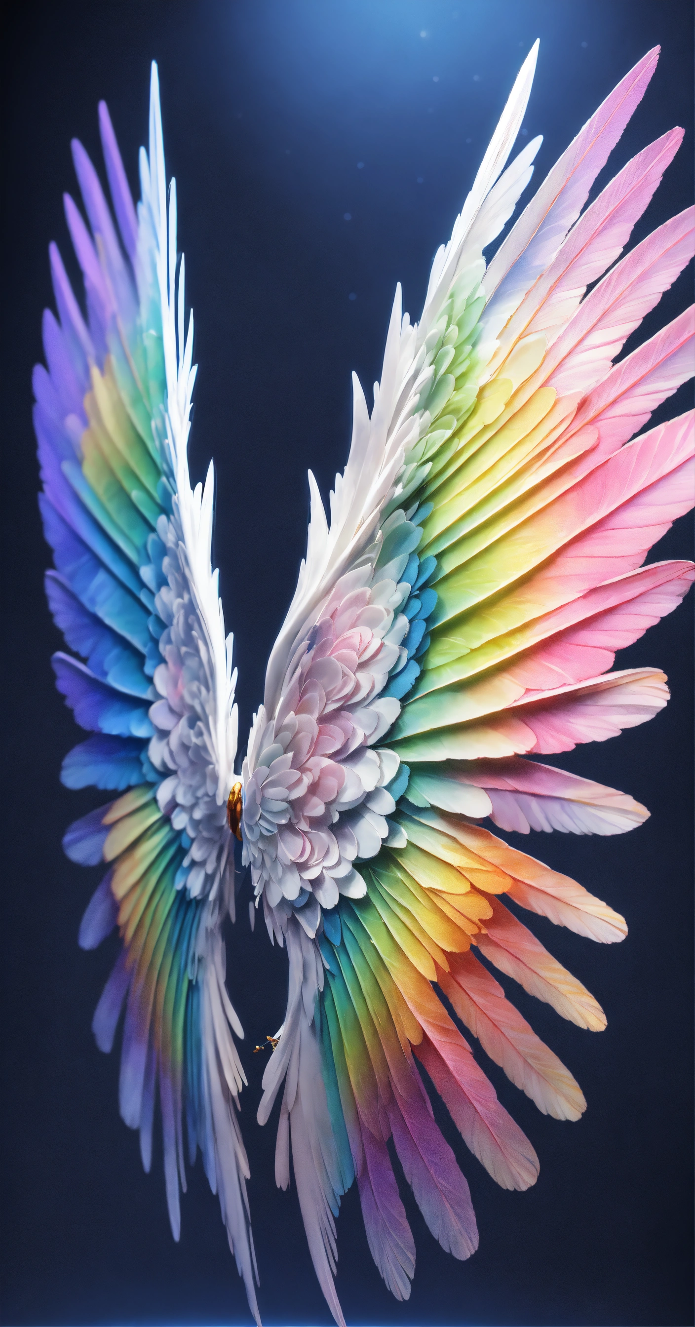 Beautiful and perfect small angel wings in soft rainbow colors, detailed and defined and at the same time some white details. just a pair of small full soft rainbow colored wings and some white details. hyper-detailed and hyper-realistic wings. small wings with slight decoration in soft rainbow tones and white details. small wings complete both the right wing and the left wing, the background is dark blue, 3d, masterpiece. hd. realism. high resolution. high quality. digital art. 8k