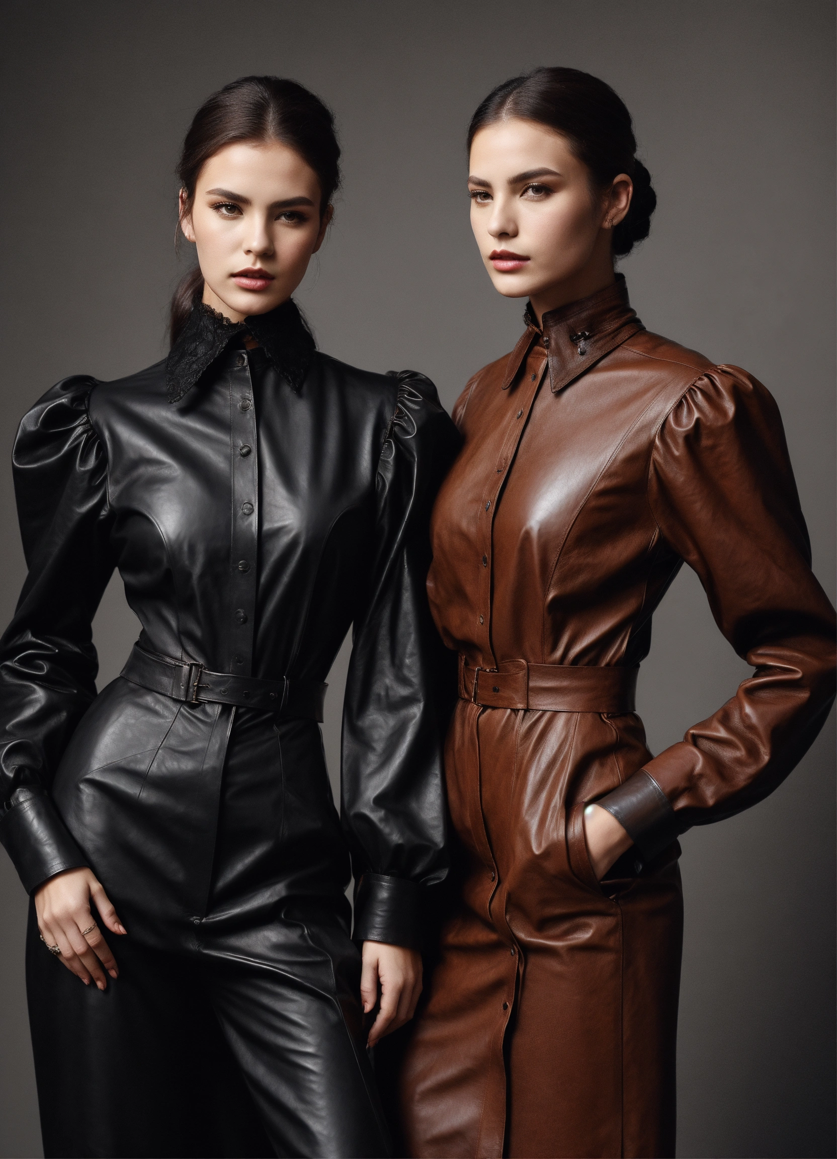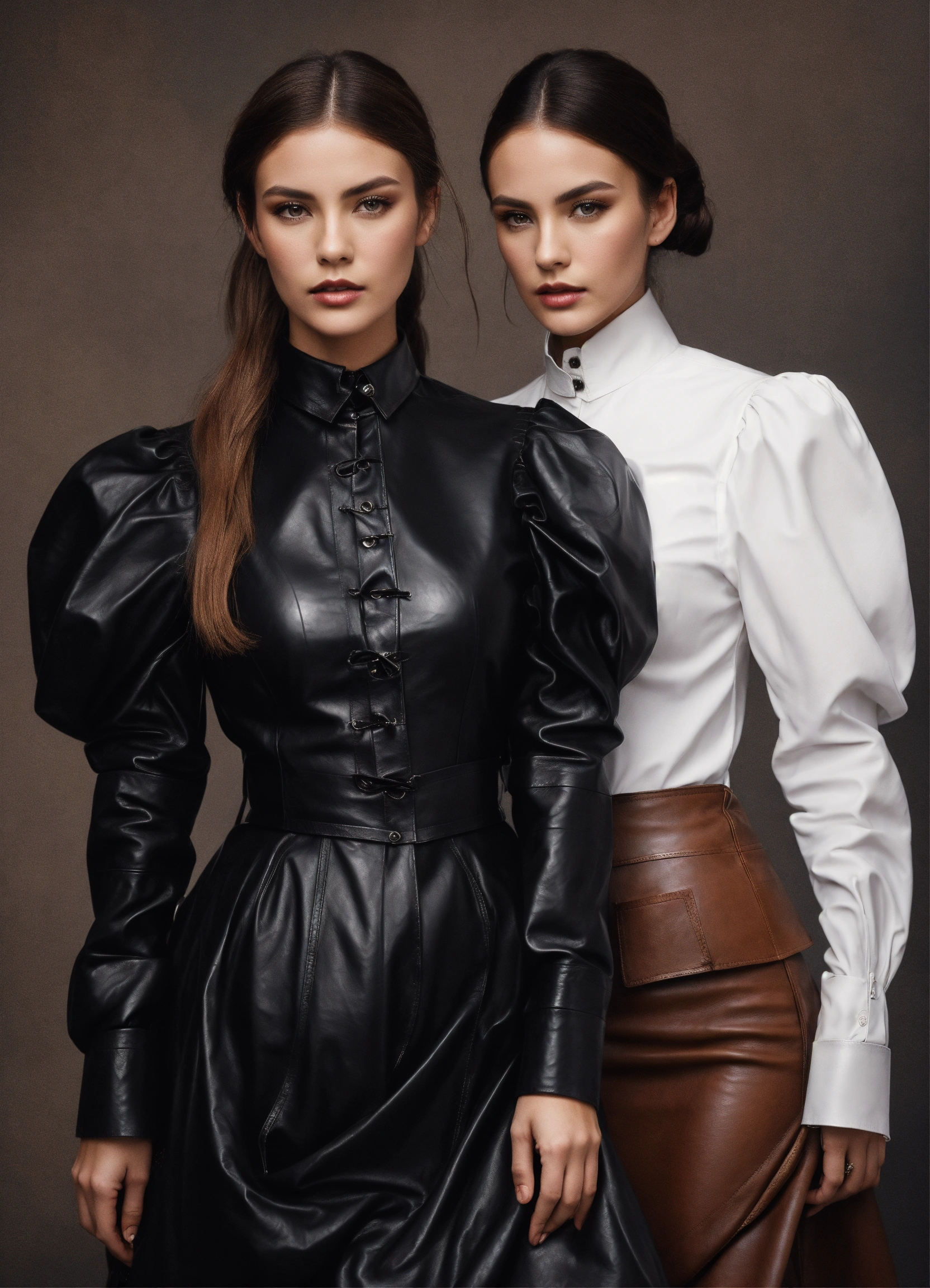 Two stunning arrogant women fashion model, strict victorian black leather governess shirt dress big long puff sleeves, leather shirt collar, black straight high ponytai, ultra-realistic; solid white background; no background
