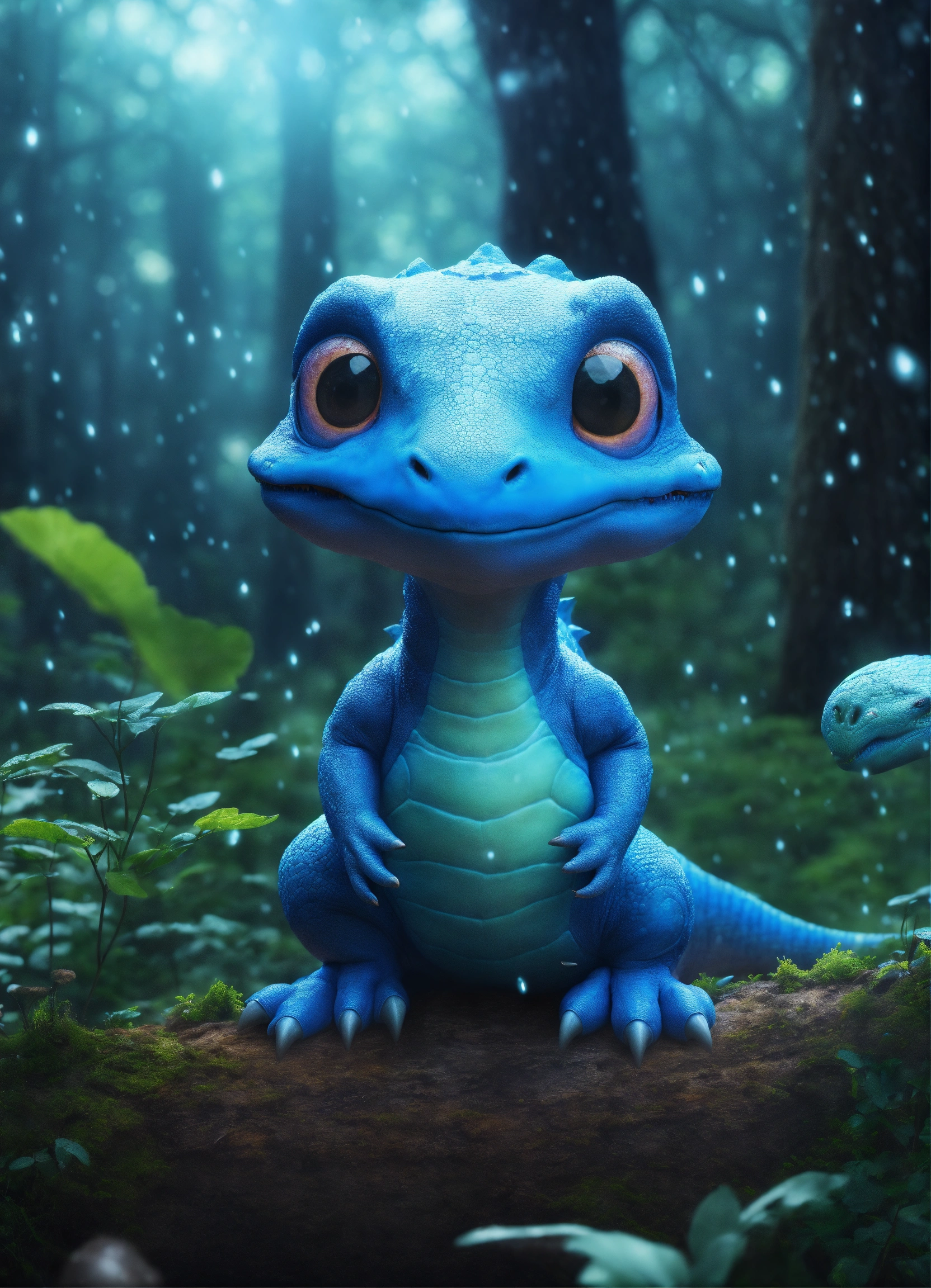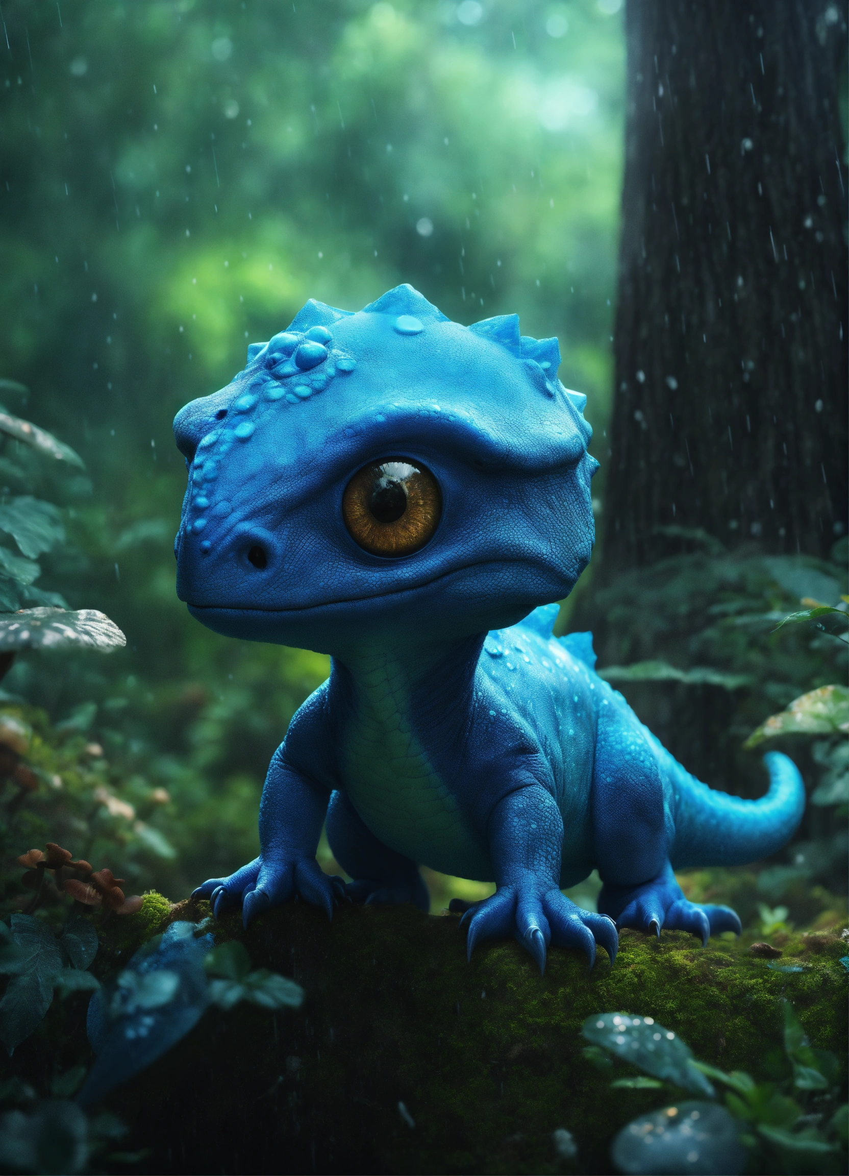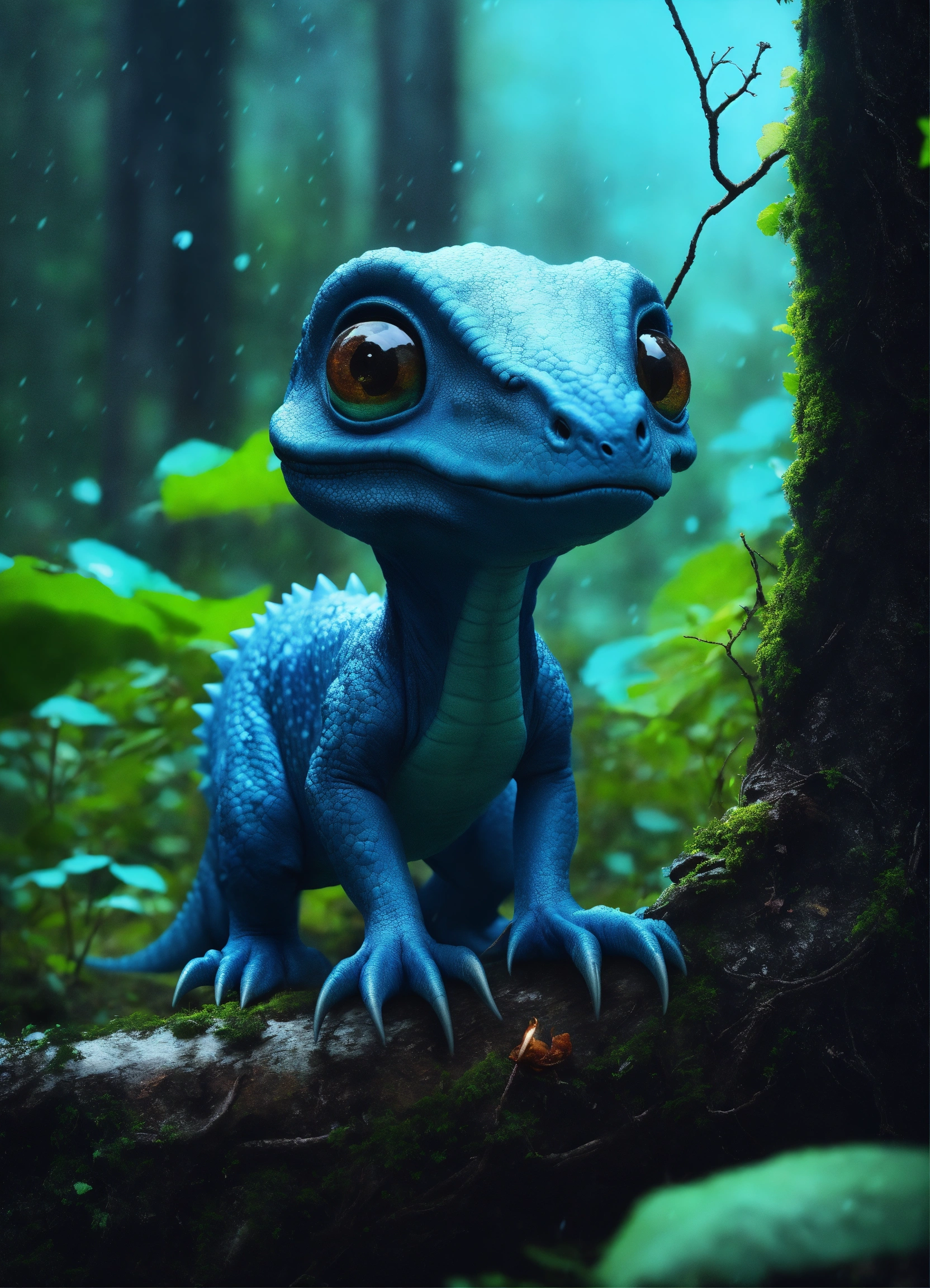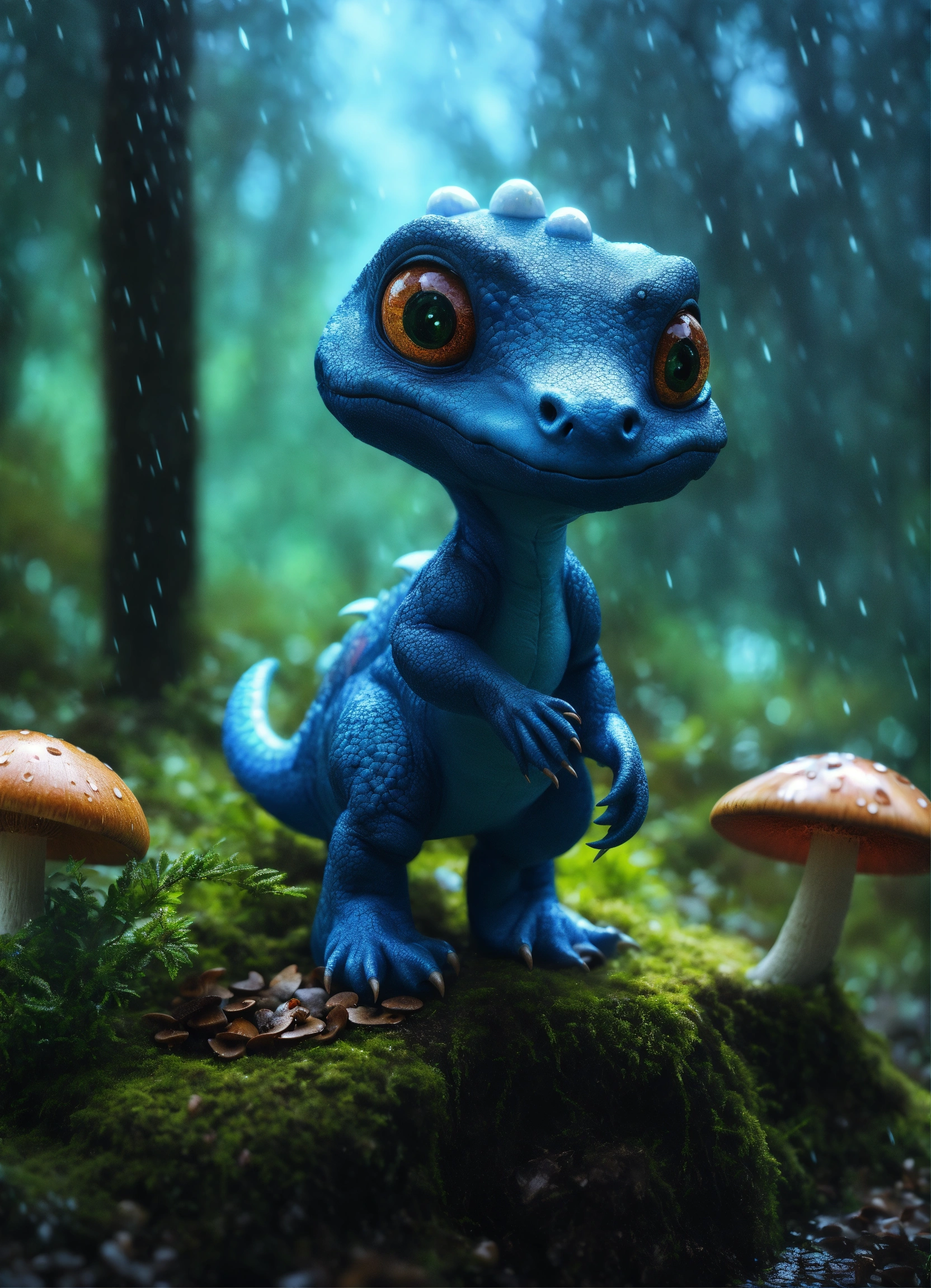 A realiste blue cute dinosaur alien, big eyes blacks, mushrooms in trees, nigth, forest rain, hyperrealist, detailed, digital photo 4k --s 50