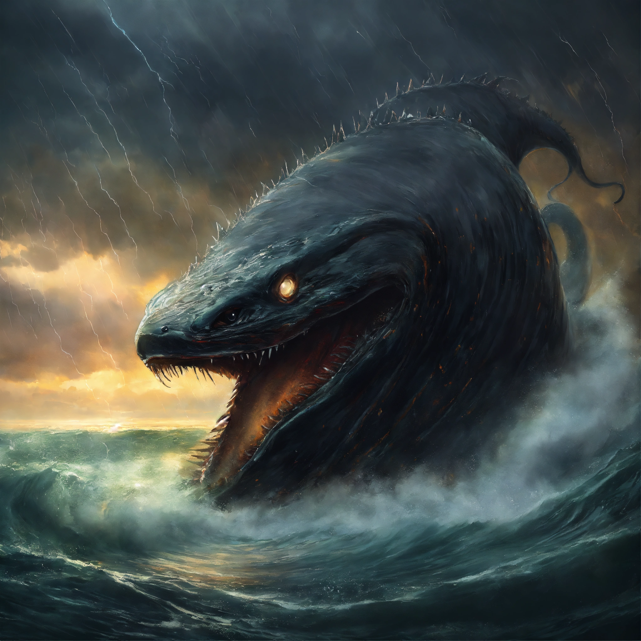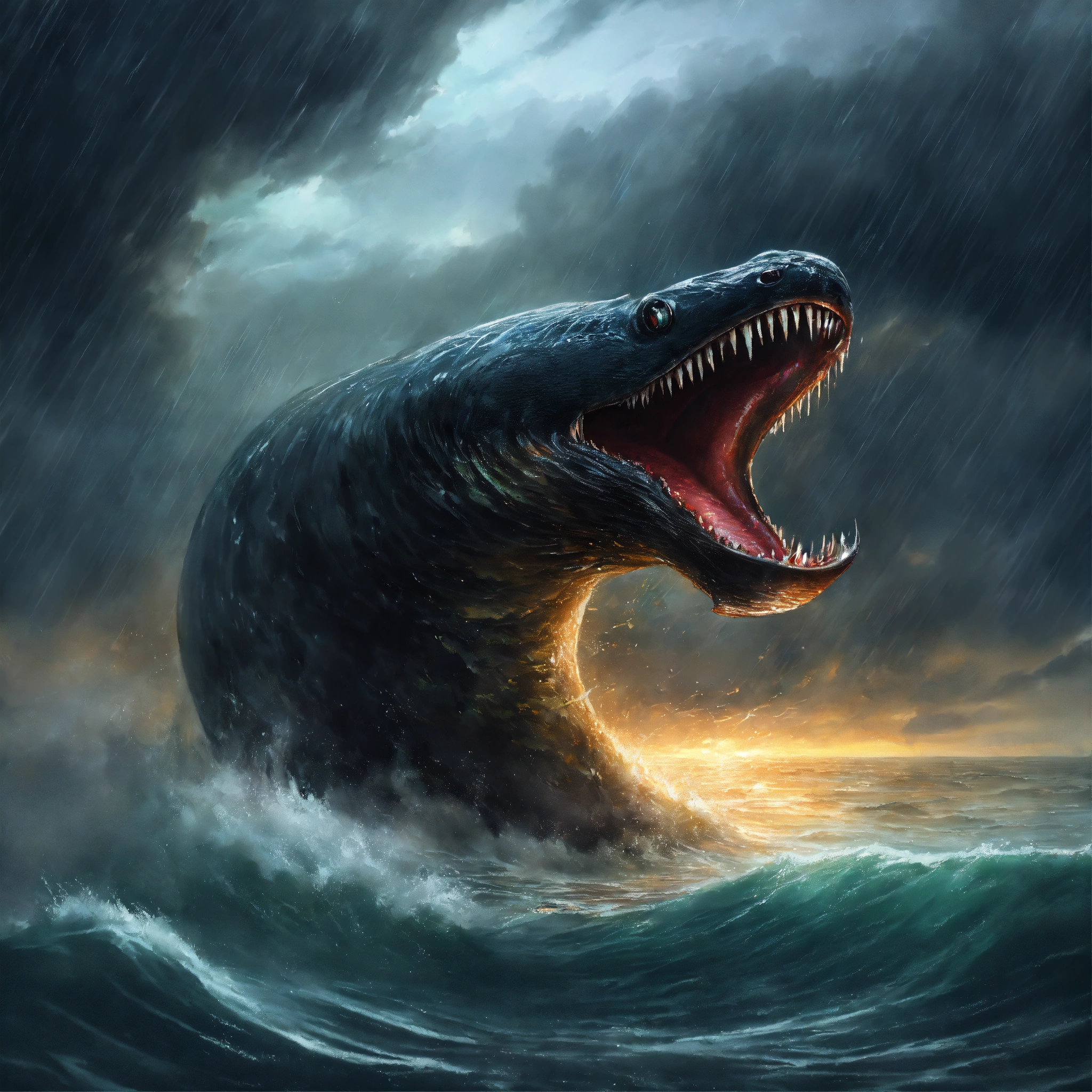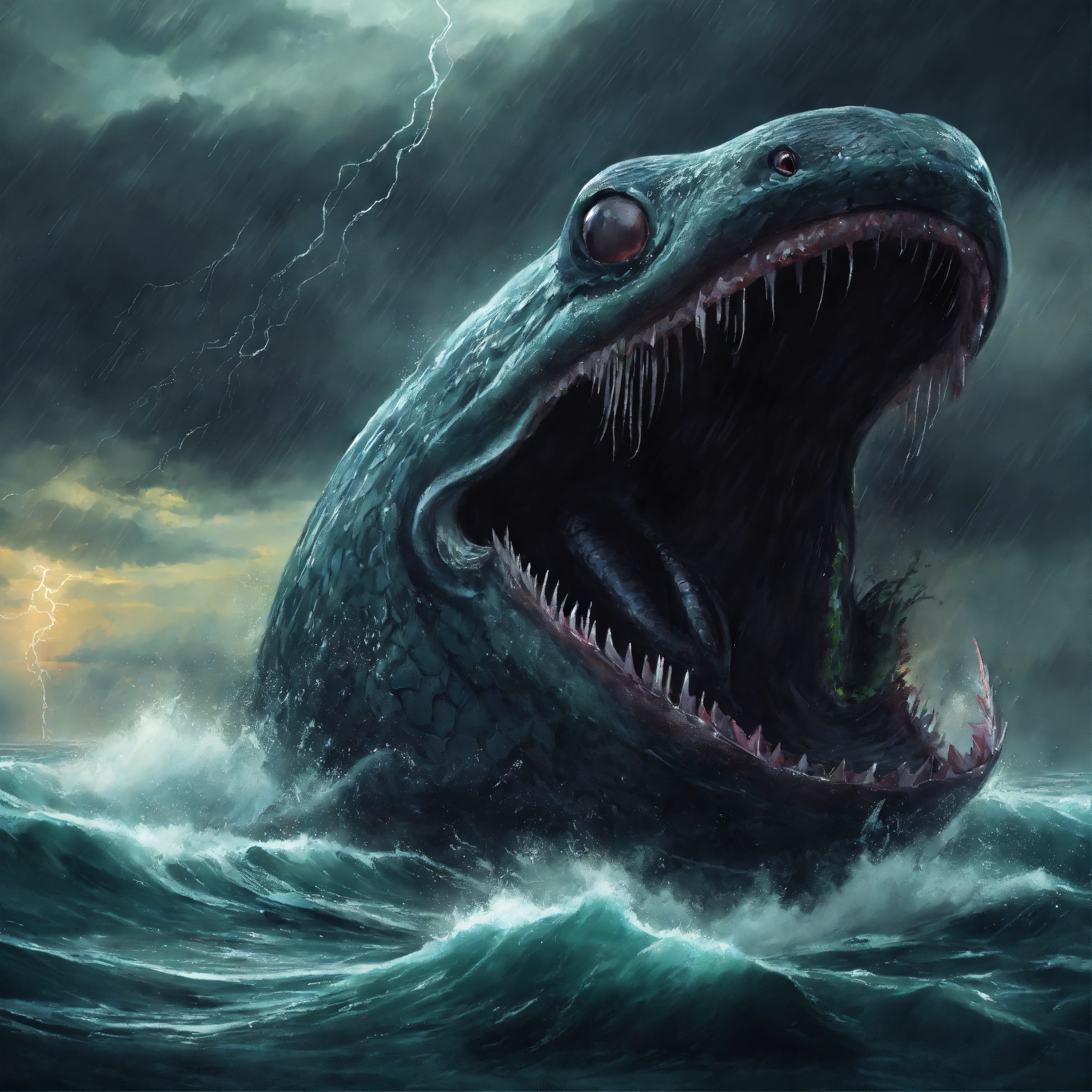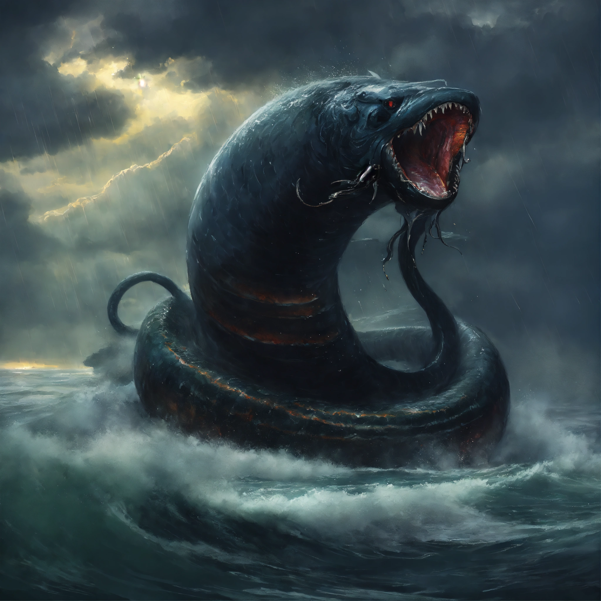 Concept art of black gigantic monster eel emerging from the sea in the middle of a thunderstorm, highly detailed, oil painting style, brush strokes, 8k