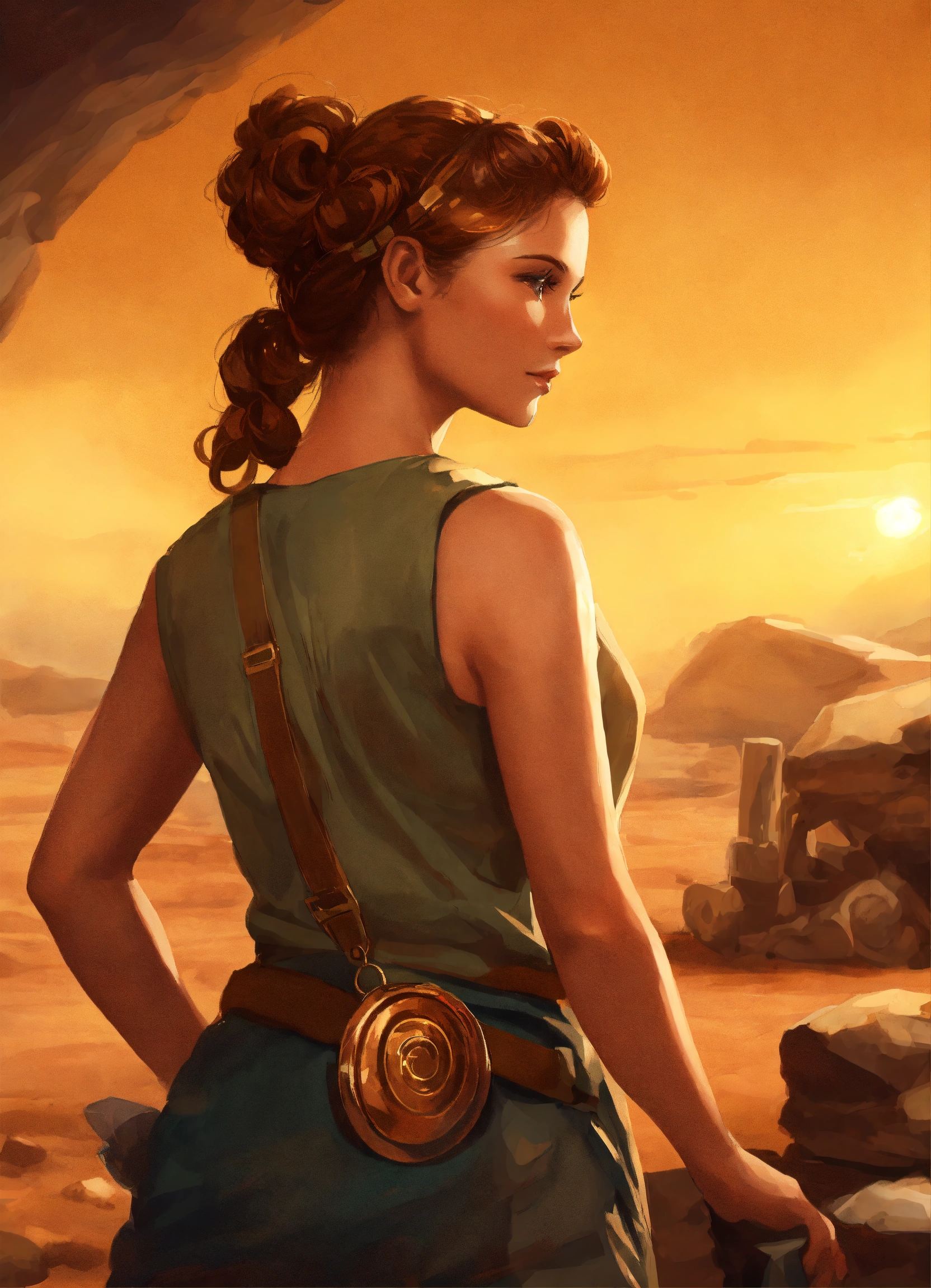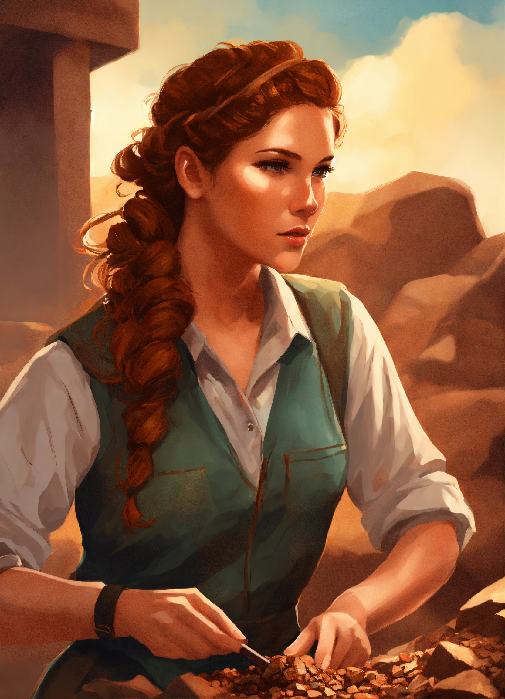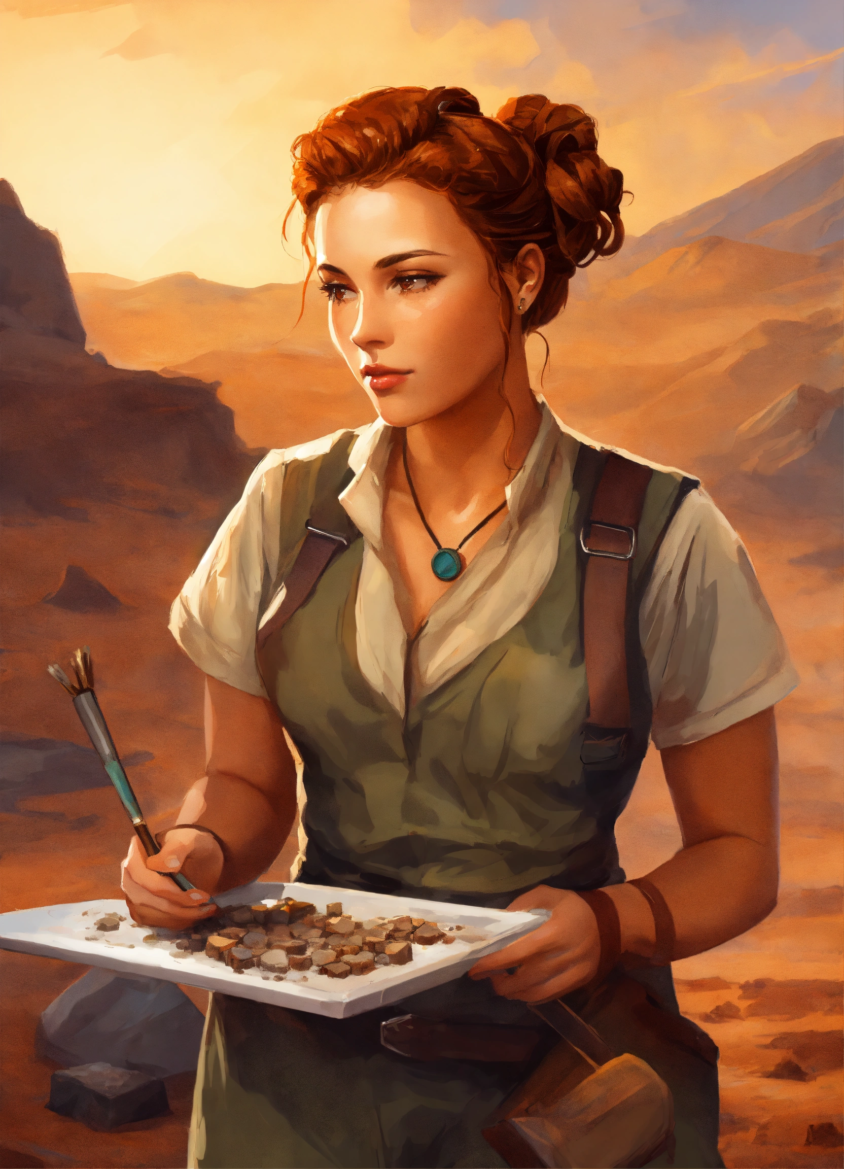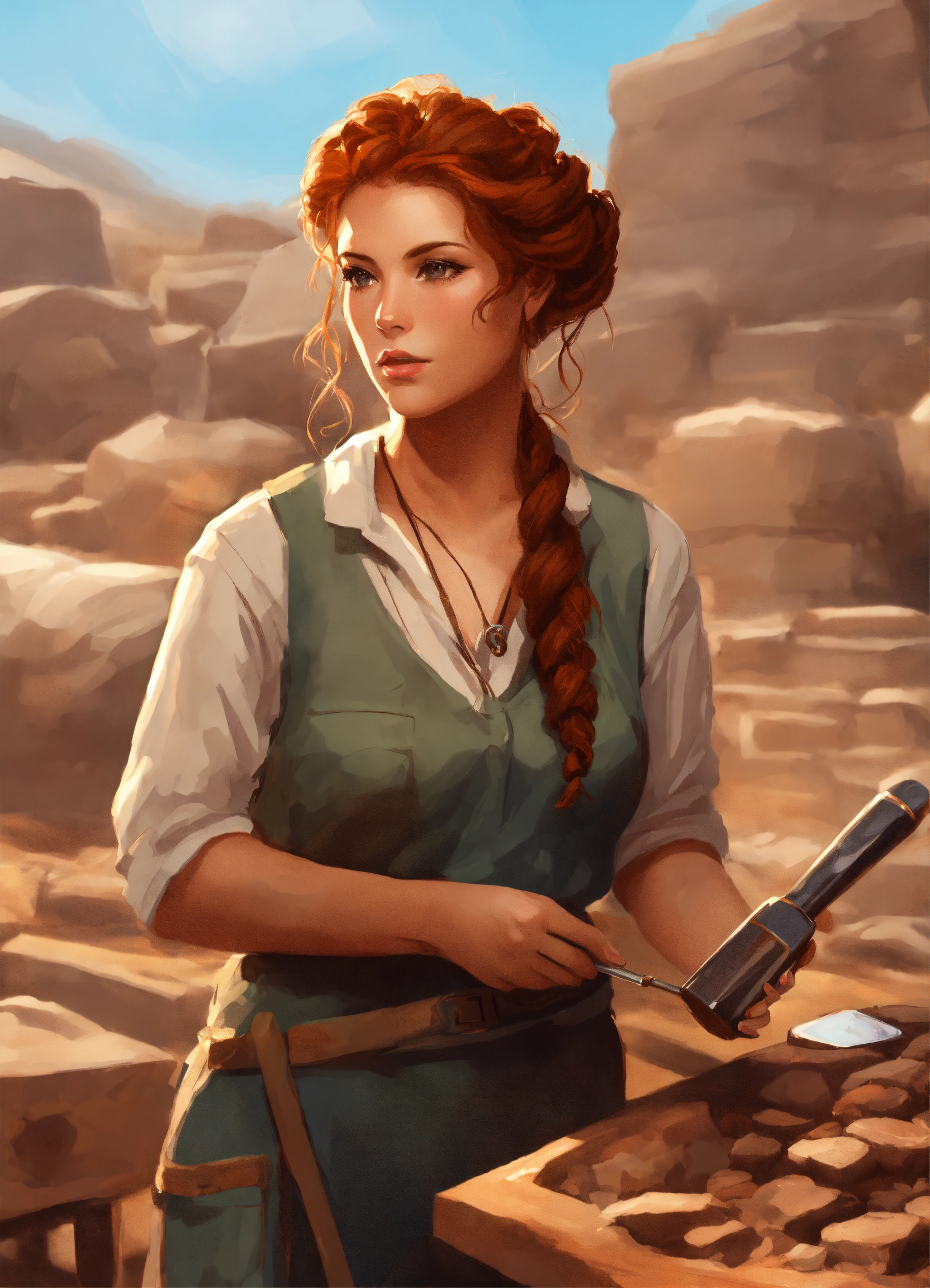 Digital art painting of a beautiful archaeologist woman with ringlet copper hair in an updo, she is working at an archaeological dig site