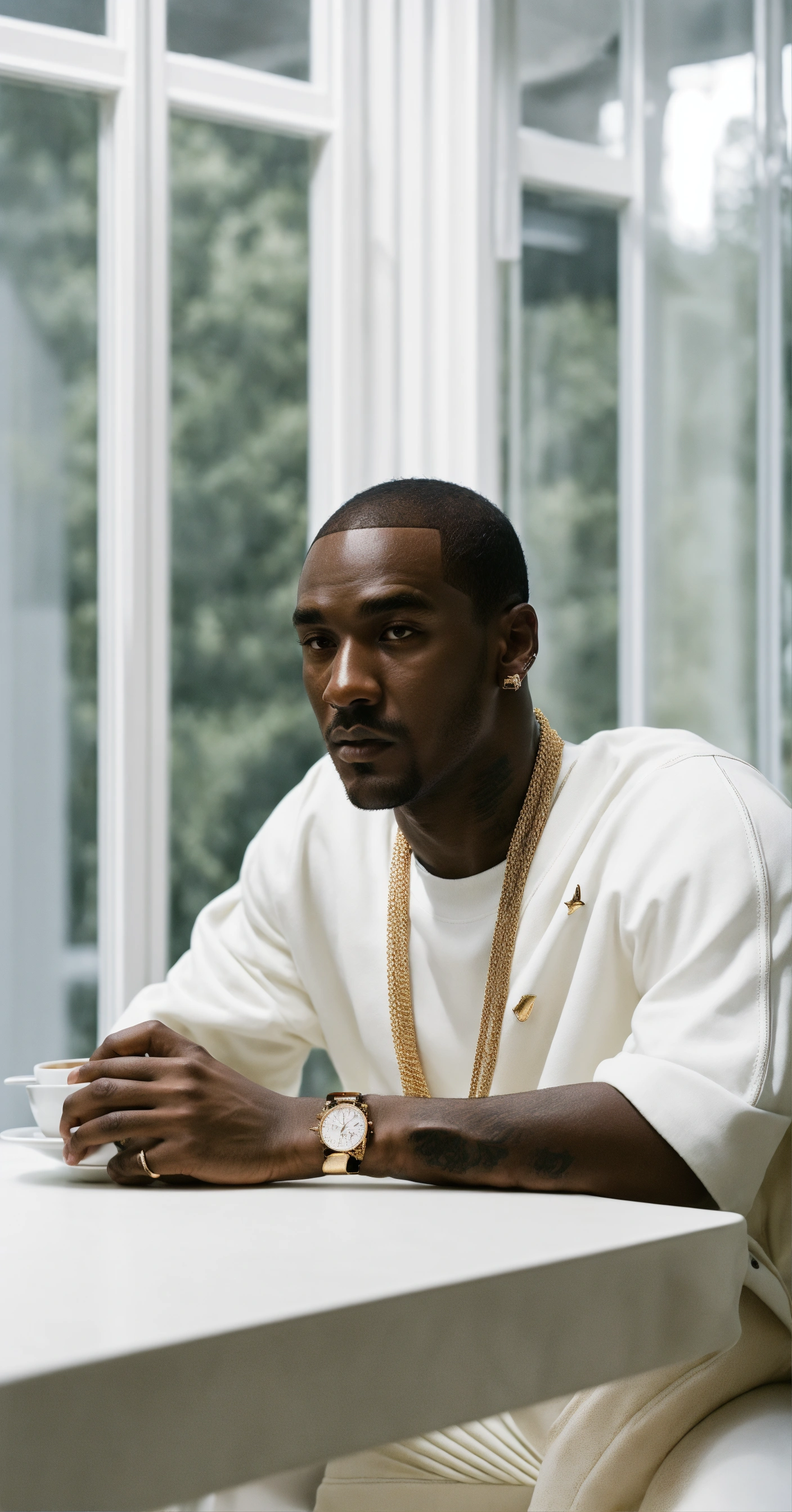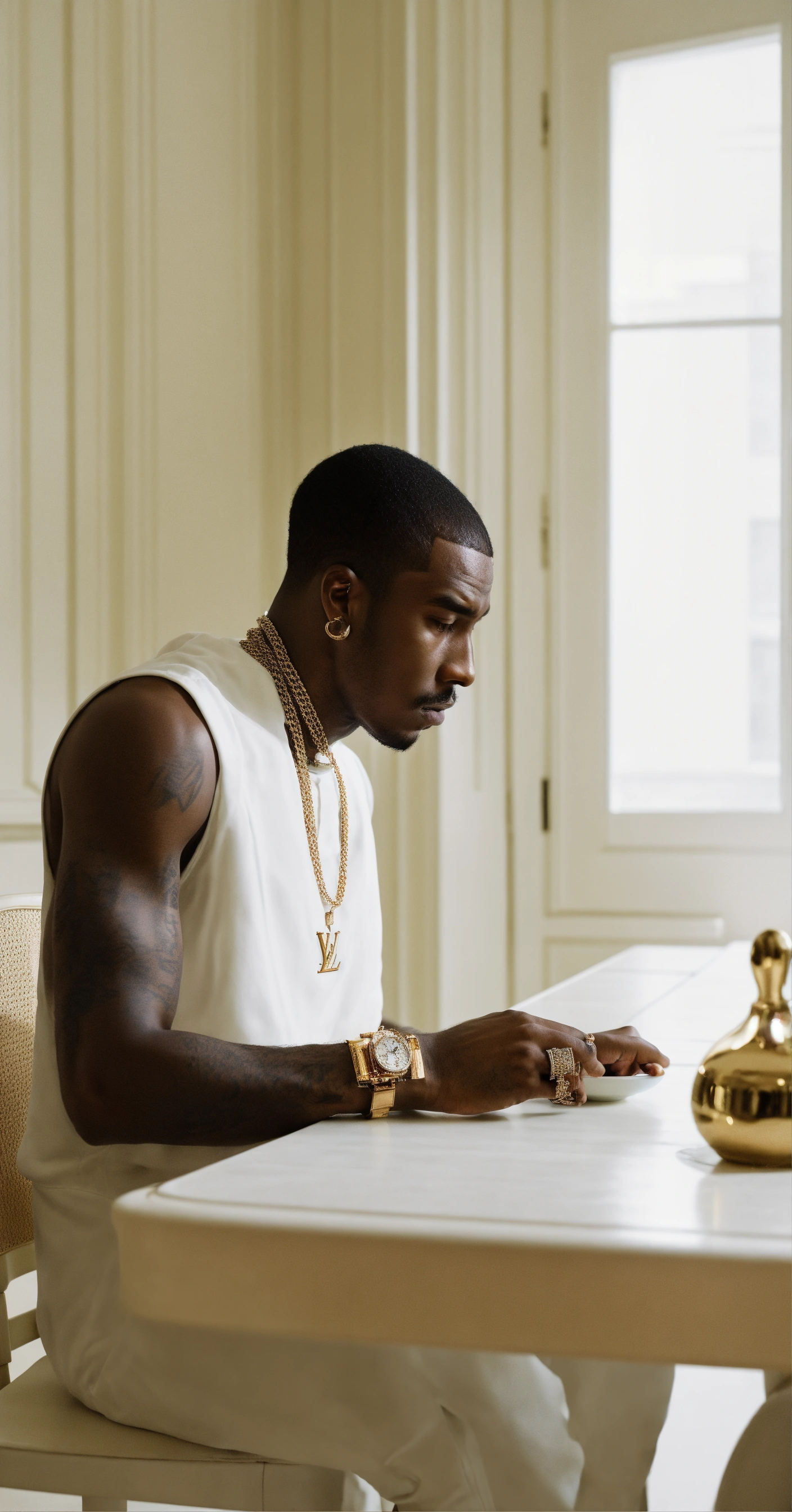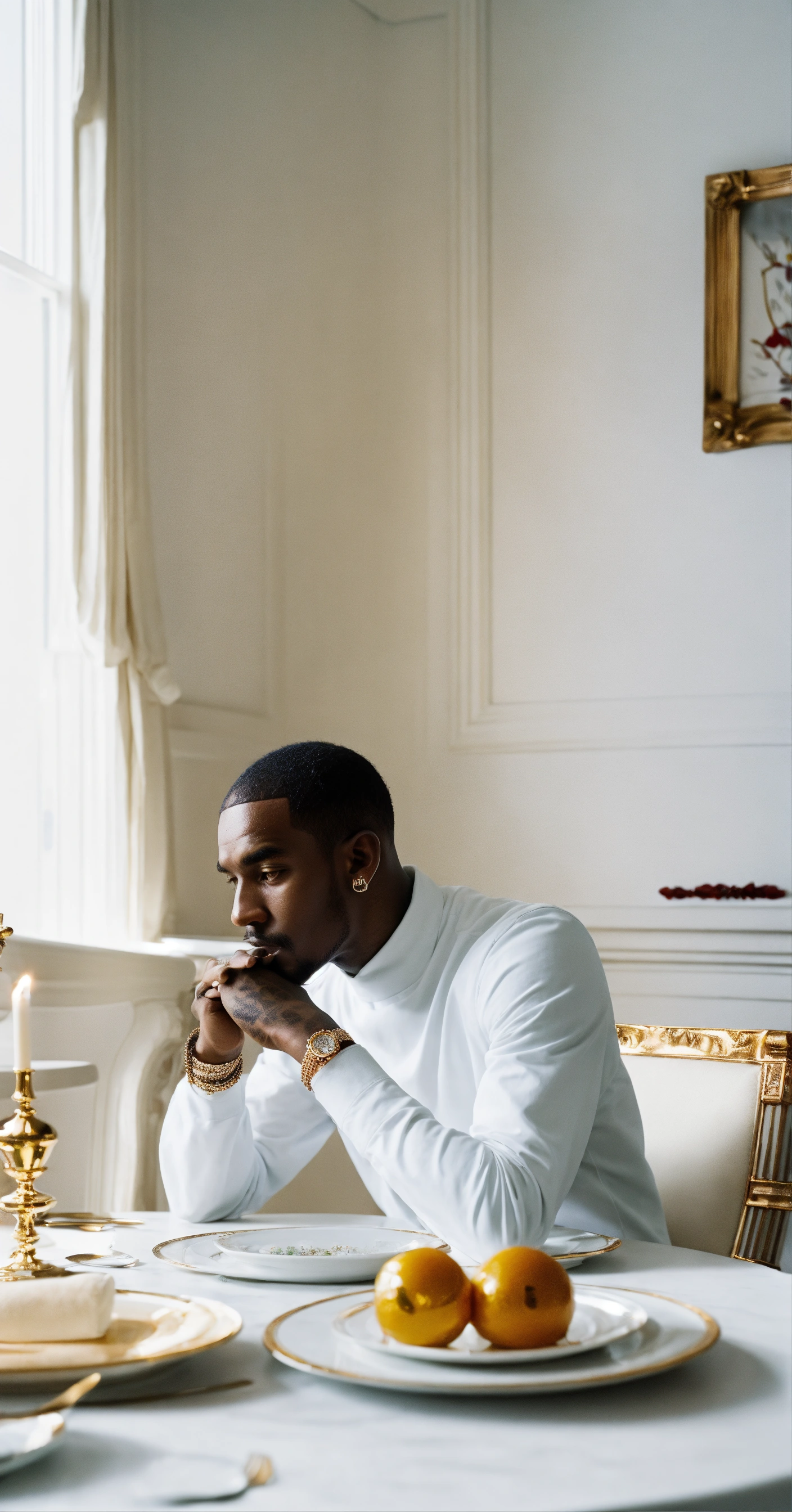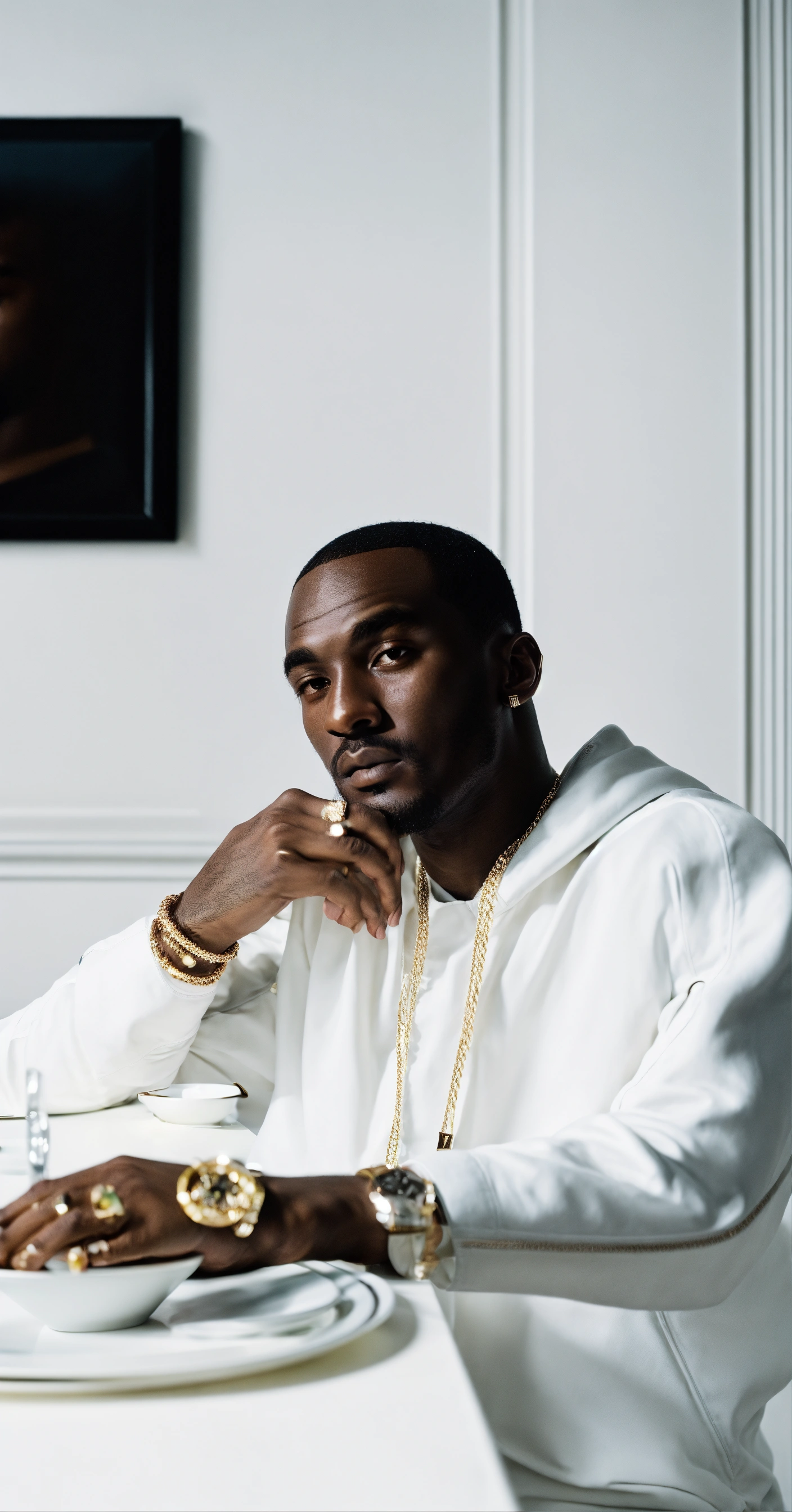 Side profile photograph of skepta, sitting at white dinning room table, inside of dining room, all white room, avant-garde, minimalist 8k resolution, hyper realistic, mid day, 35mm film, fashion editorial, high fashion, louis vuitton mens by virgil abloh