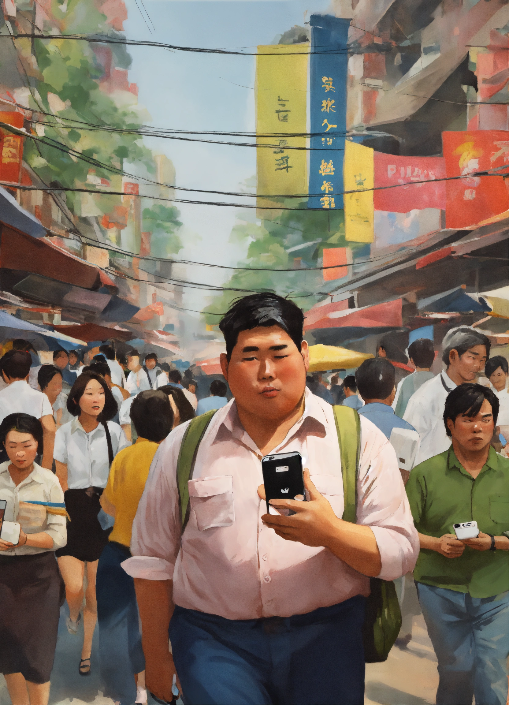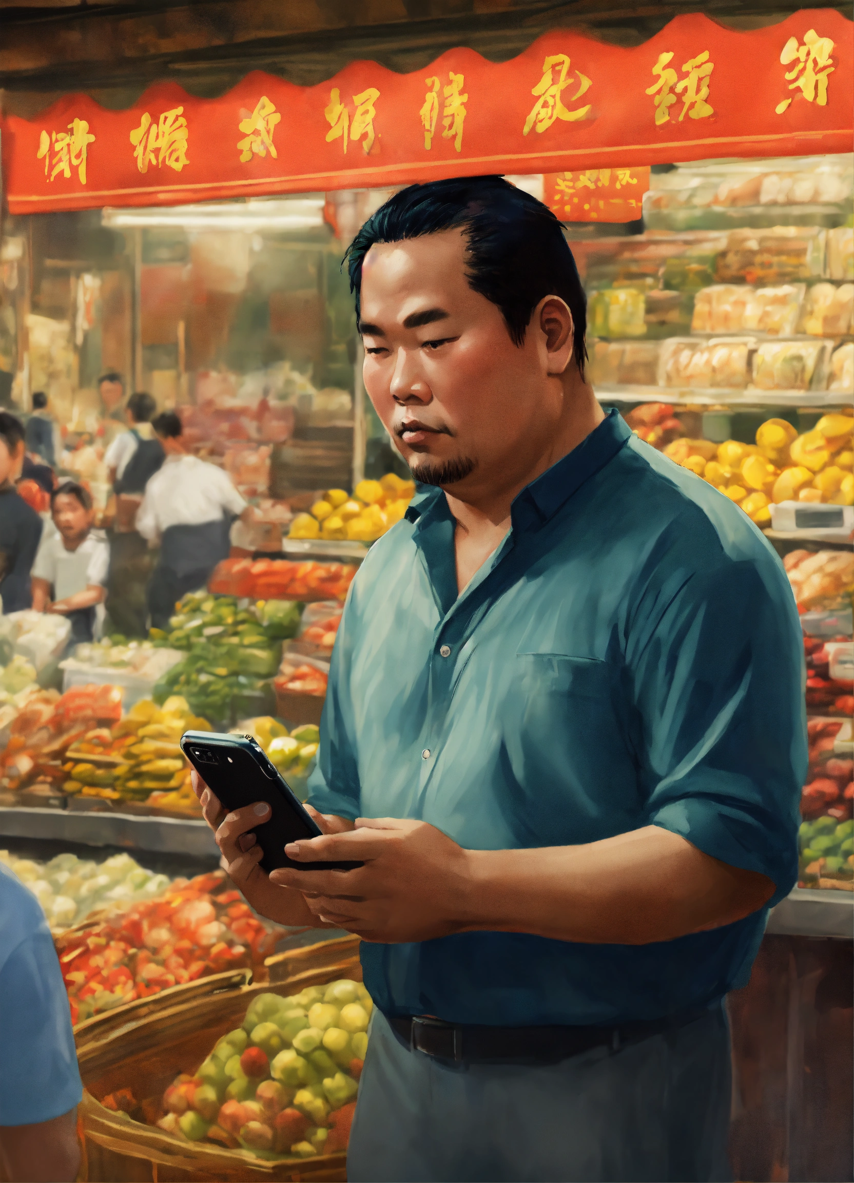 Huge vietnamese man, working alone in a bustling manner, holding his iphone 13 promax phone to ask for a creditor. a satirical image of that man
