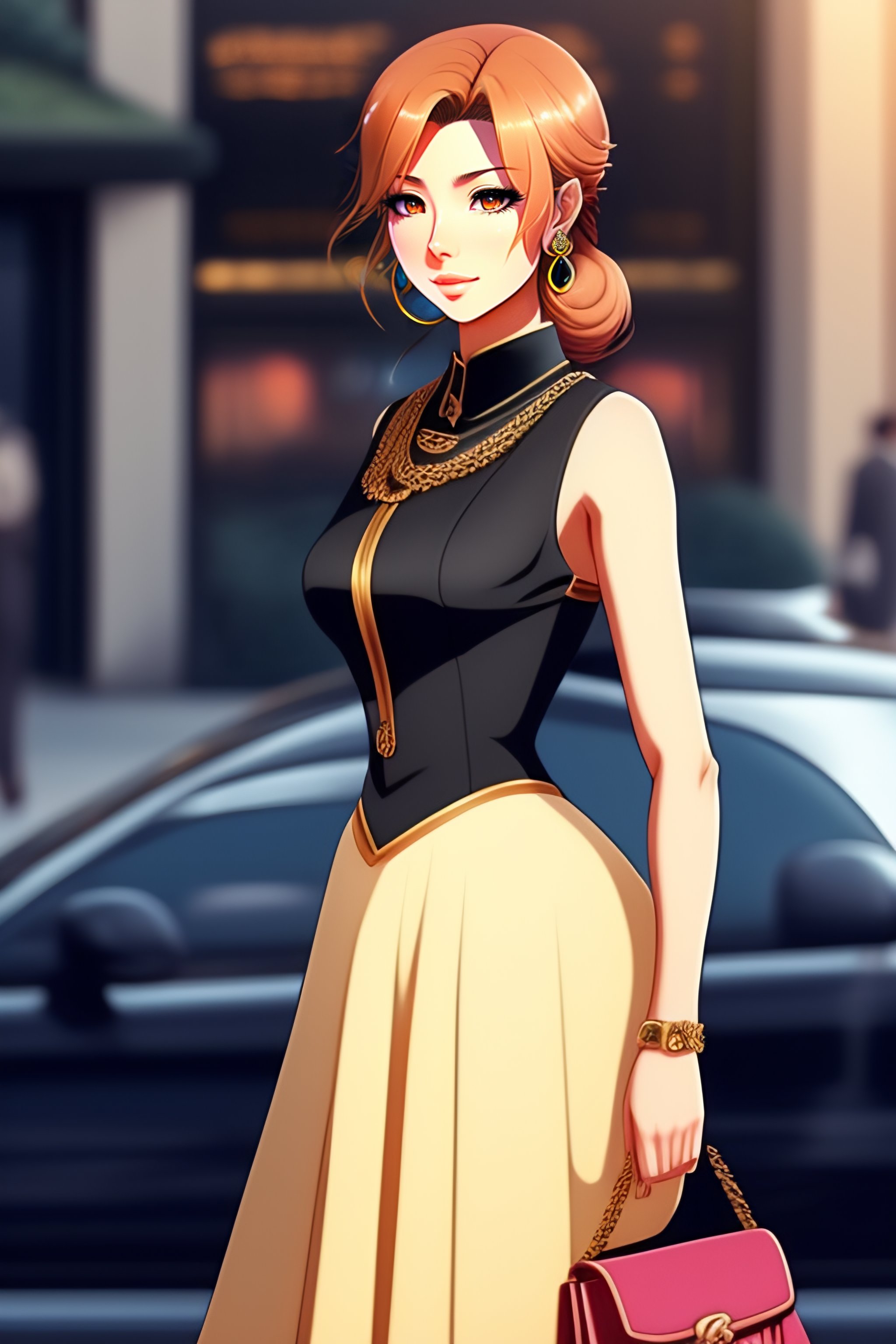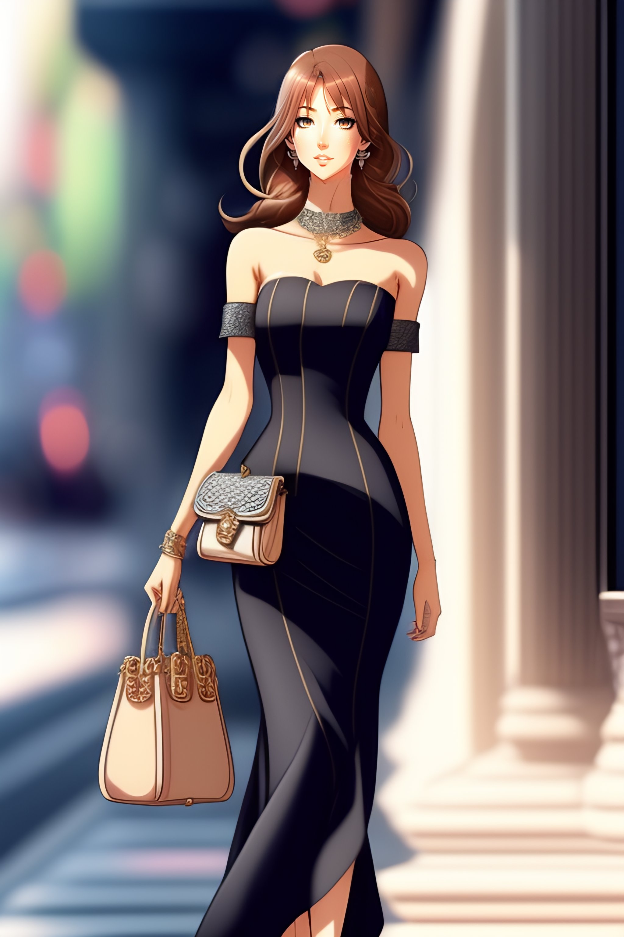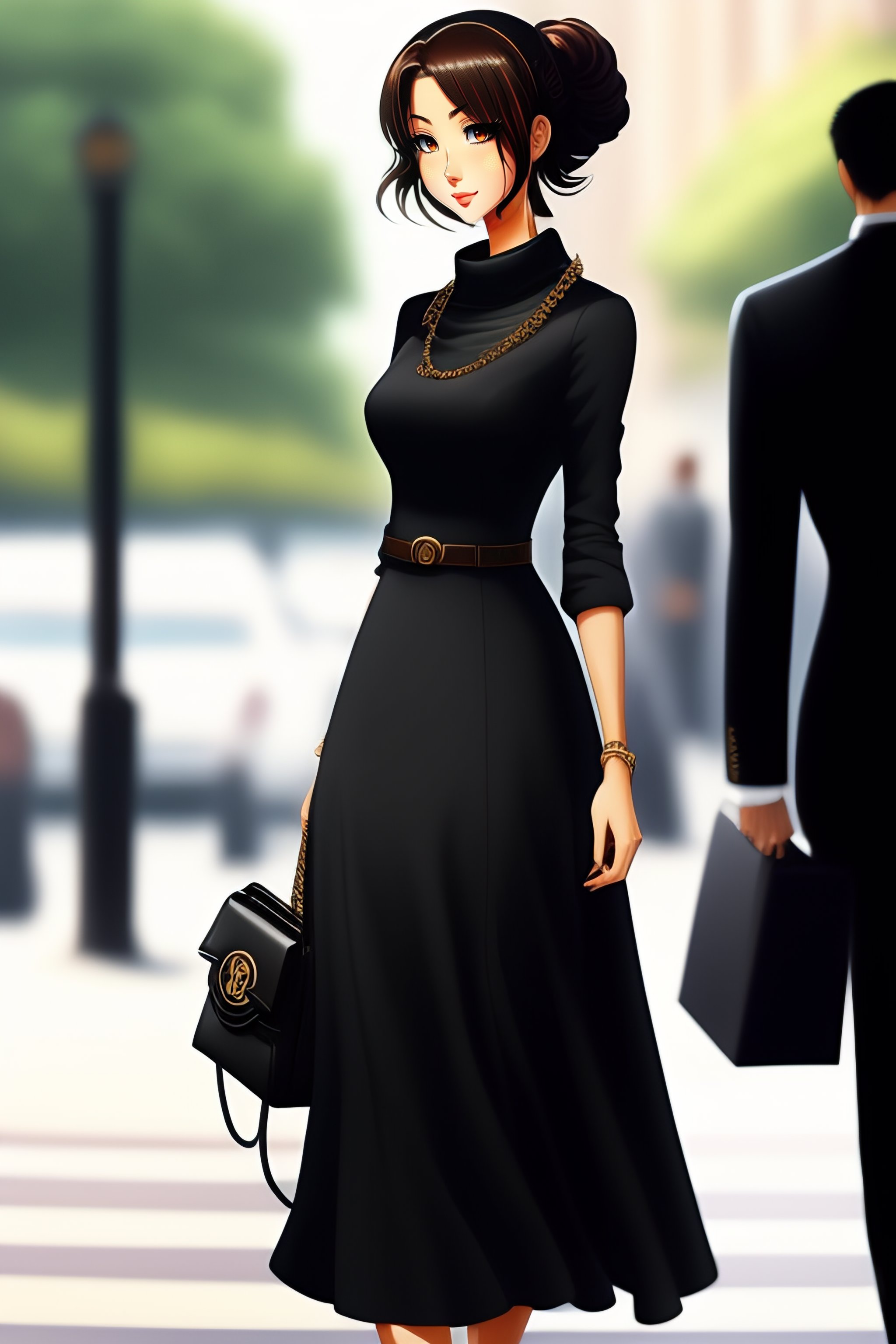 Sharp very well detailed anime cartoon of a woman wearing a modest long dress and carrying an elegant chanel black bag