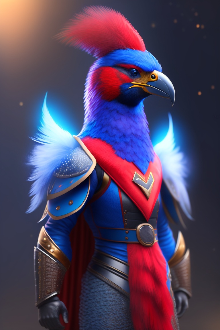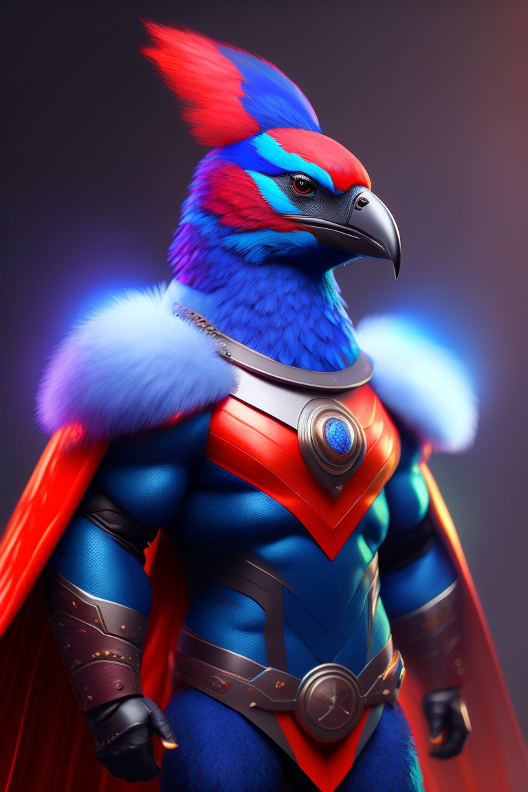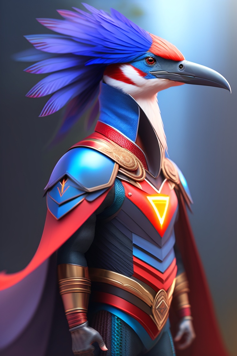 Red and blue woodpecker themed humanoid shaman superhero wearing a sleek form fitting feather covered costume, stunning dynamically lit dynamically composed dynamic depth high detail high resolution 4k hd