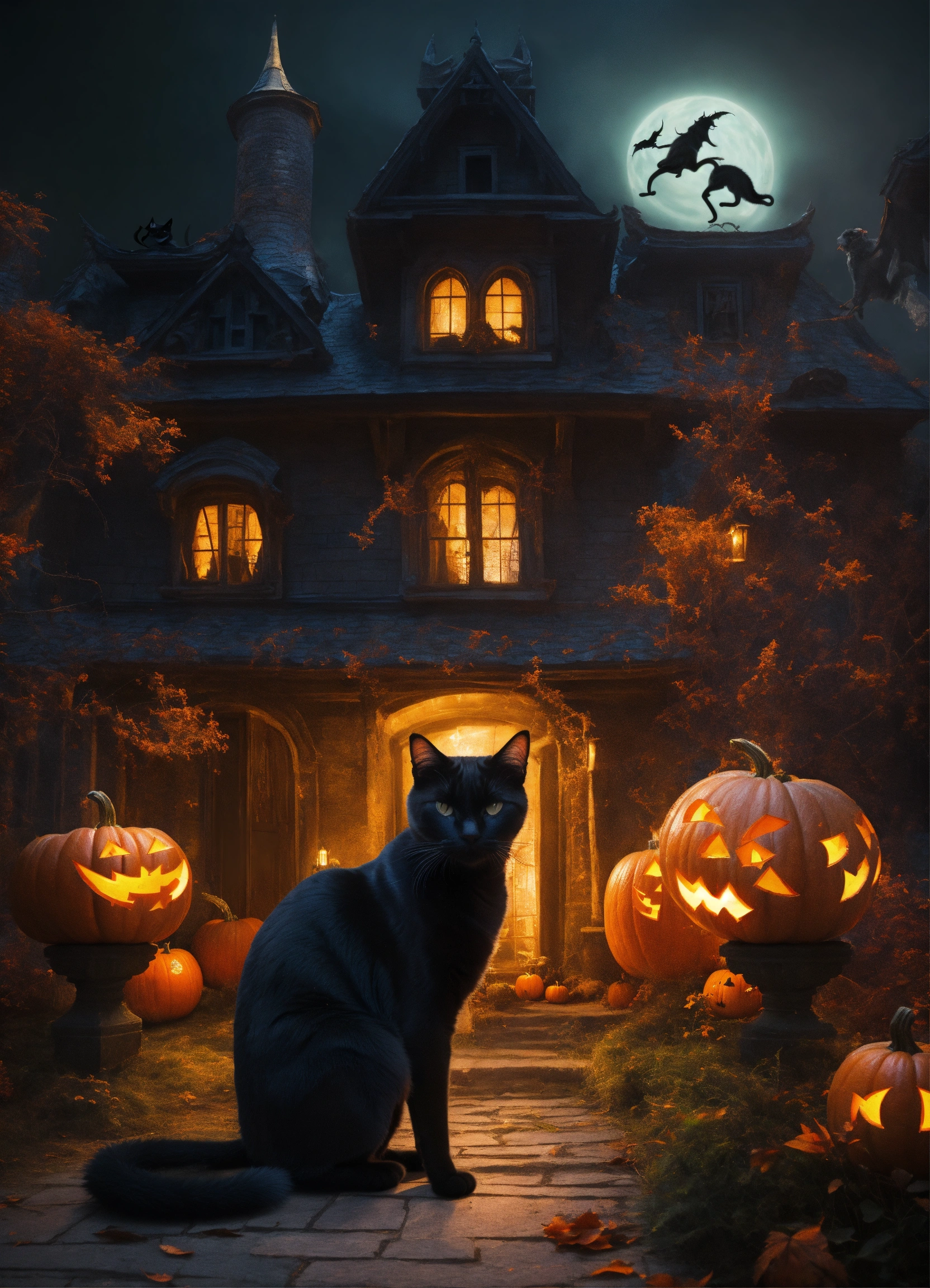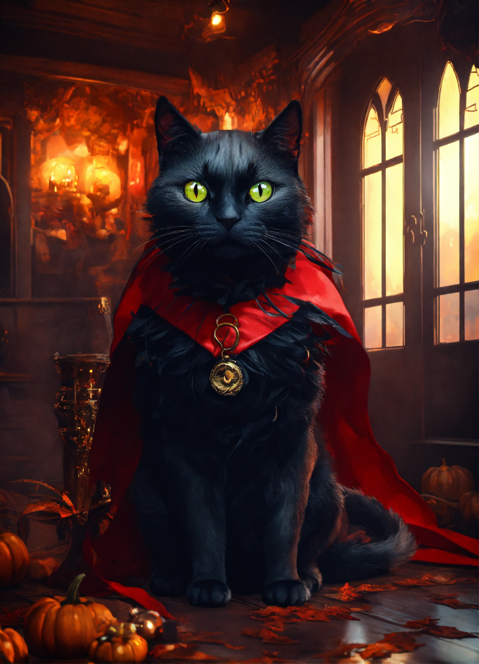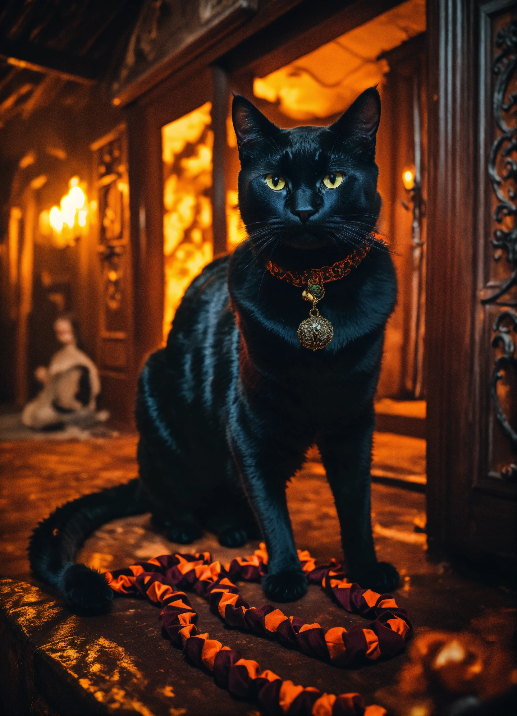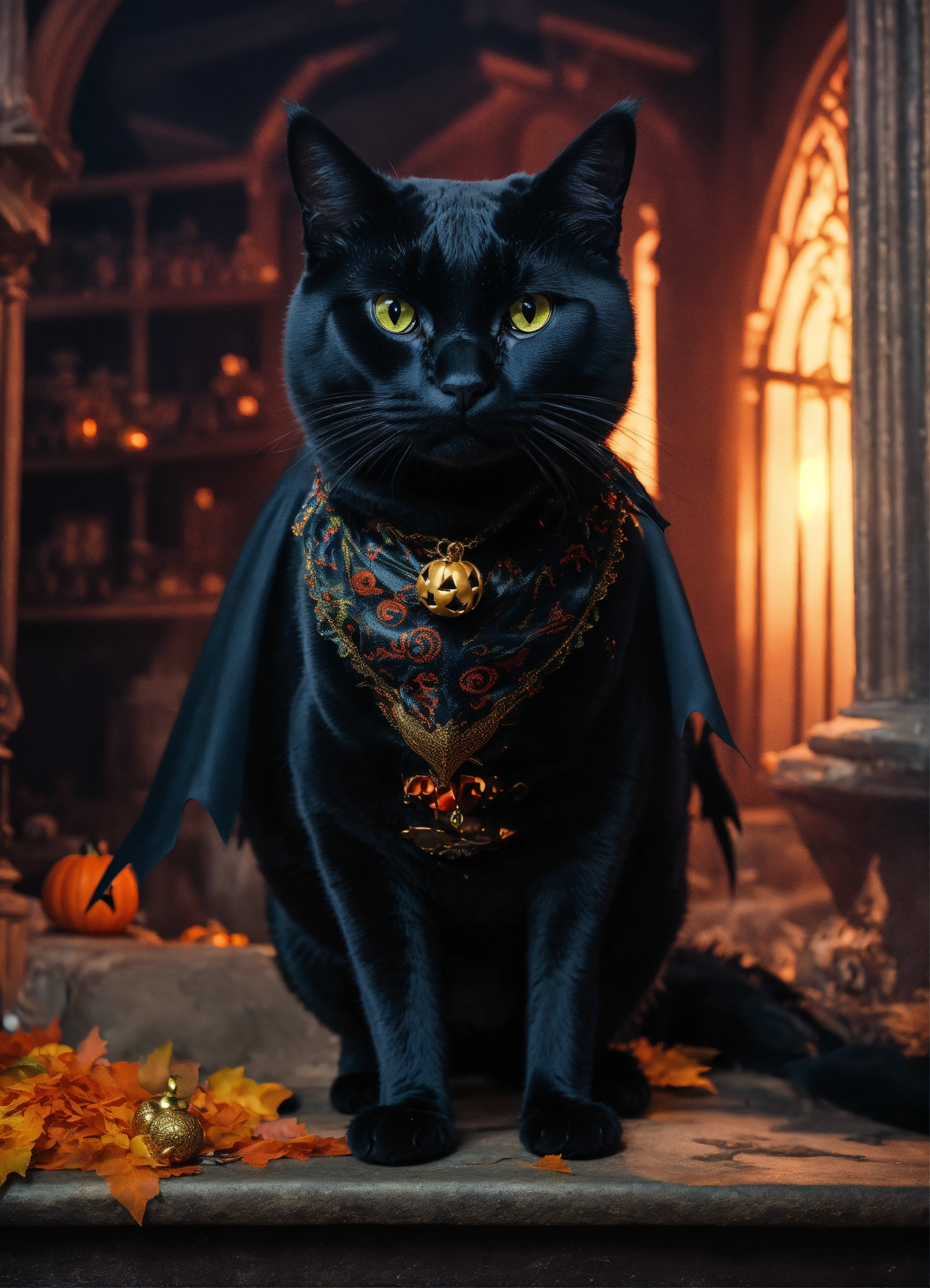 A ‘black cat in a dragon costume visiting a haunted house on halloweey