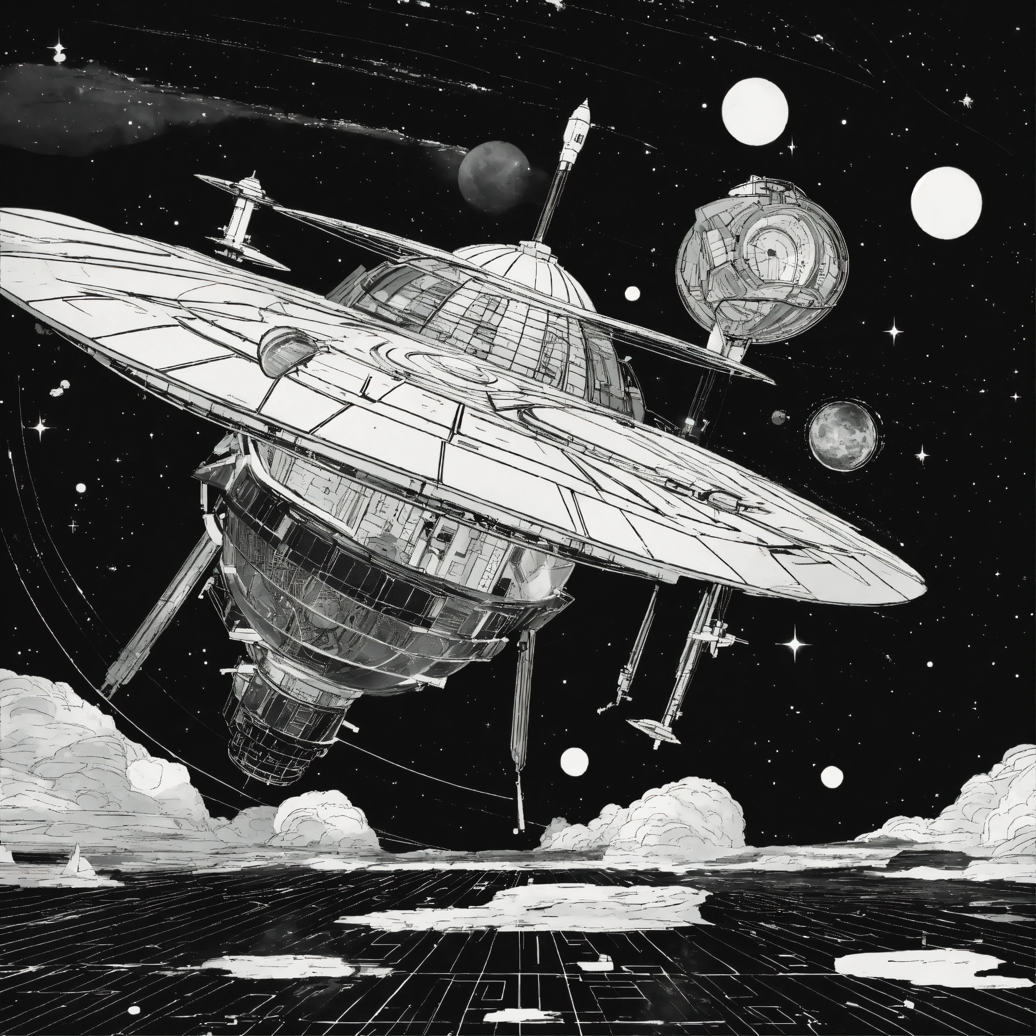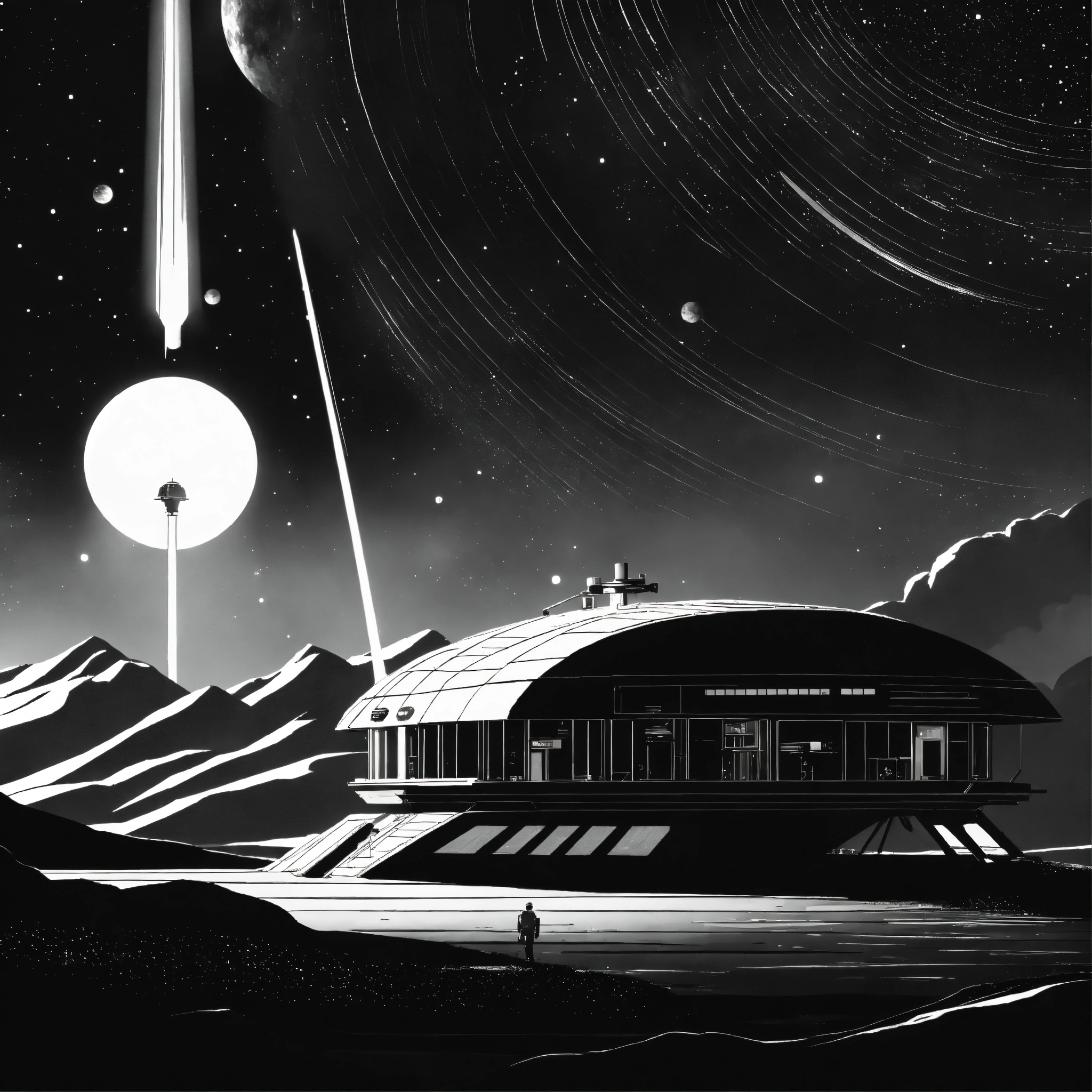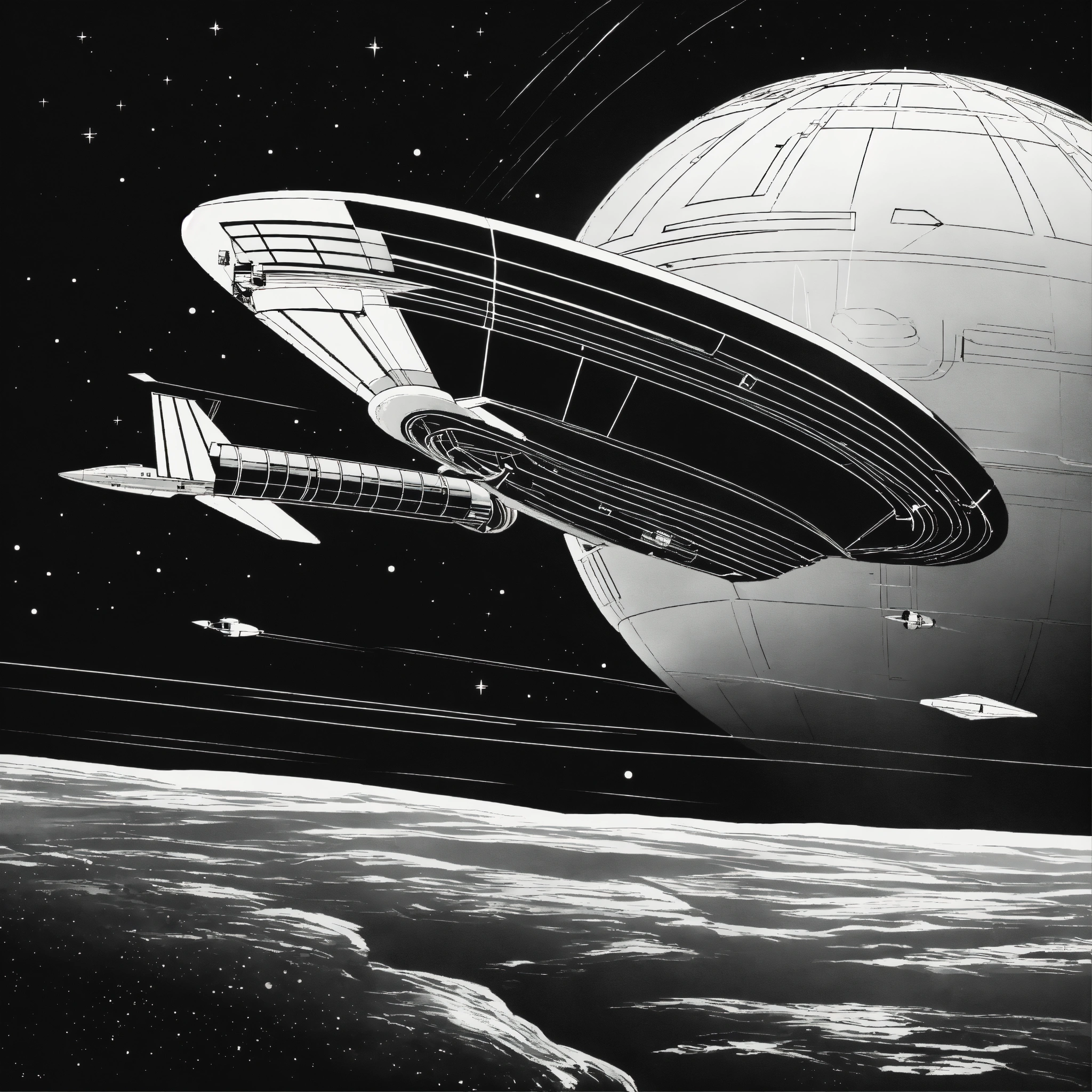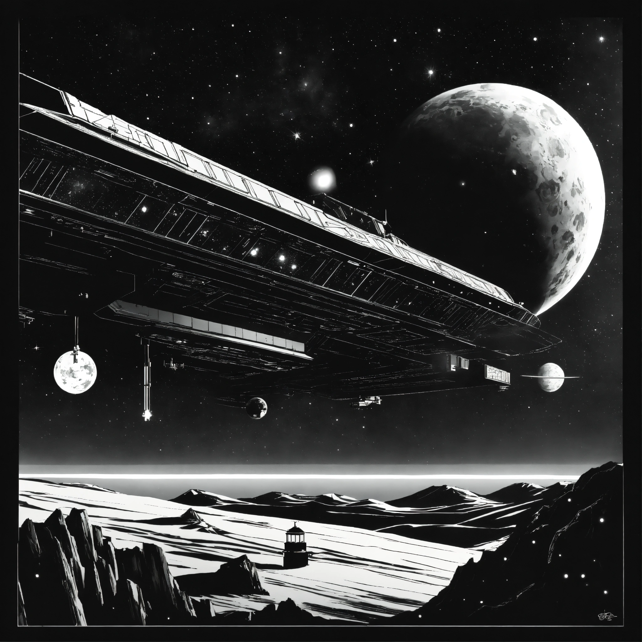 Art deco deep space exploration station flying towards a bright start, dark background, black space, black and white