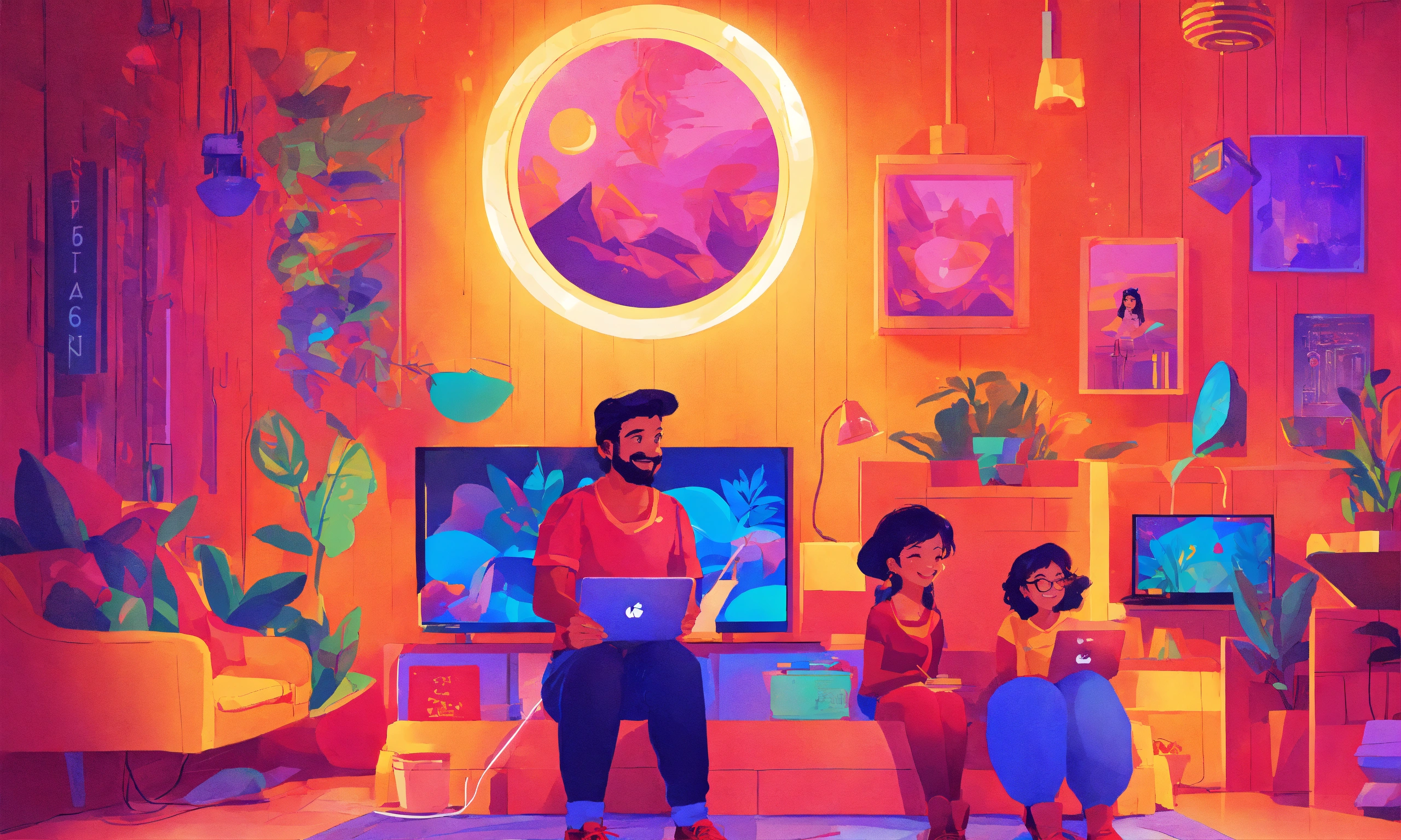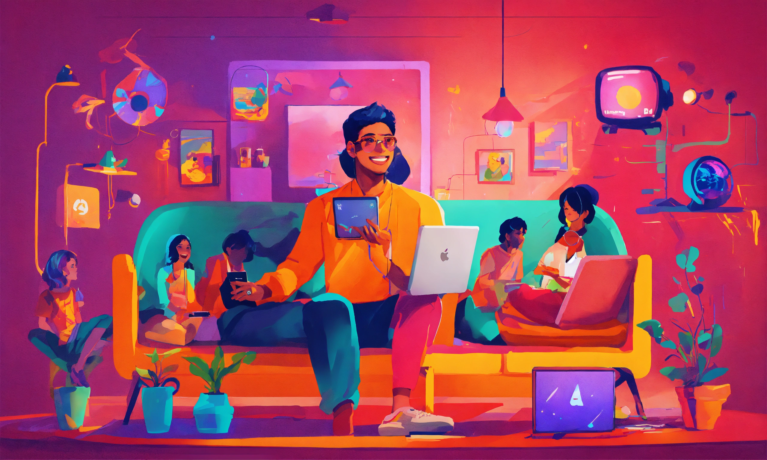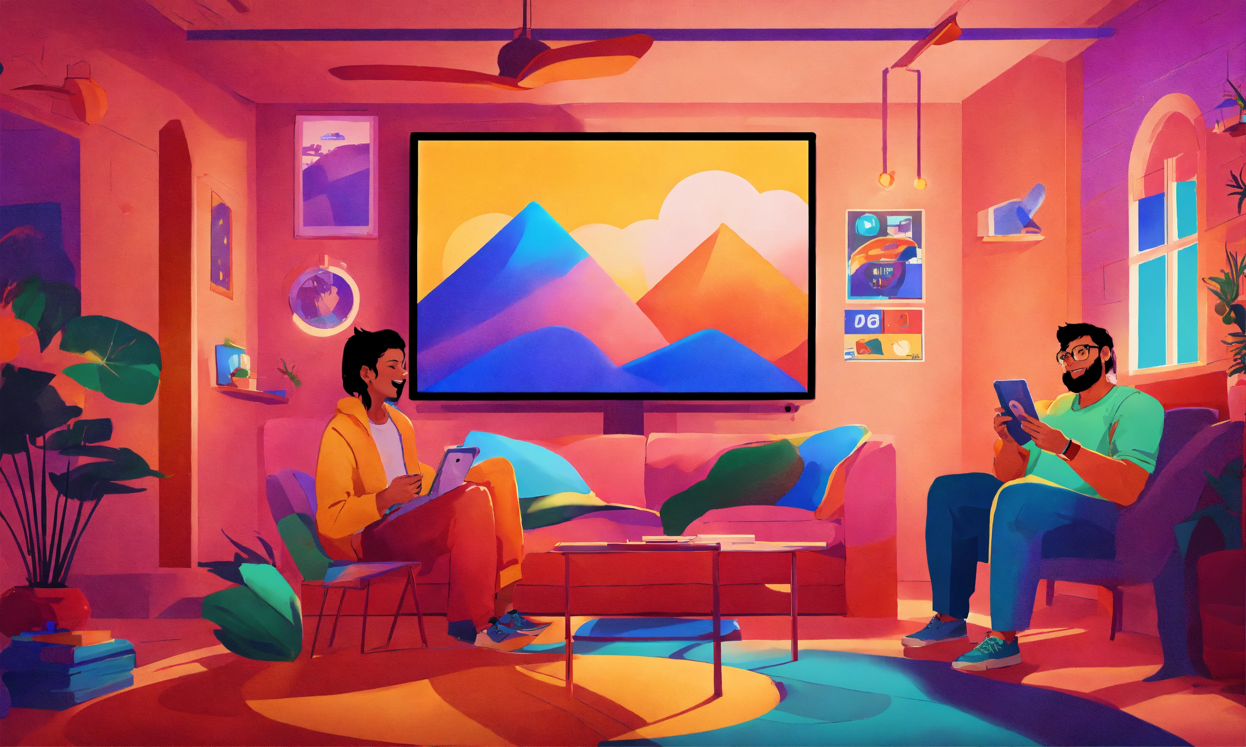/imagine prompt a vibrant digital illustration capturing the excitement of streaming services in india. show a diverse group of people enjoying their favorite shows and movies on various devices, with colorful graphics and icons representing different streaming platforms. illustration by alex chin, showcasing his dynamic and modern style. use a bright color palette to convey a lively atmosphere and happy expressions on the faces of the characters. the lighting should be vibrant and playful, with a sense of motion and energy. --v 5 --stylize 1000 --ar 169