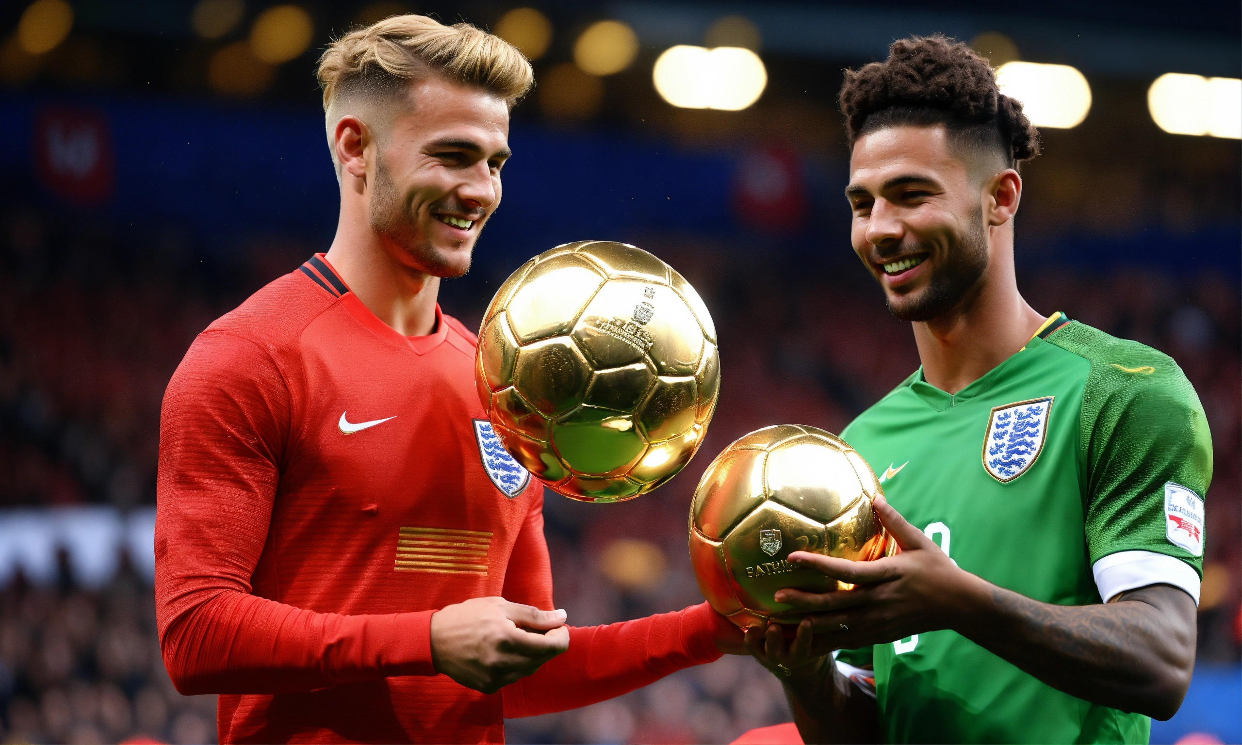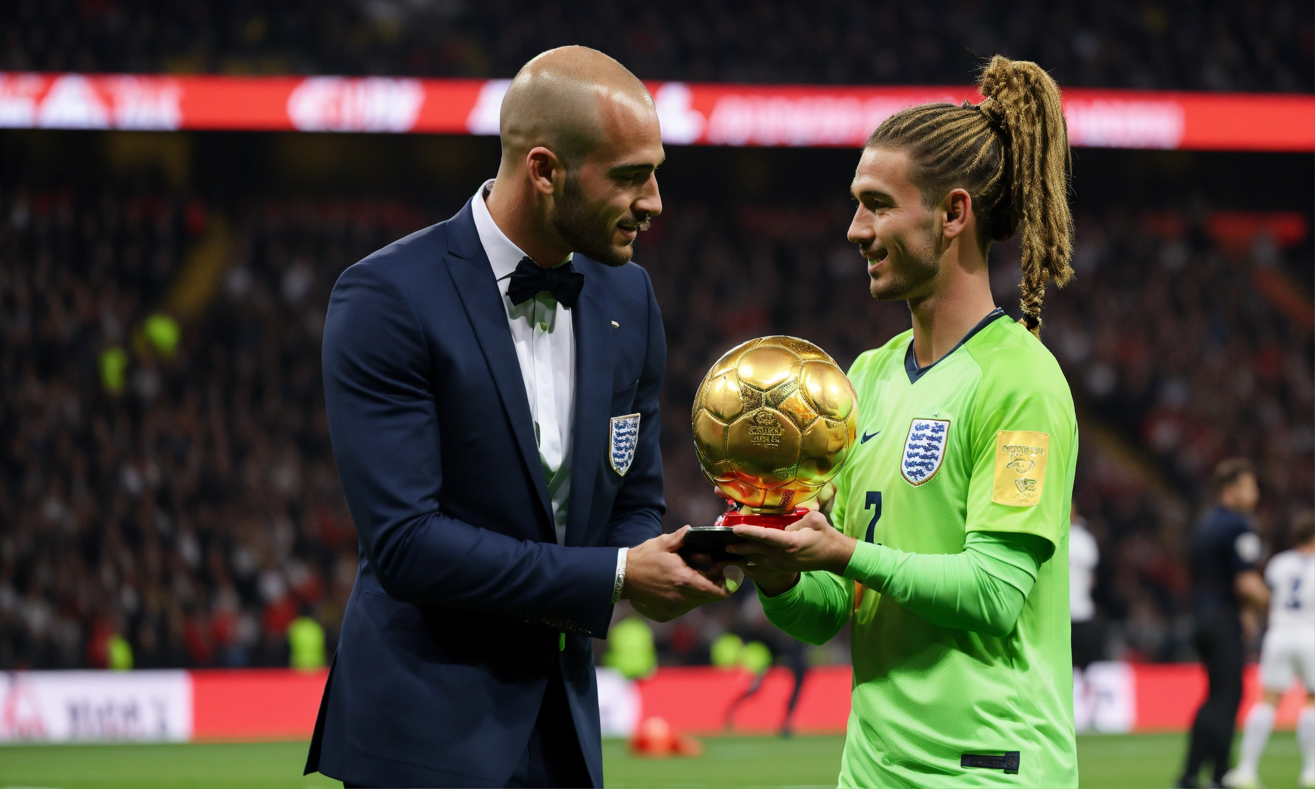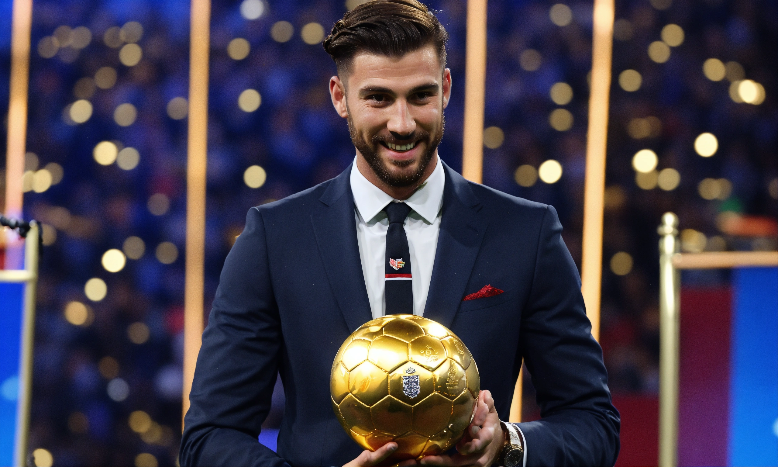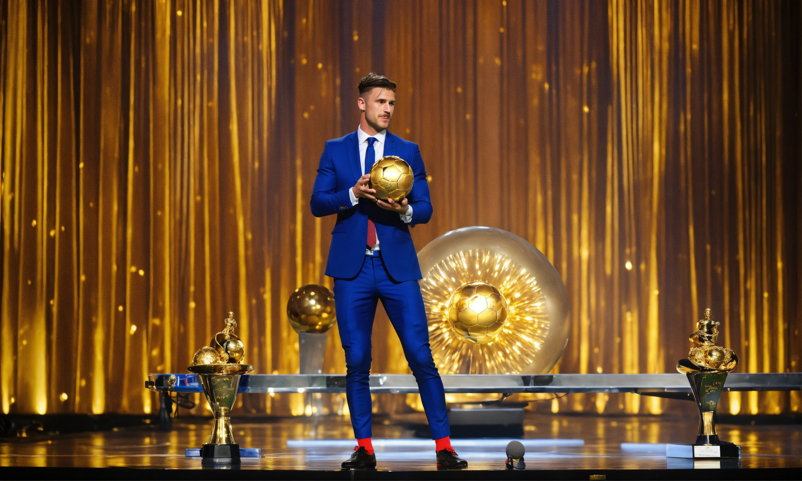 Awarding the golden ball to the best football player, on stage, half of the body is visible, a cute man in a suit, ling hair tied in a pigtail, england man