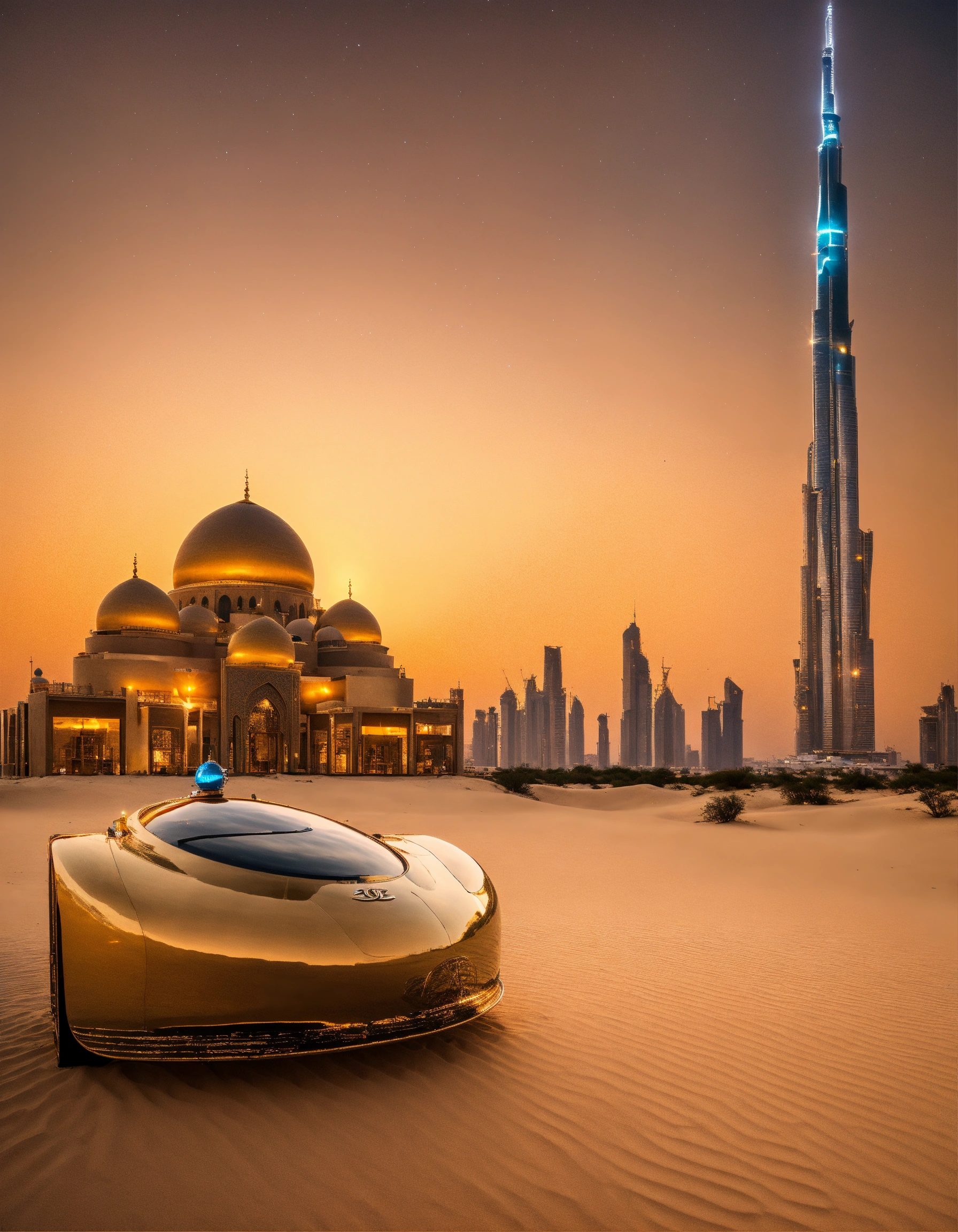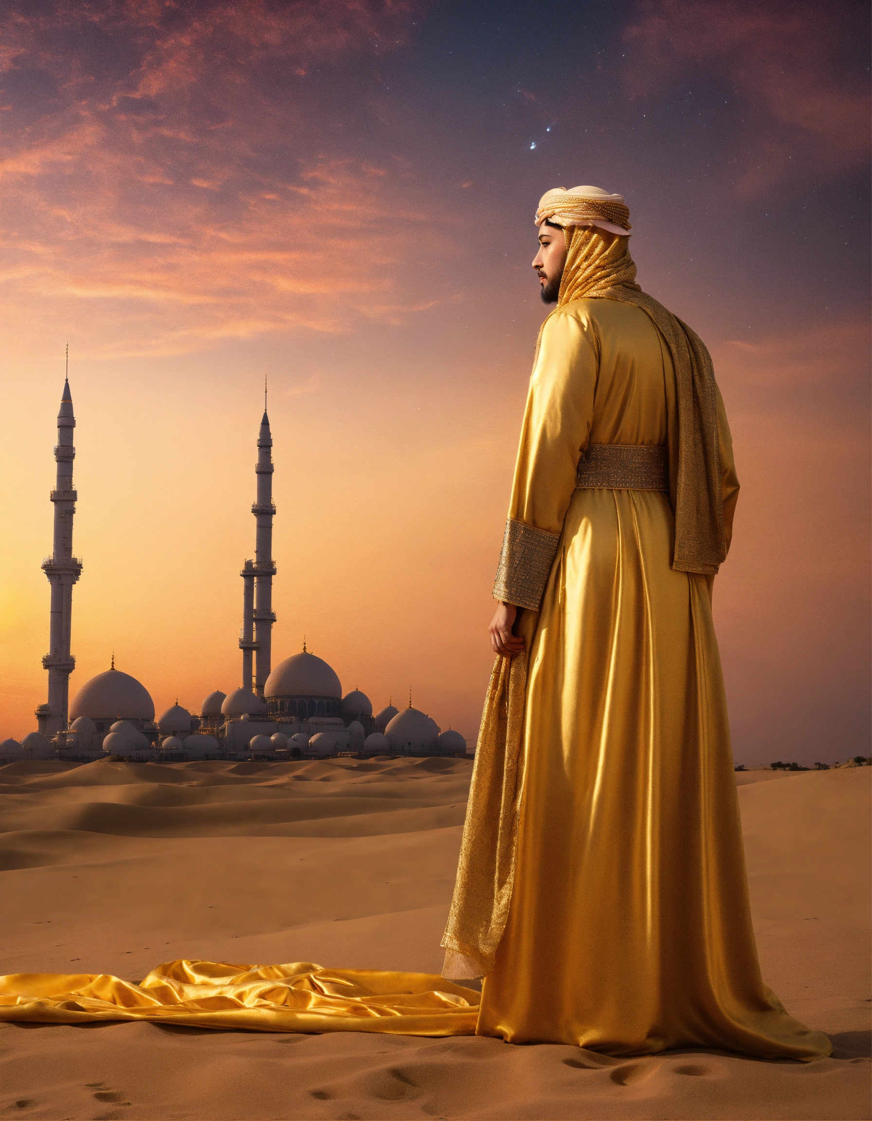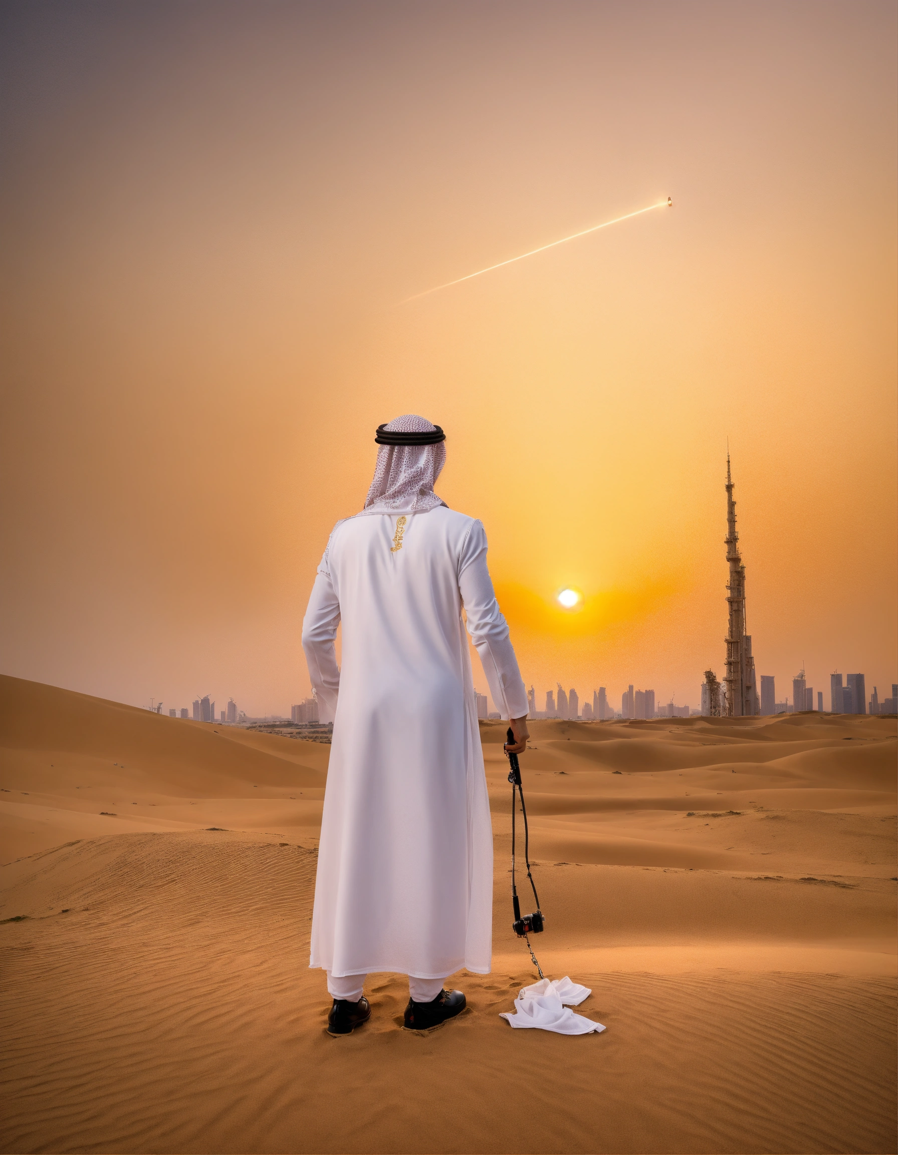 Moza space alsabah prince satellite petrol sand sunset mirror skyline arabic text gold lux bisht chanel
