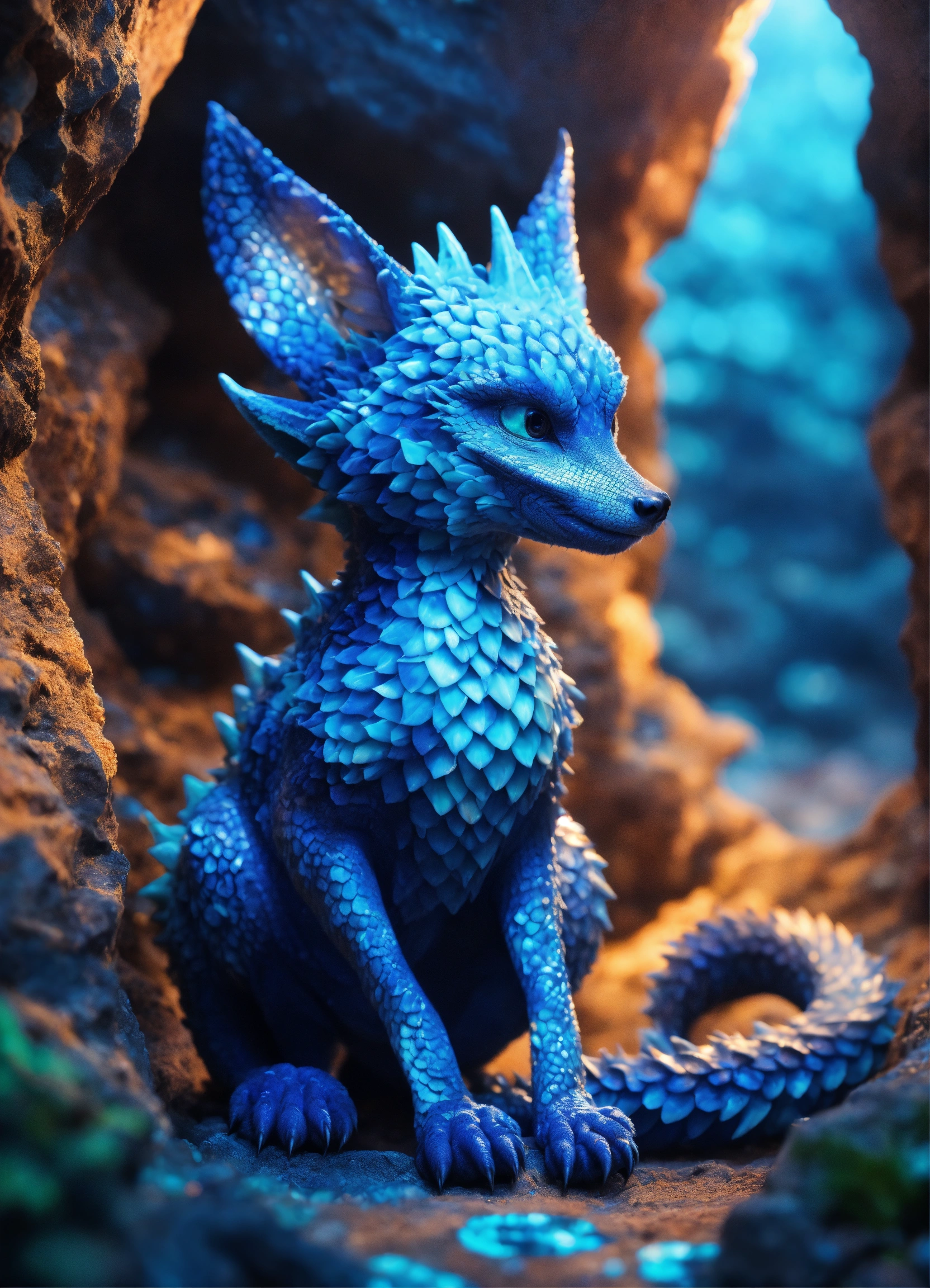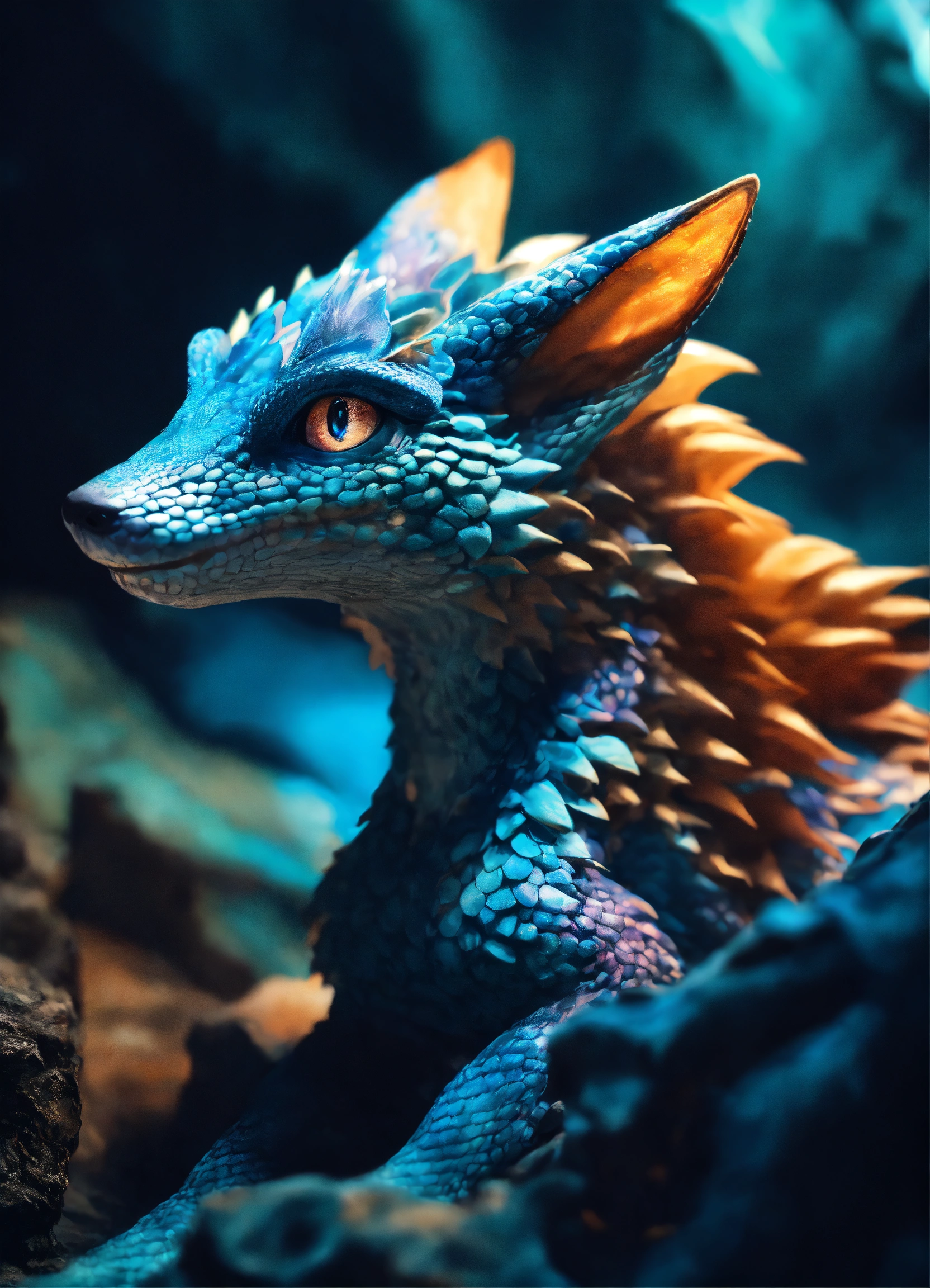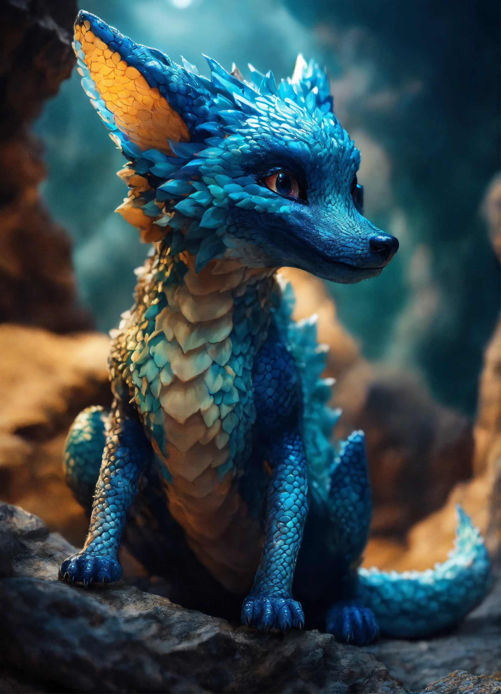 A scaly alien creature that is like a fox and a baby dragon, marbled light and dark scales, some blue hues, light eyes, cute, digital photography, in a cave