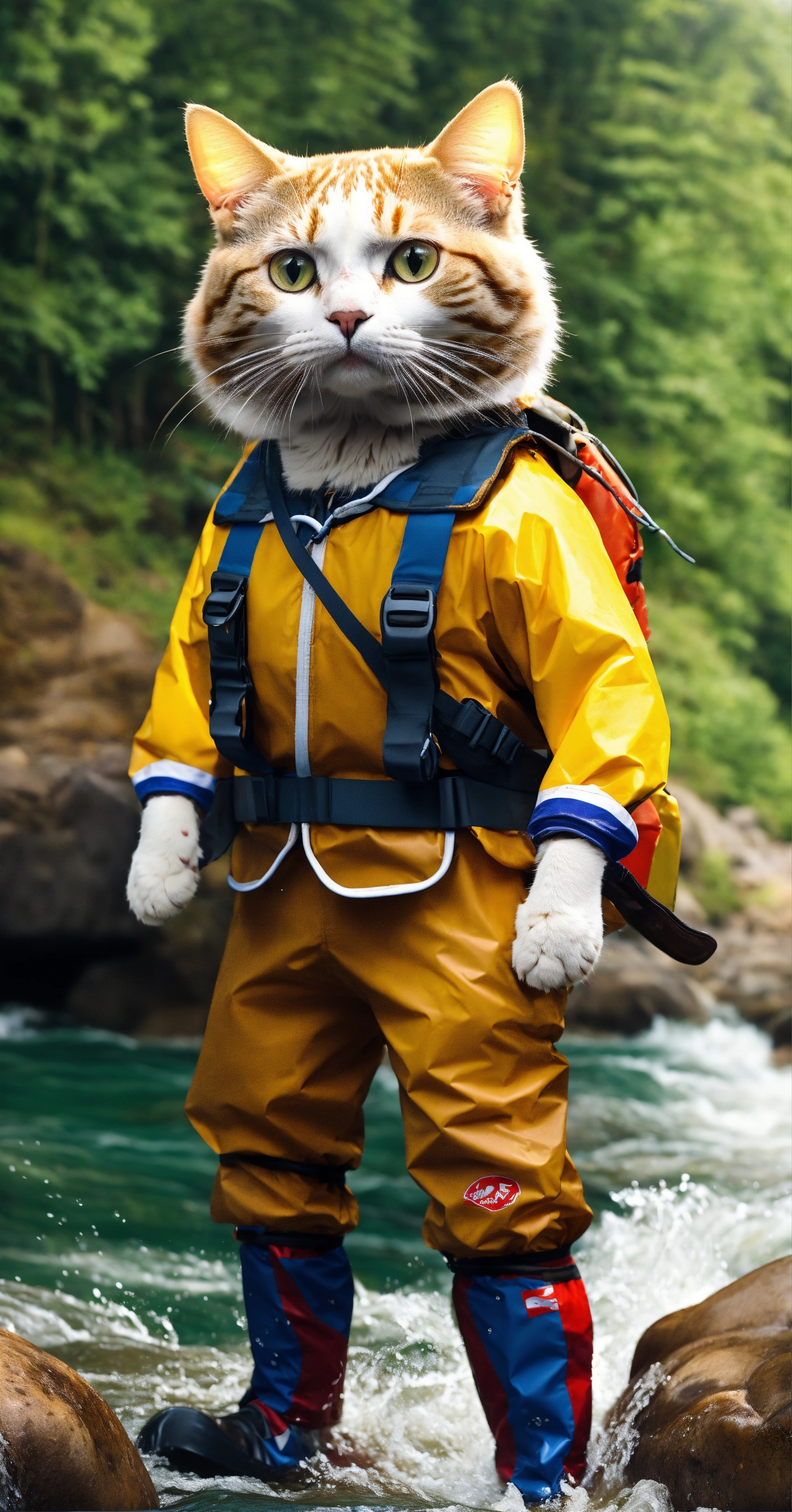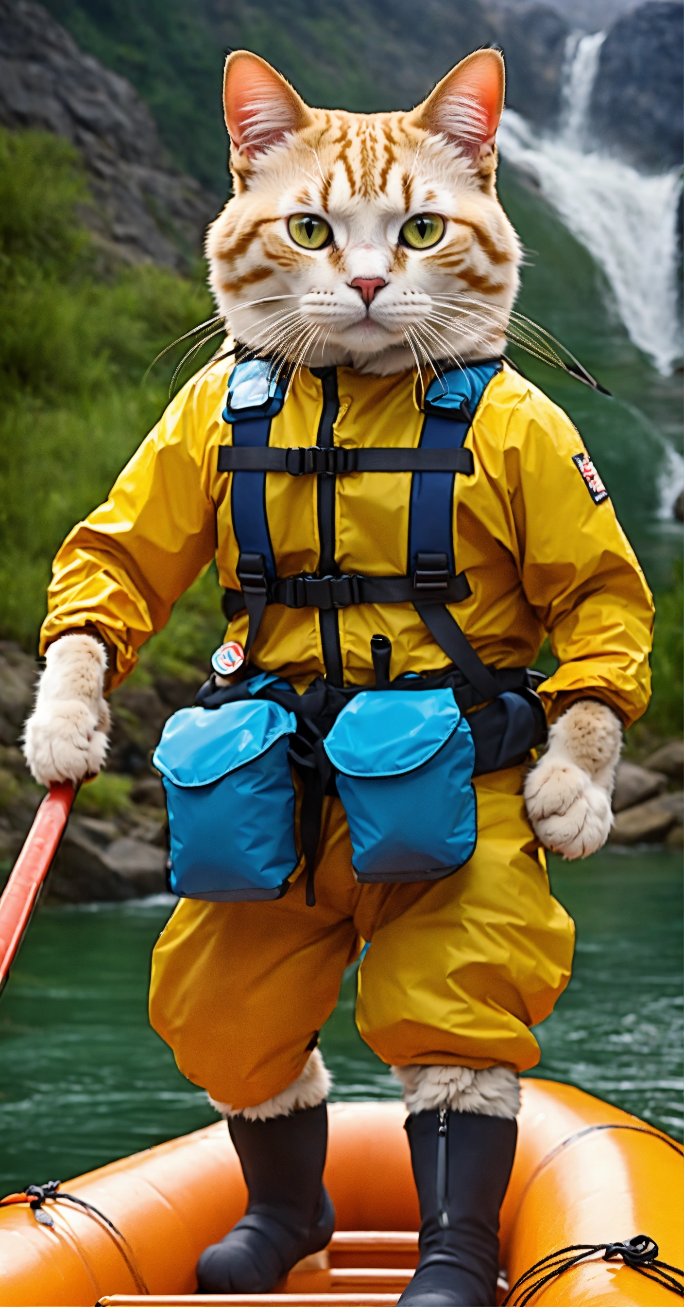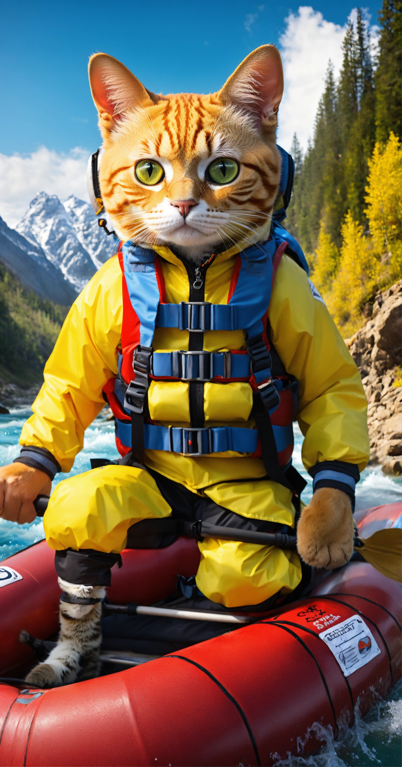 Generate a picture of a cat as a white-water rafting guide, steering a tiny raft through wild rapids while dressed in rafting gear