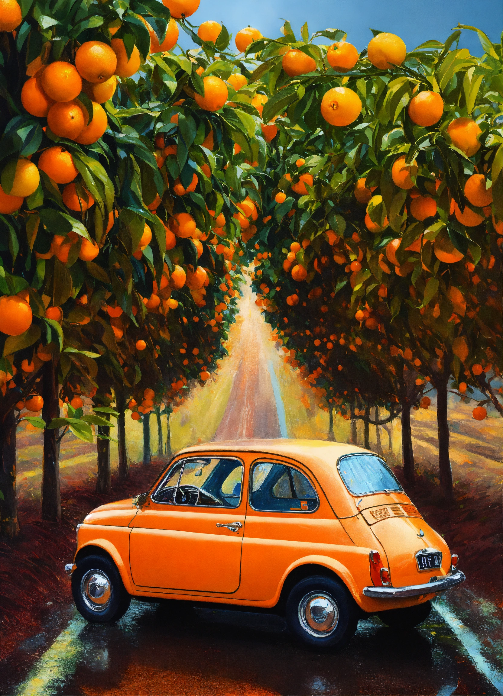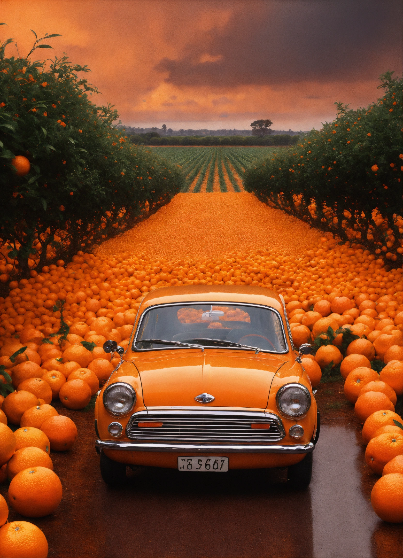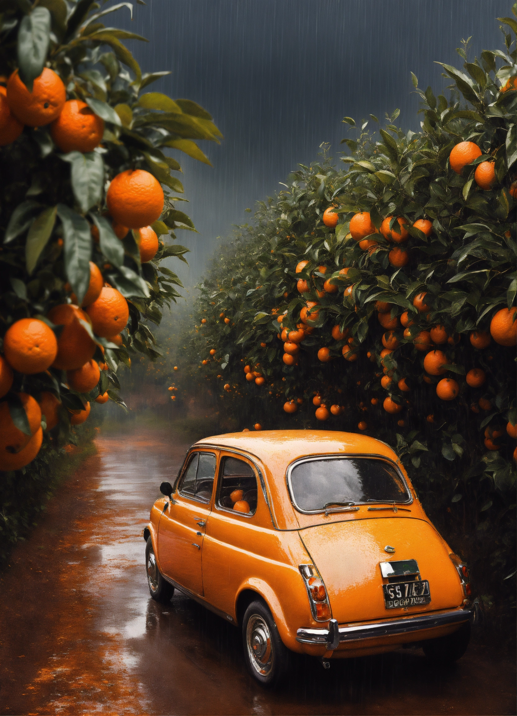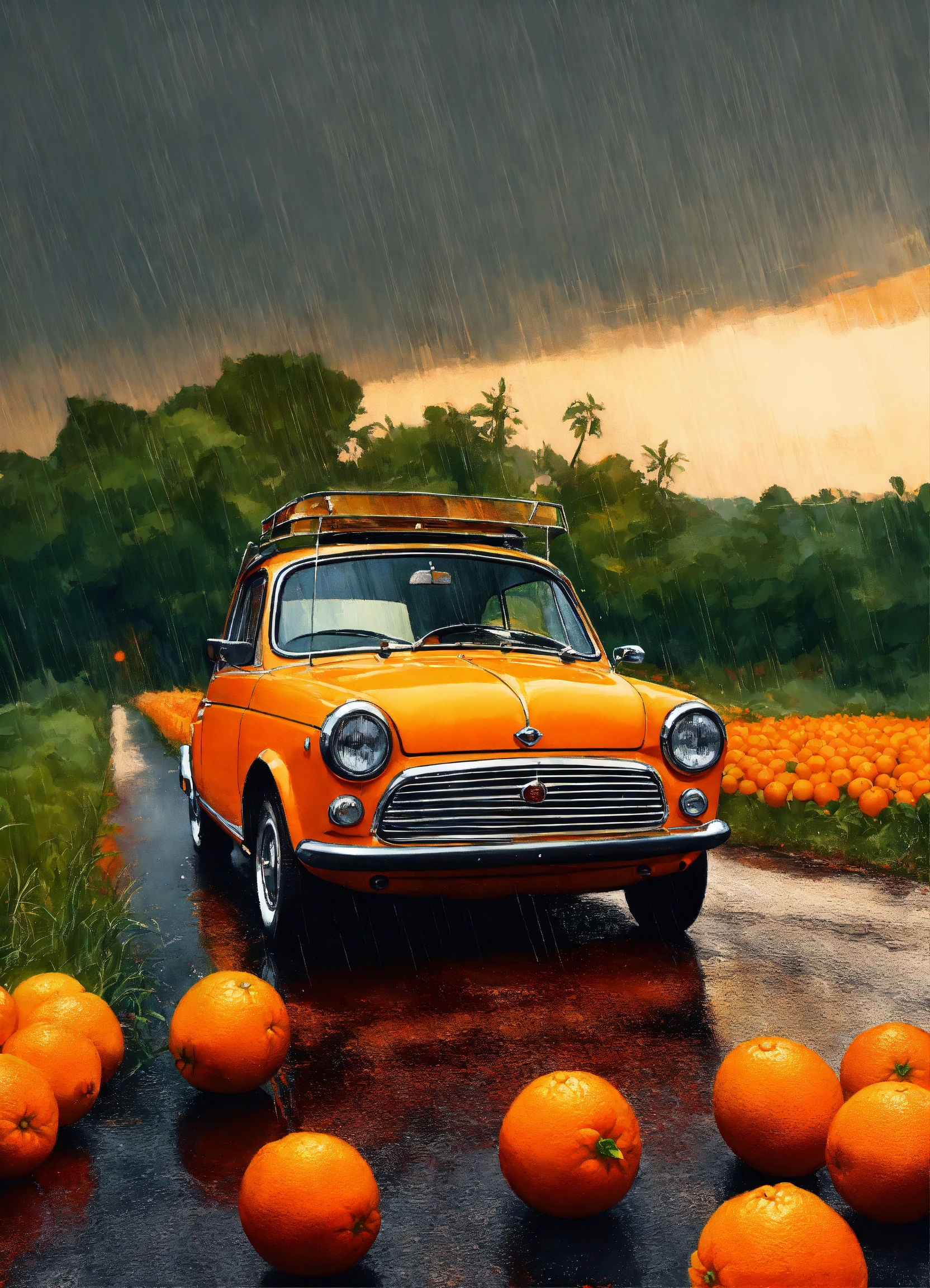 A oranges field rainnig, in the style of digital painting and drawing, classic american cars, iconic album covers, synthetism-inspired, cinquecento, shock art, wimmelbilder --s 750