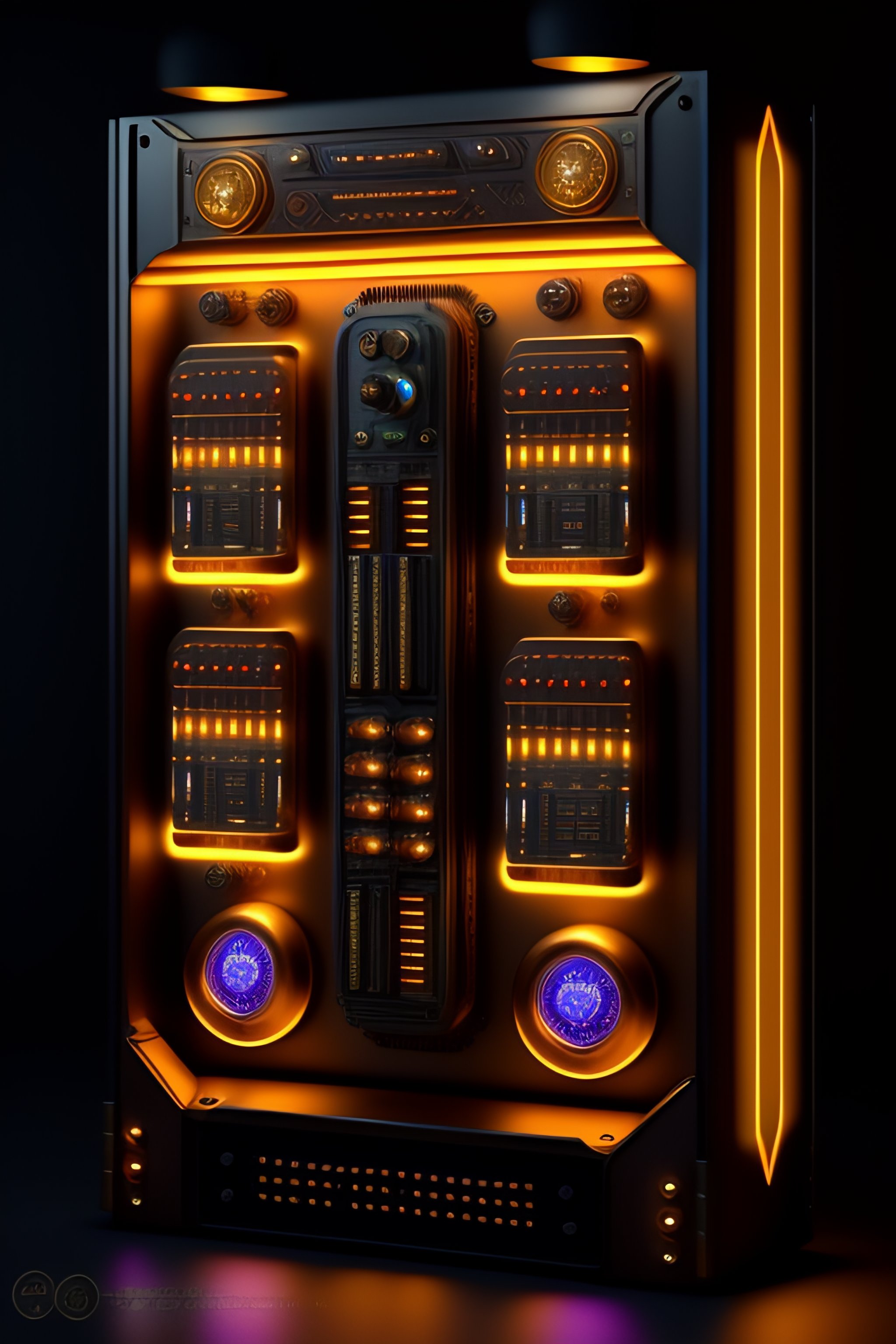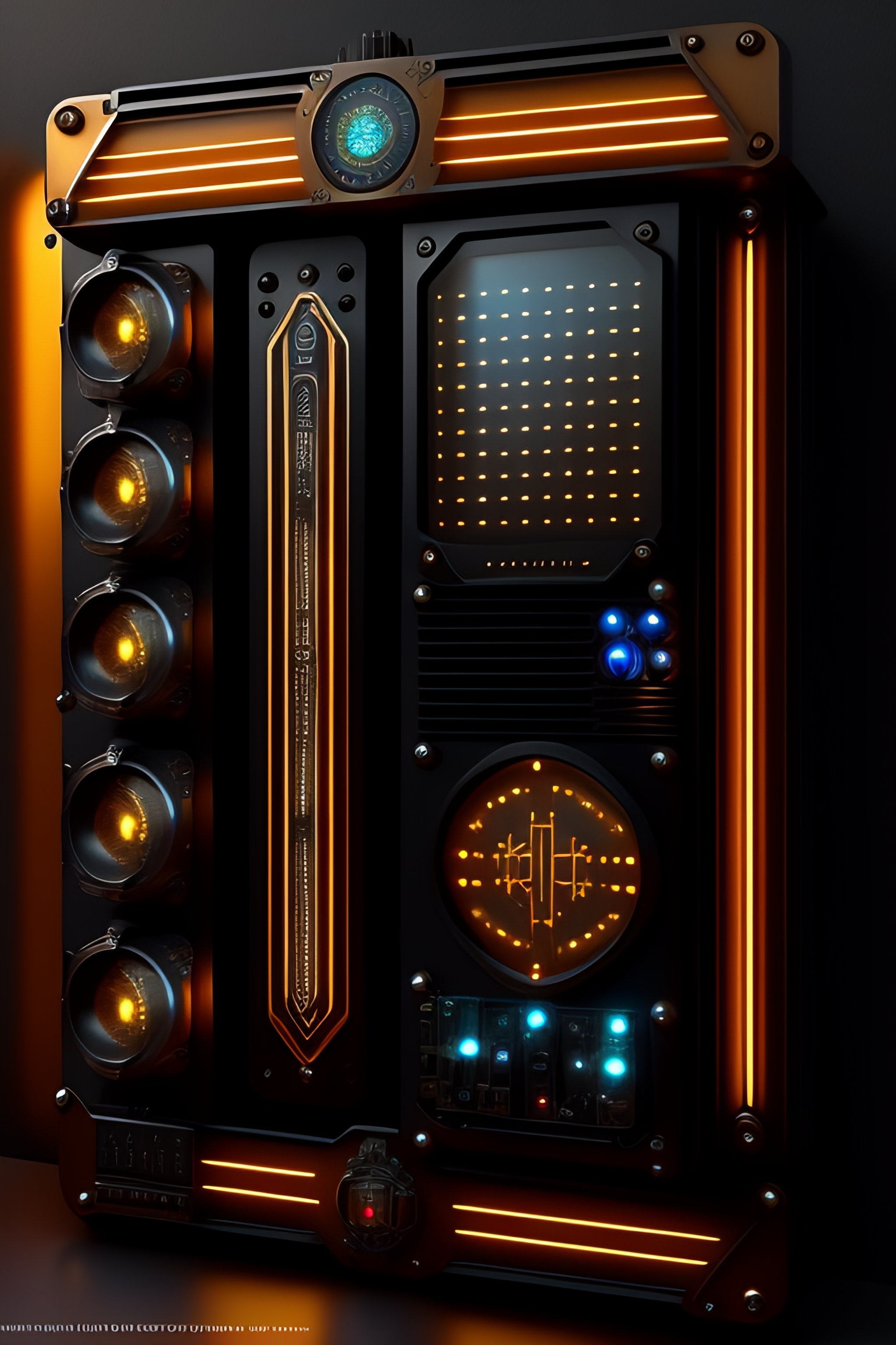 Cyberpunk, steampunk, dieselpunk, star wars, star trek, inception, ex machine, control panel, rusty brown and gold leds, nixie tubes, gauges, monitors, screens, front view