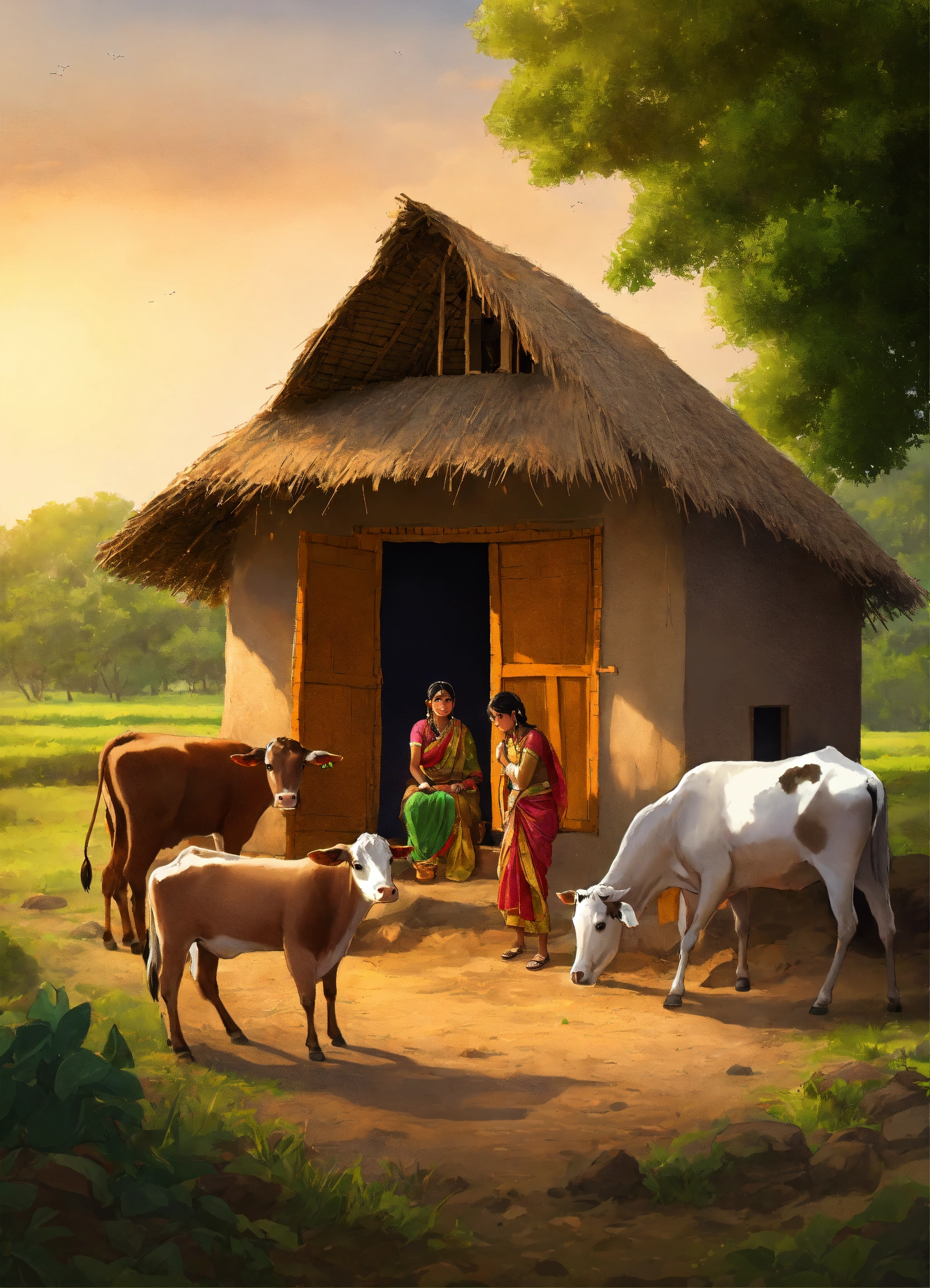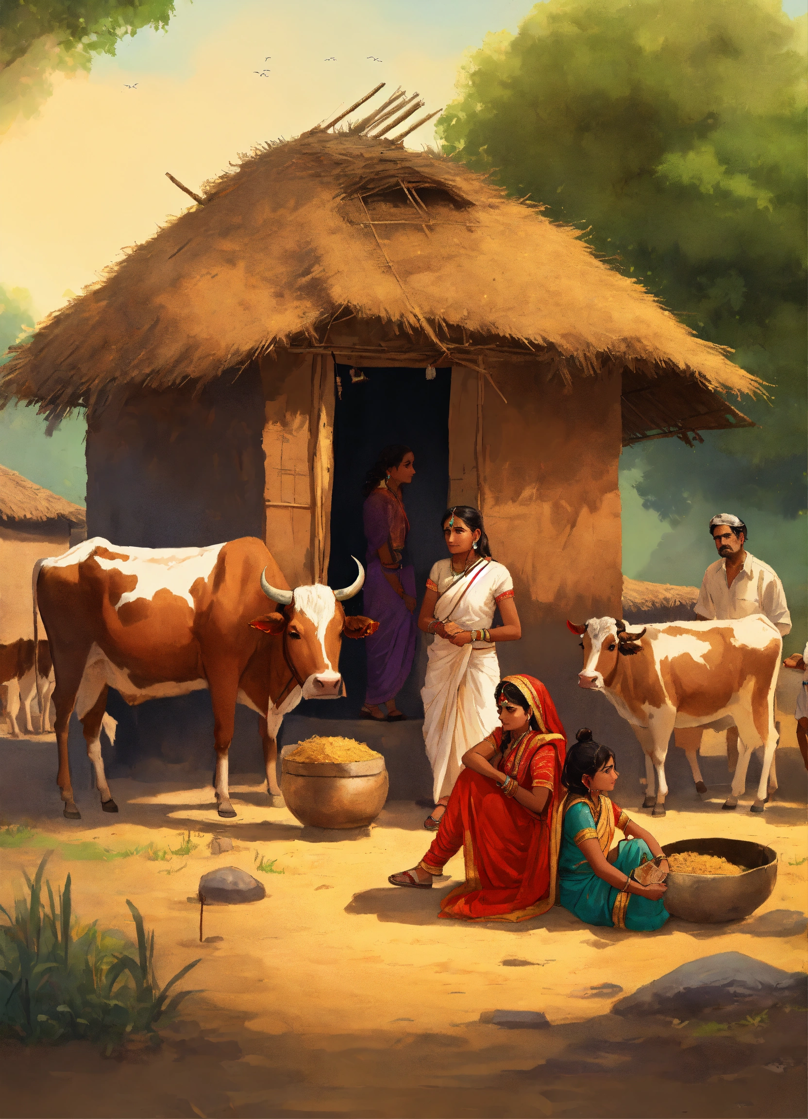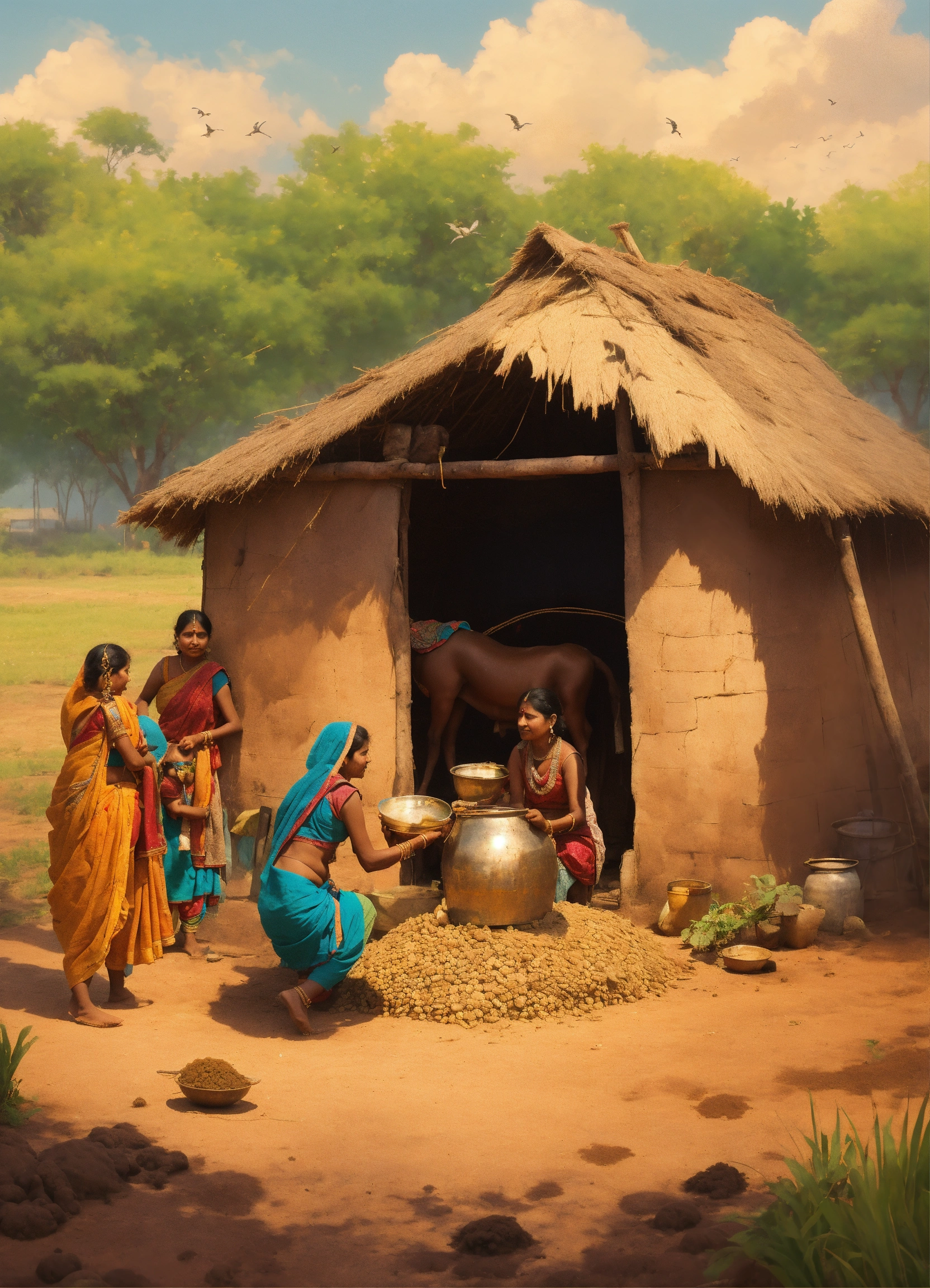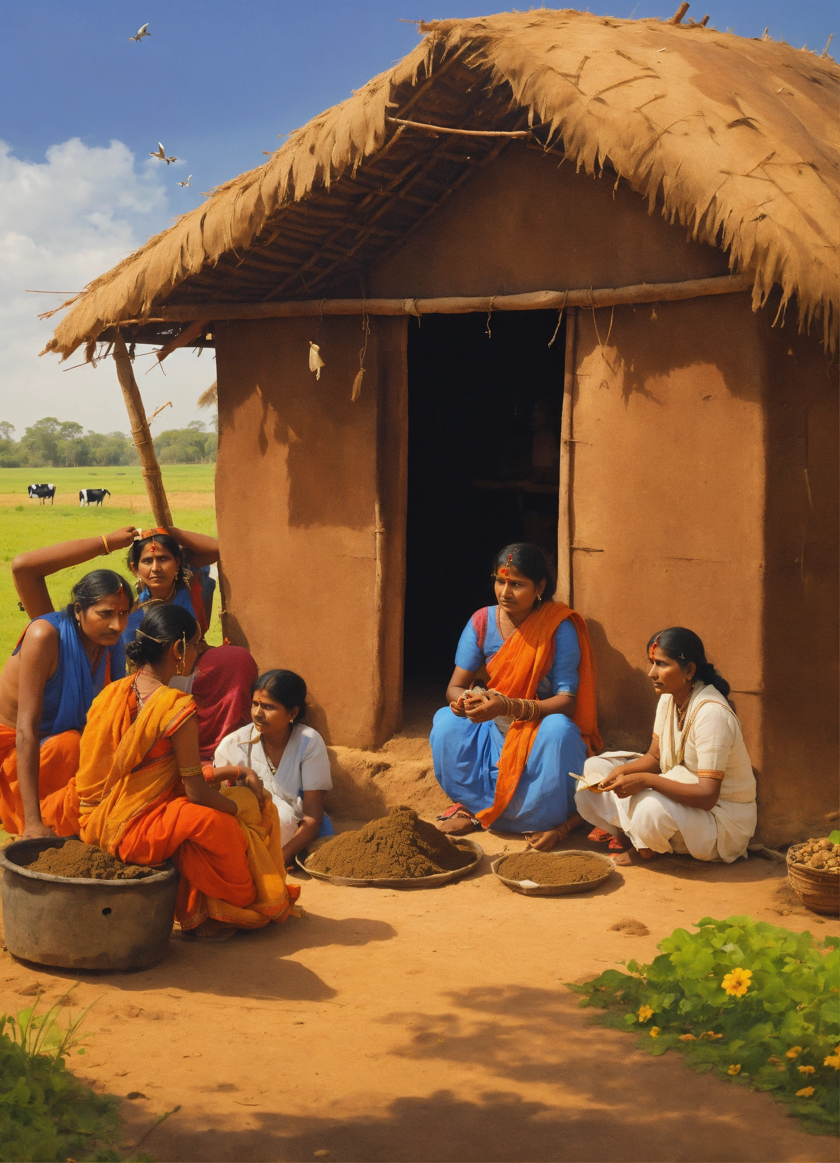 An ancient indian family, living in a small hut, surrounded by cows and fields, building a hut with cow dung