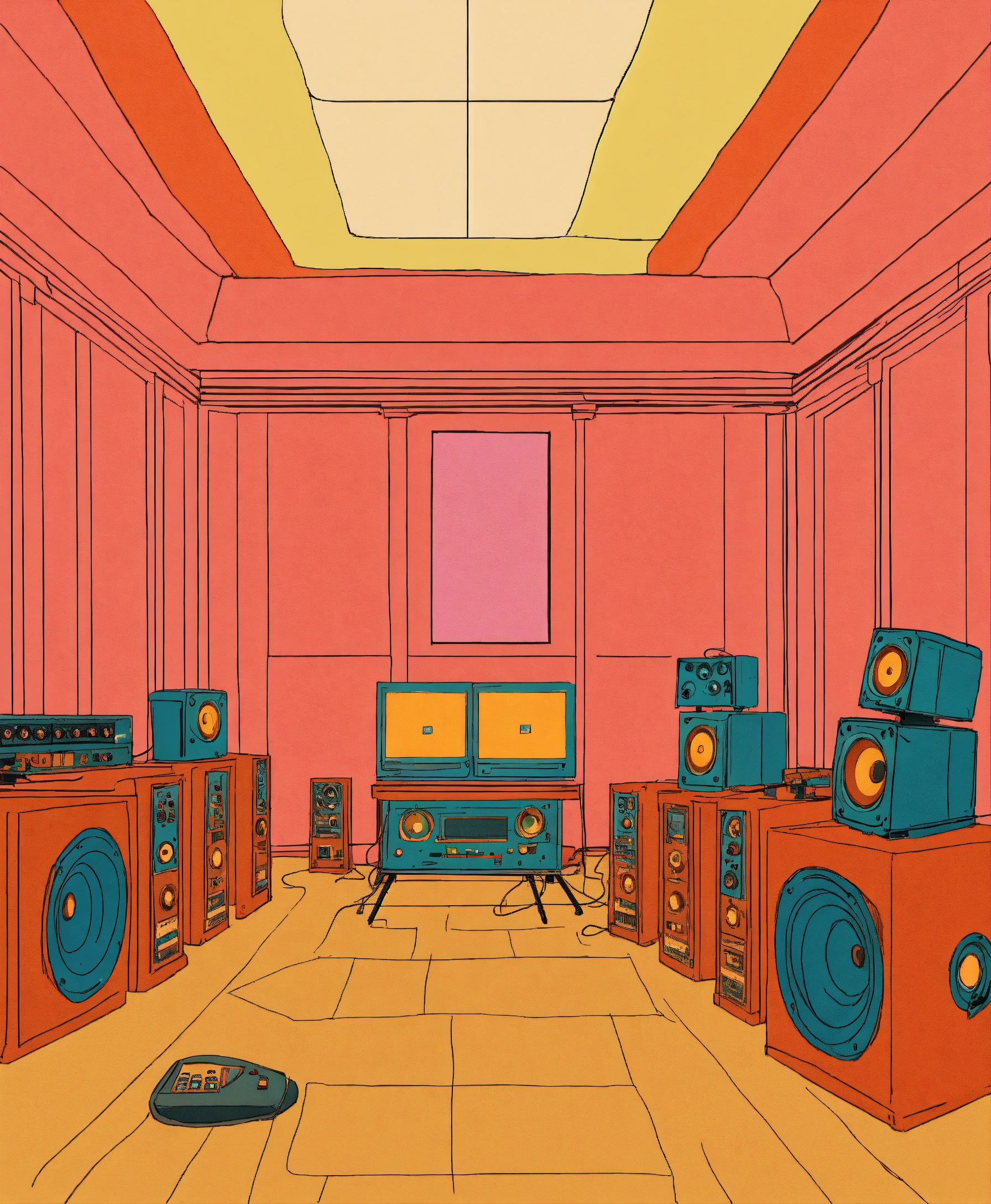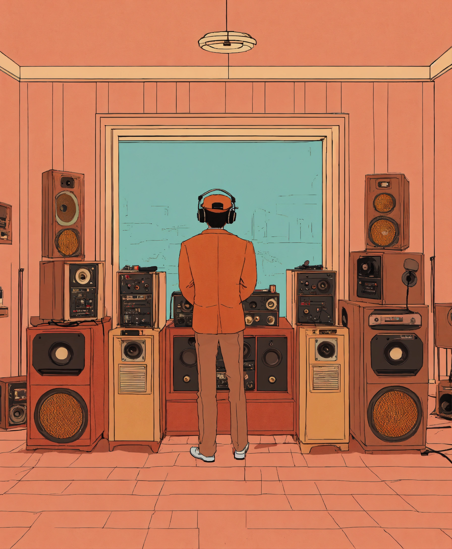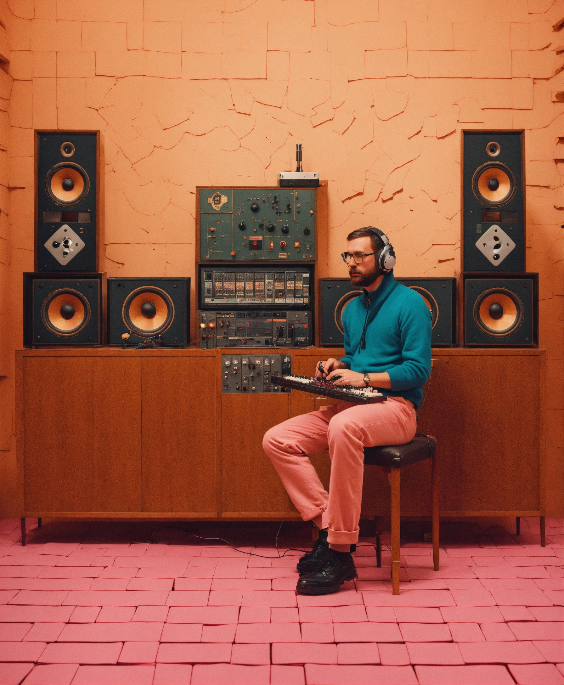 Generate an image of wes anderson style artwork of a producer creating music with large speakers in a room