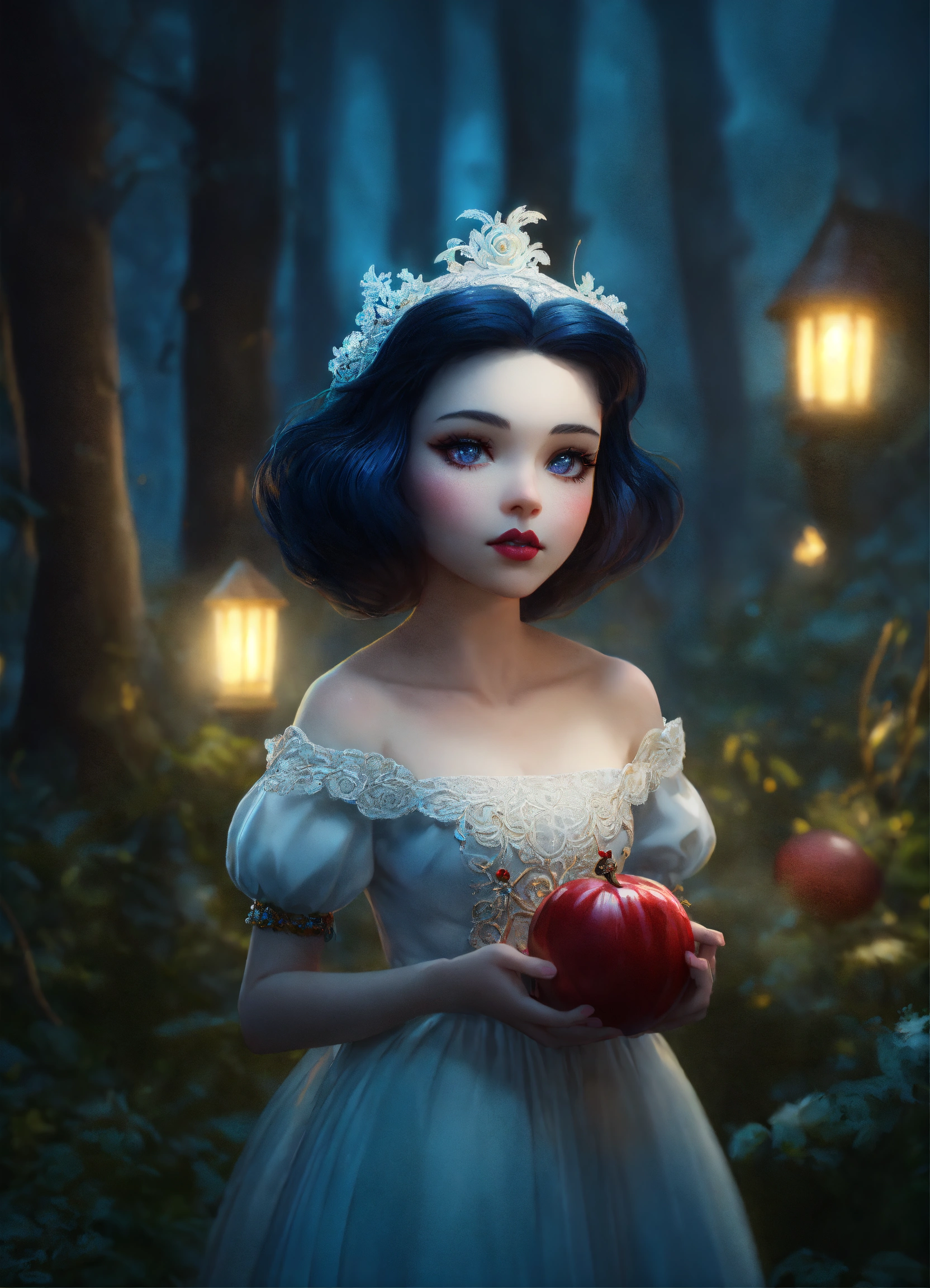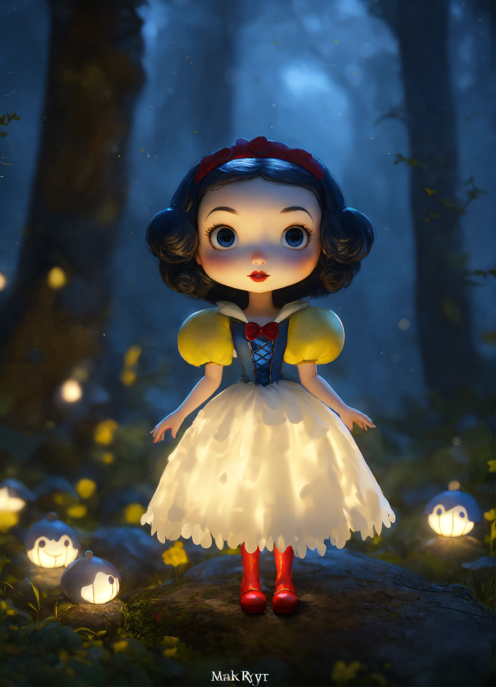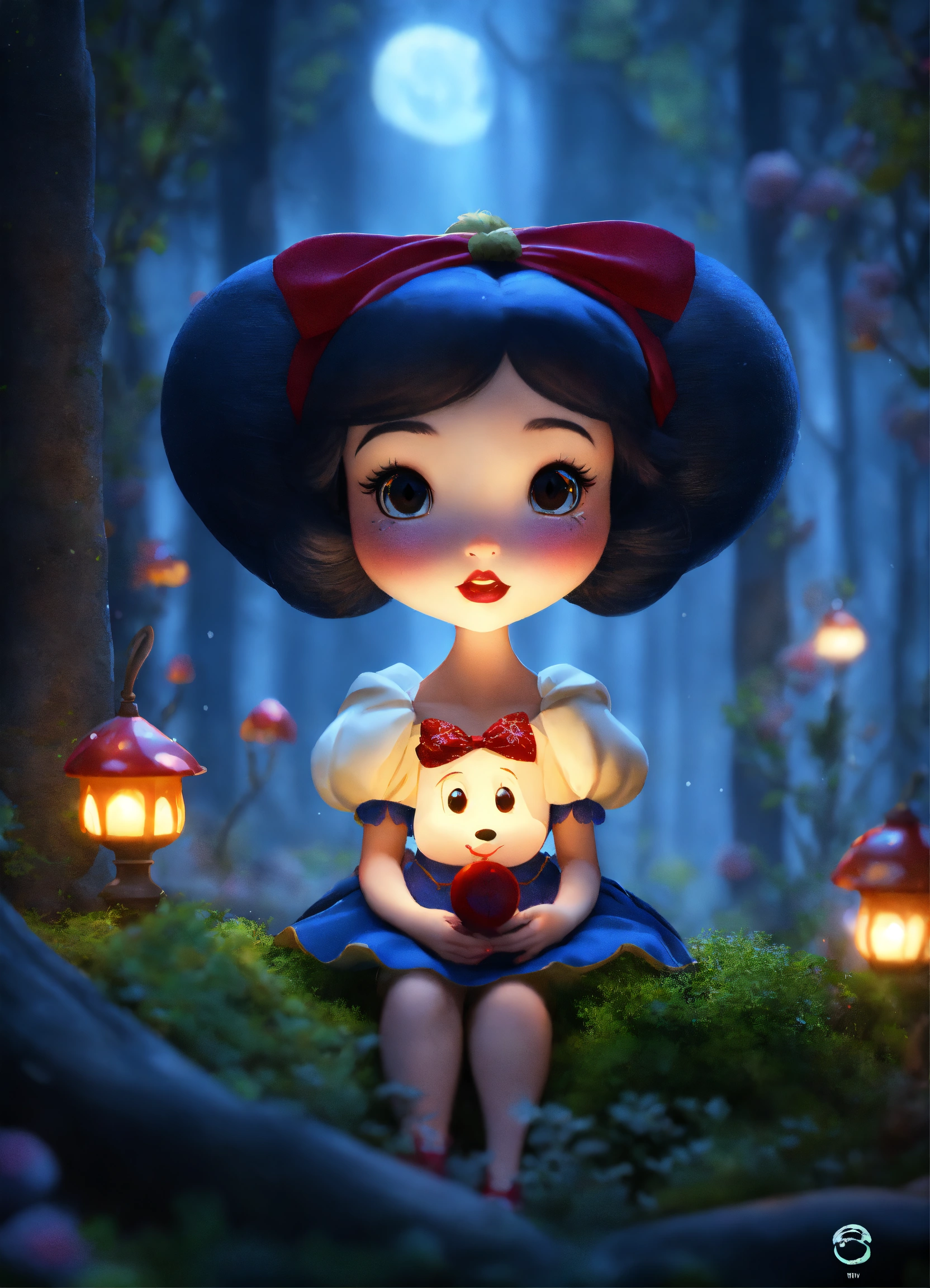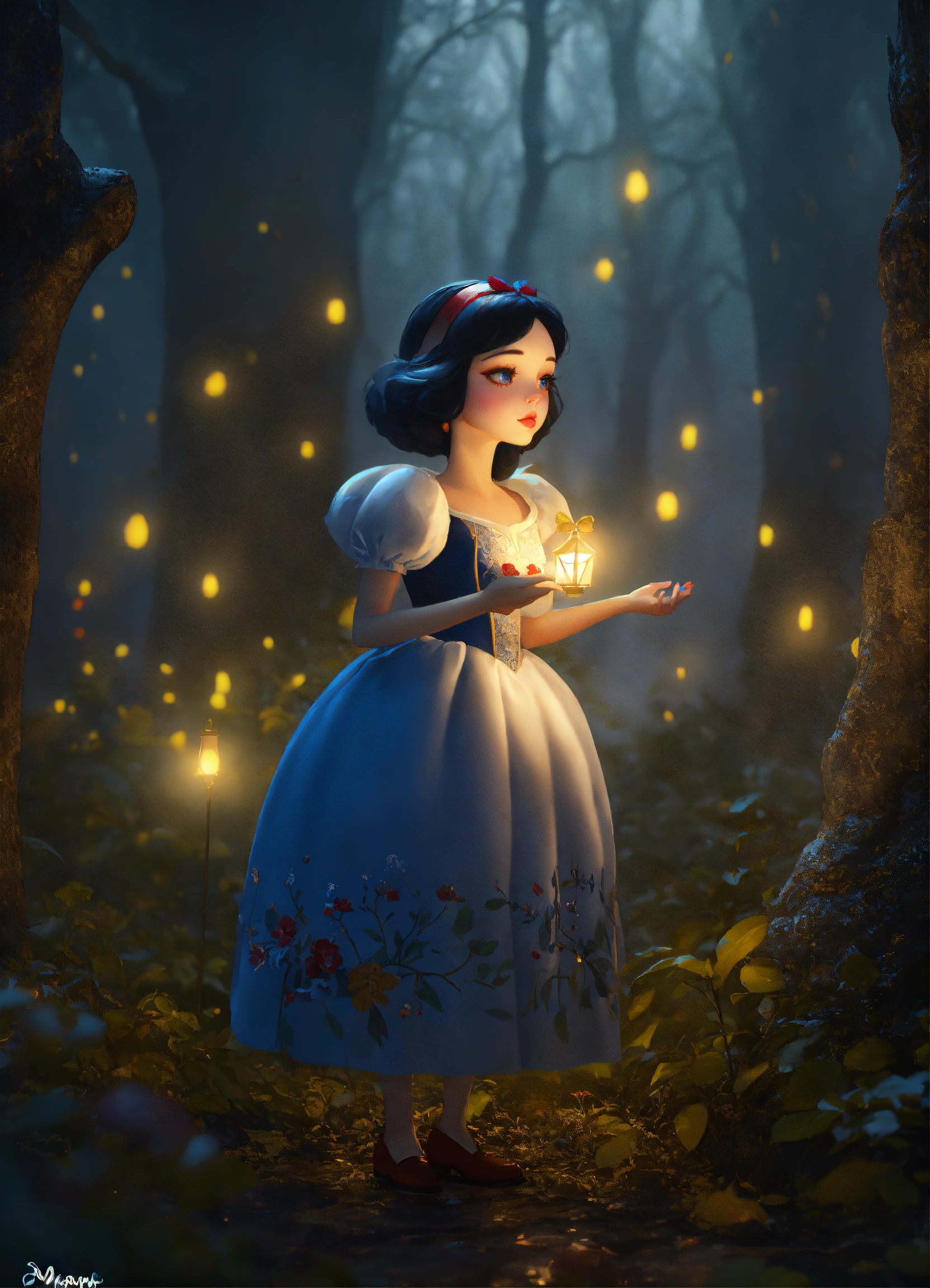 Disney little snow white white painted face, magical forest, foggy weather, night light, intricate, sharf focus, concept art, artstation, fantasy art, octane render, cinematic lighting, otherworldy by mark ryden