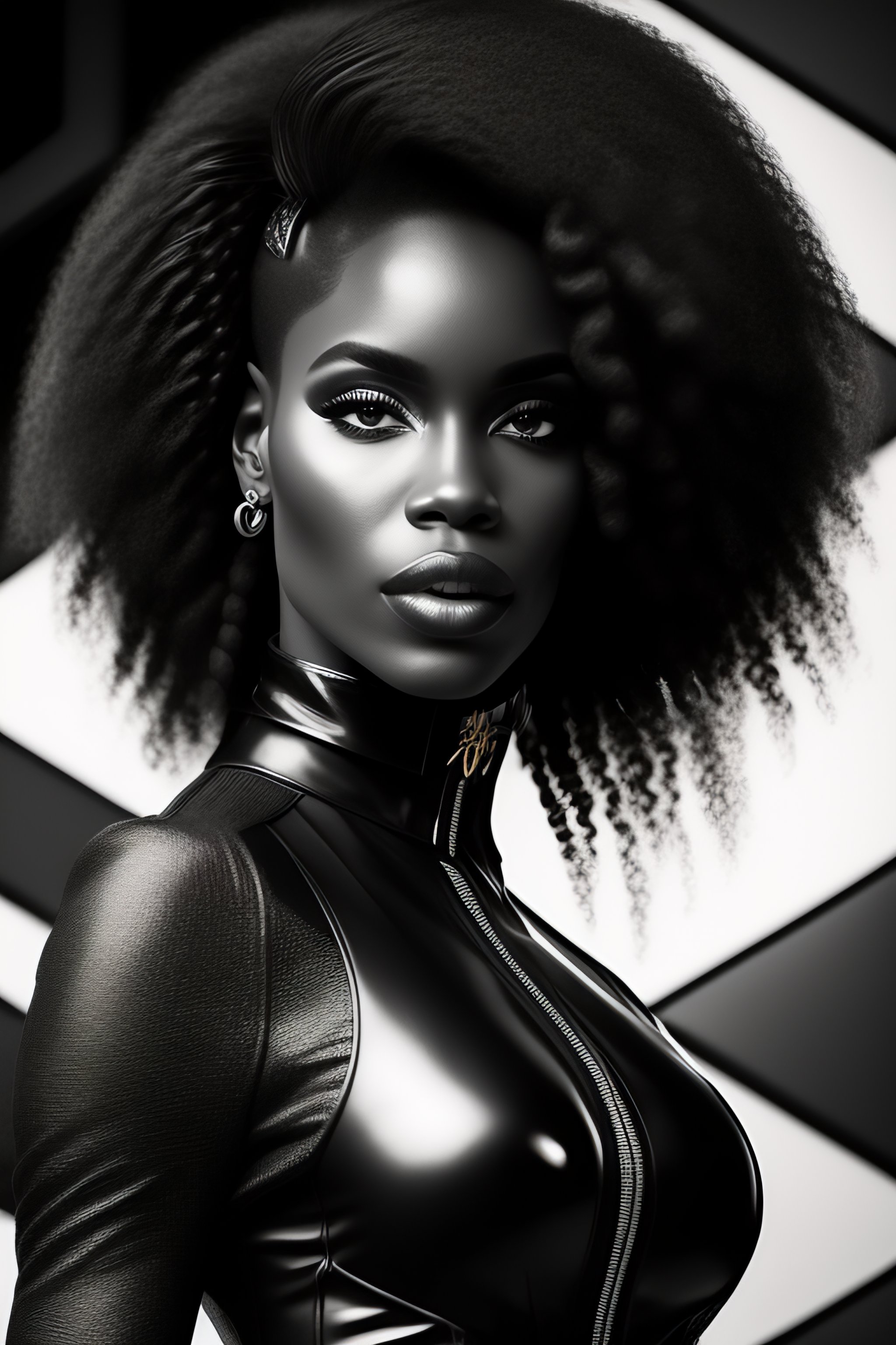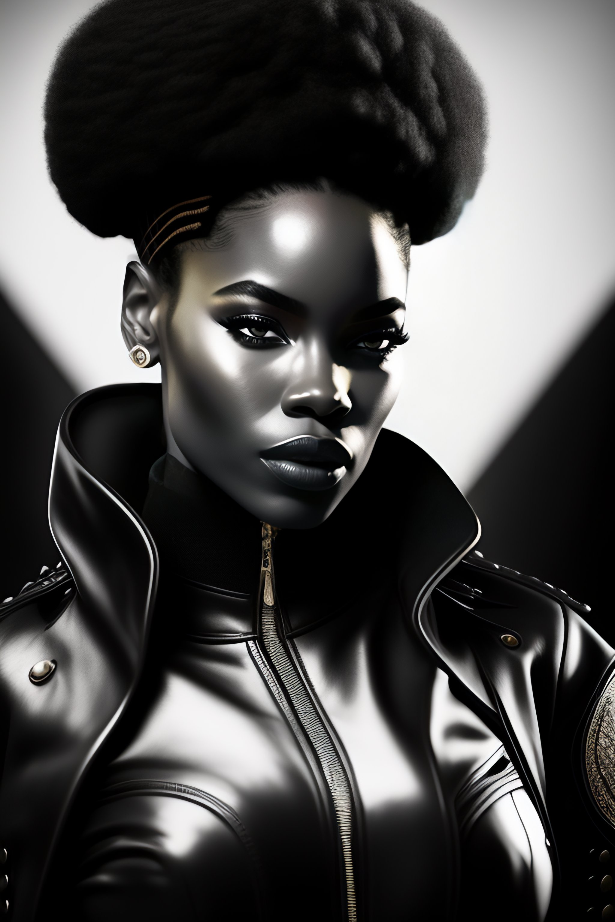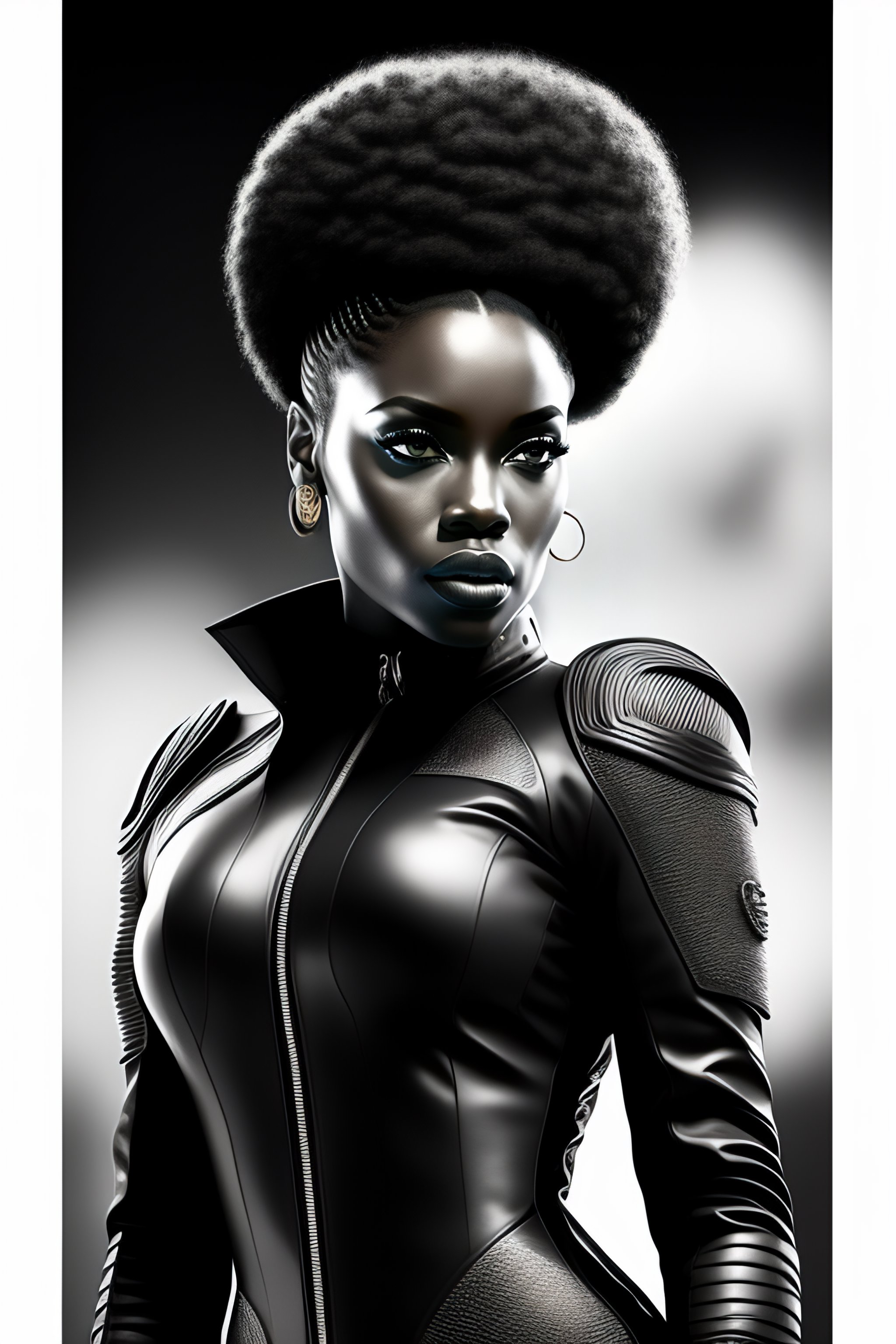 Black woman afro black panther party, leather suit, mercenary, retro cover, high details, intricate details 60s, inking, realistic, photo, black and white