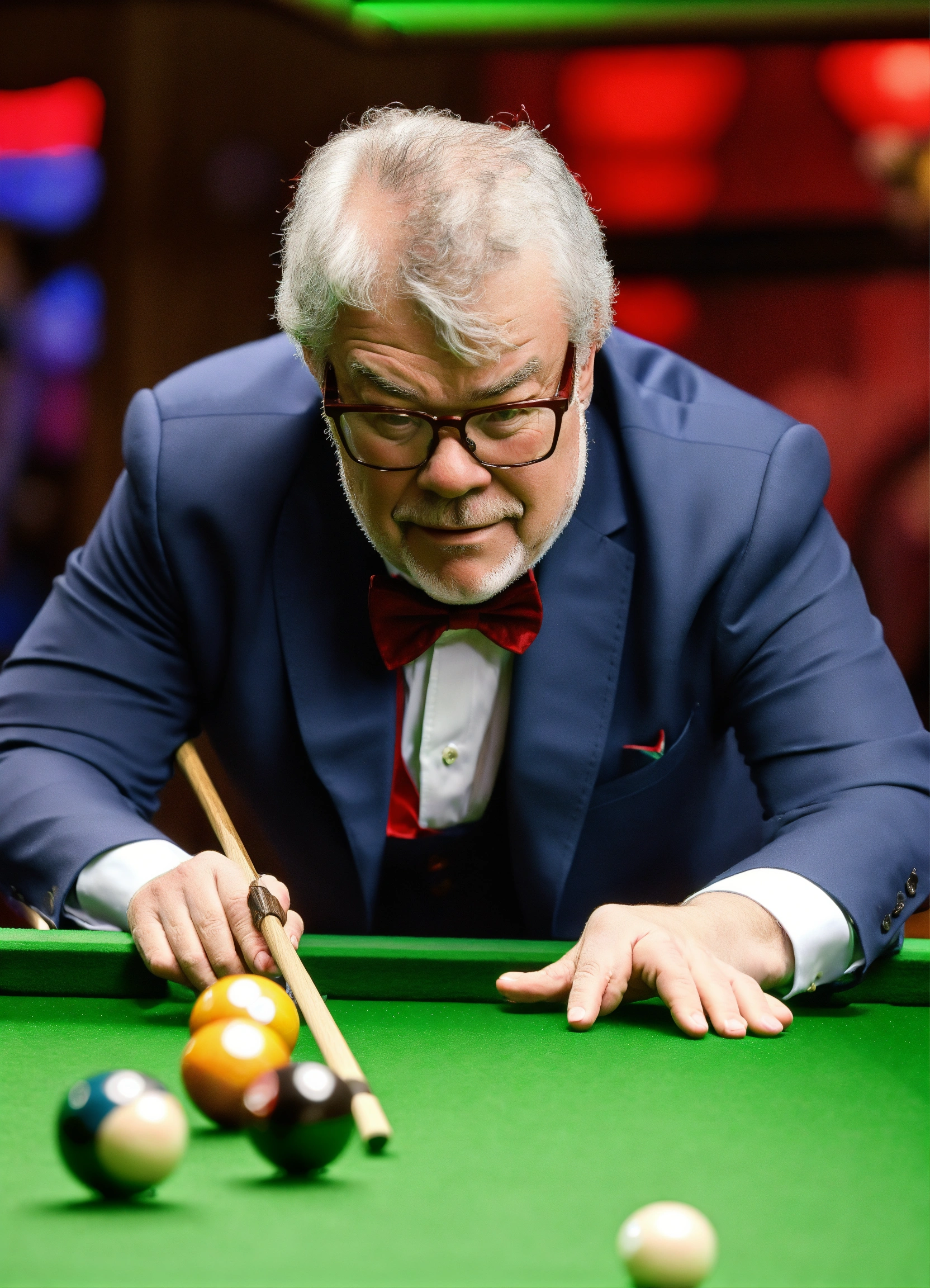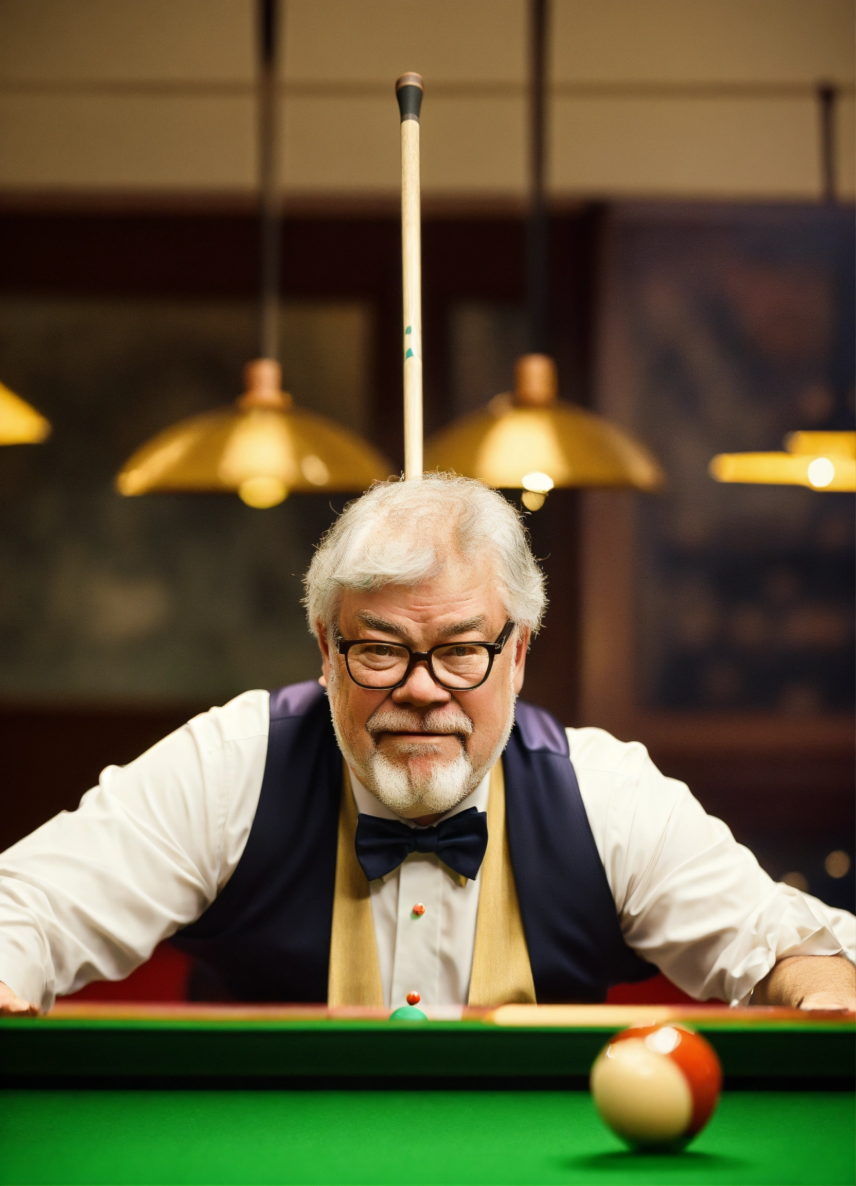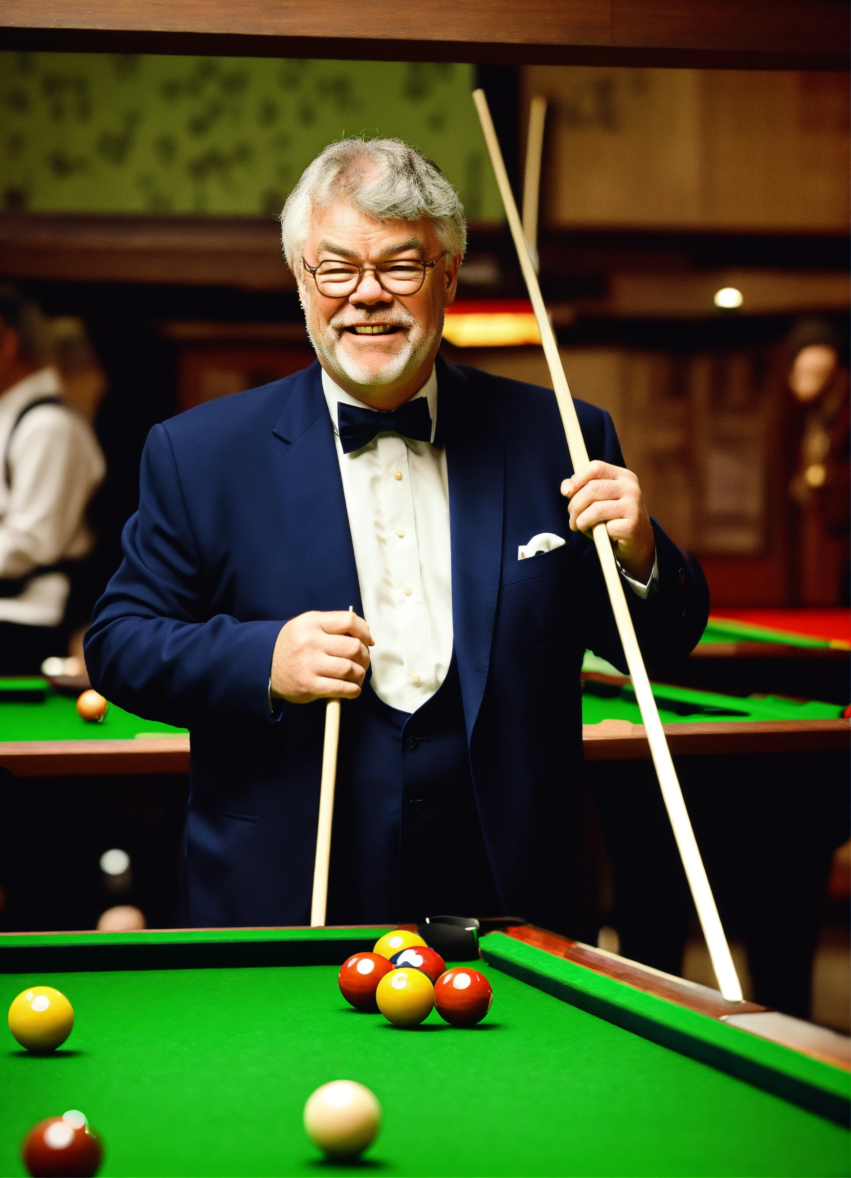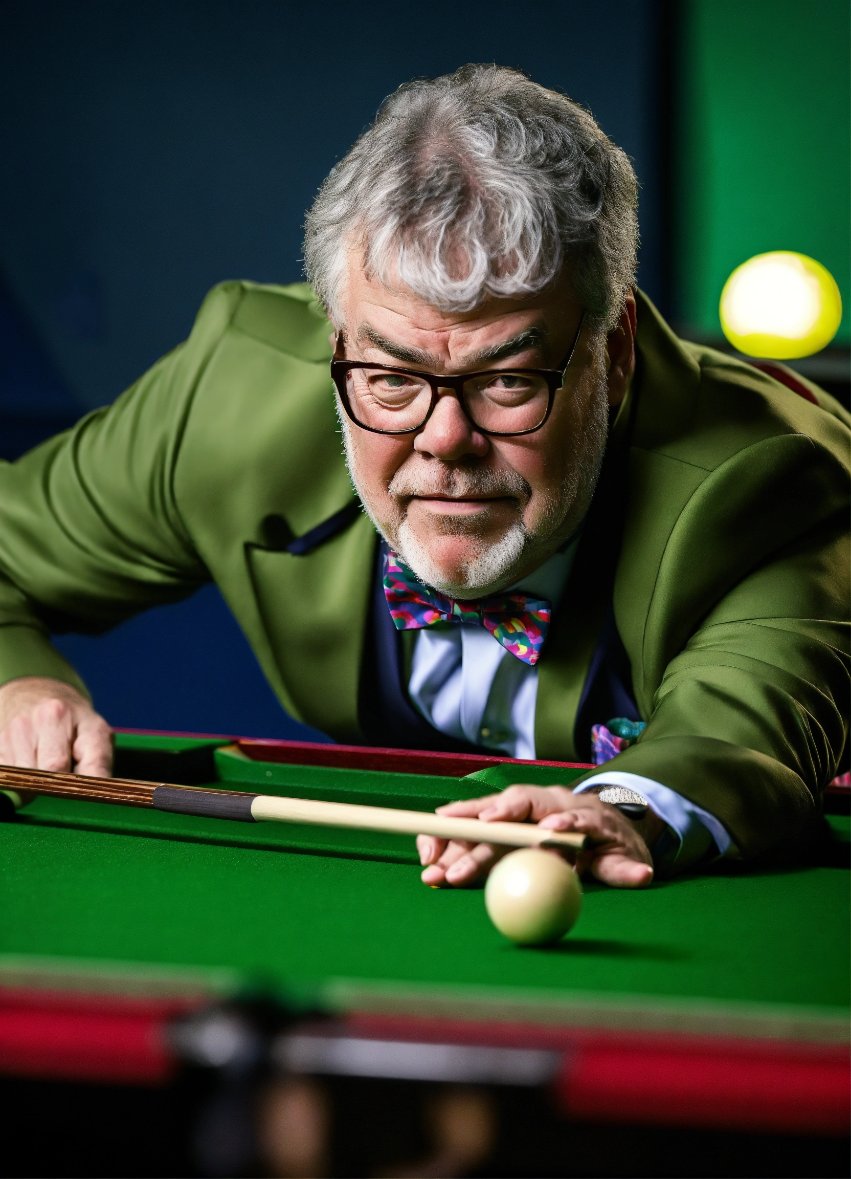 Matthew kelly wearing glasses upside down, oversized bow tie, playing snooker with a tiny snooker cue