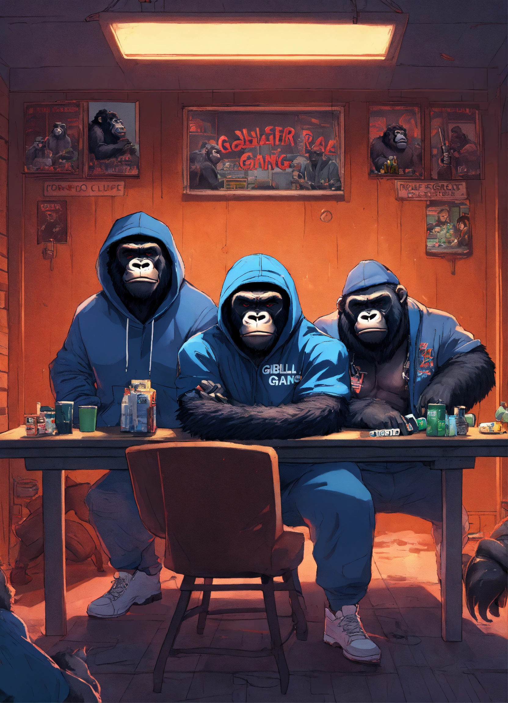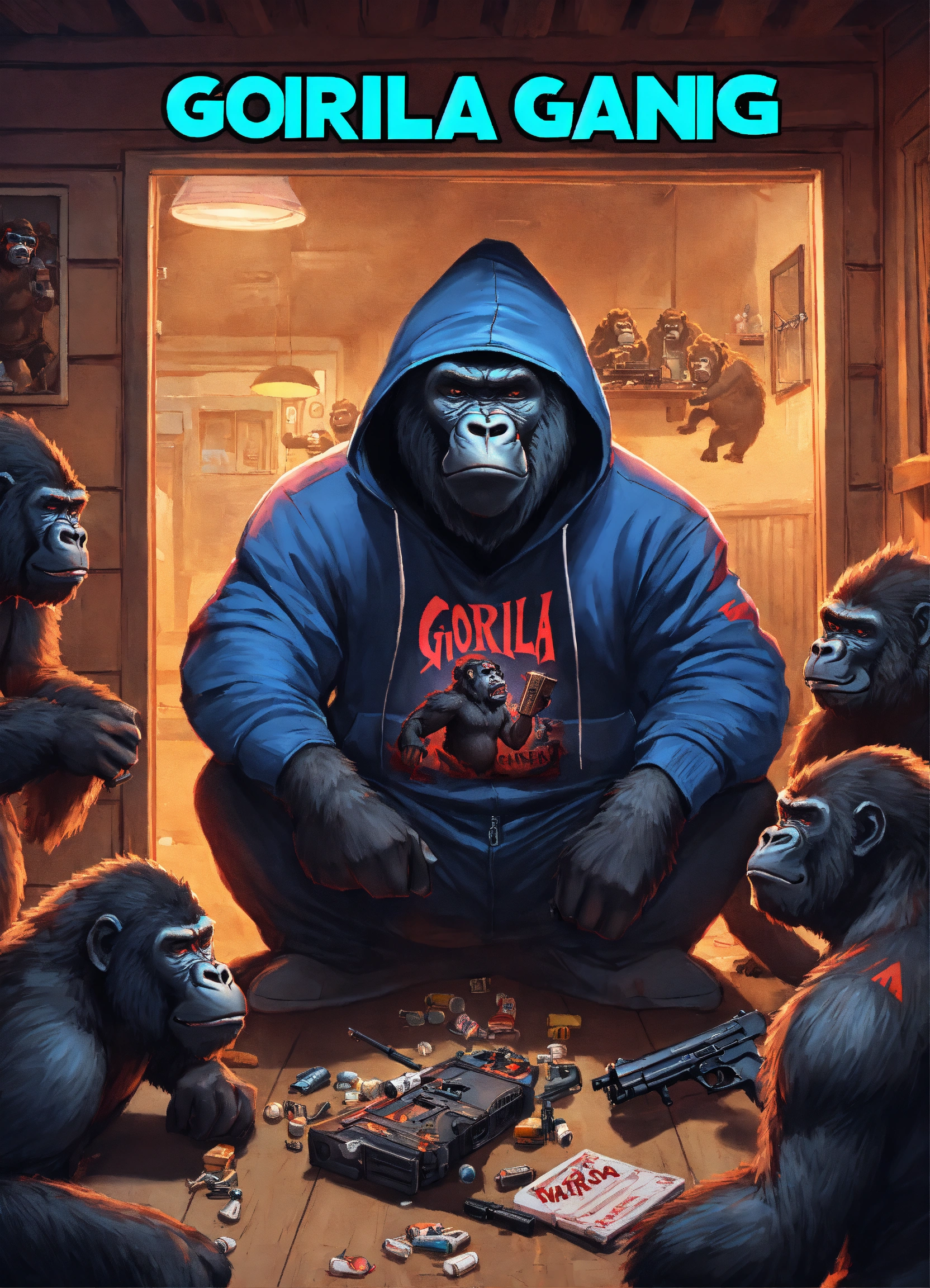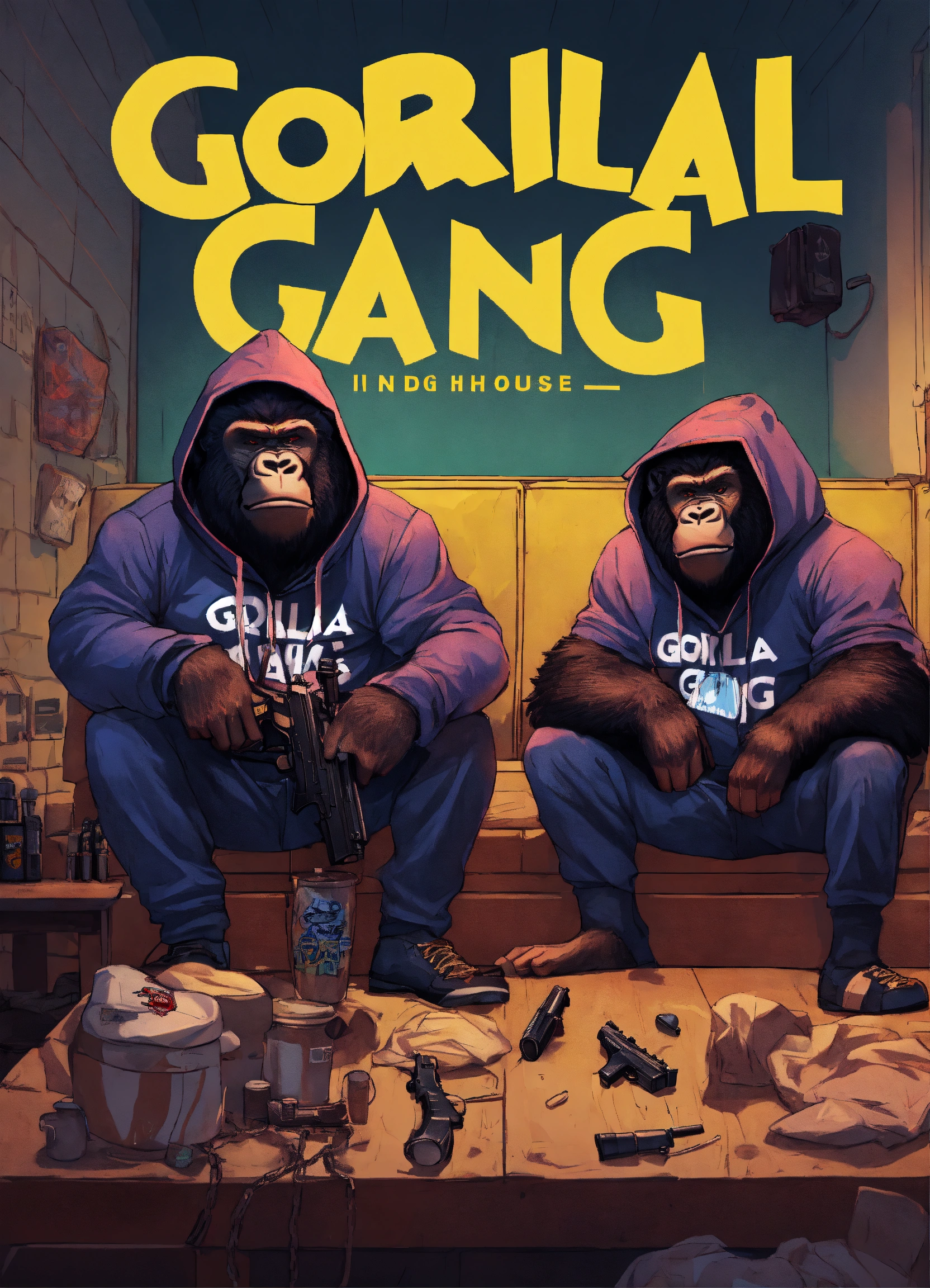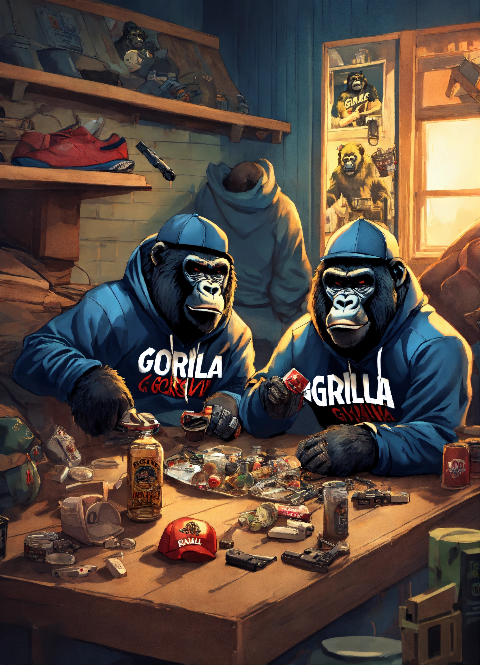 Gangster gorillas wearing baseball caps and hoodie with the words gorilla gang sitting inside of a trap house in the hood with angry looks with guns in there hands and tables