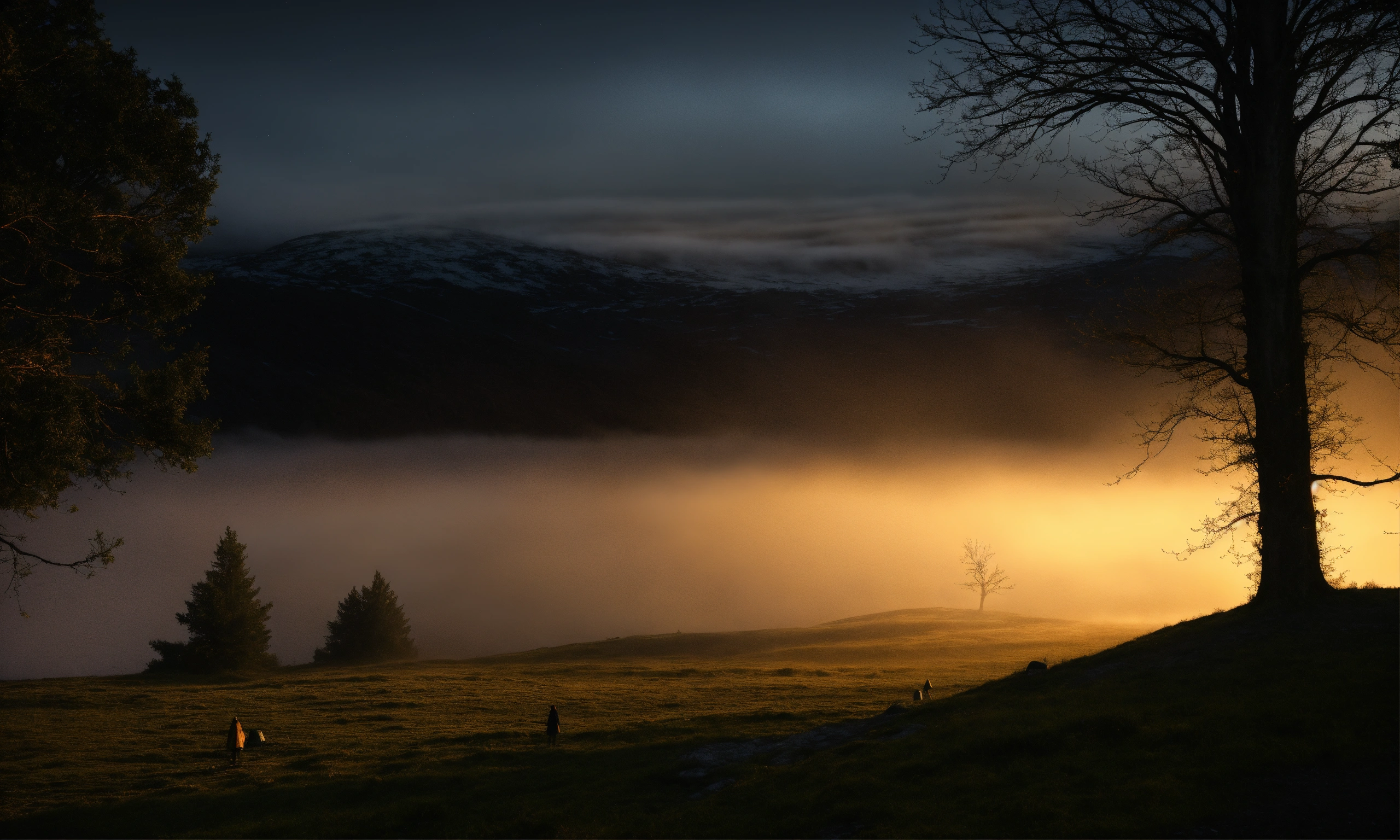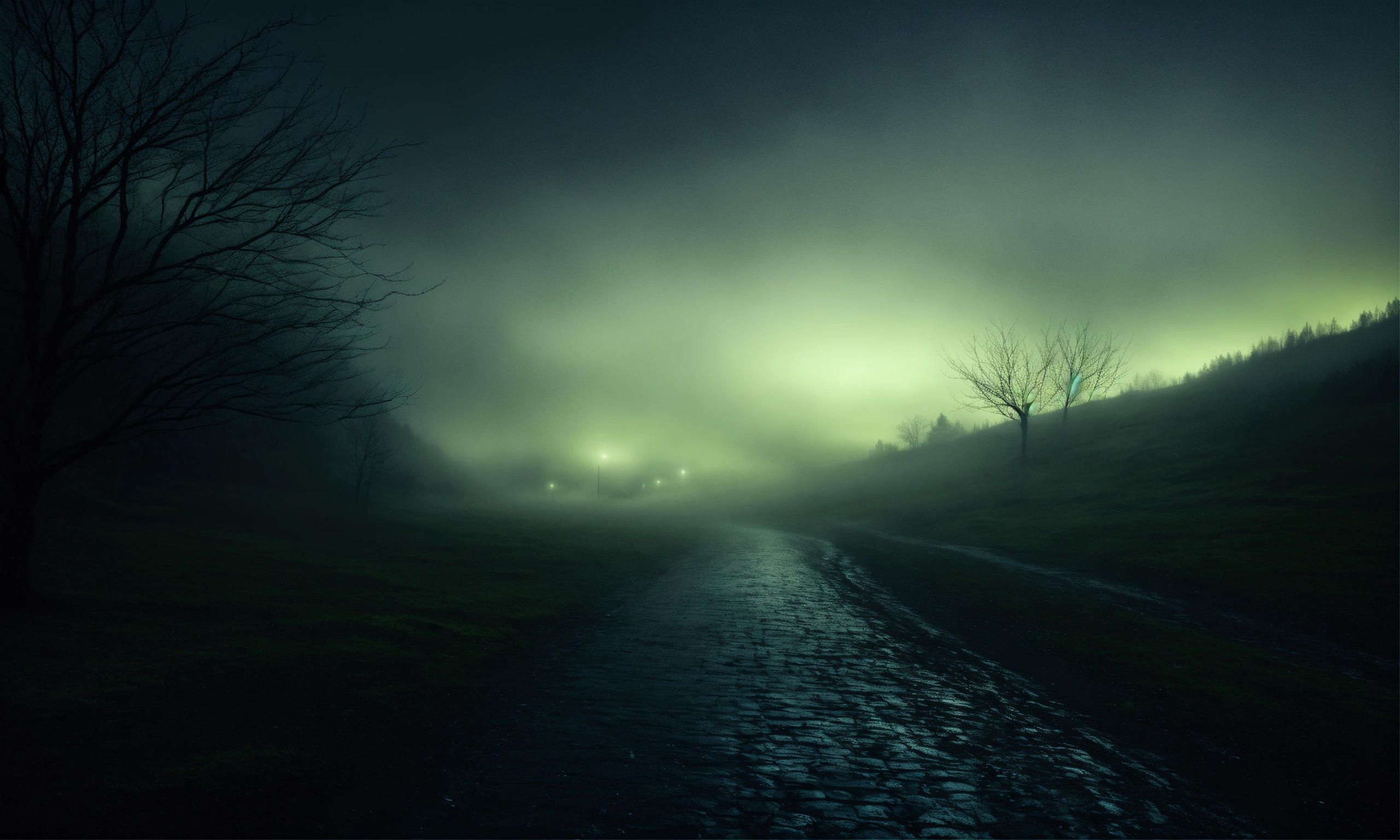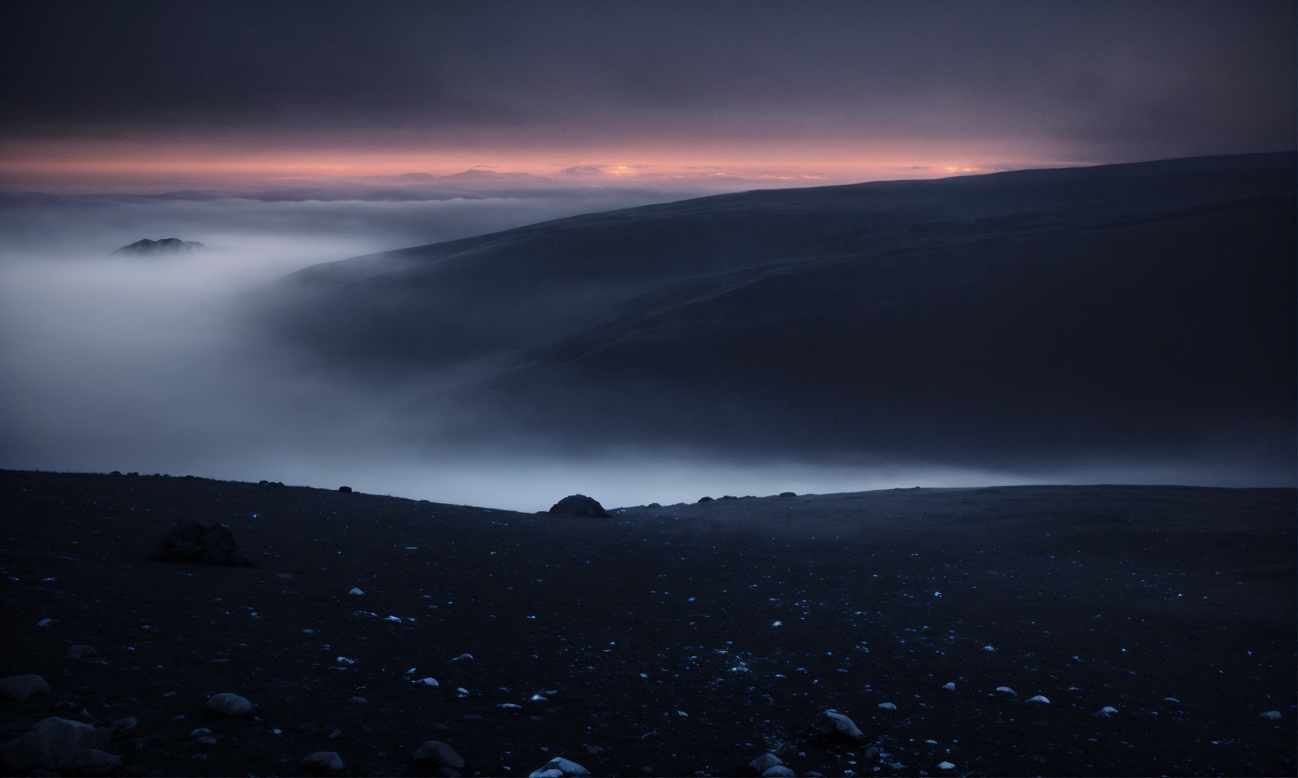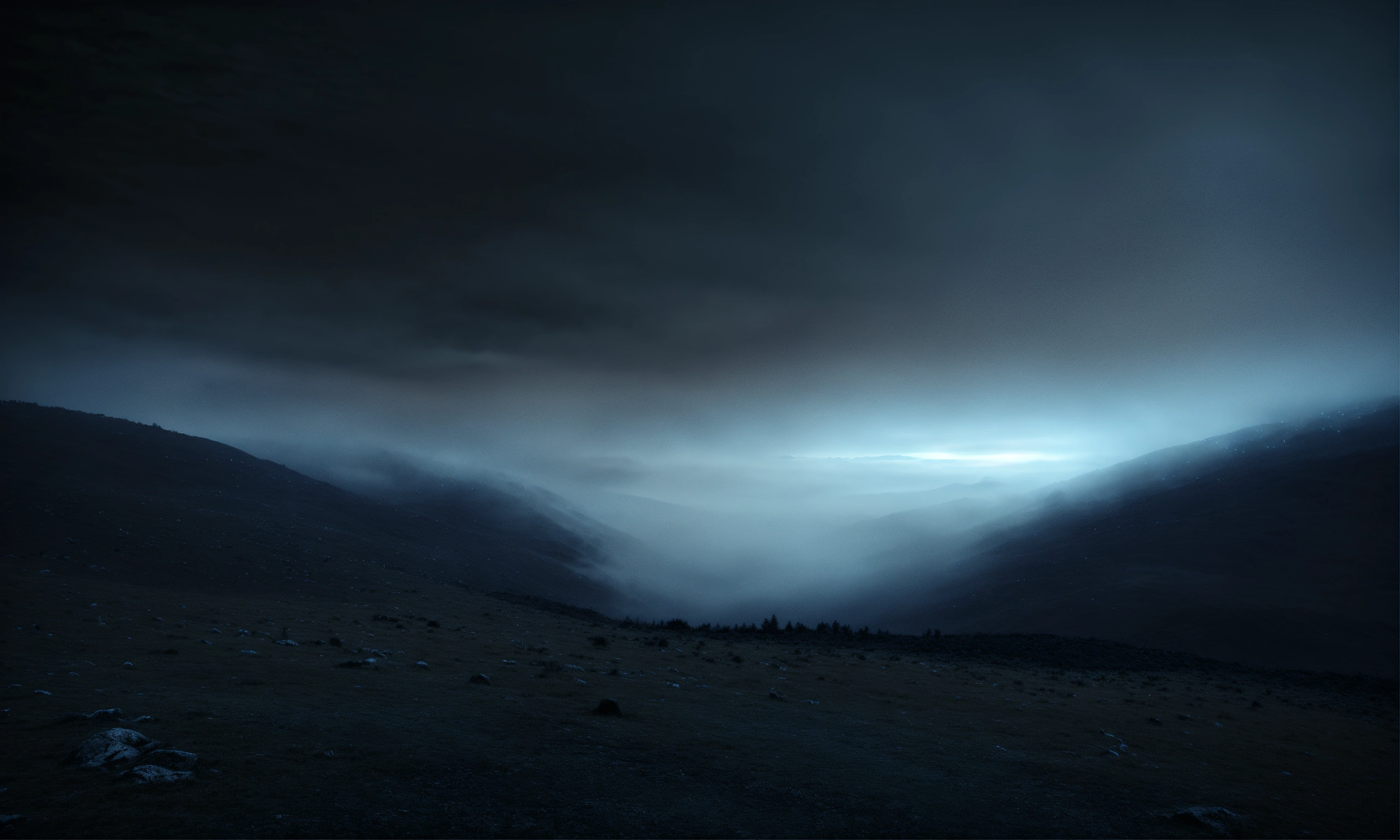 Linux hacker background image, very dark, linux desktop image, mesmerizing dark landscape, fog, barely any light