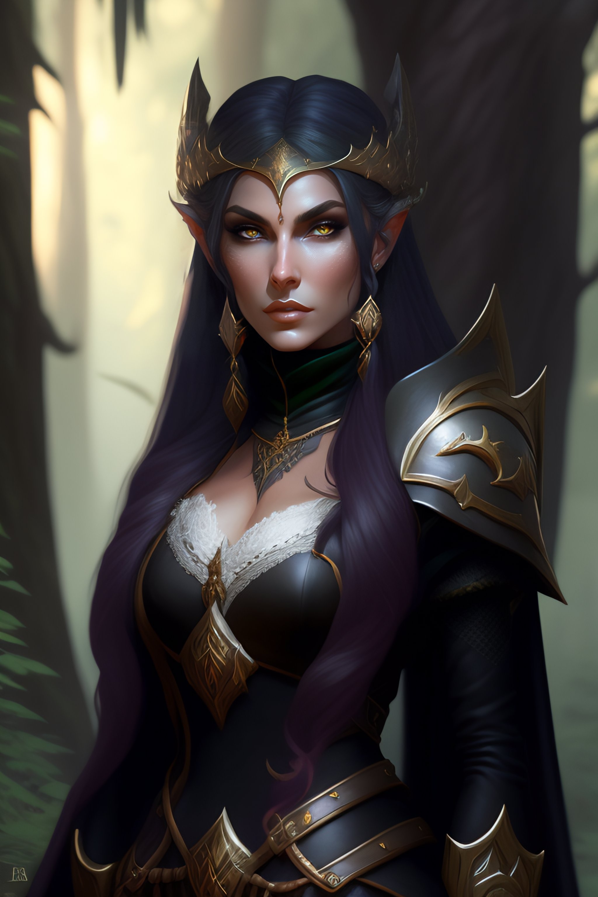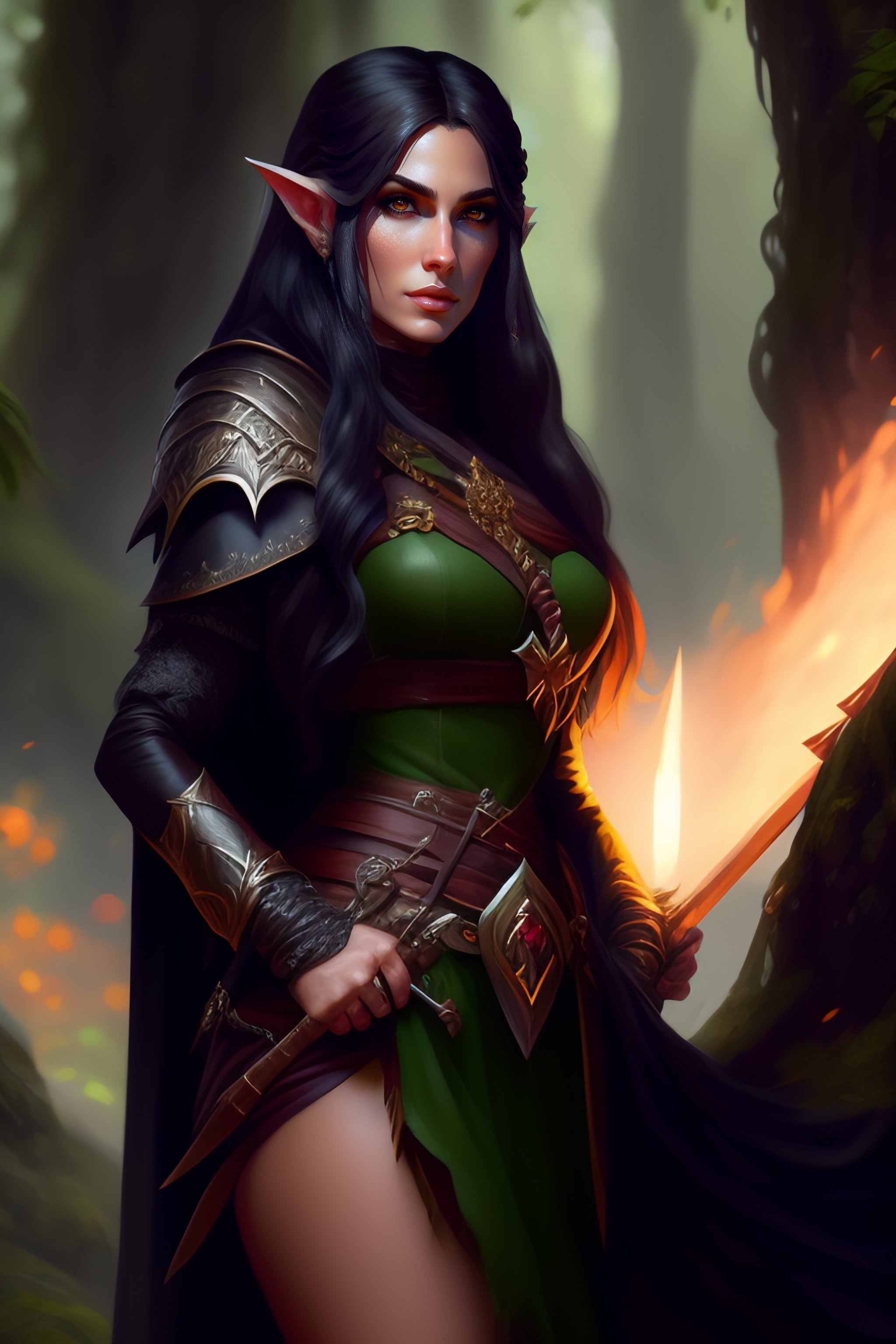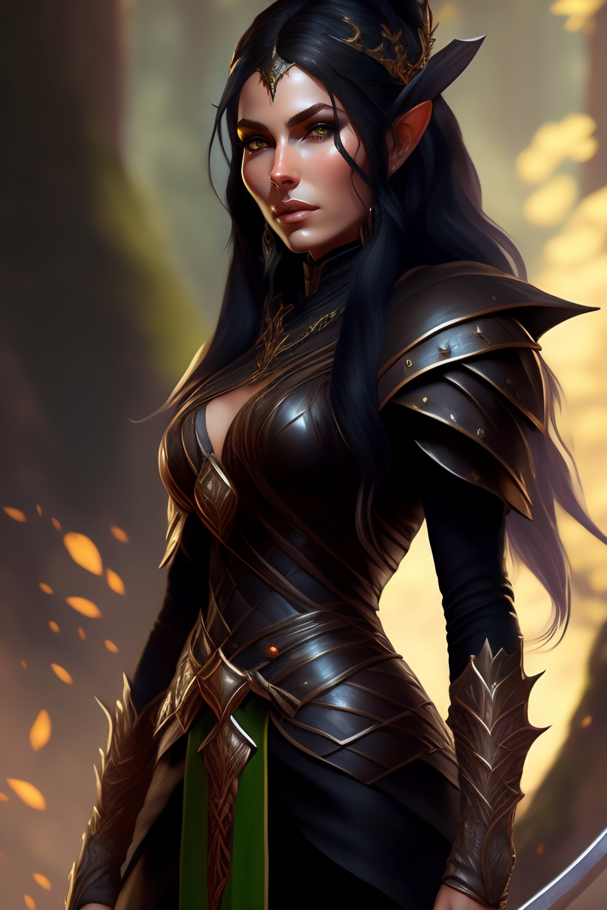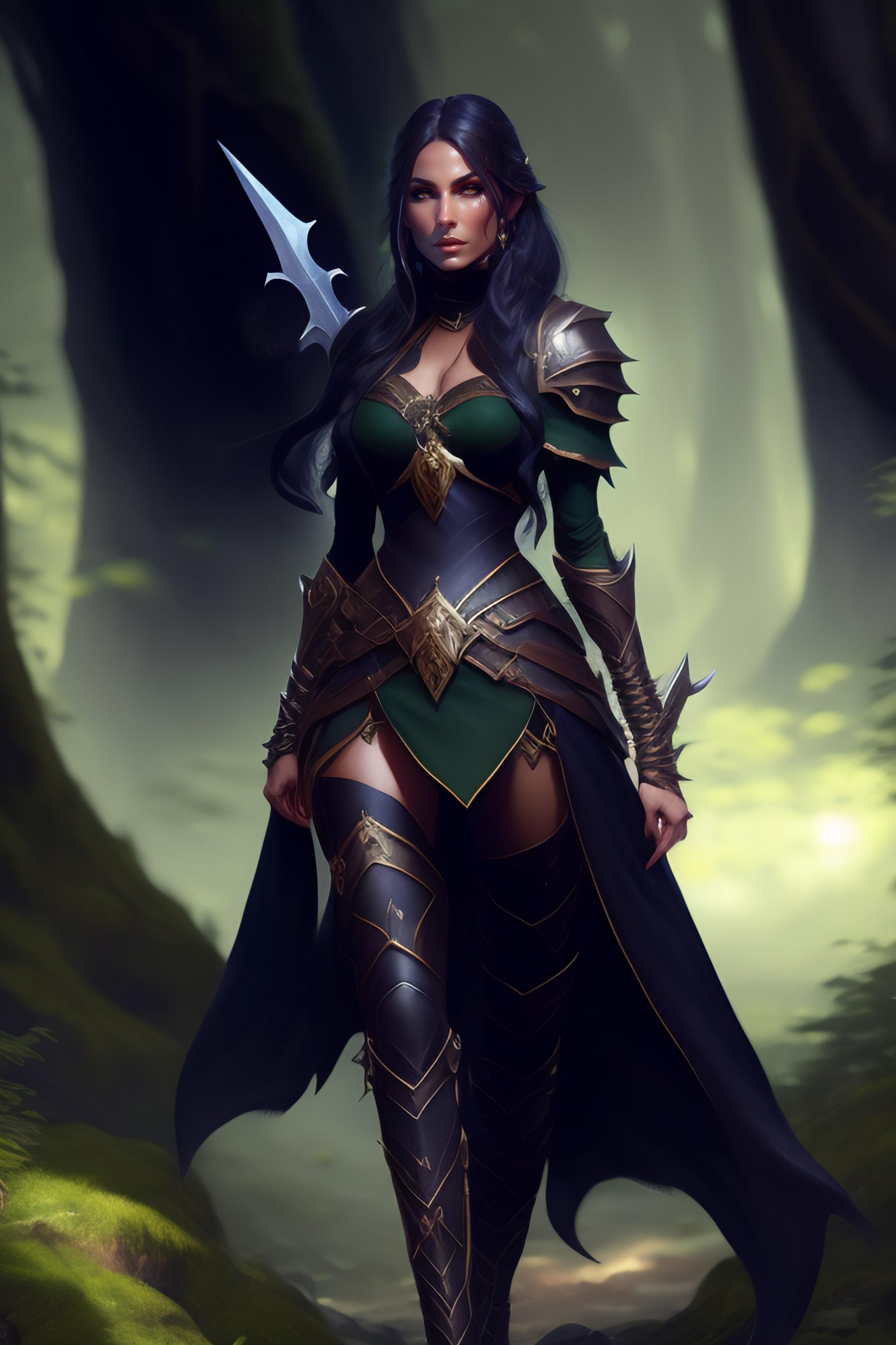 Rogue, elf female, black clothes, sword in hand, full body, forest, d&d, fantasy, intricate, elegant, highly detailed, digital painting, artstation, octane render, concept art, matte, sharp focus, illustration, hearthstone, art by artgerm and greg rutkowski and alphonse mucha