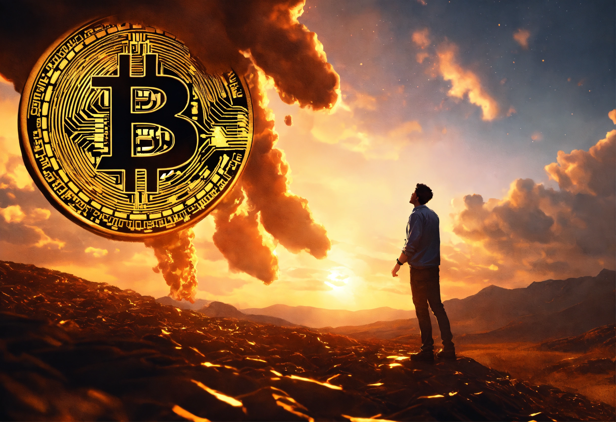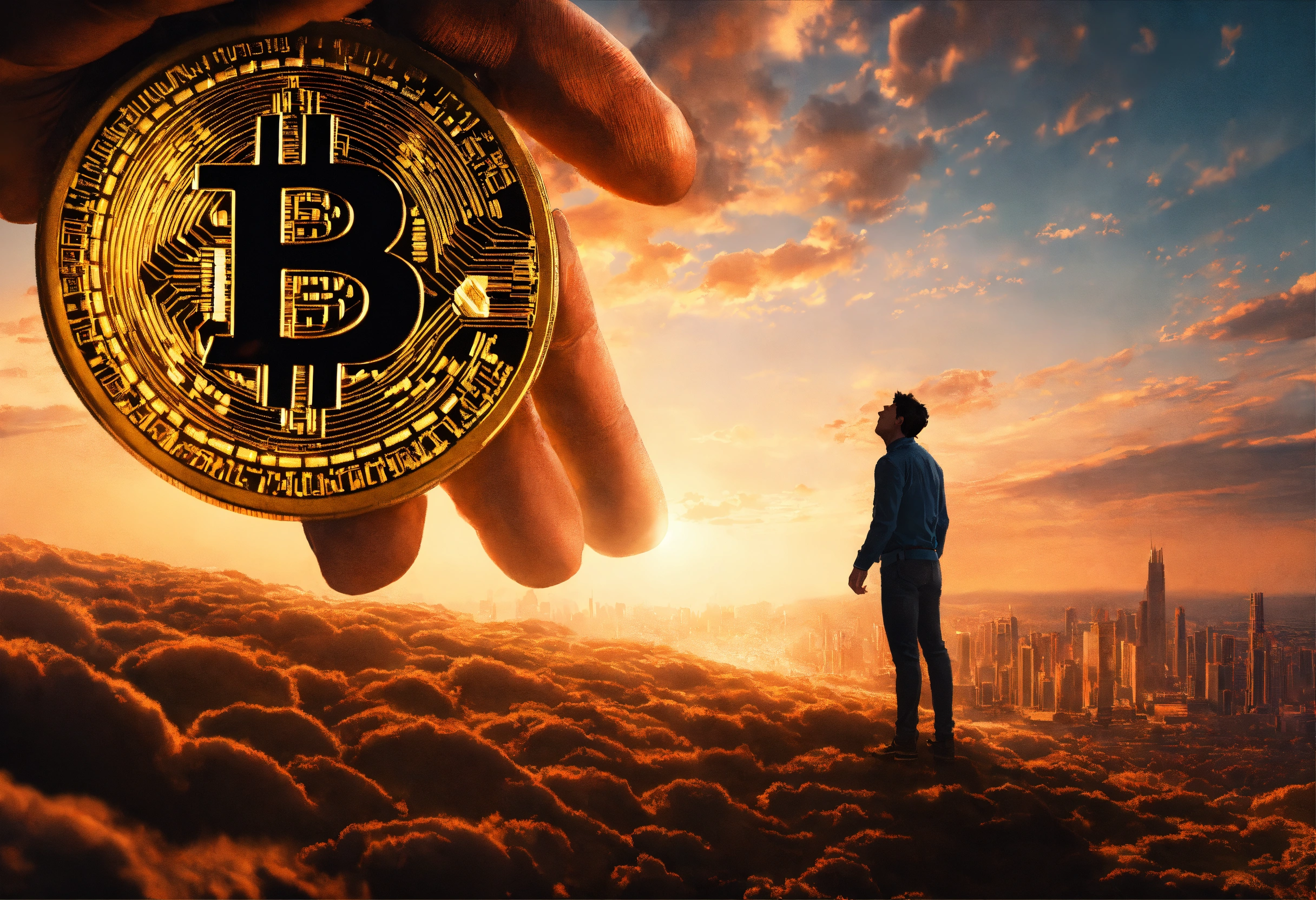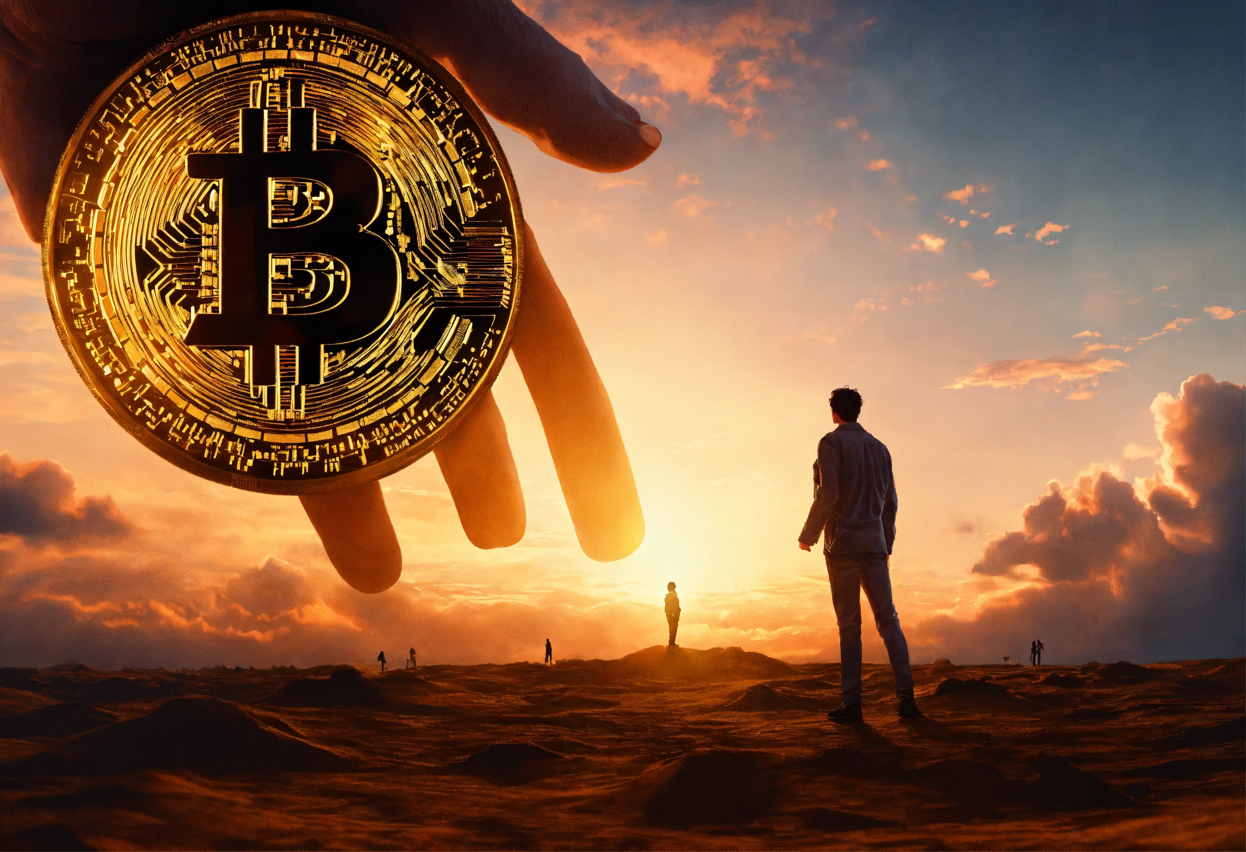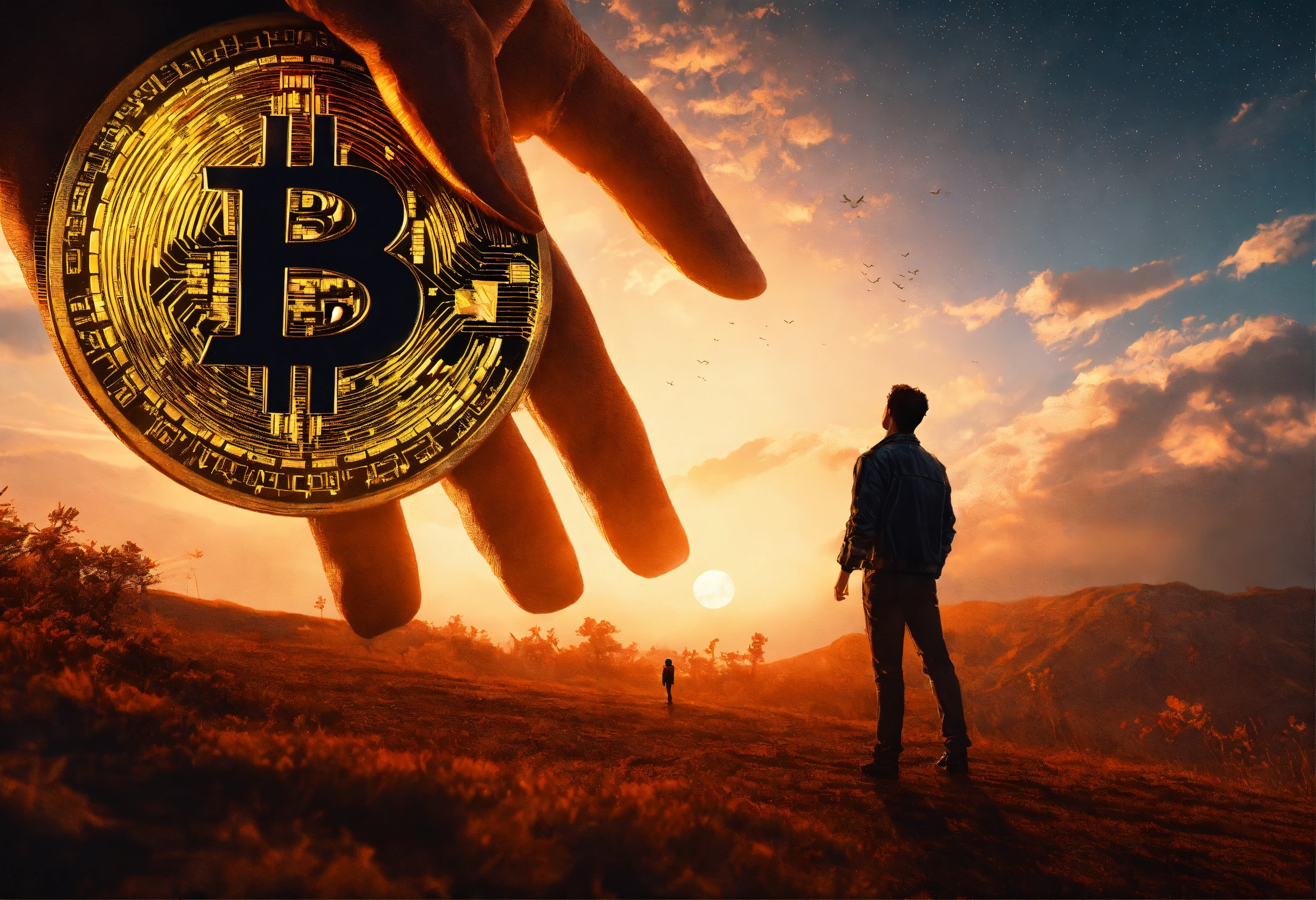 Man standing and looking at the sky from the ground, a giant human hand is about to grab the giant bitcoin from behind in the sky, photorealistic, outlined silhouettes, dramatic lighting, highly detailed, incredible quality, trending on artstation, masterpiece, 8k, futuristic