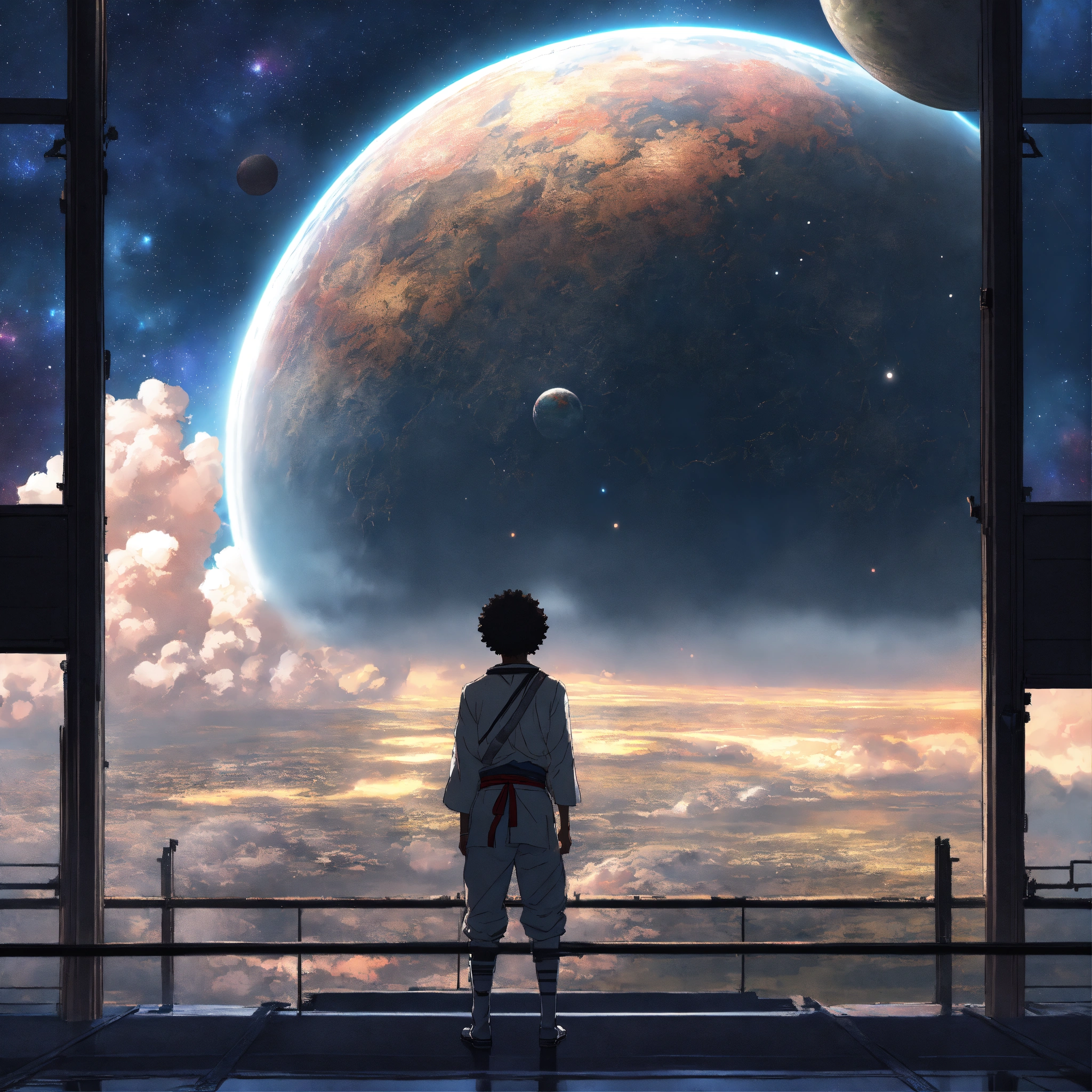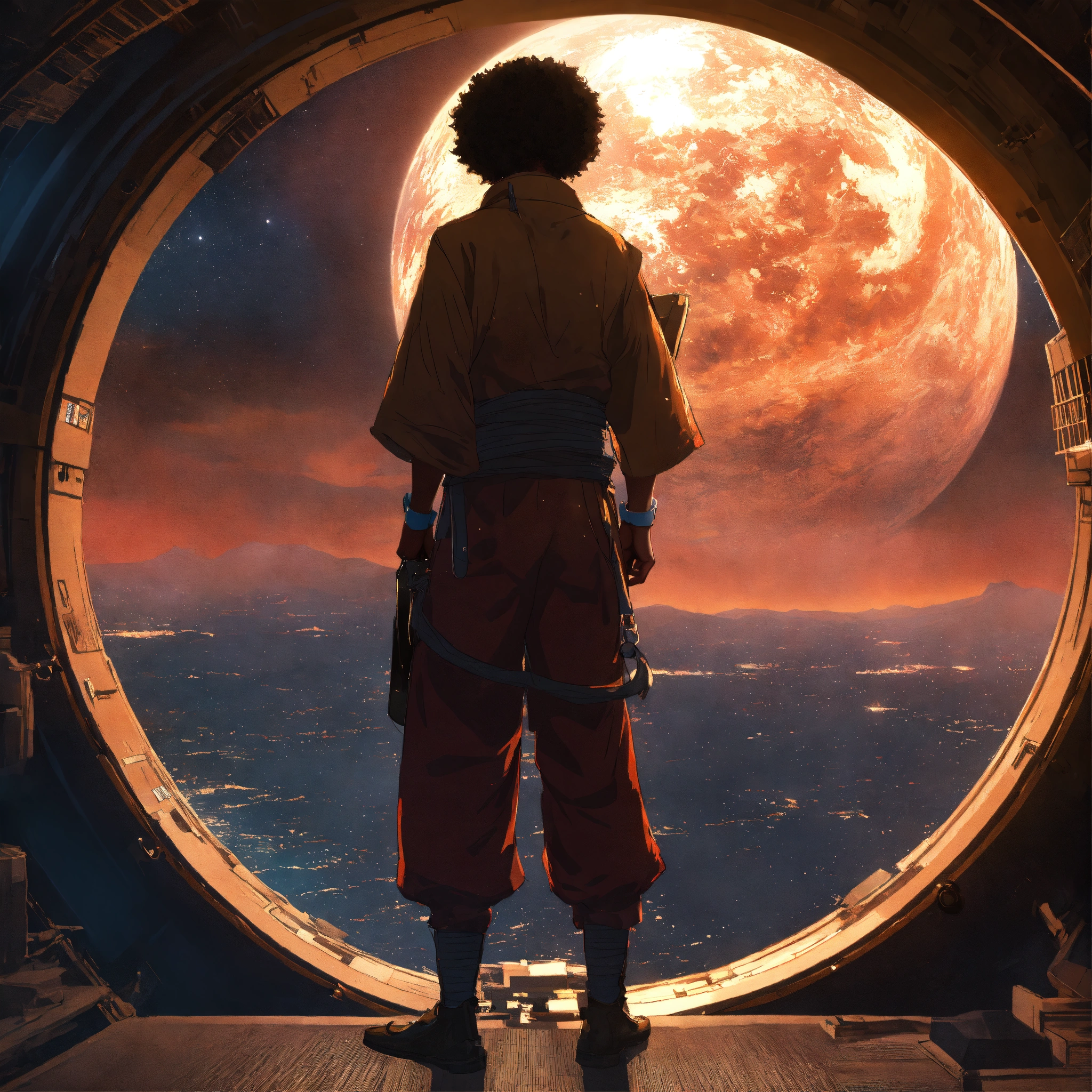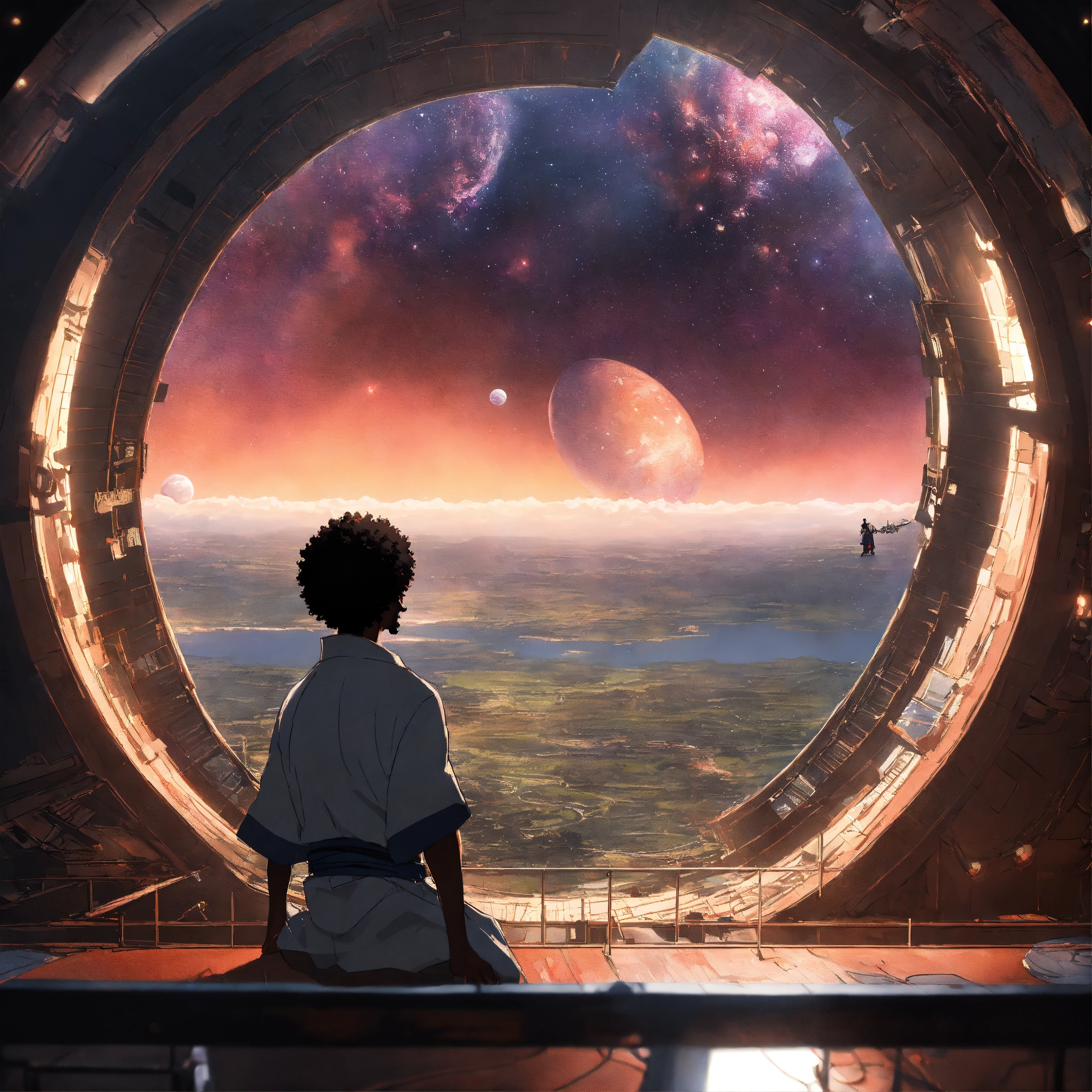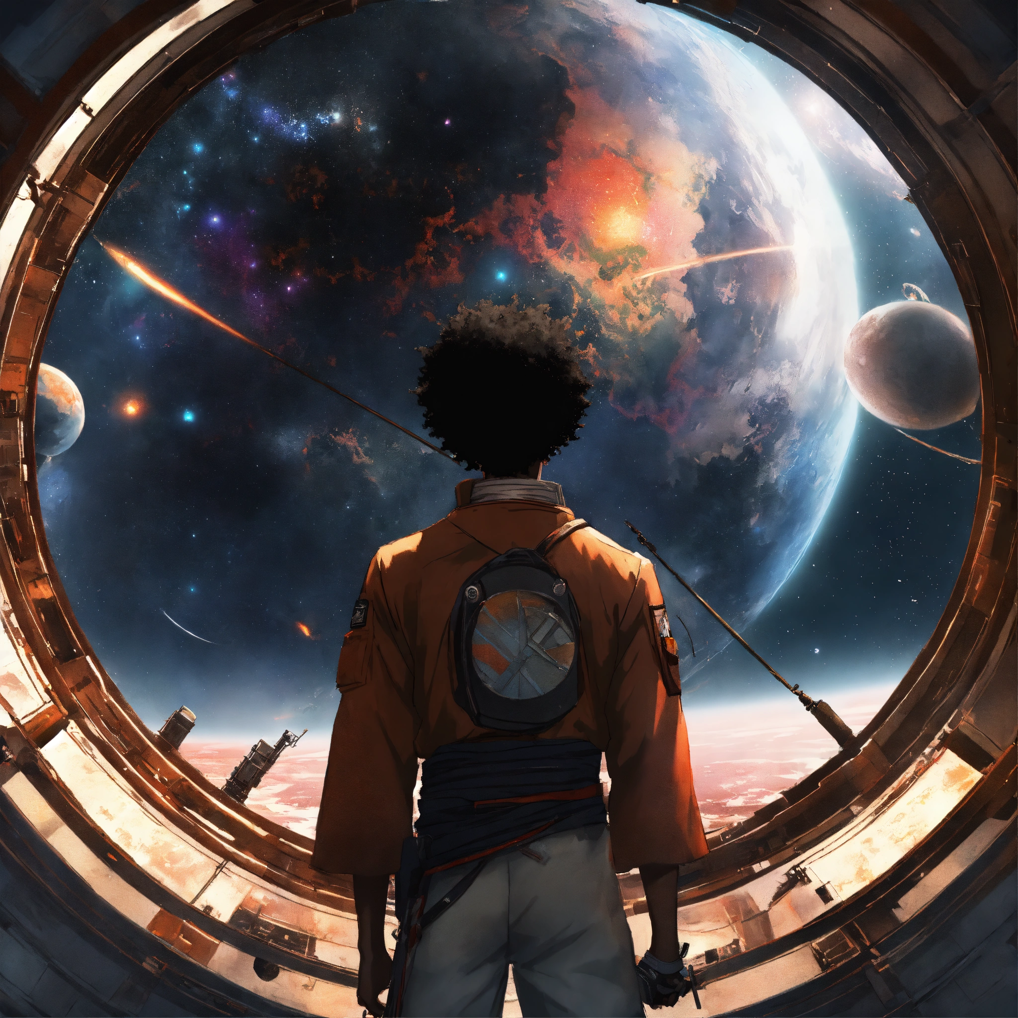 Afro samurai anime, man looking outside firmament dome into outerspace, wlop, concept art, japanese anime, trending on art station, highly detailed, epic composition, 8 k uhd